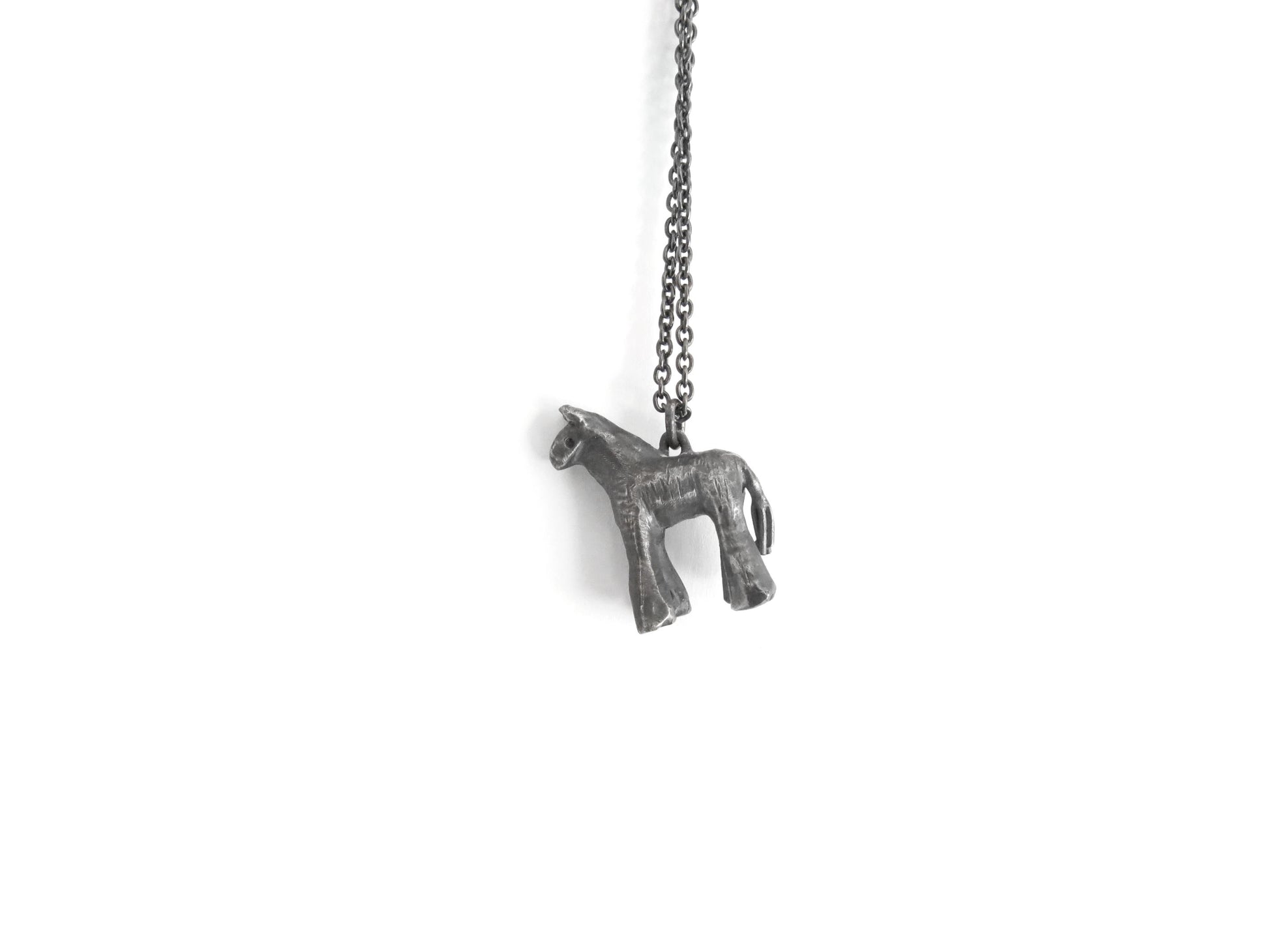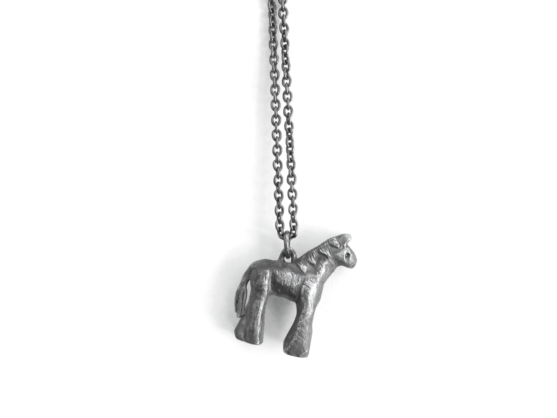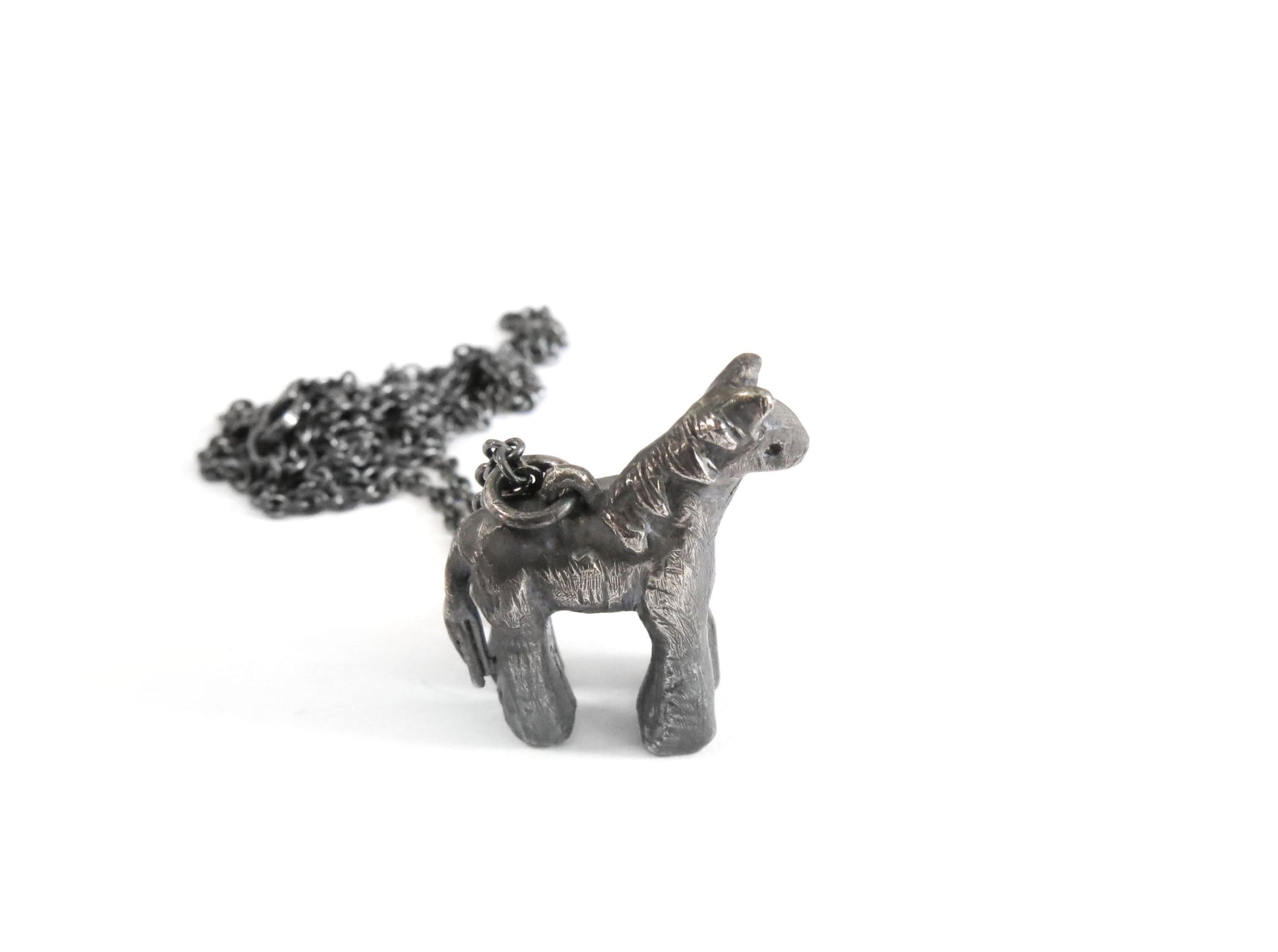 Fabriqué à l'origine dans le cadre d'une collection de petites figurines d'animaux pour mon enfant, ce poney a été sculpté en cire et coulé en argent sterling massif.