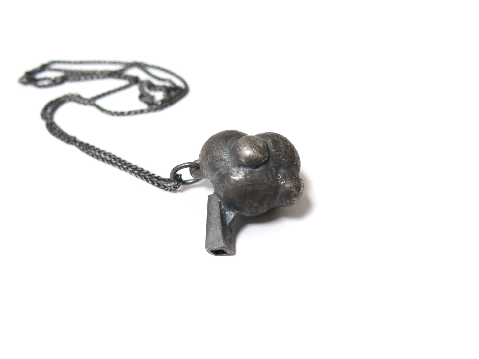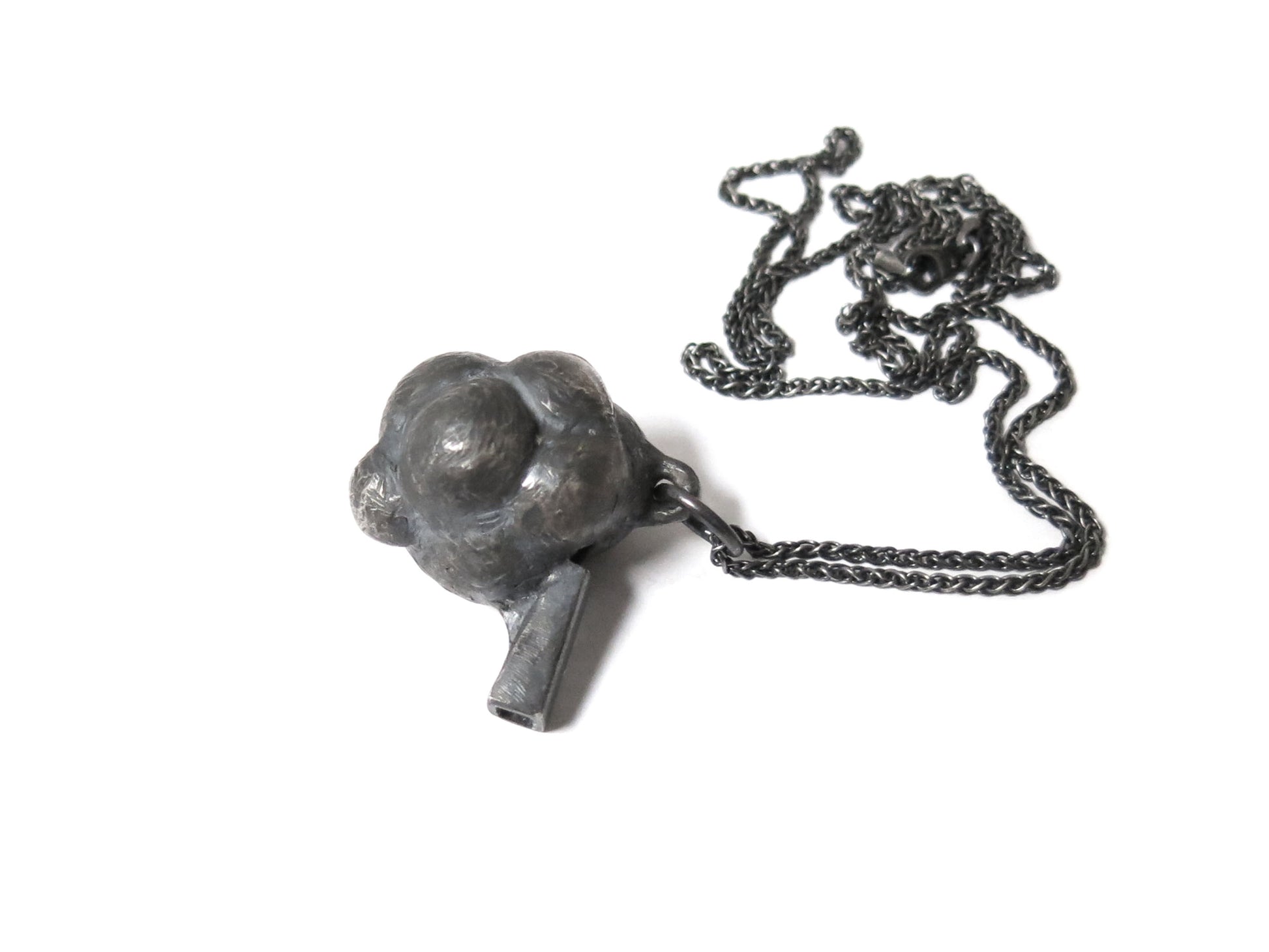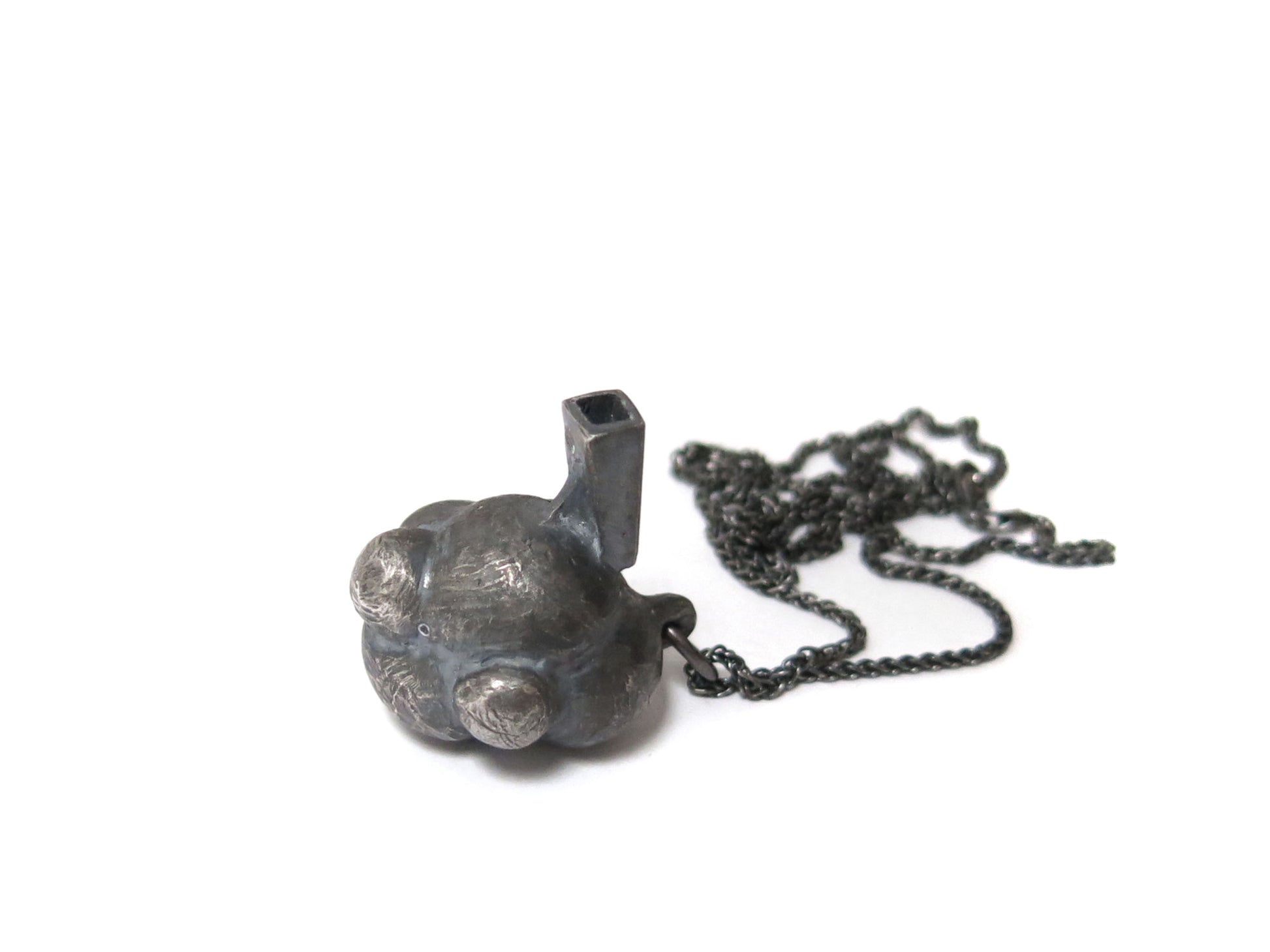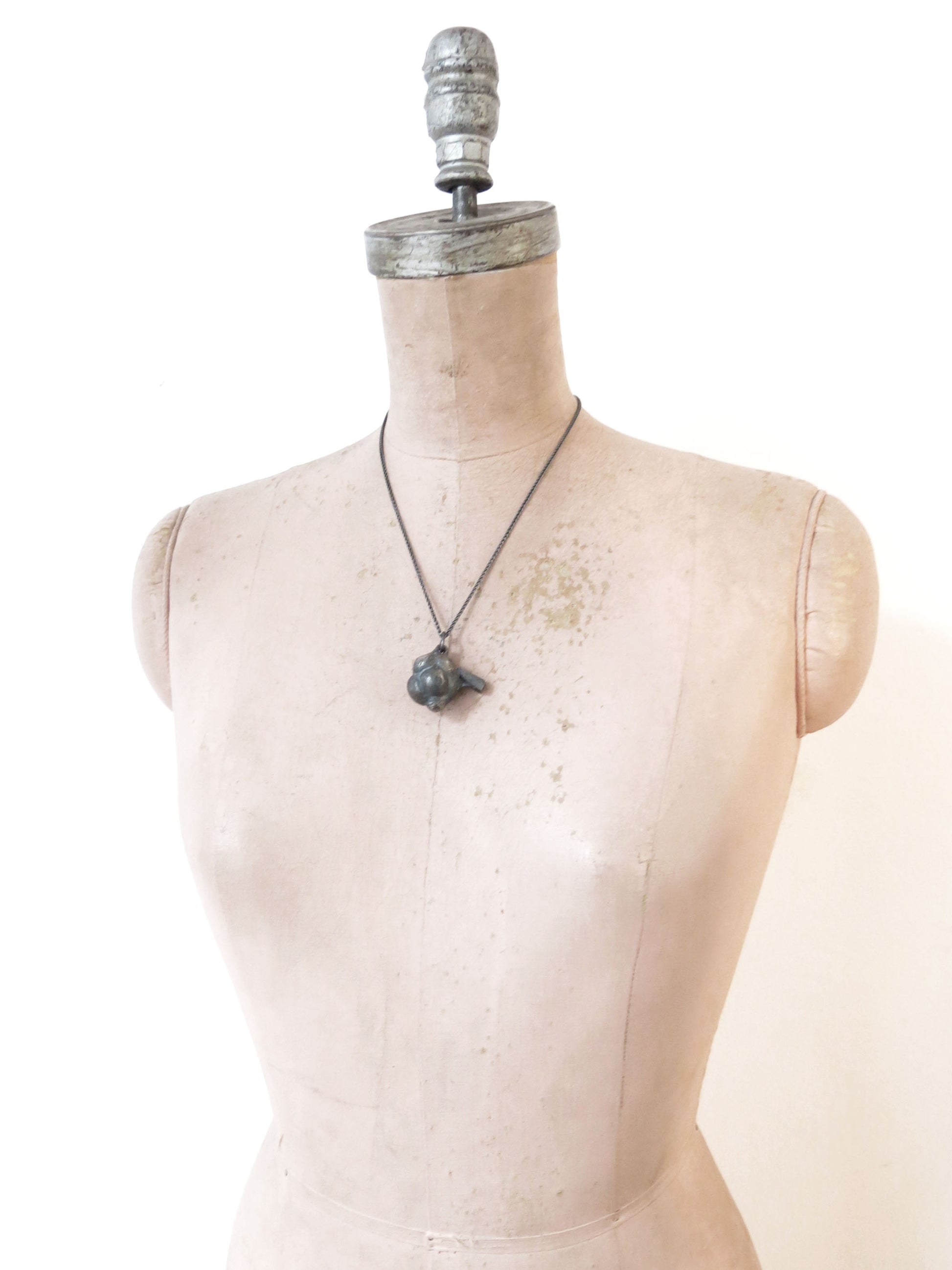 sculpted in wax and cast in solid sterling silver with a textured & oxidized finish. oxidized silver will evolve and become brighter and shinier with wear. comes on a 20" sterling silver chain.