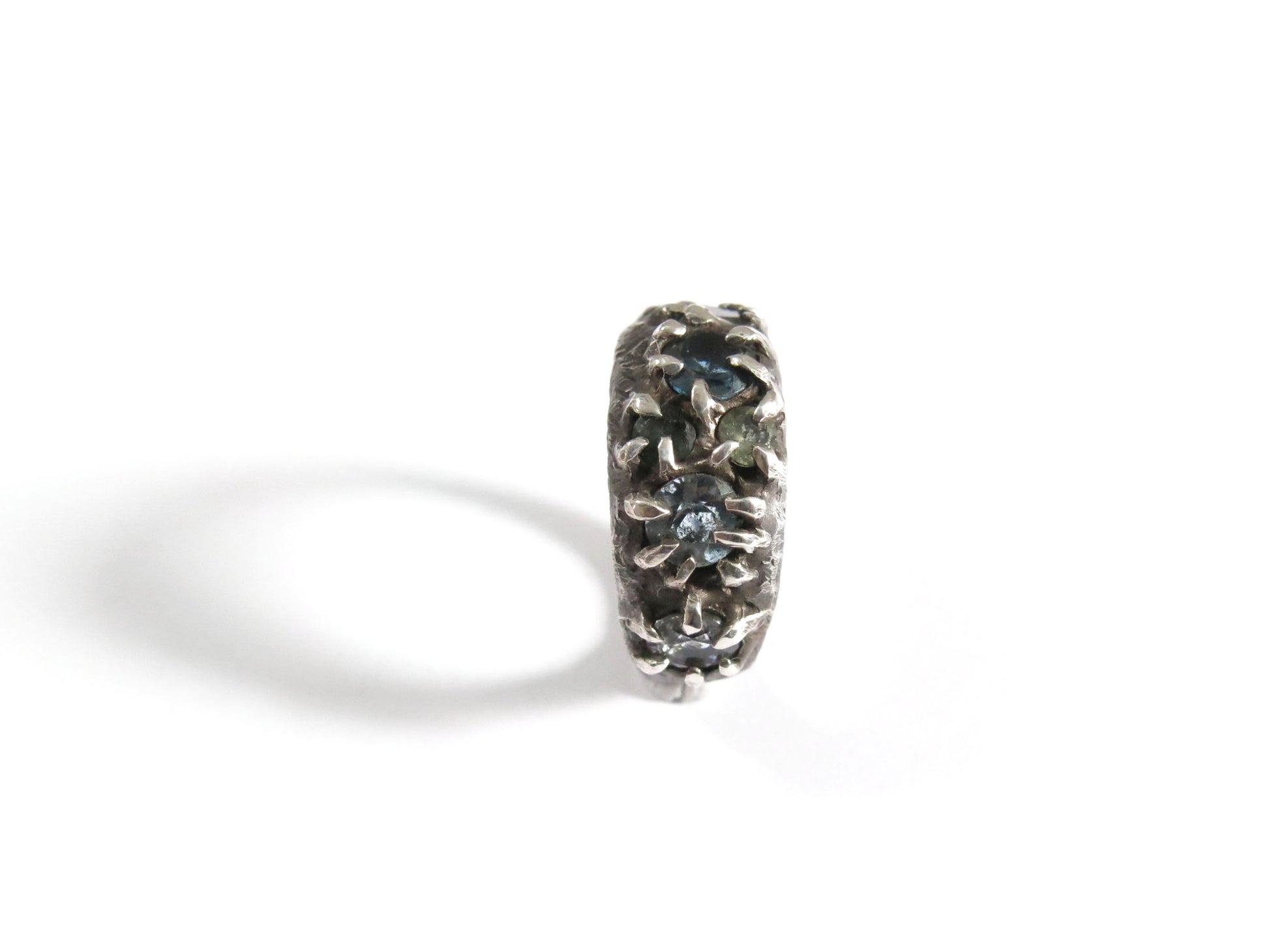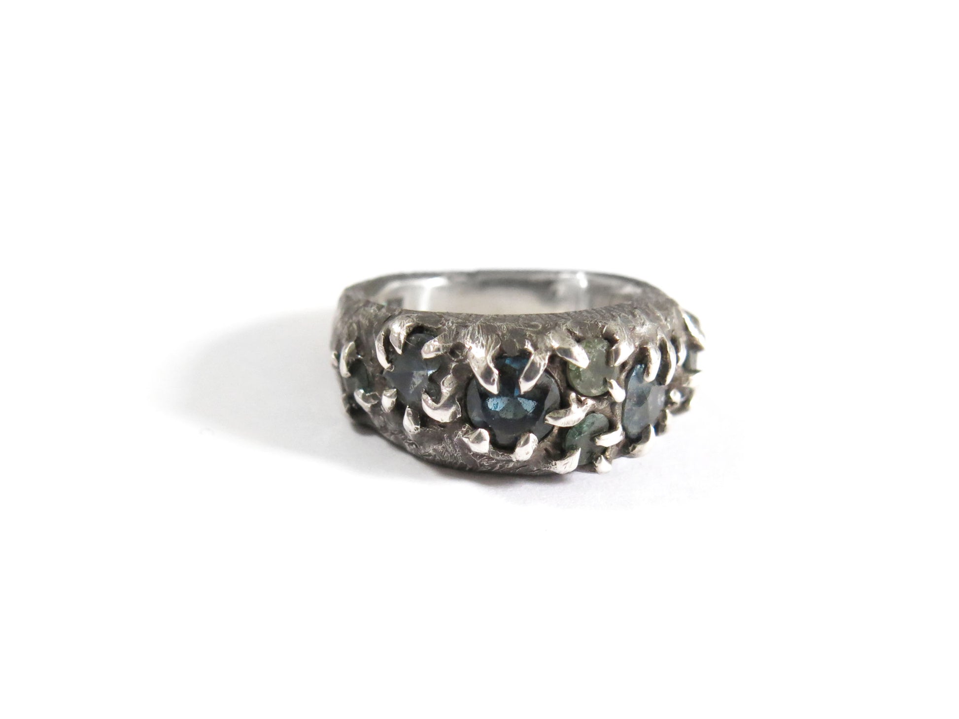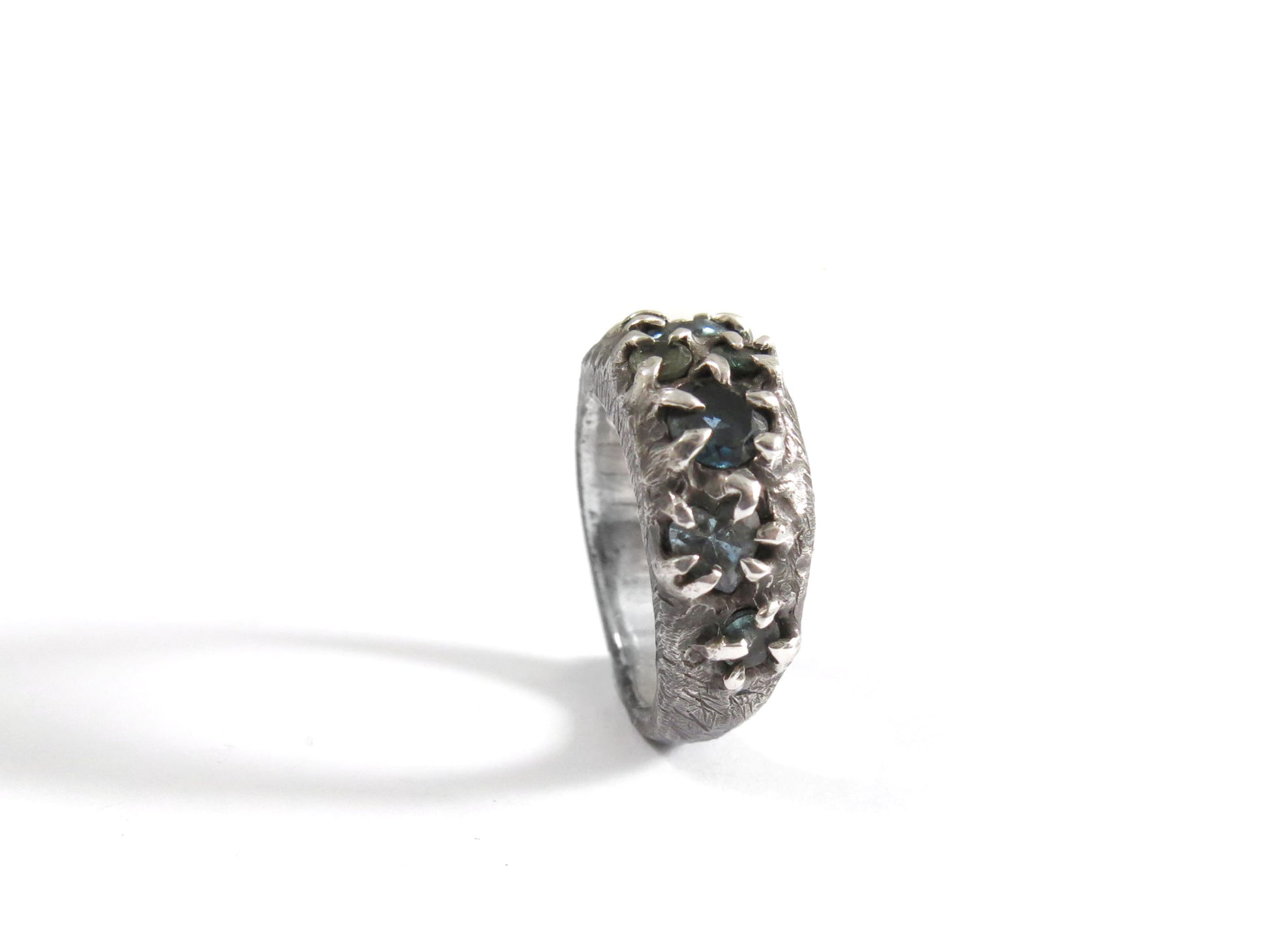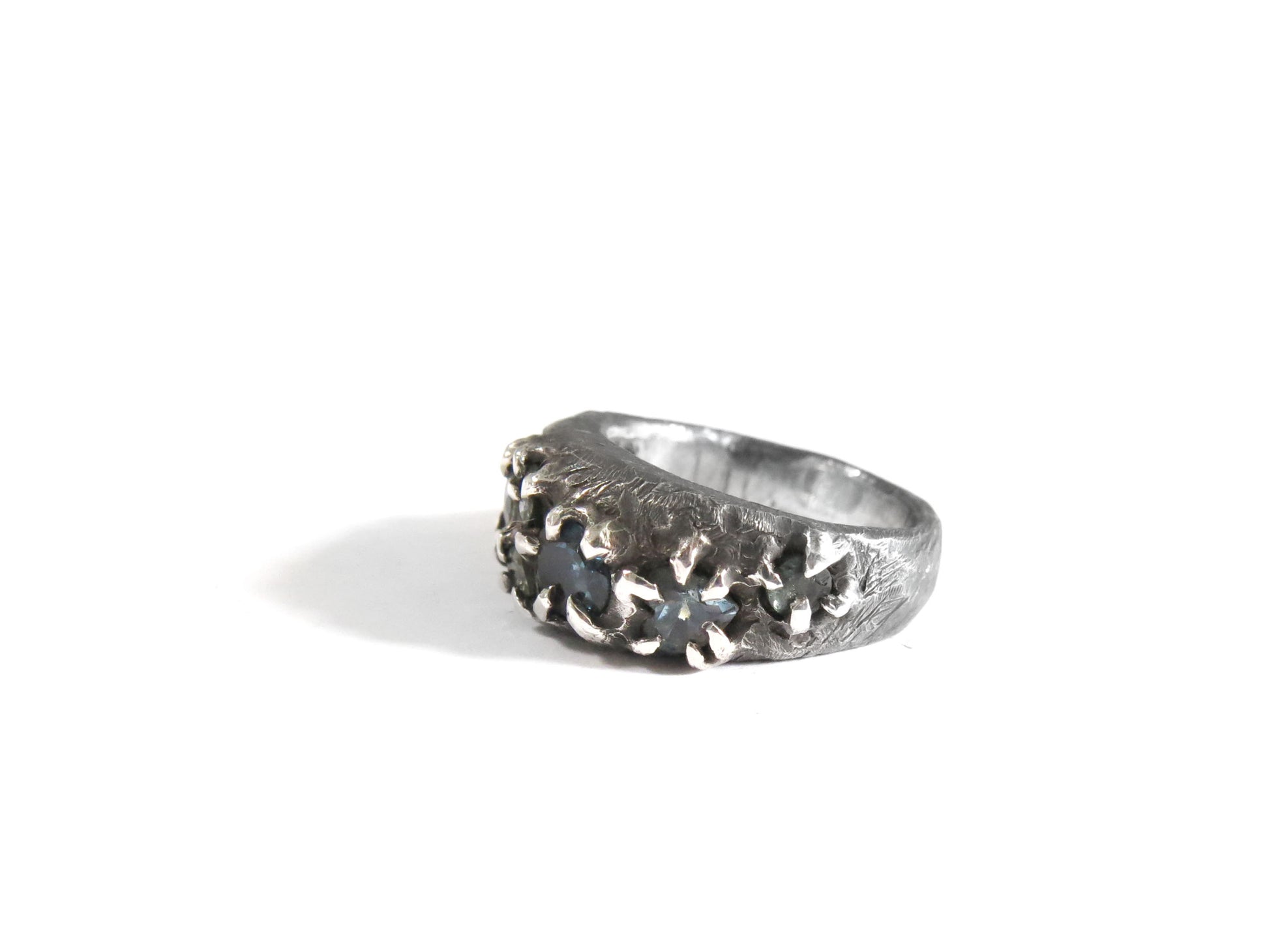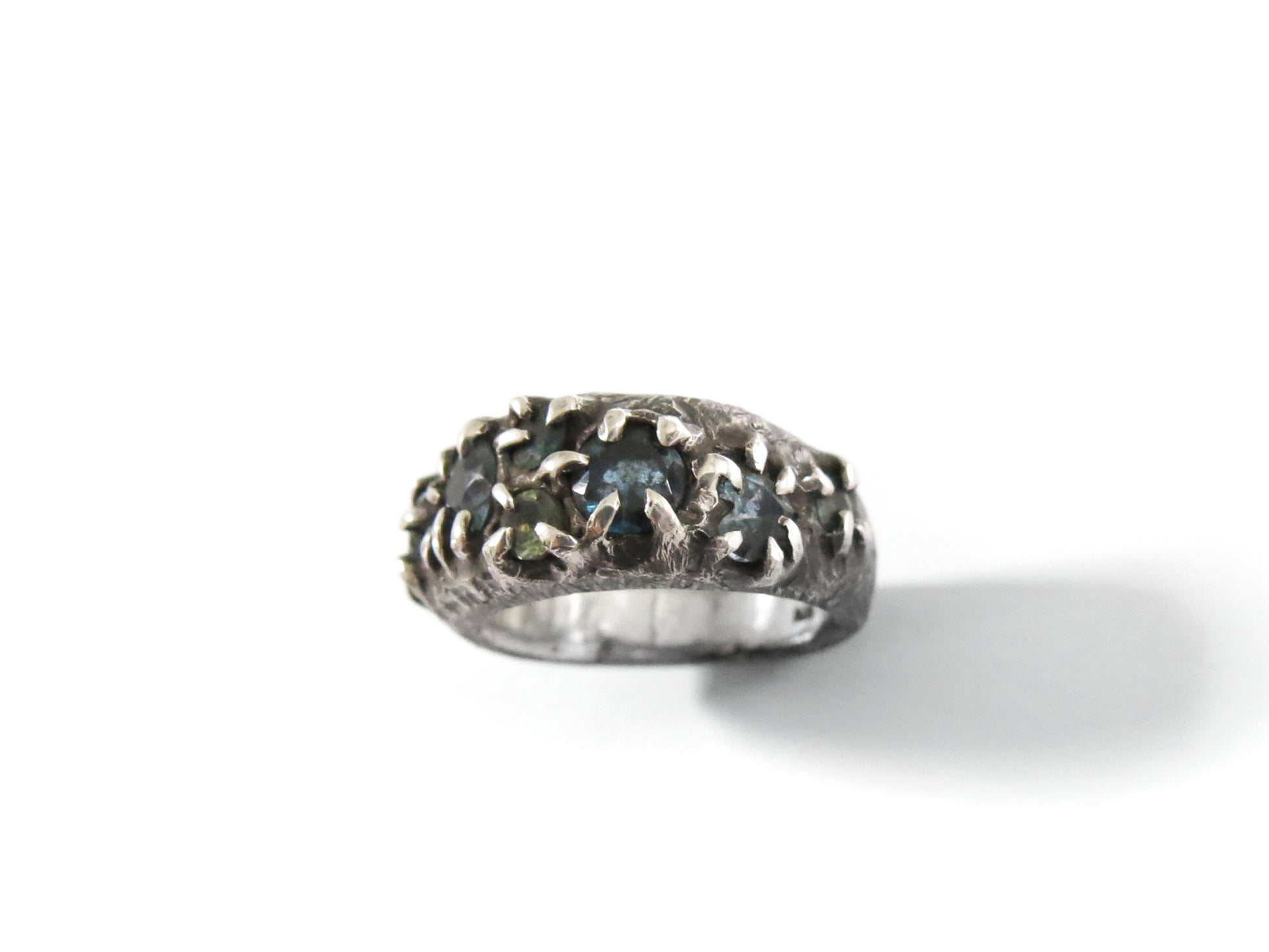 bague unique en son genre avec beaucoup de topazes et de tourmalines. coulé en argent sterling avec une finition oxydée texturée. l'argent oxydé évoluera et deviendra plus lumineux et plus brillant avec l'usure.