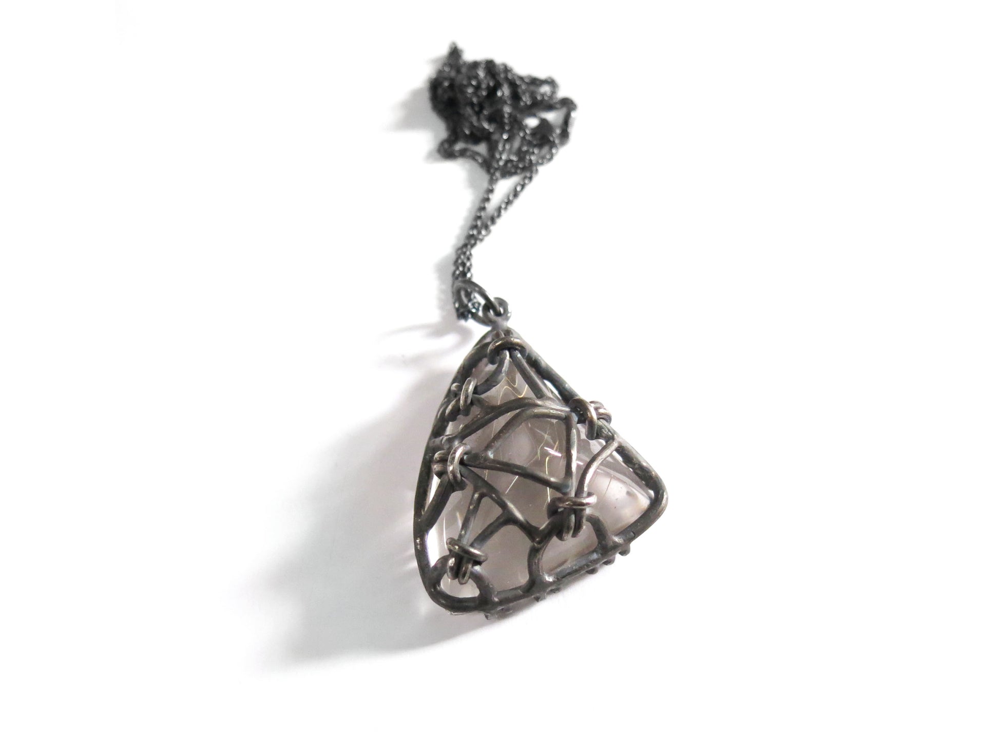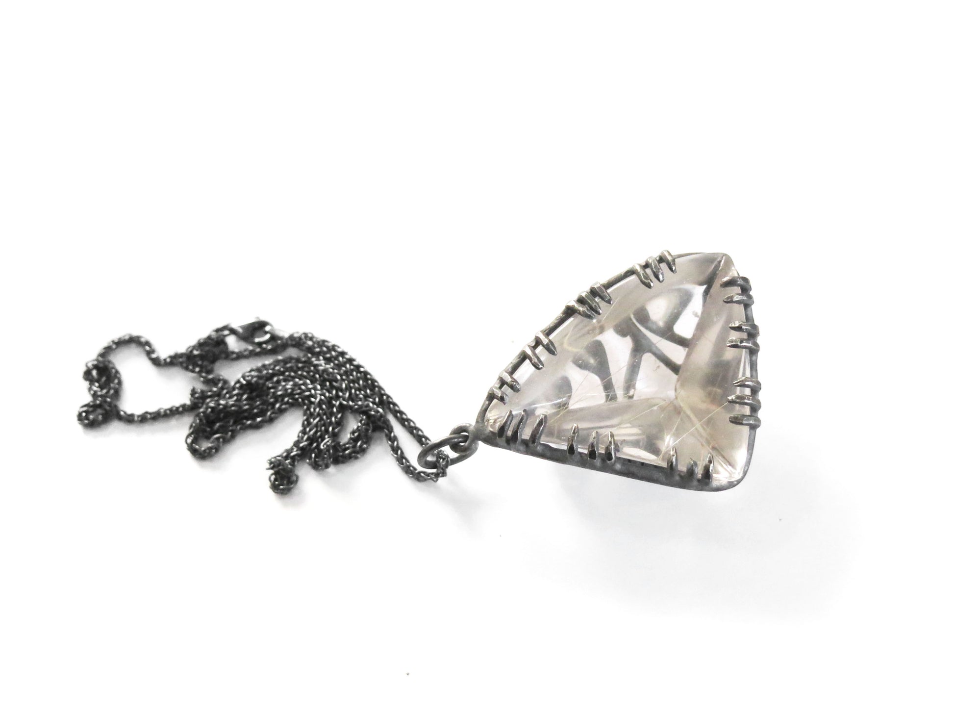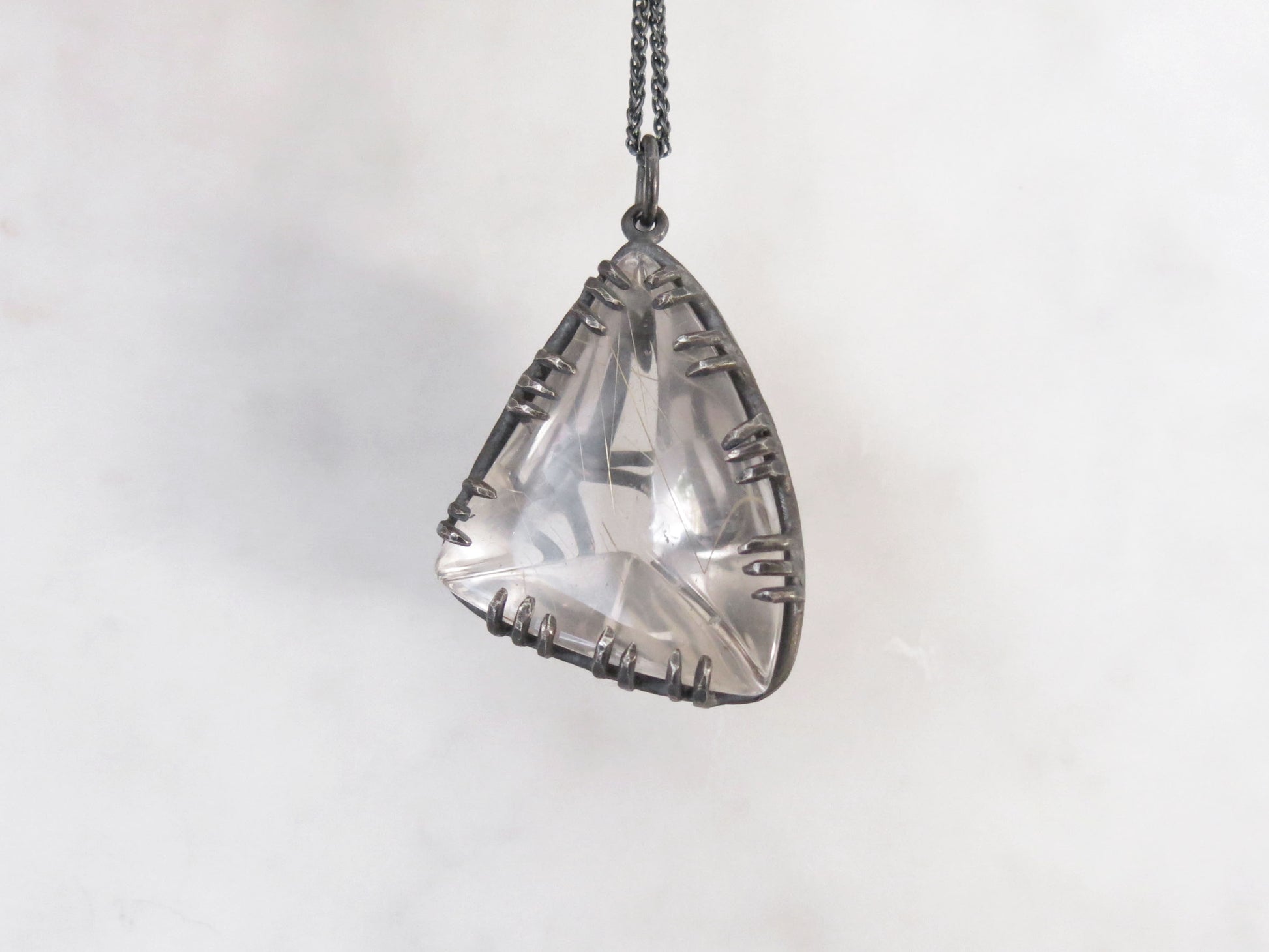 un très grand cristal de quartz triangulaire unique en son genre rempli d'aiguilles comme des inclusions minérales de rutile doré. sertissage motif nœud en argent sterling avec une finition oxydée rugueuse.