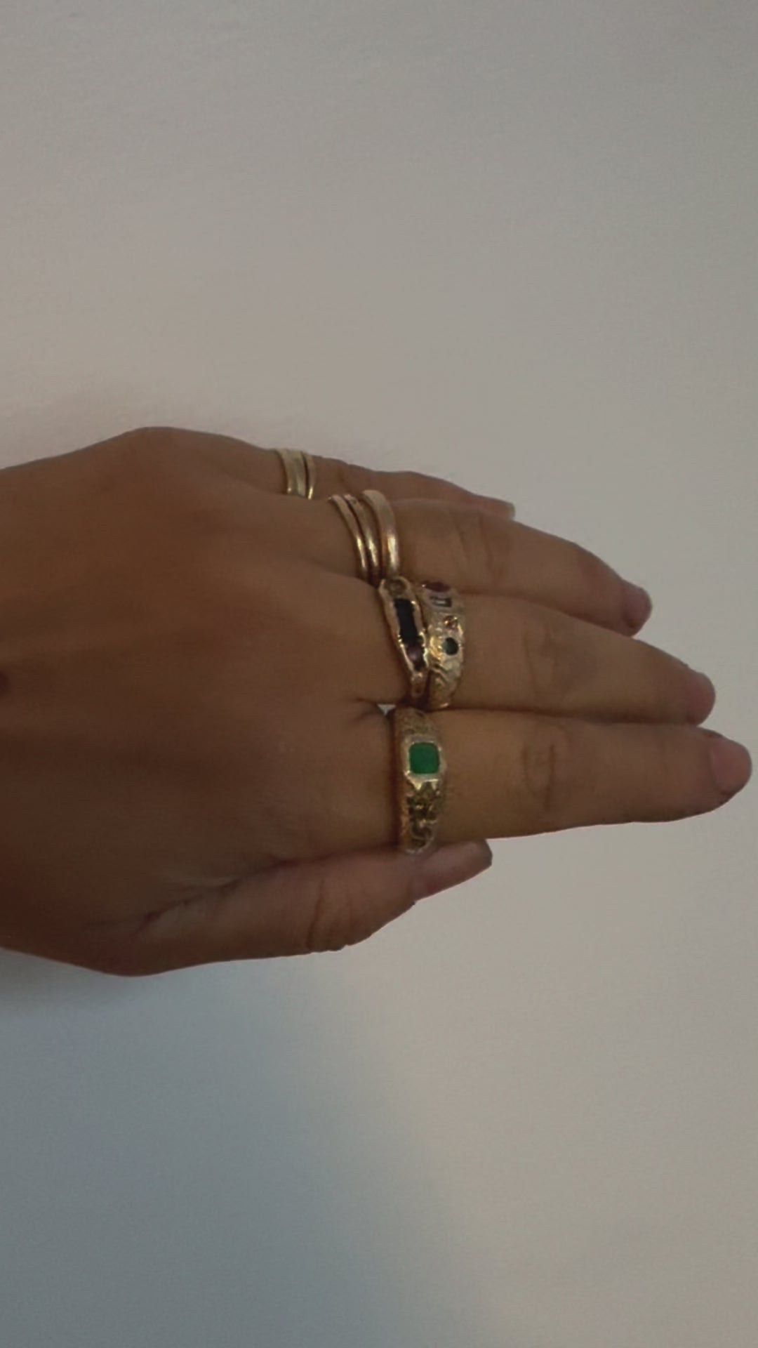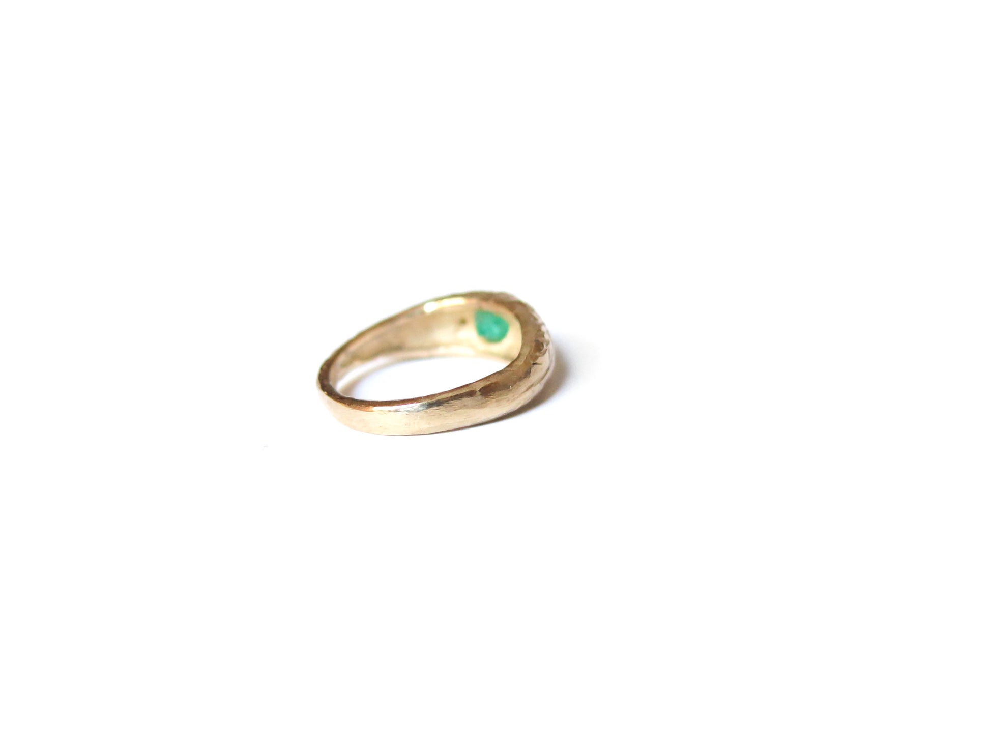 solid 14K textured yellow gold ring with a bight green square emerald, a very special eye shaped yellow diamond & a side of three brilliant cu diamonds to add a bit more sparkle