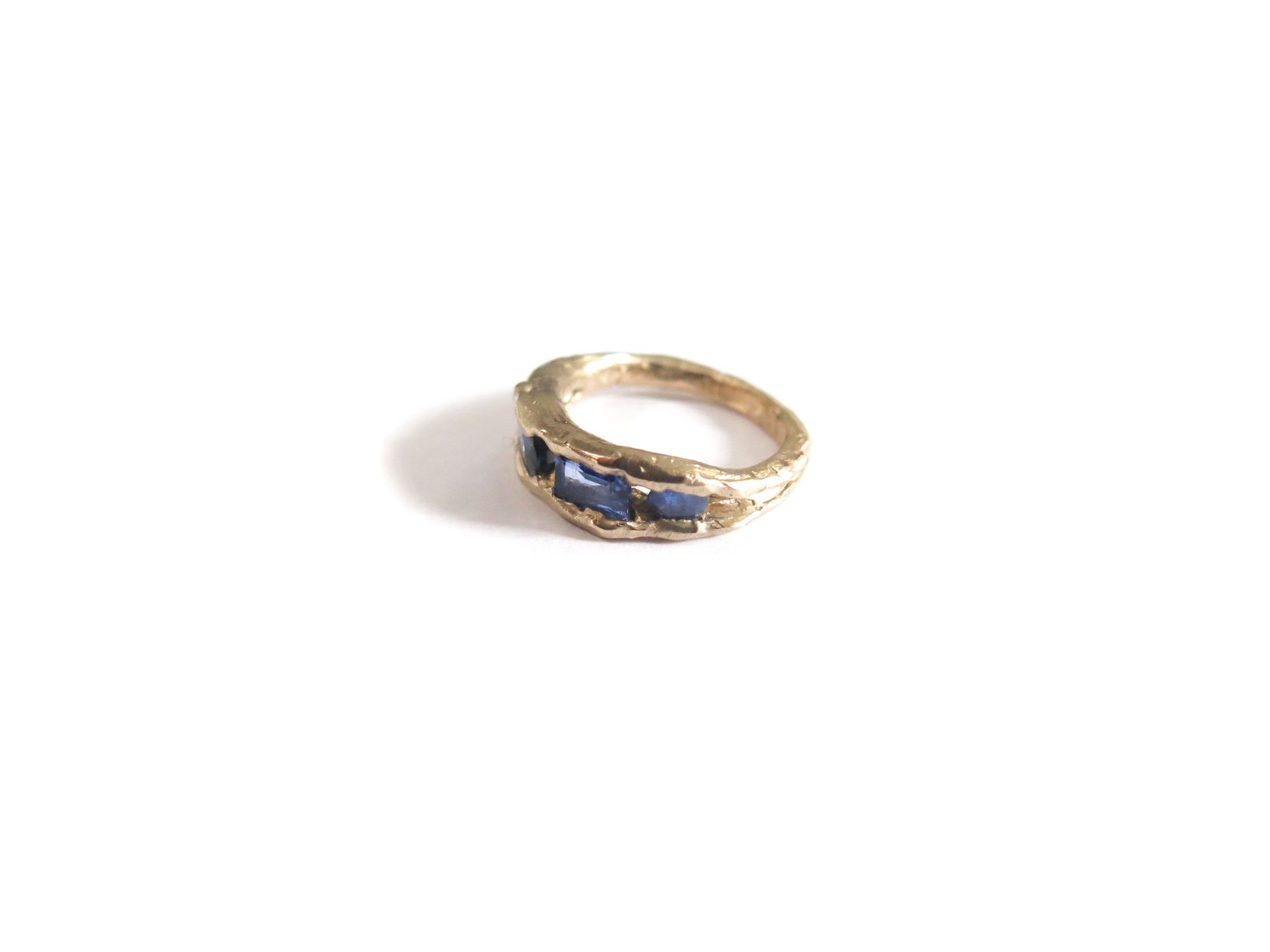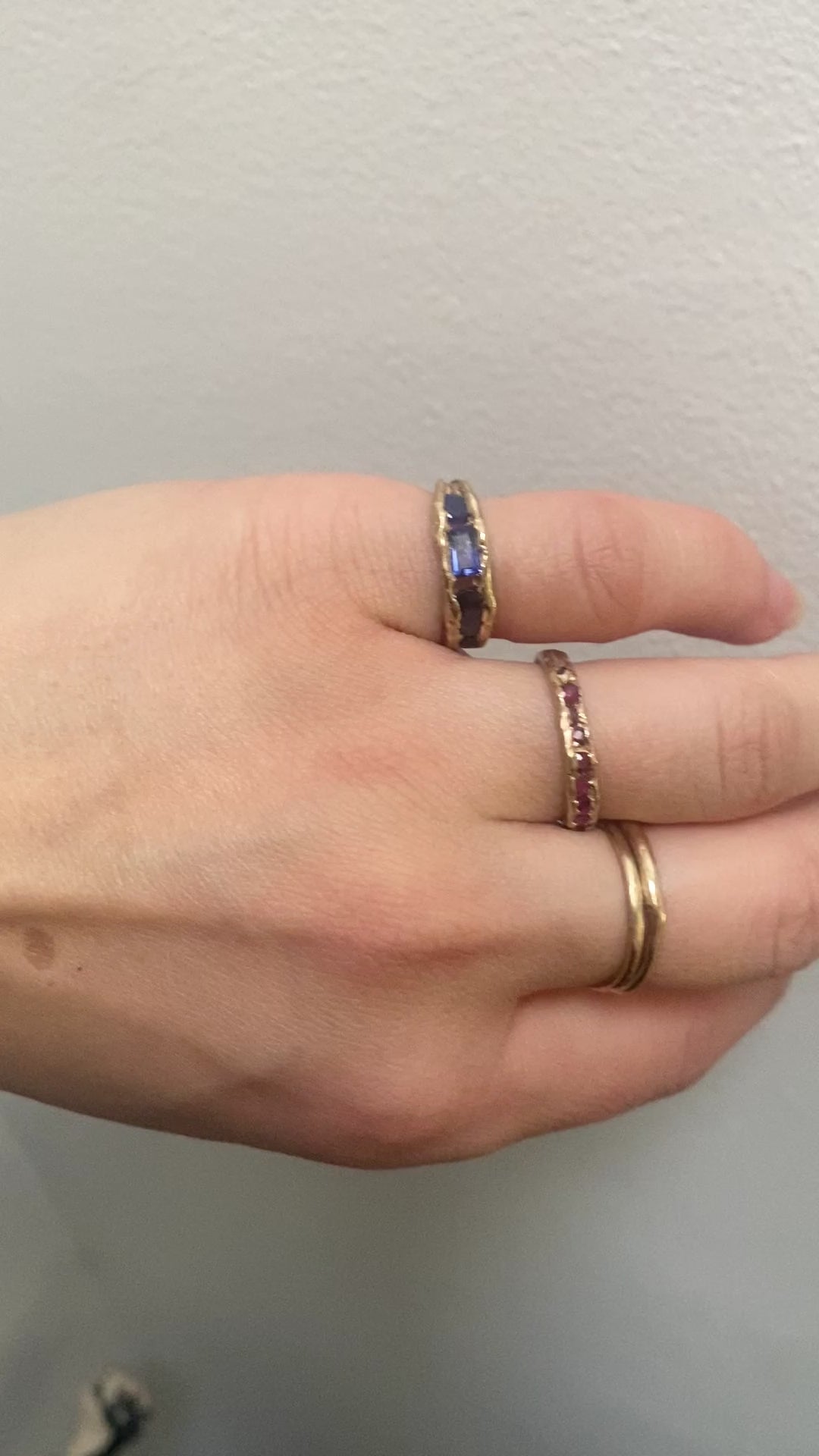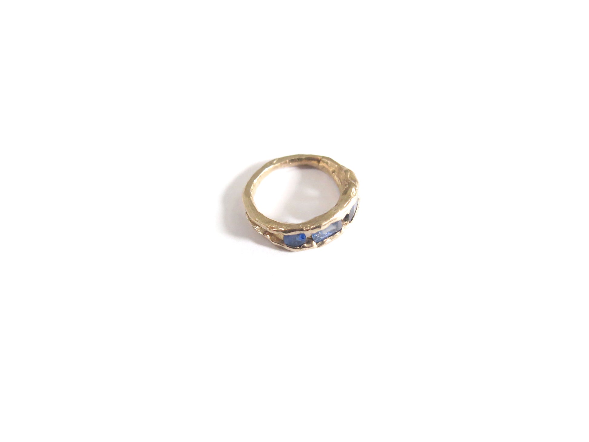 a wonky solid 14K yellow gold band with an assortment of dark blue sapphires, round, oval & rectangular, cast in place.