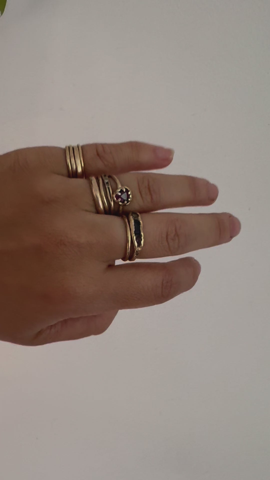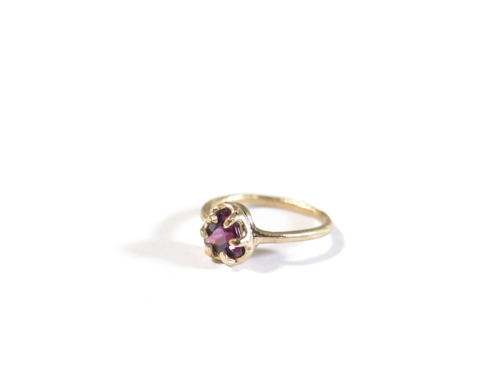 triangular dark red purple rhodolite garnet from mozambique in 14K yellow gold.