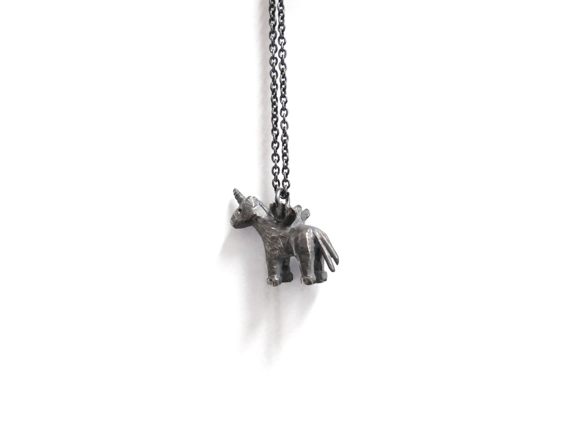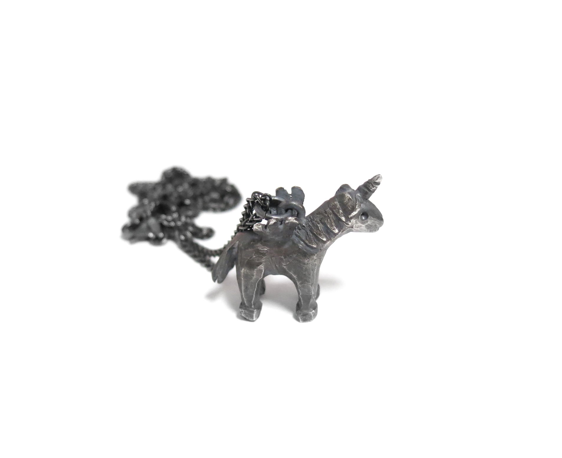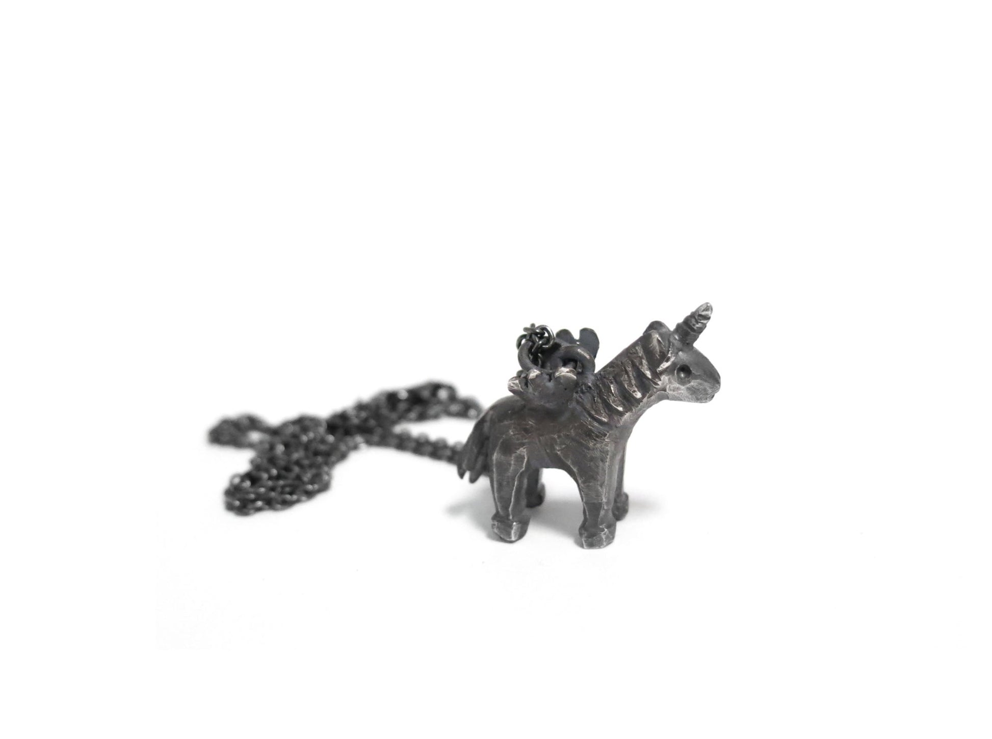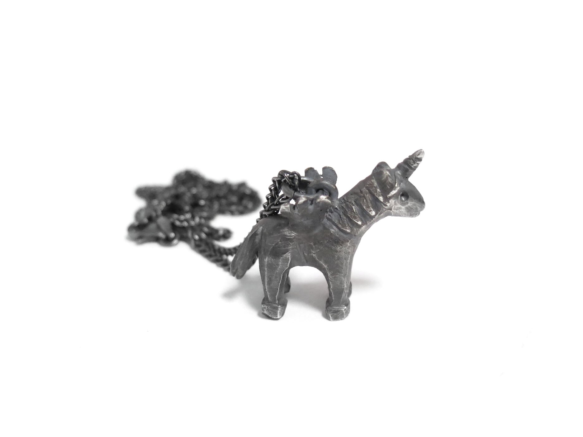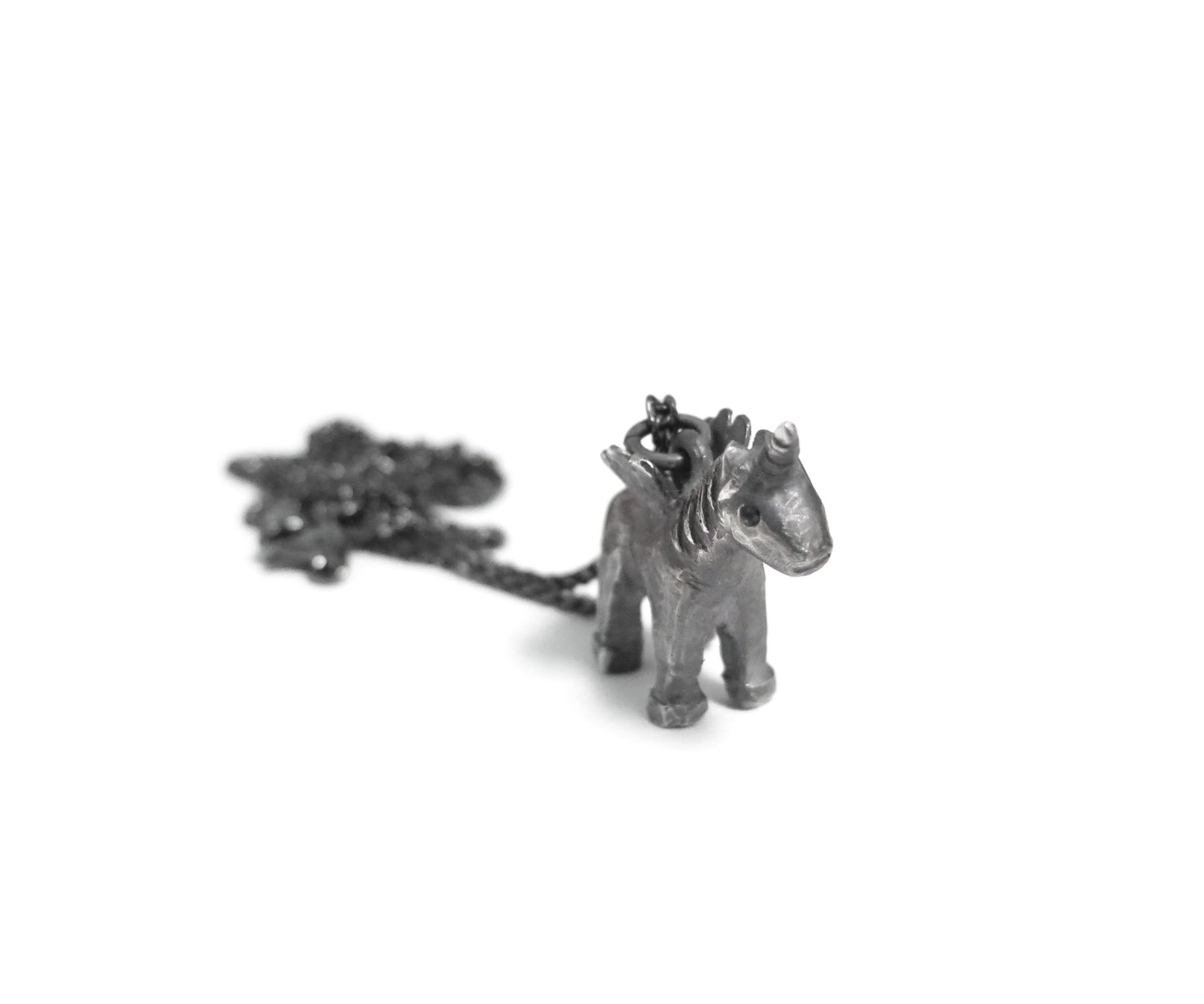 my kid's favourite animal. the elusive winged unicorn. sculpted in wax and then cast in solid sterling silver. rough oxidized finish. darkened silver will evolve and become brighter and shiner with wear.