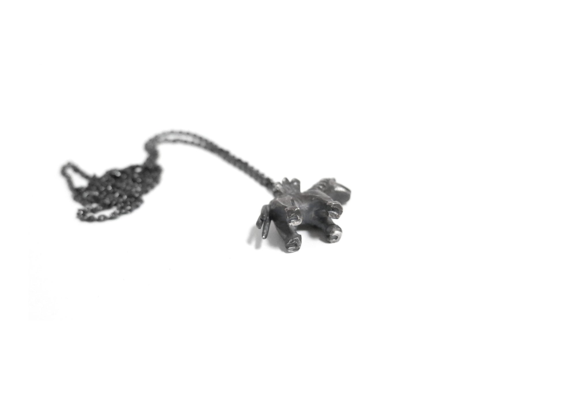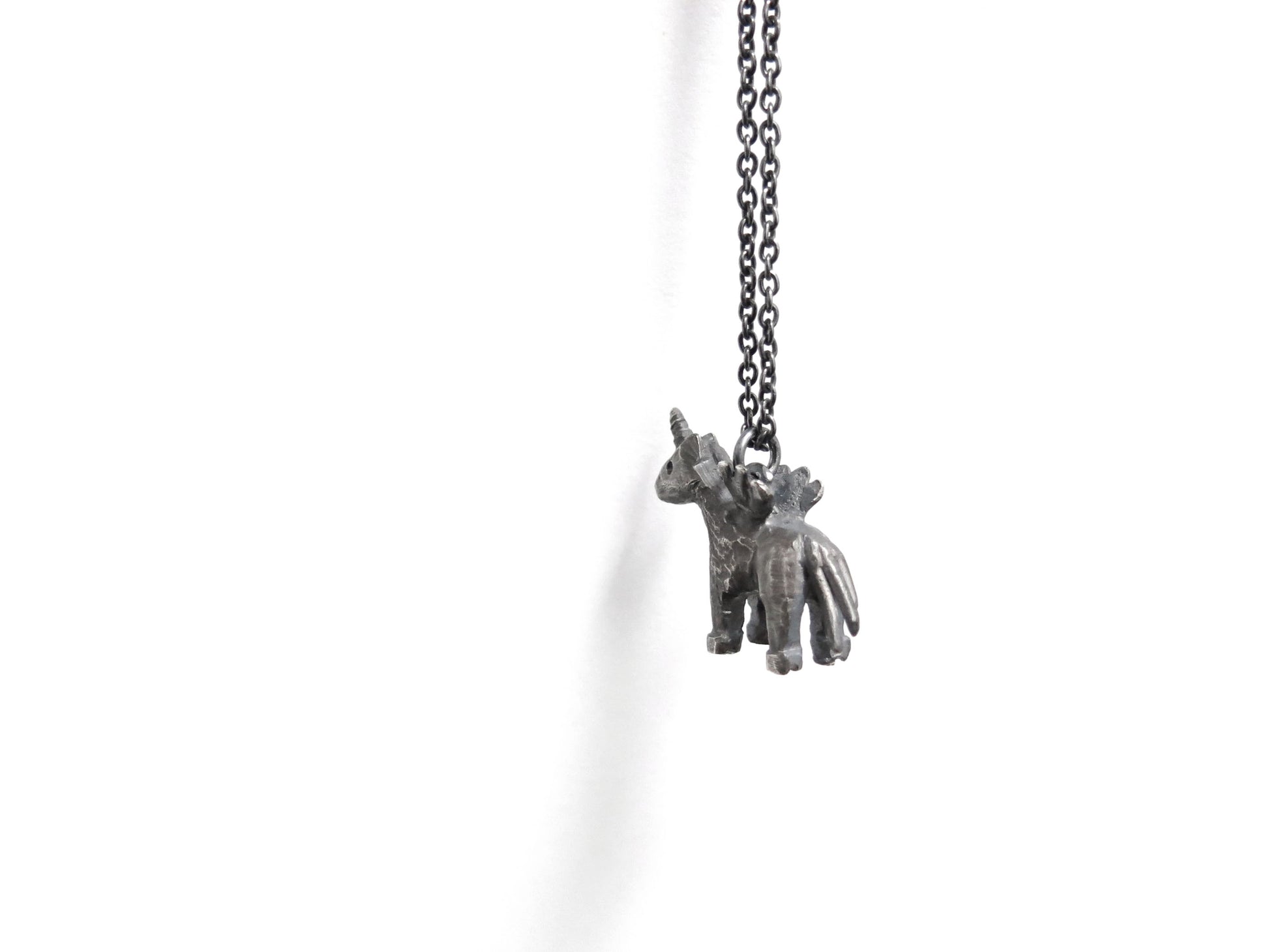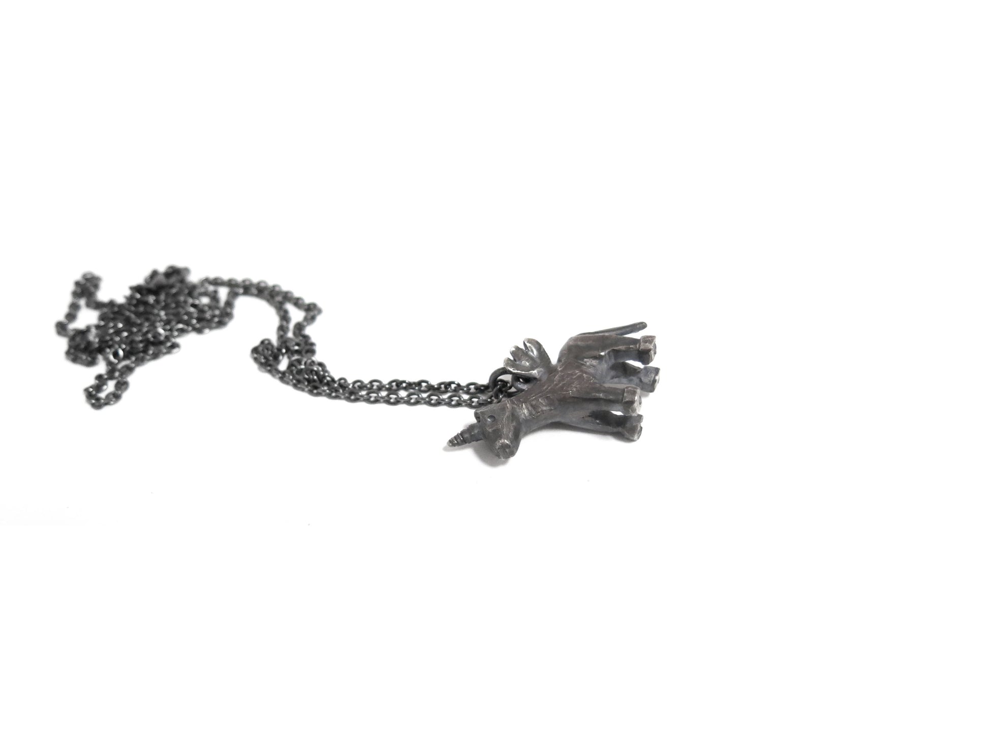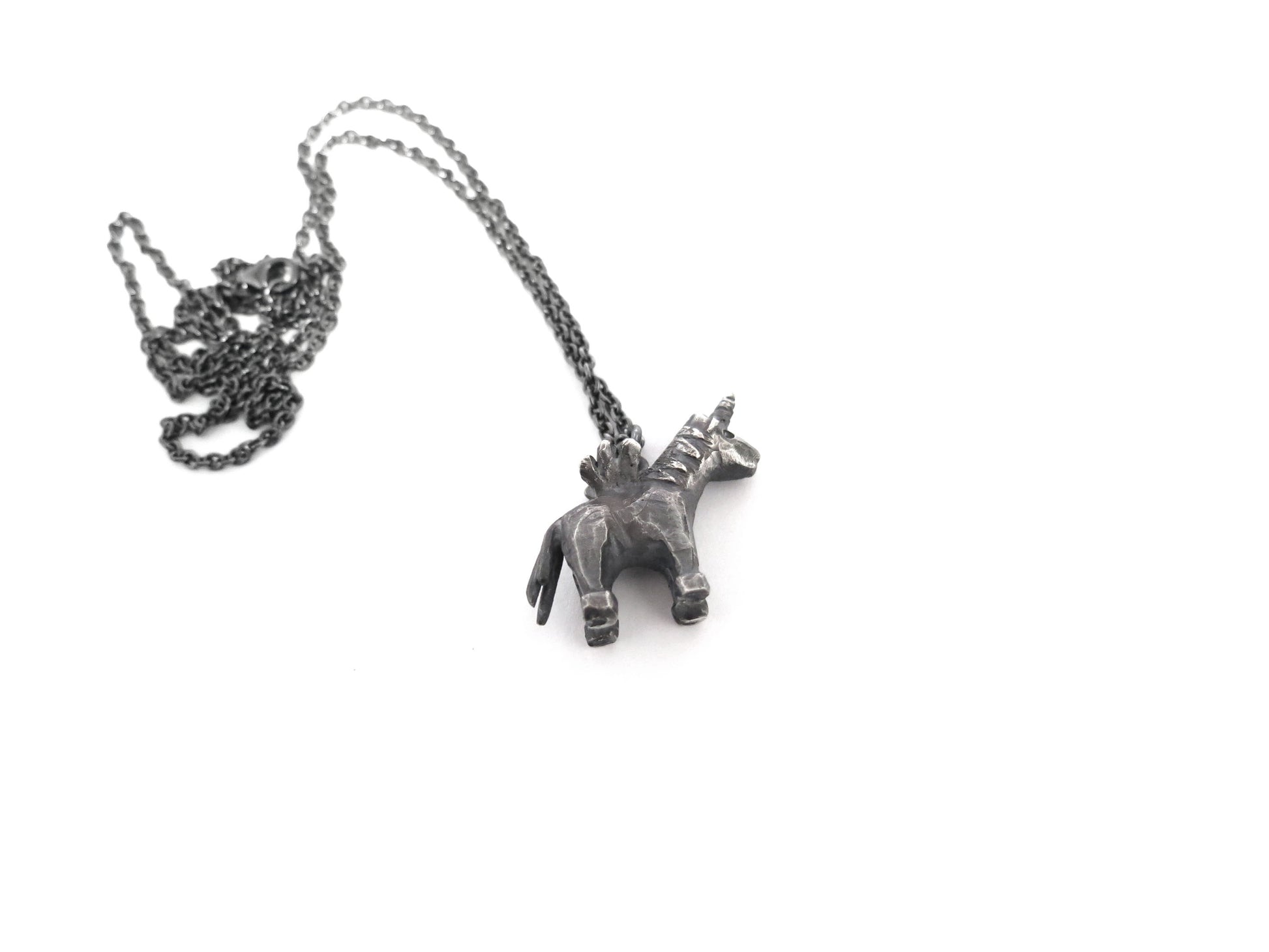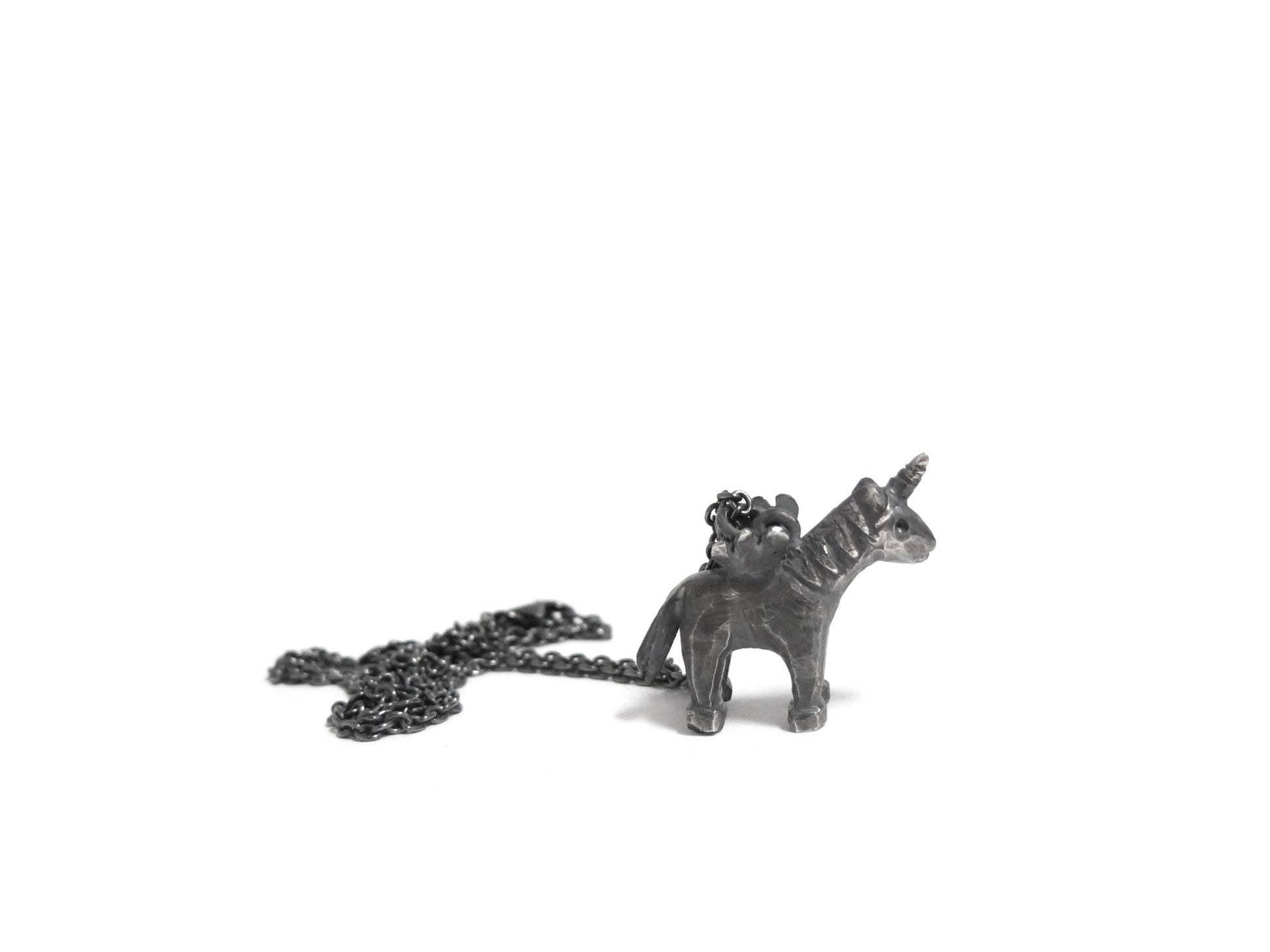 my kid's favourite animal. the elusive winged unicorn. sculpted in wax and then cast in solid sterling silver. rough oxidized finish. darkened silver will evolve and become brighter and shiner with wear.