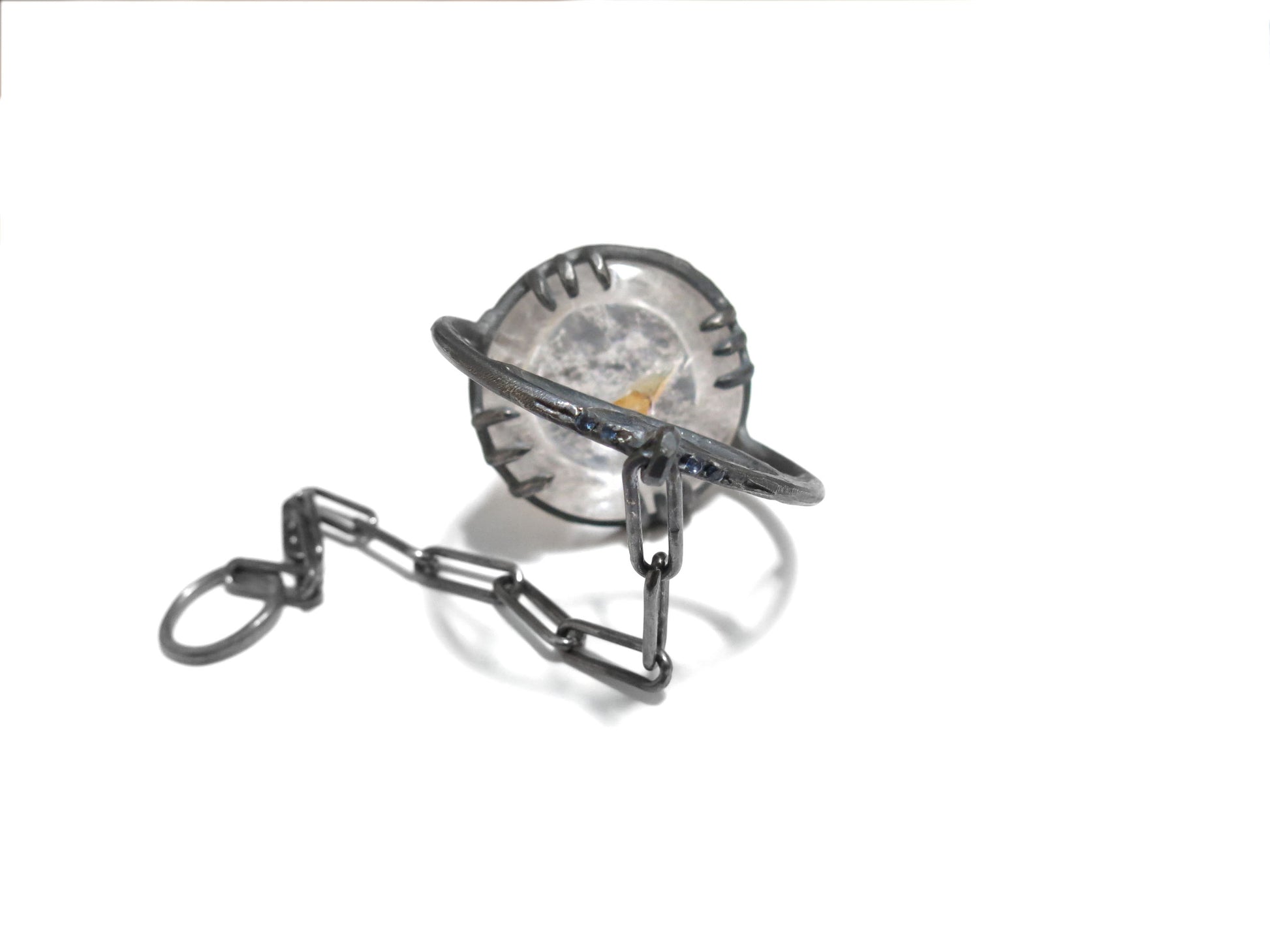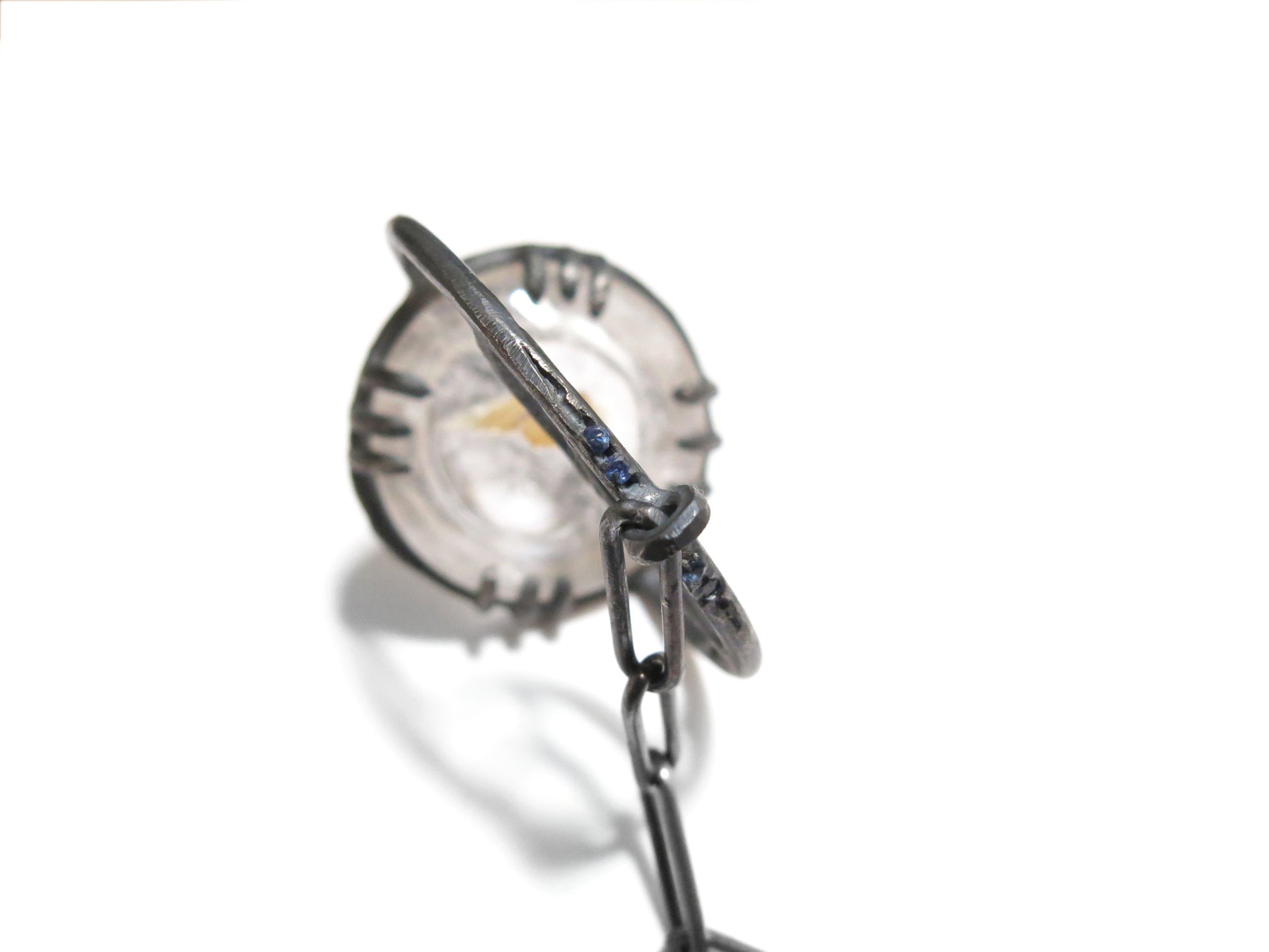 one of a kind sterling silver pendulum built around a very special 33 mm / 1.3" phantom quartz dome. you can see the phantom of a smaller crystal that has formed inside the bigger crystal. four 2mm blue sapphires set along the top.