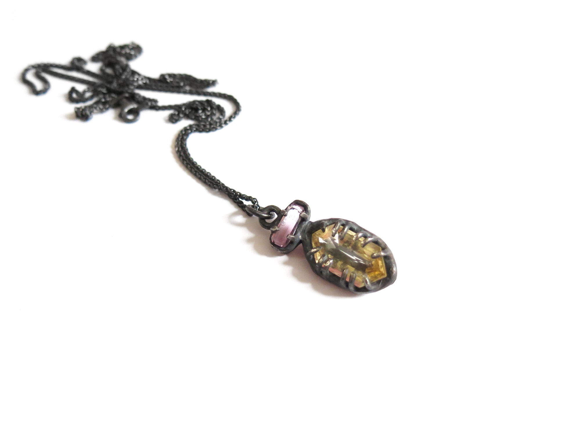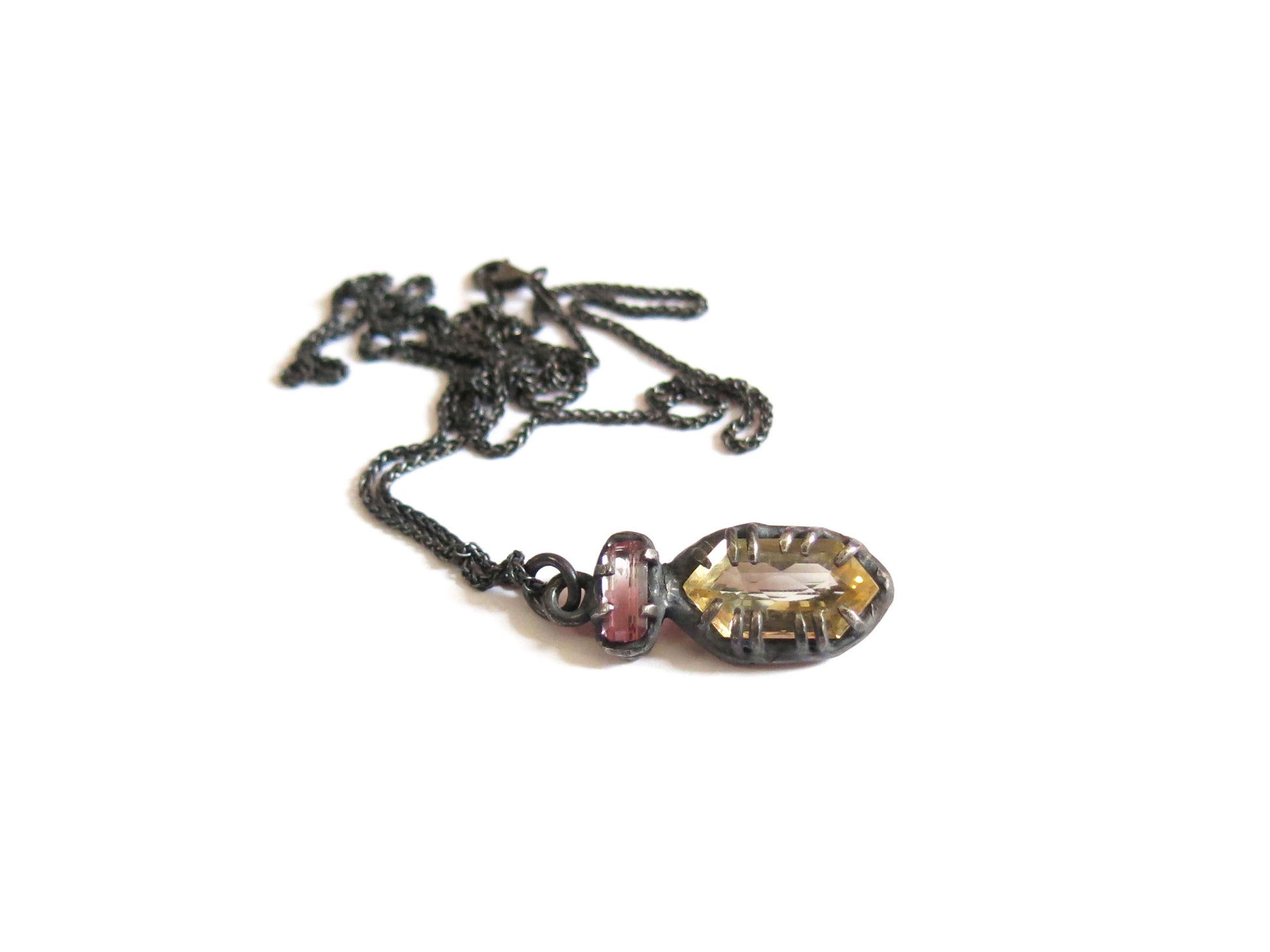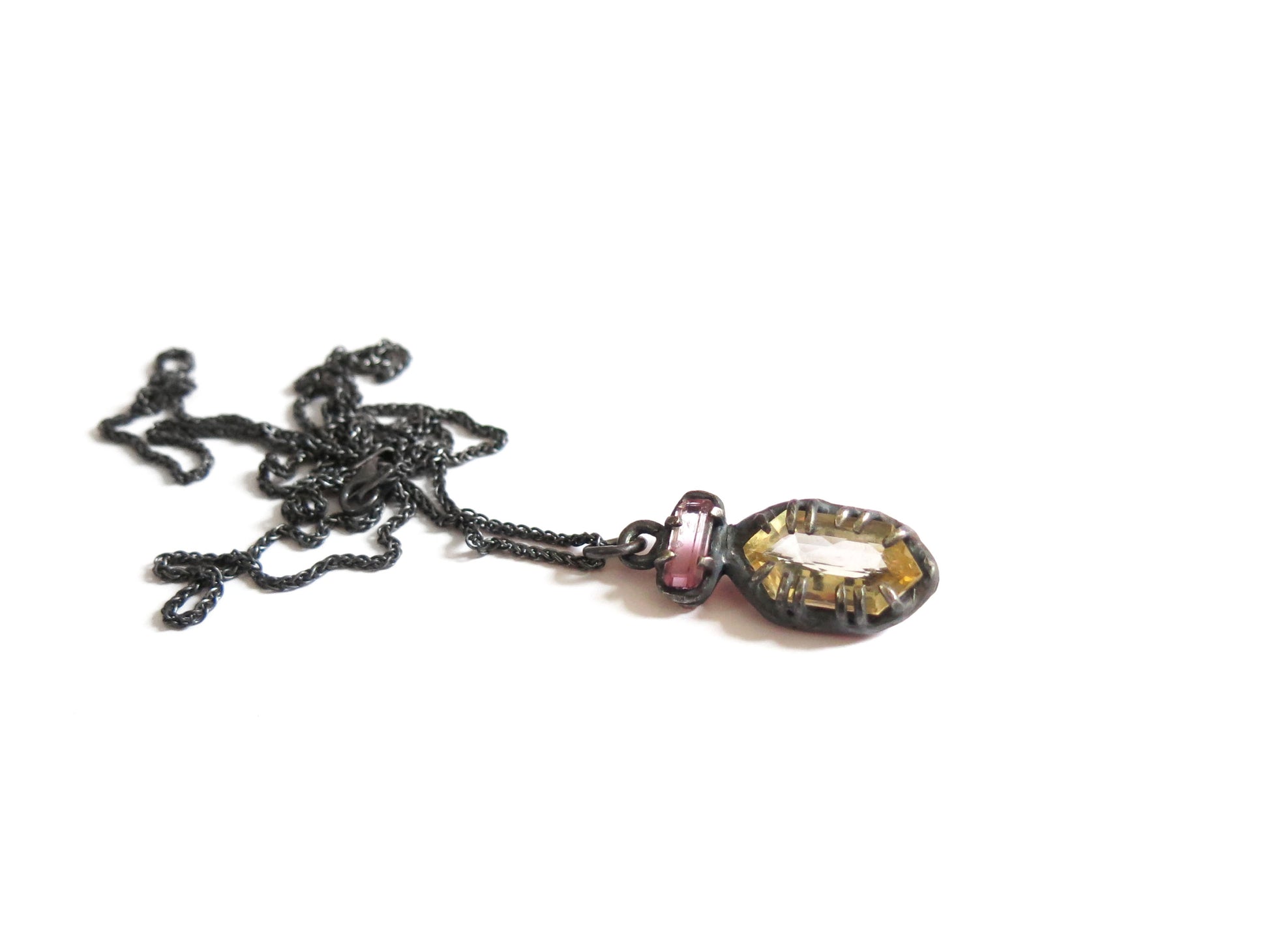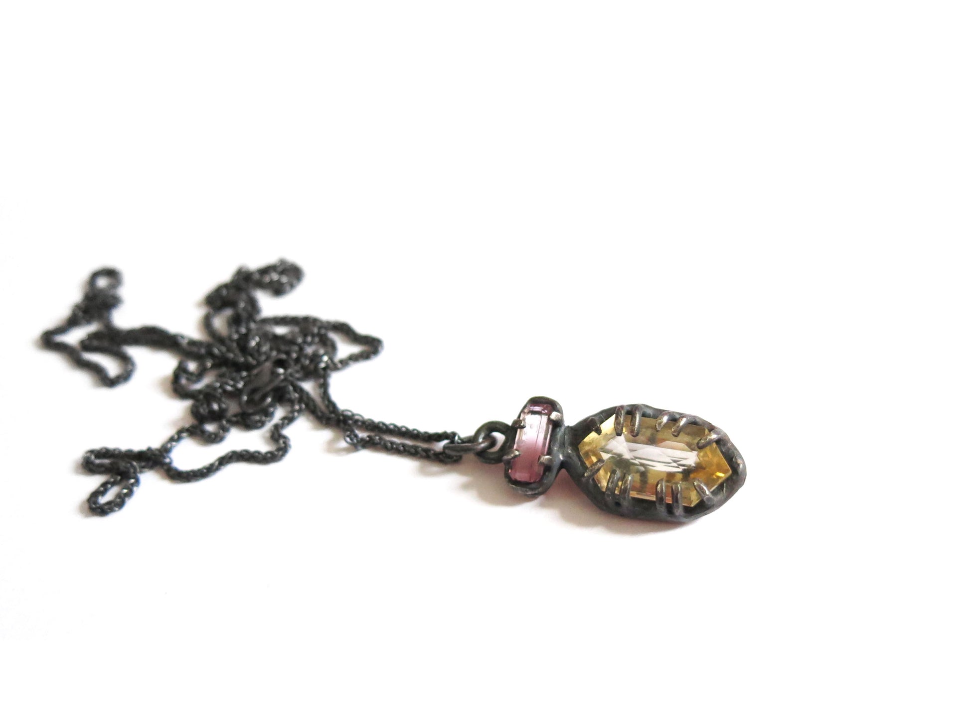 fancy cut citrine topped with a pink ombre tourmaline. set in sterling silver with a rough oxidized finish. oxidized silver will evolve and become brighter and shinier with wear. comes on a 20" silver chain.