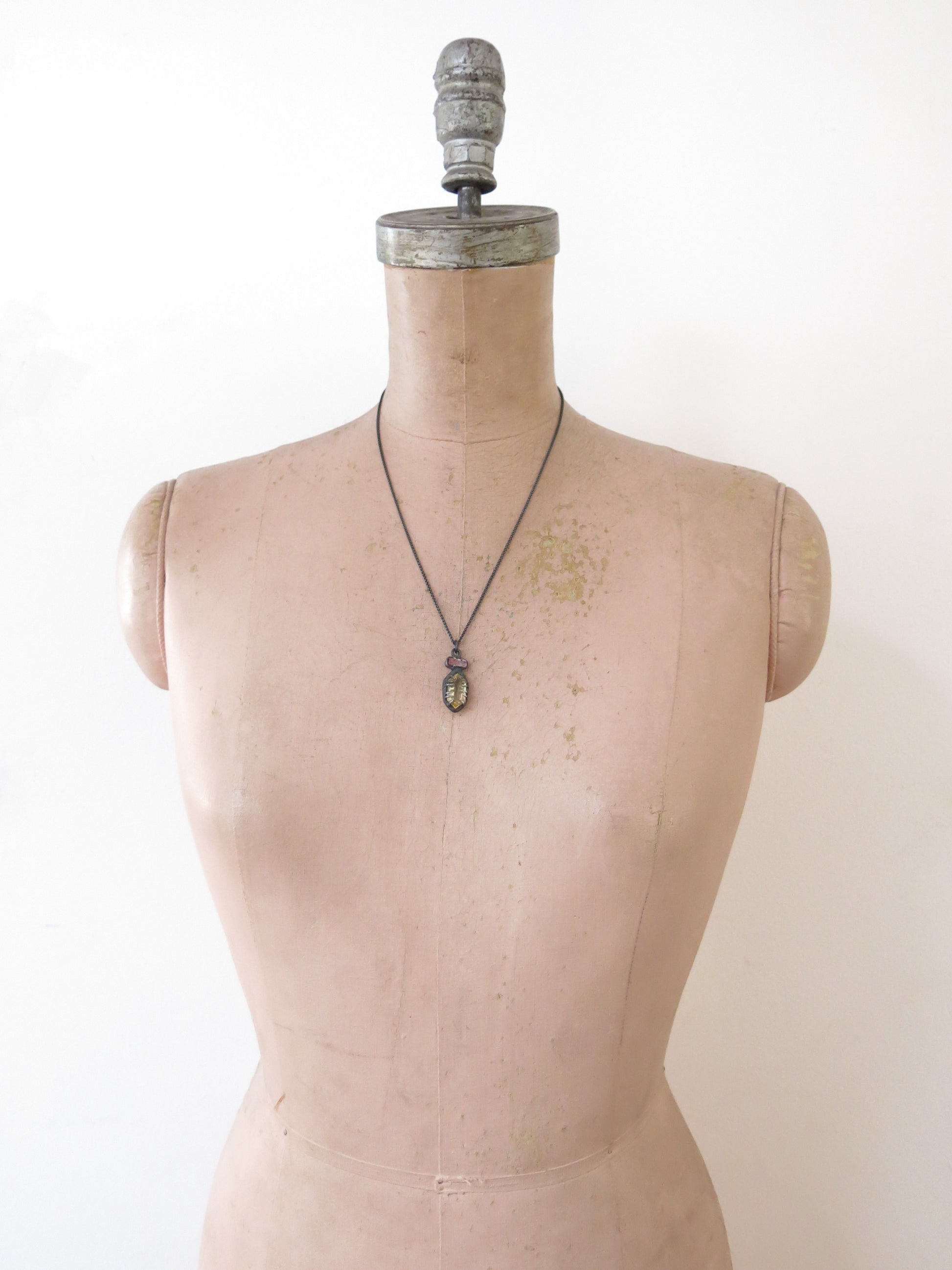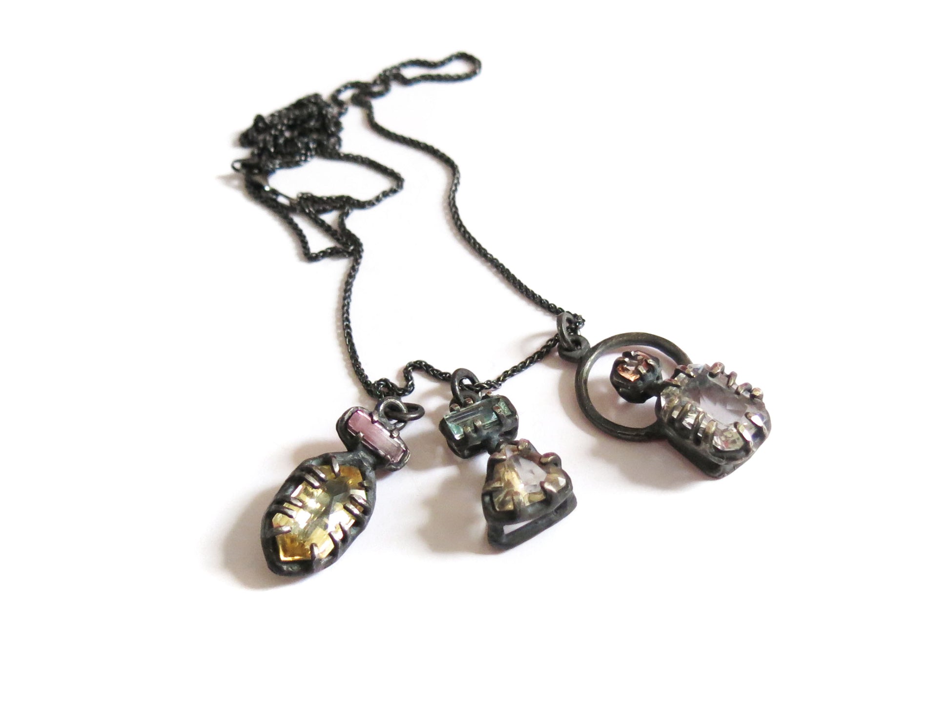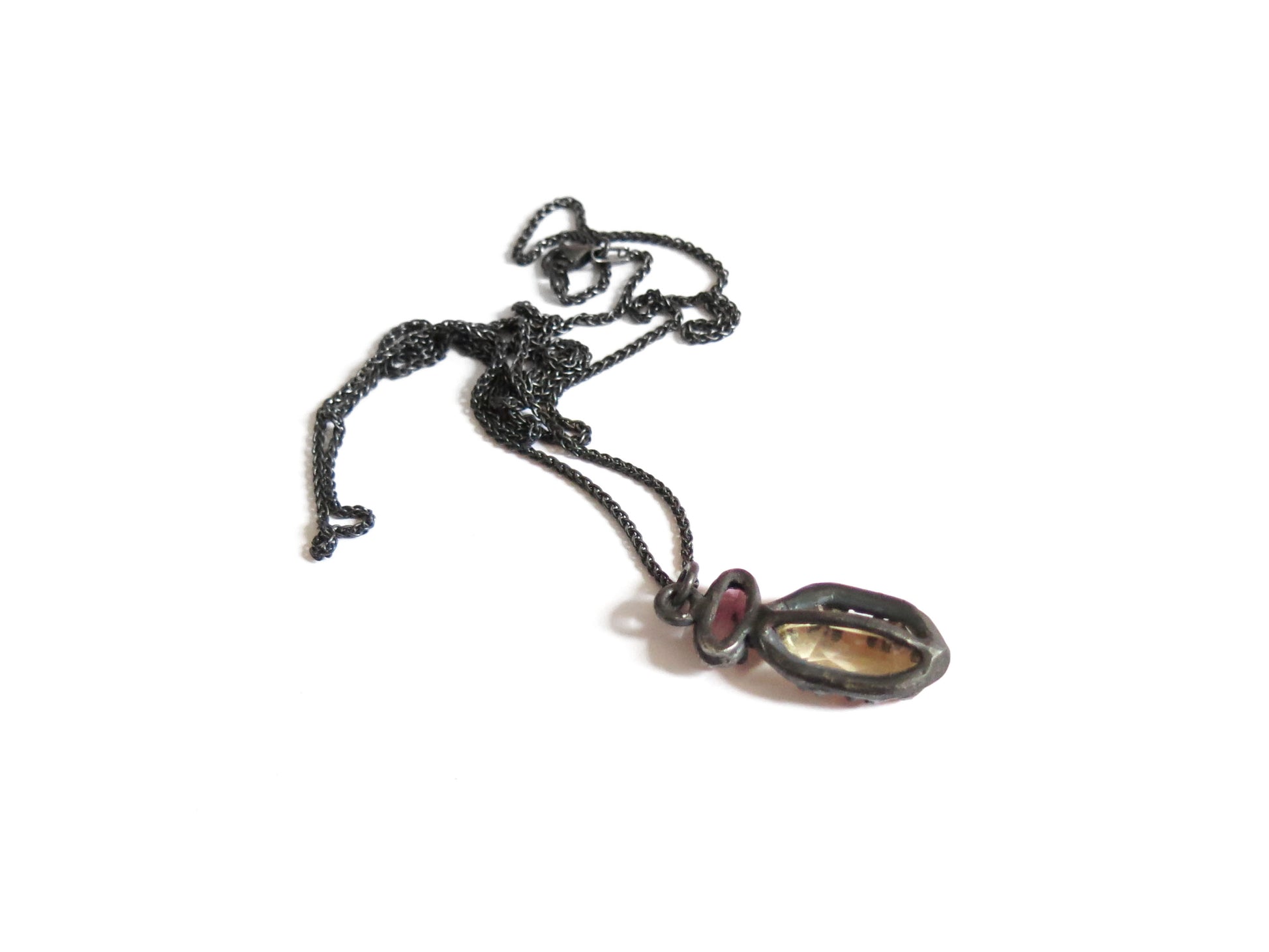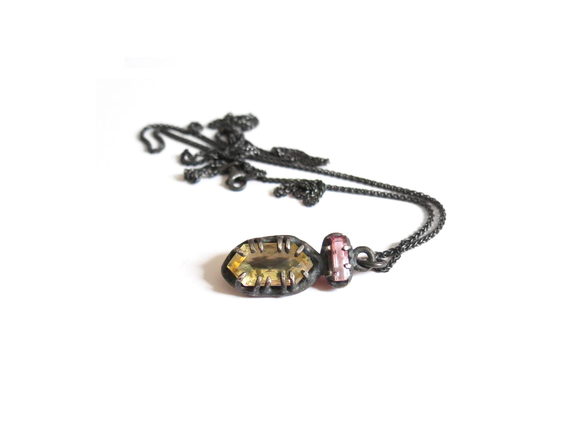 fancy cut citrine topped with a pink ombre tourmaline. set in sterling silver with a rough oxidized finish. oxidized silver will evolve and become brighter and shinier with wear. comes on a 20" silver chain.