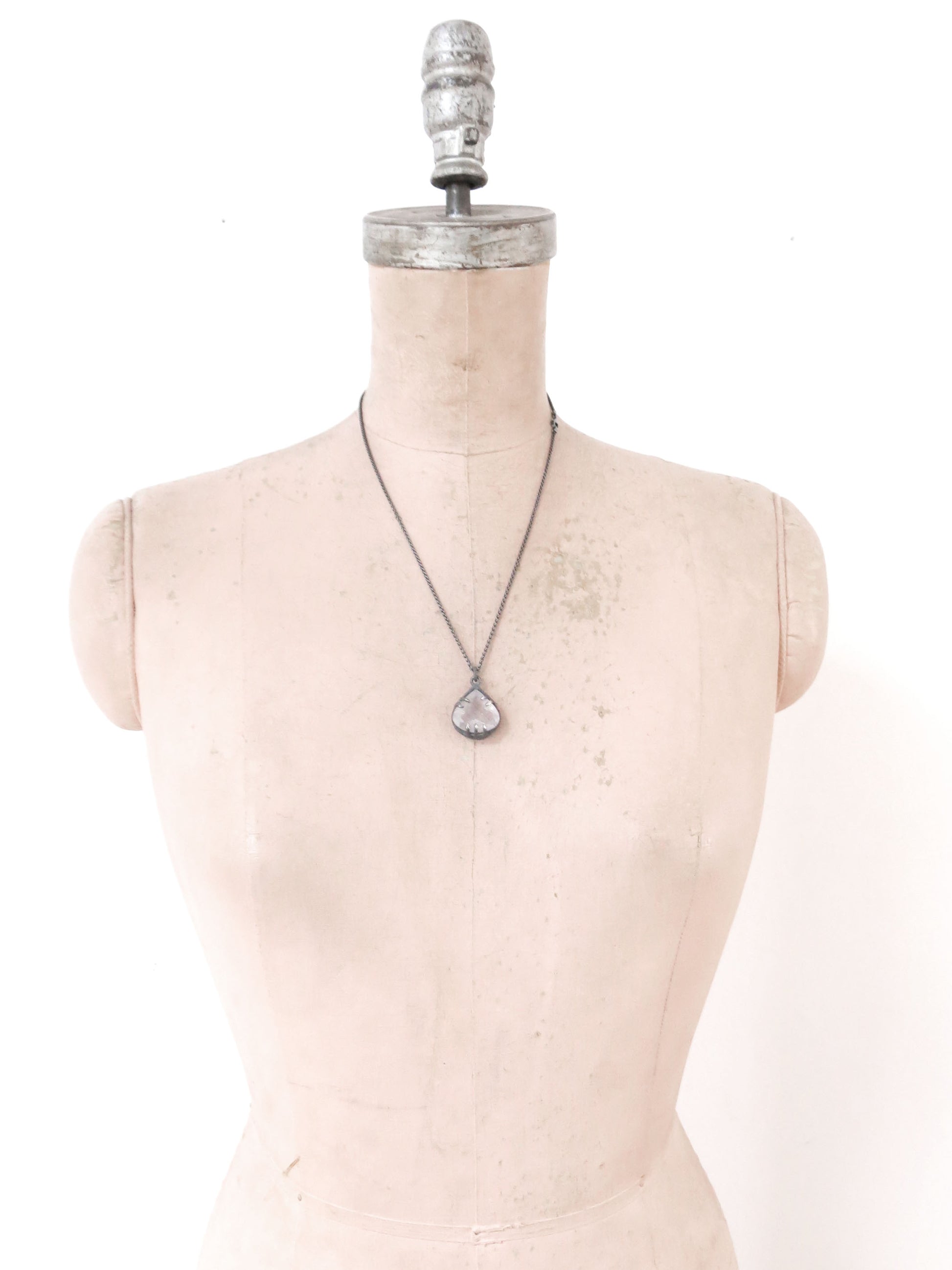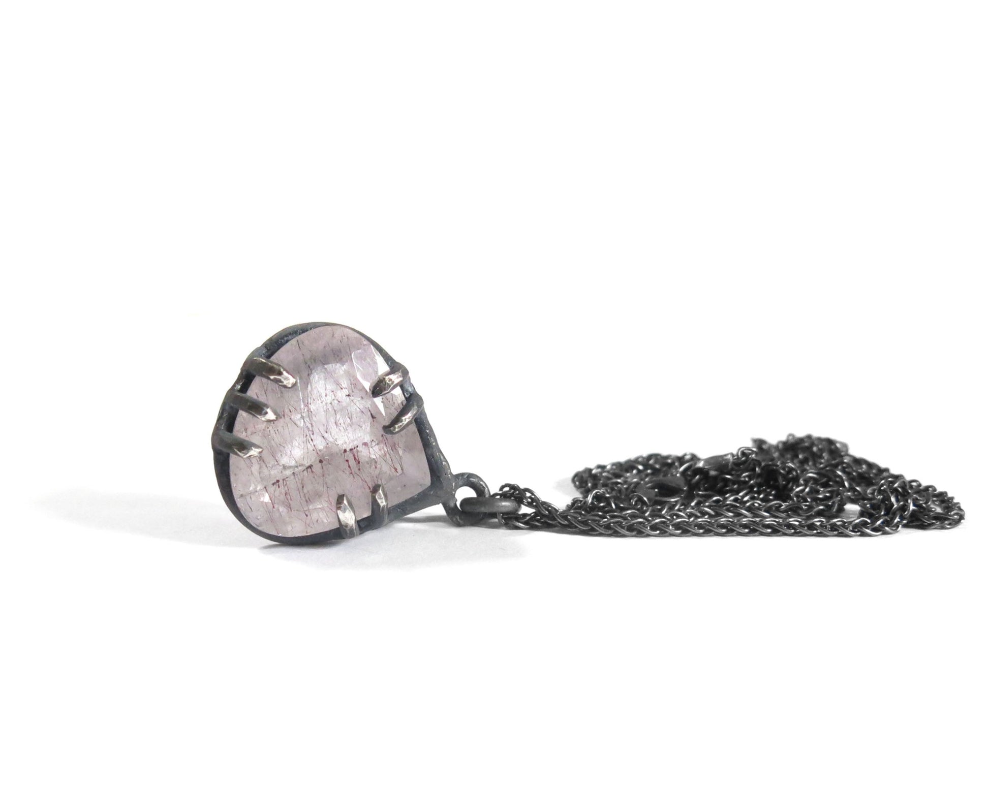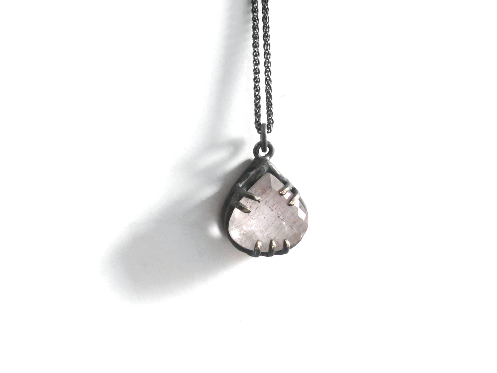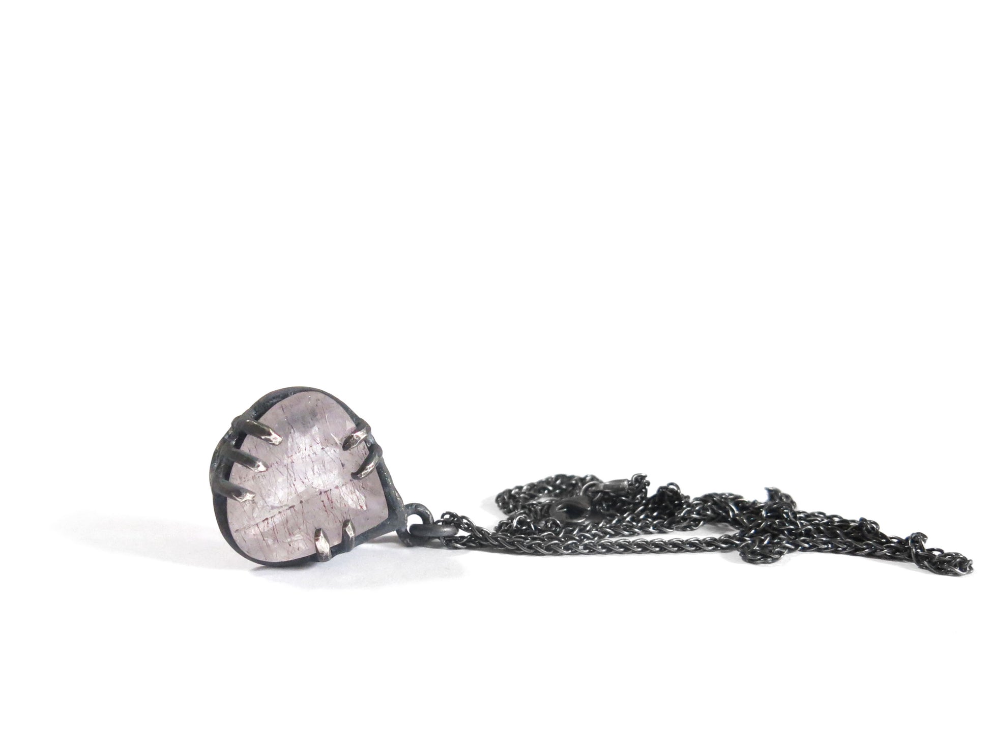 the setting was built around the crystal and then cast in solid sterling silver with a rough oxidized finish. the dark finish will evolve with time and become brighter and shiner with wear.