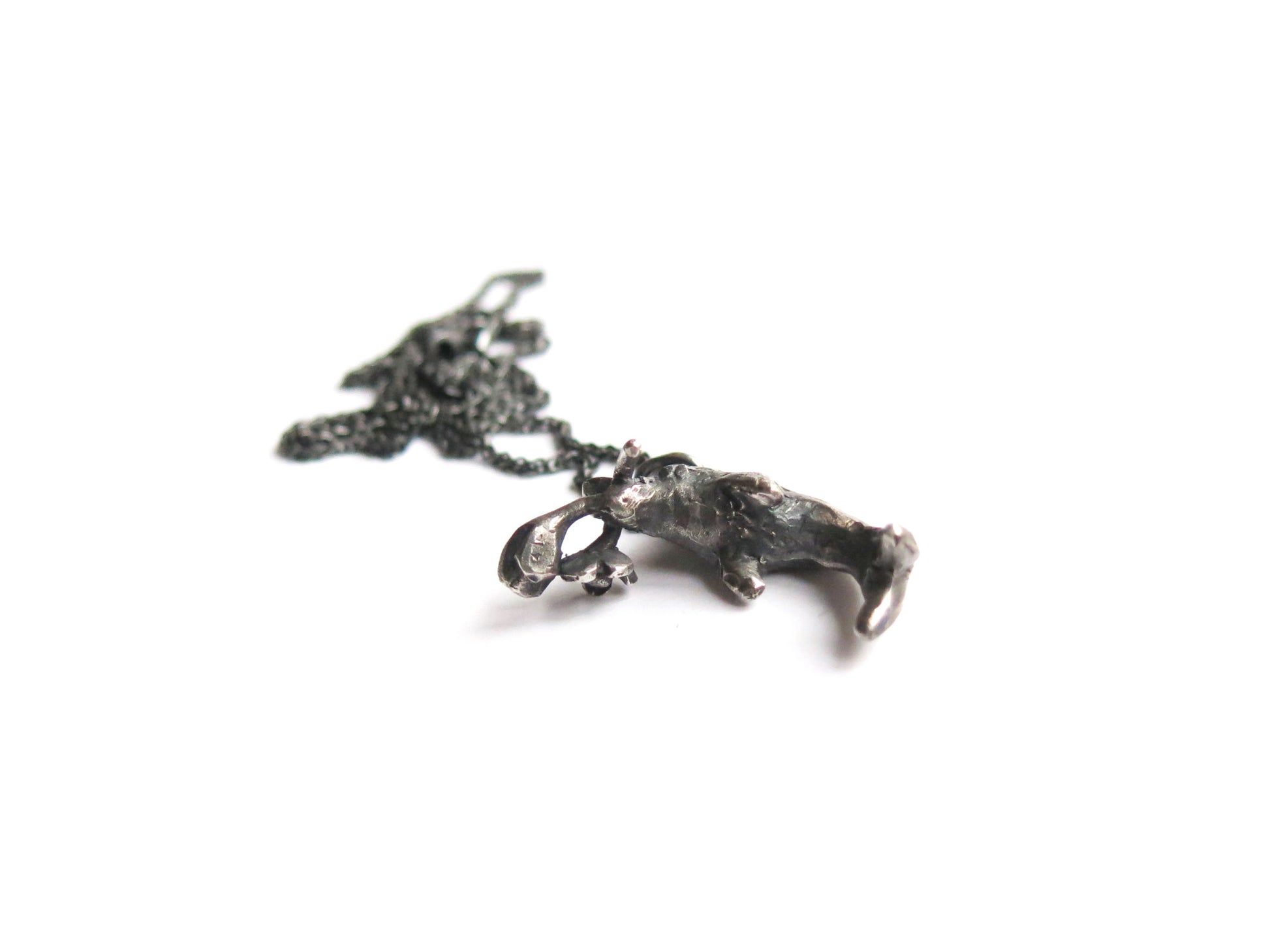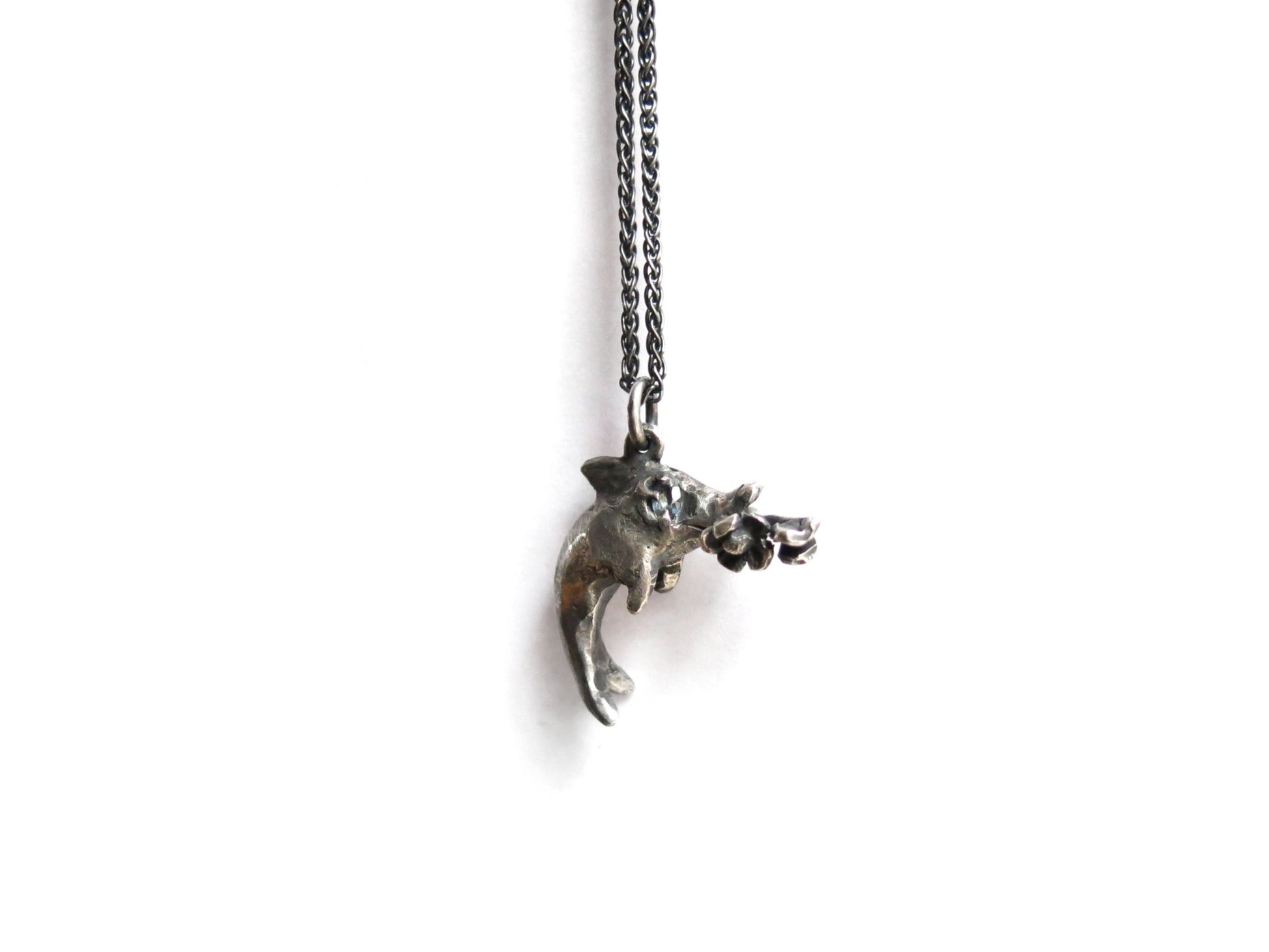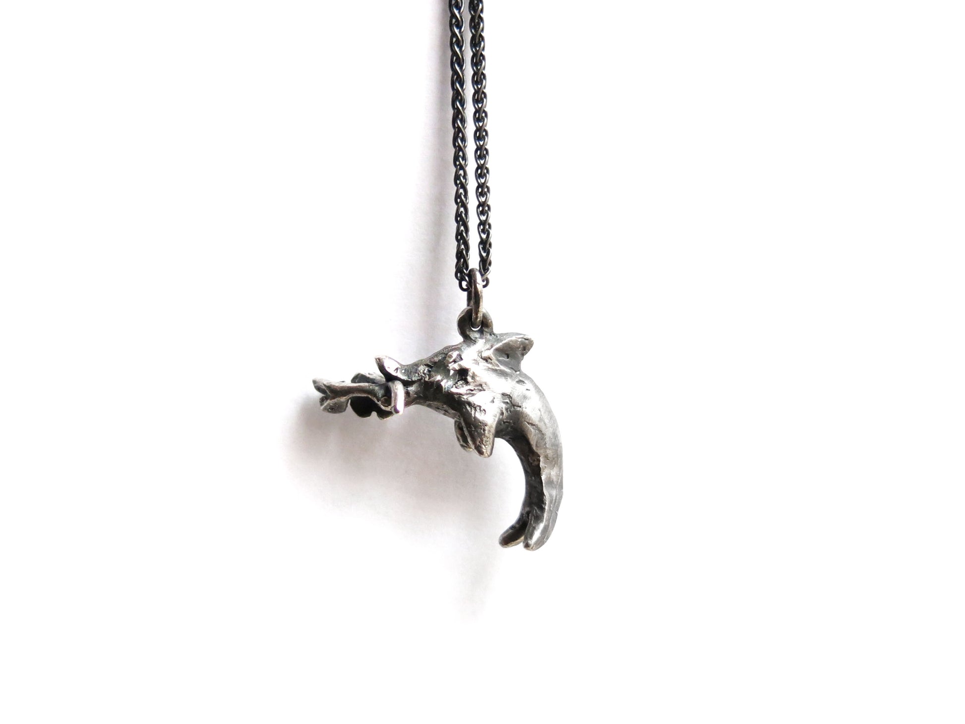 sculpted in wax and cast in solid sterling silver. darkened oxidized silver will evolve with wear and become brighter and shinier. comes on a 20" sterling silver chain.