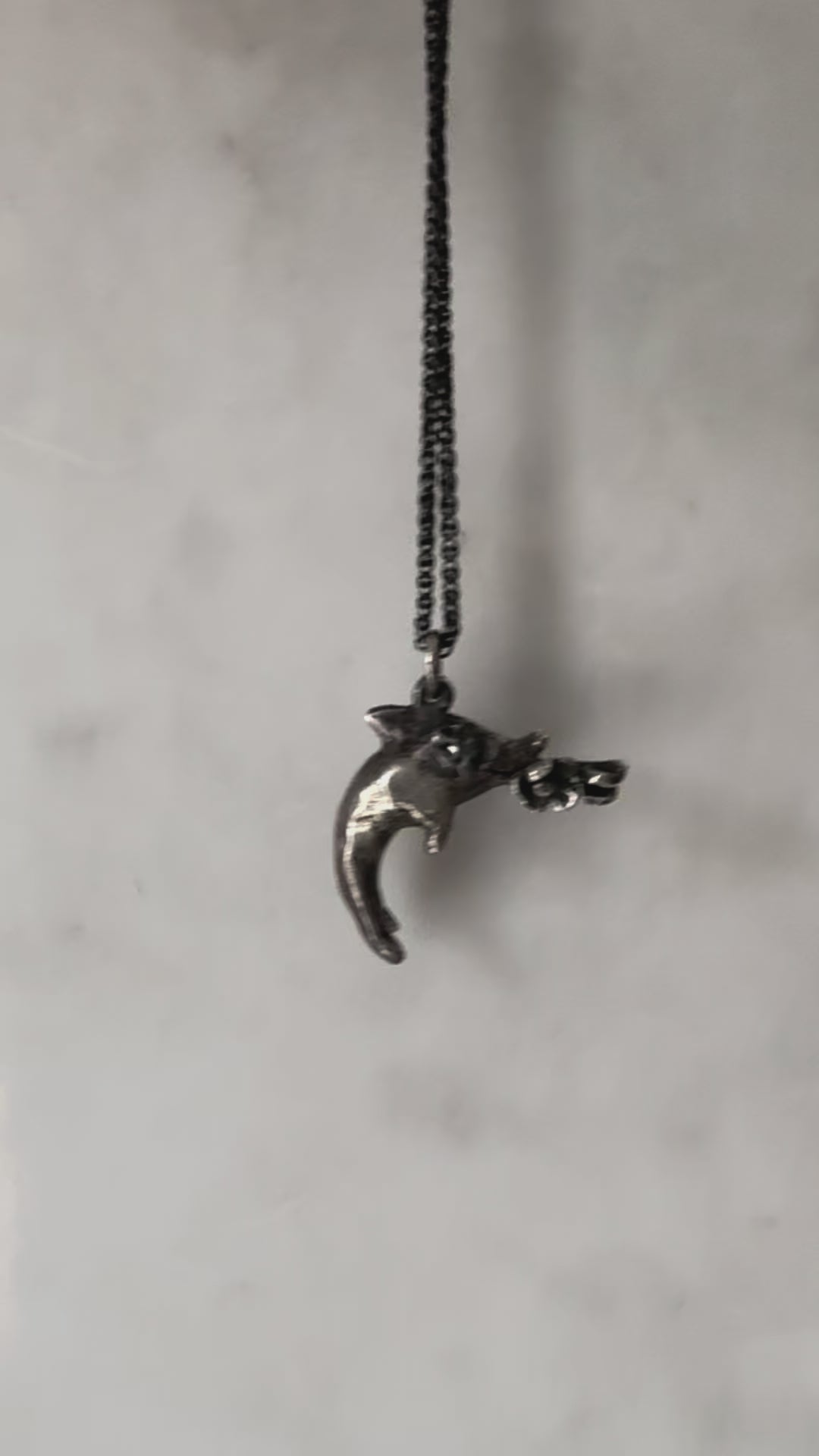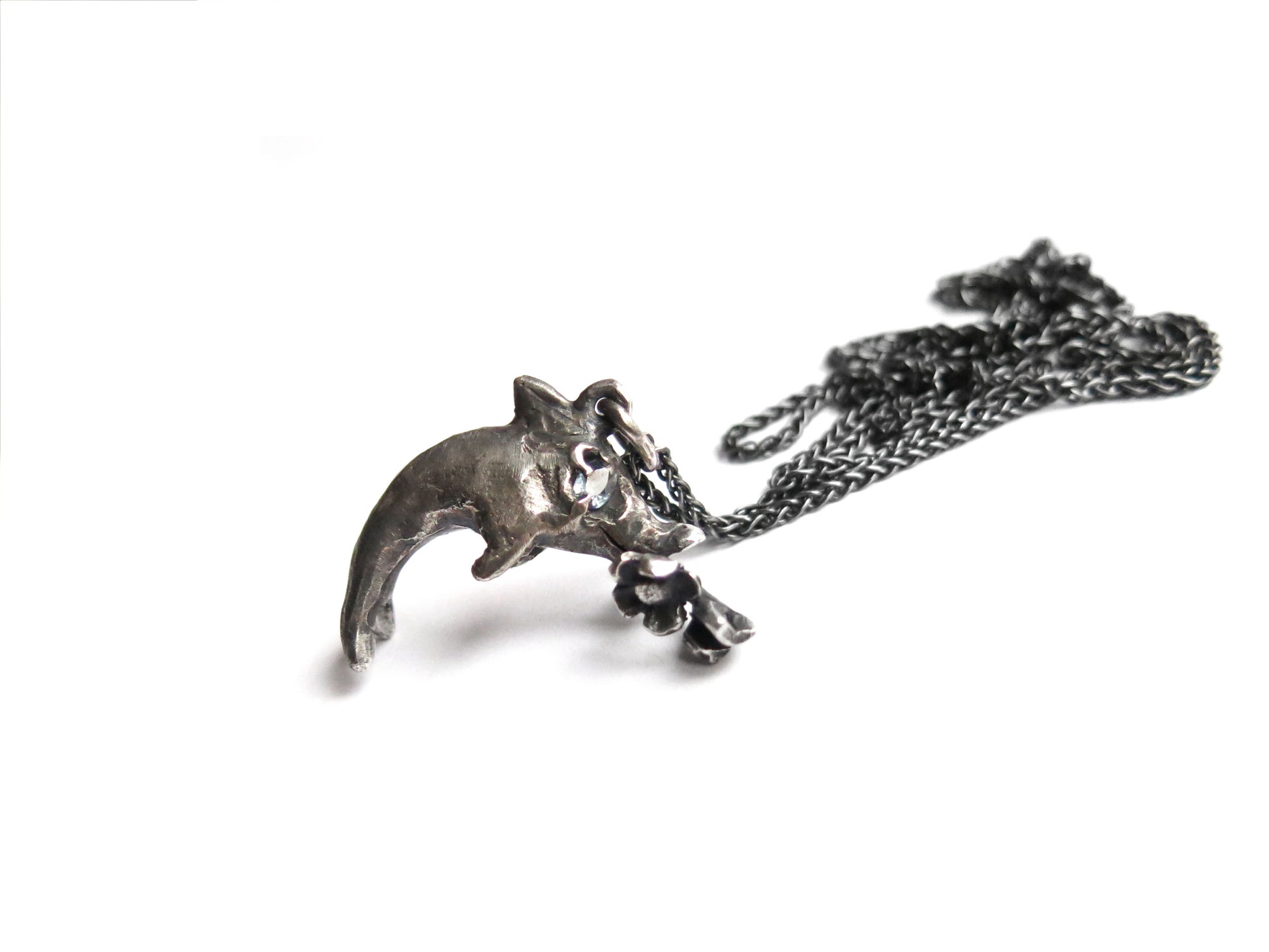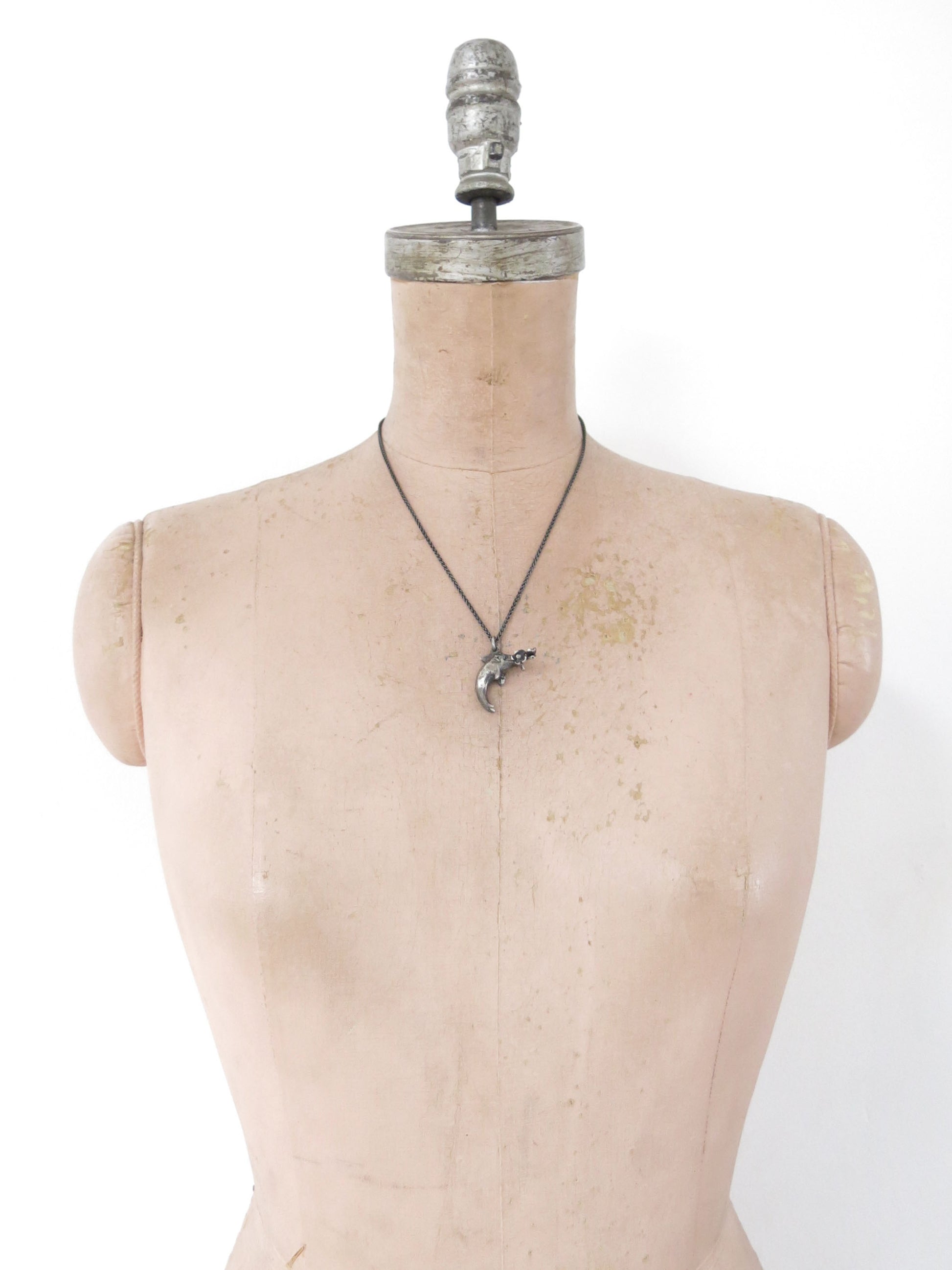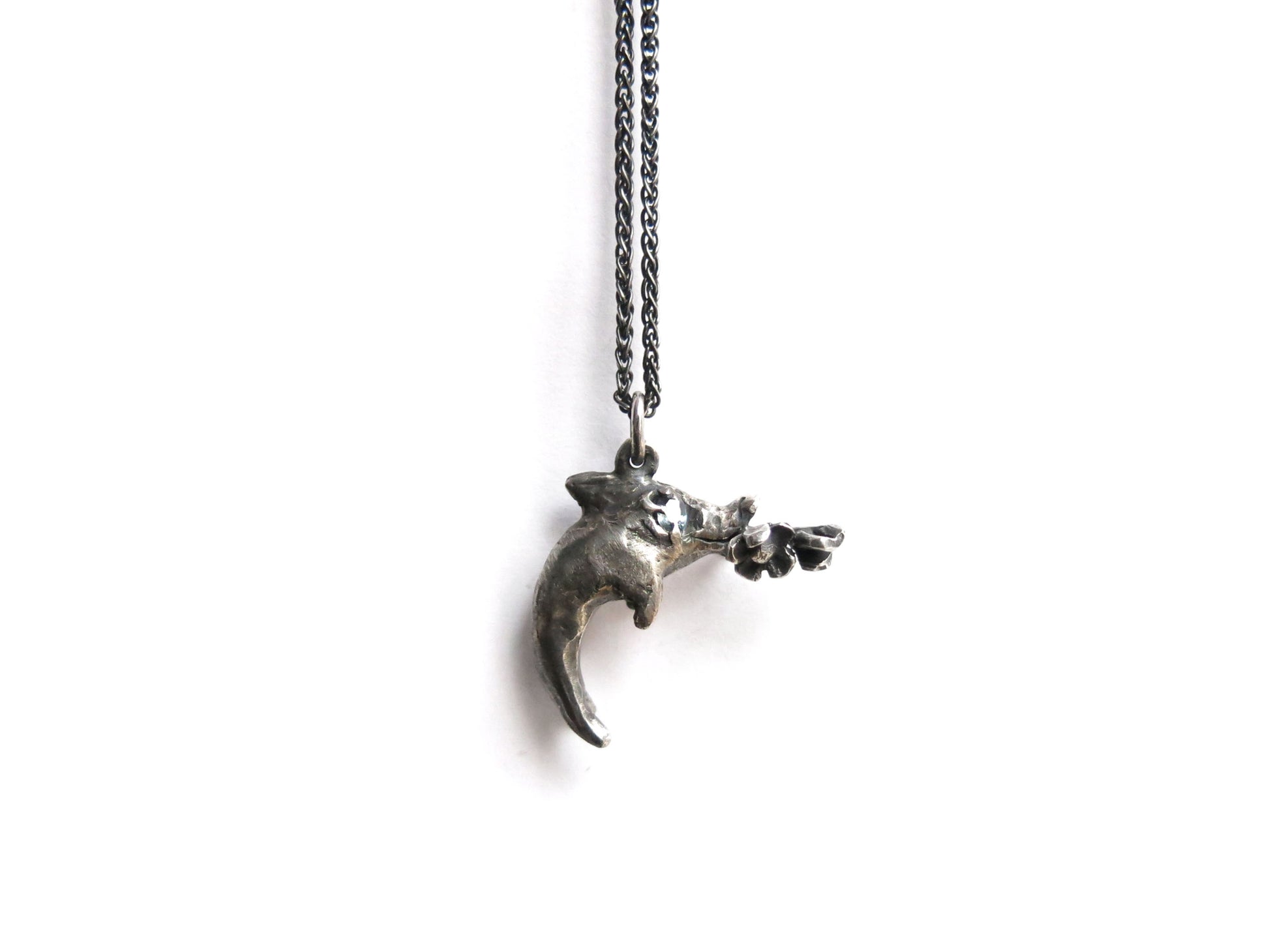sculpted in wax and cast in solid sterling silver. darkened oxidized silver will evolve with wear and become brighter and shinier. comes on a 20" sterling silver chain.