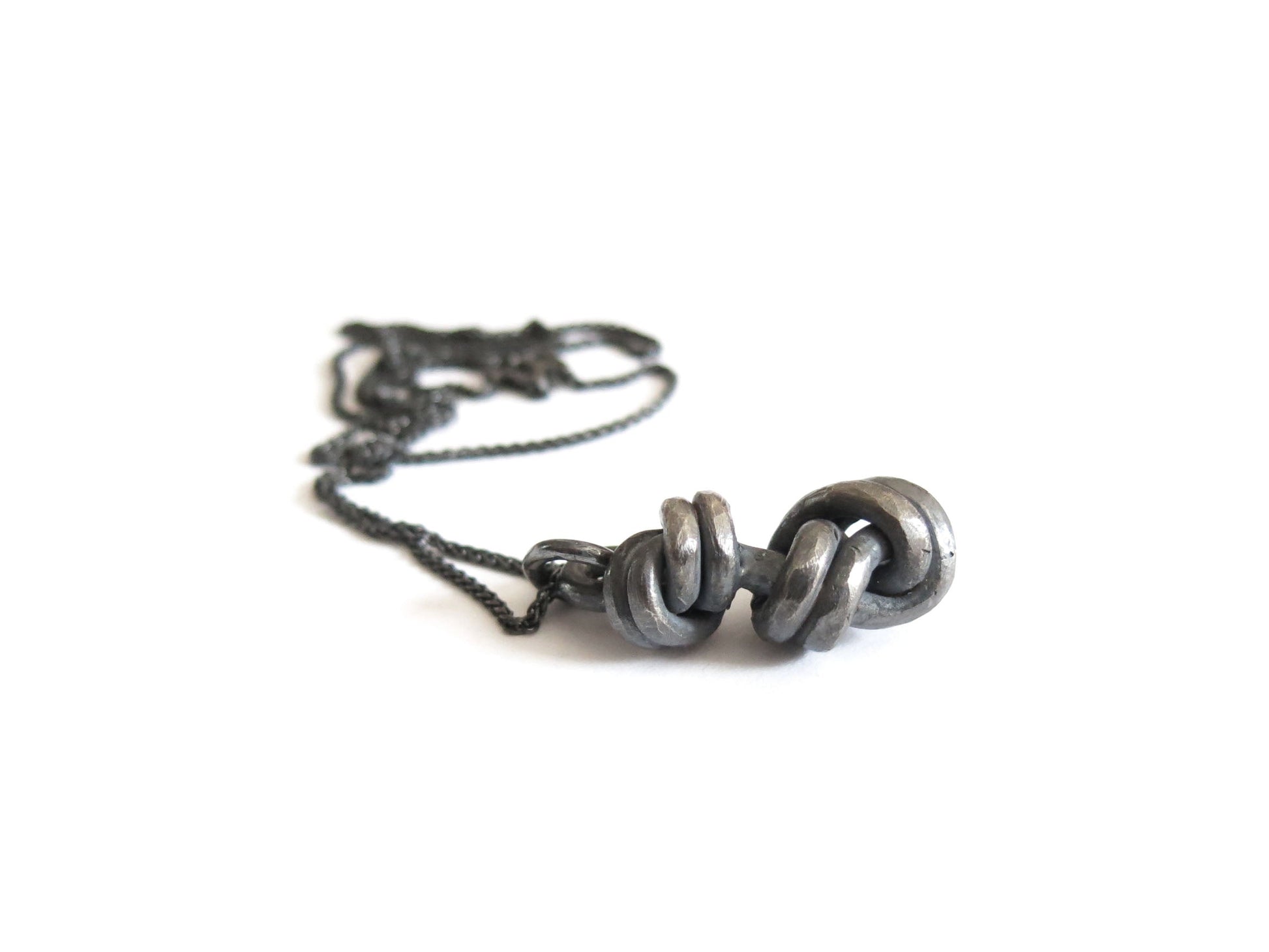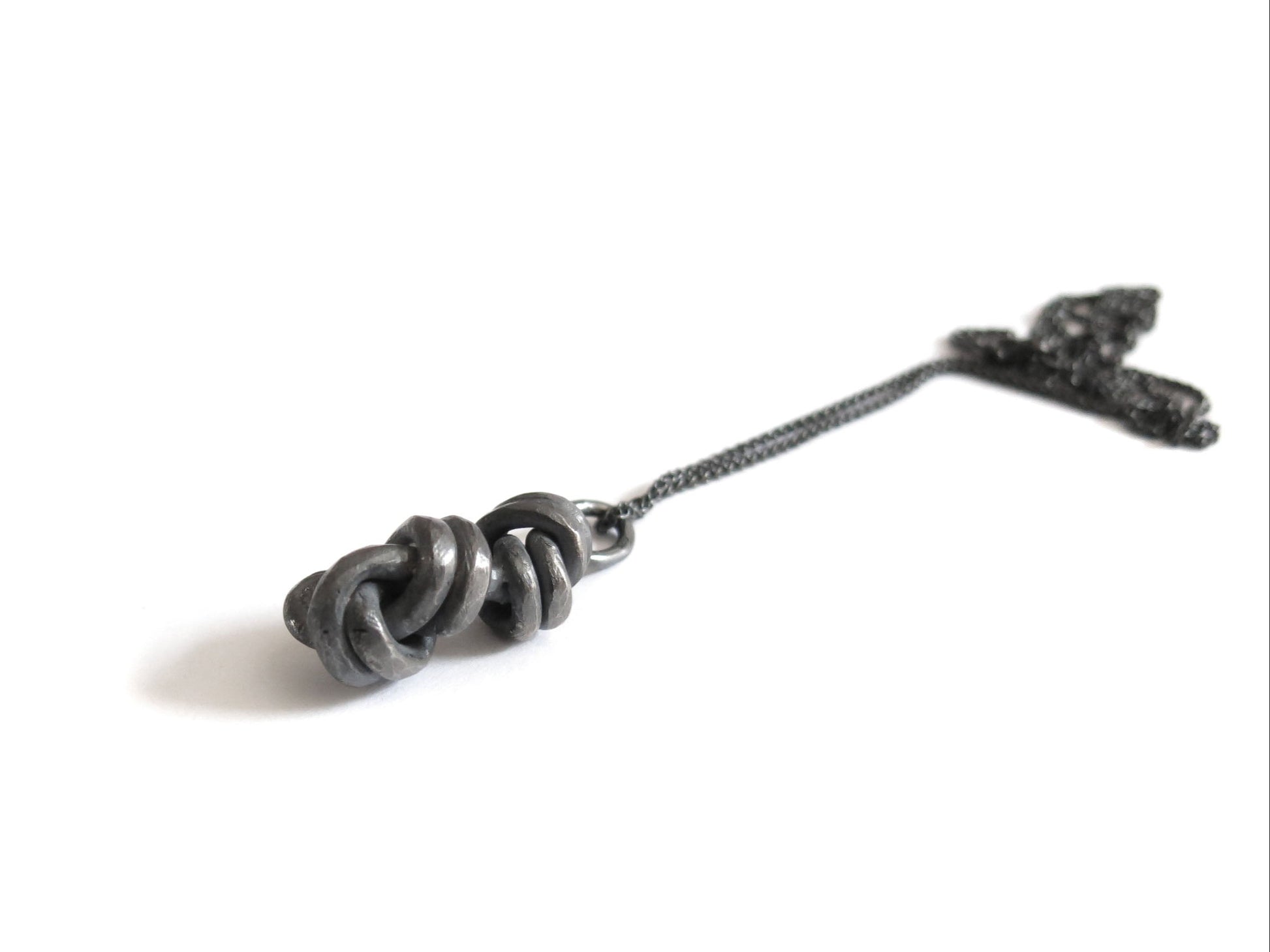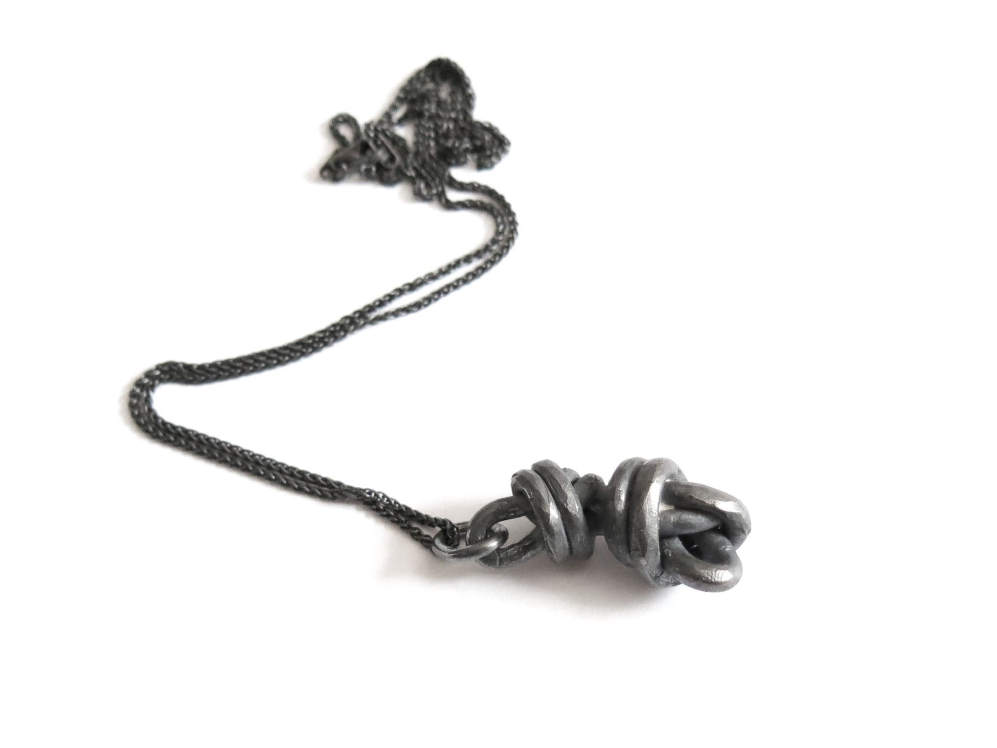 double knot pendant cast in solid sterling silver with a rough oxidized finish. darkened silver will evolve and become brighter and shiner with wear.