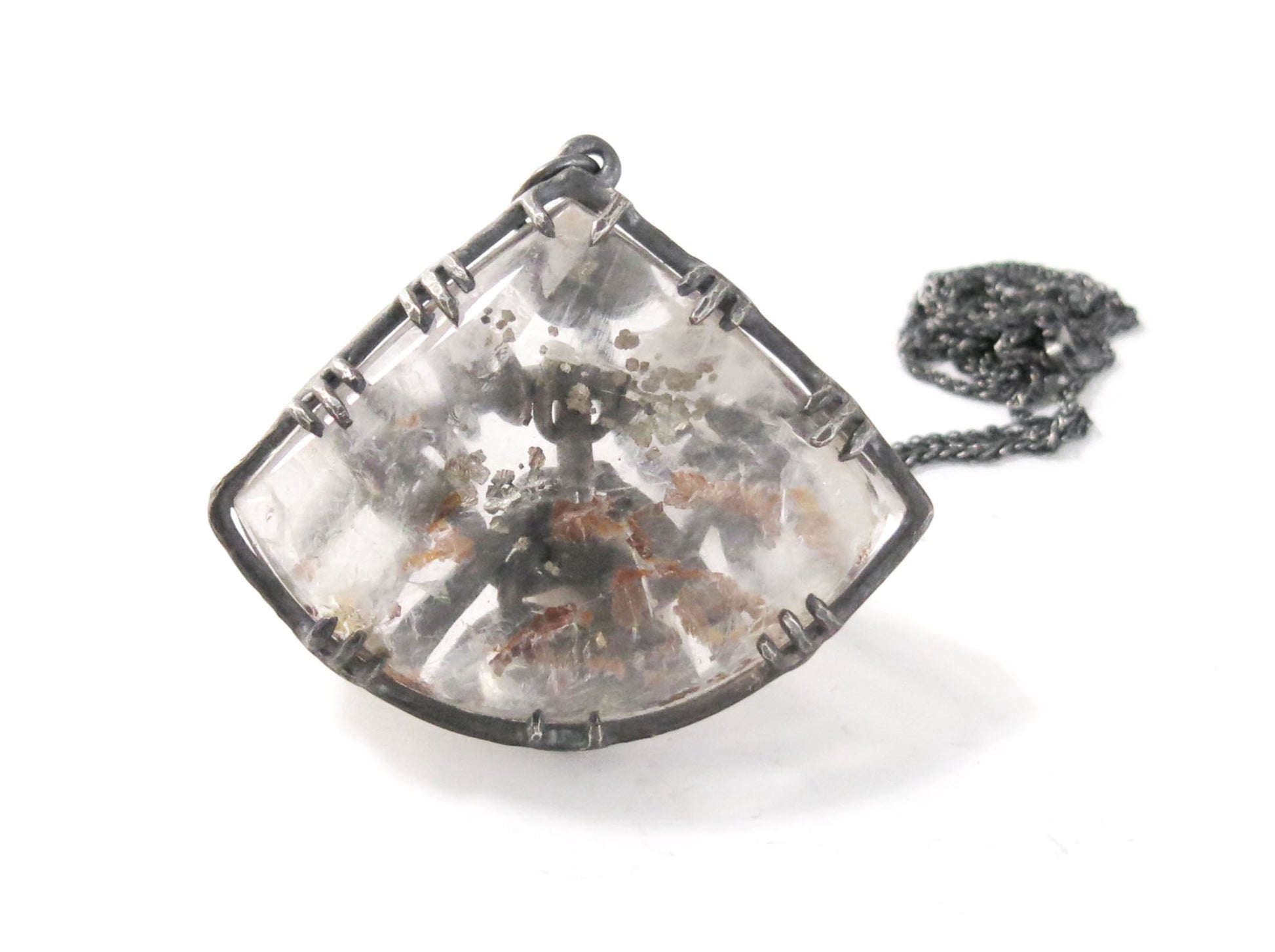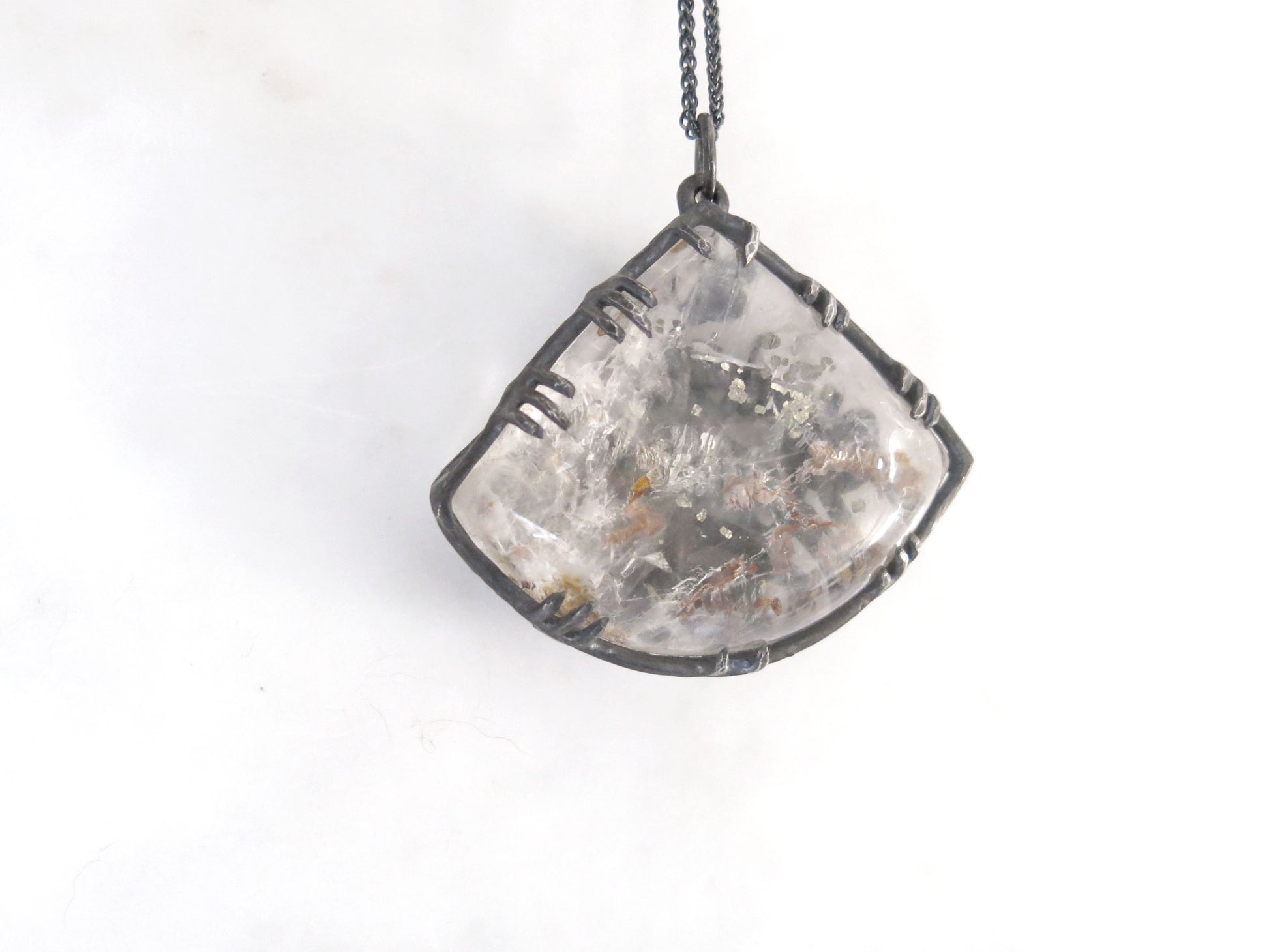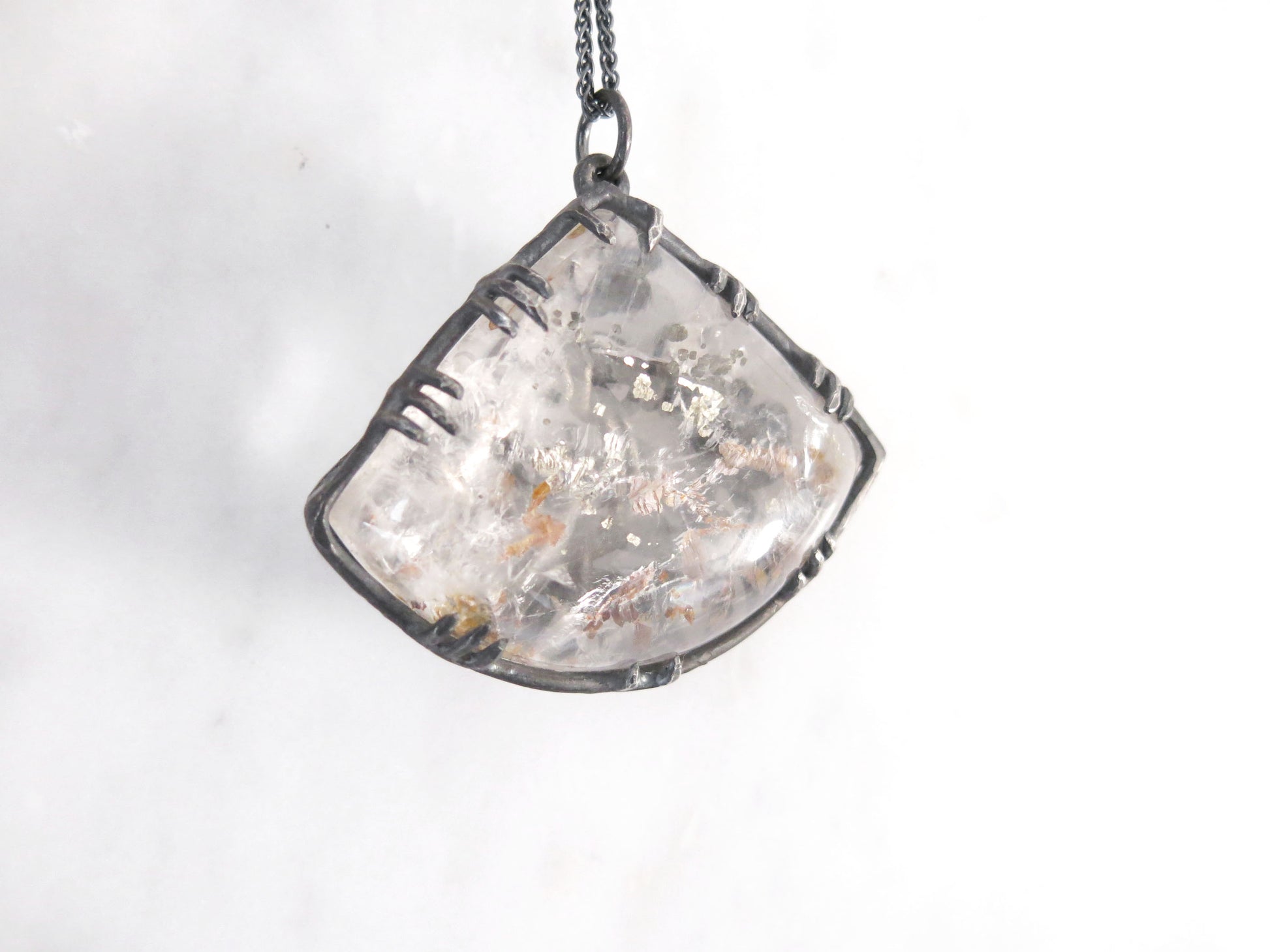 a really special HUGE fan shaped quartz crystal filled with metallic silvery pyrite and other metallic peachy coloured mineral inclusions. sterling silver knot motif setting with a rough oxidized finish.