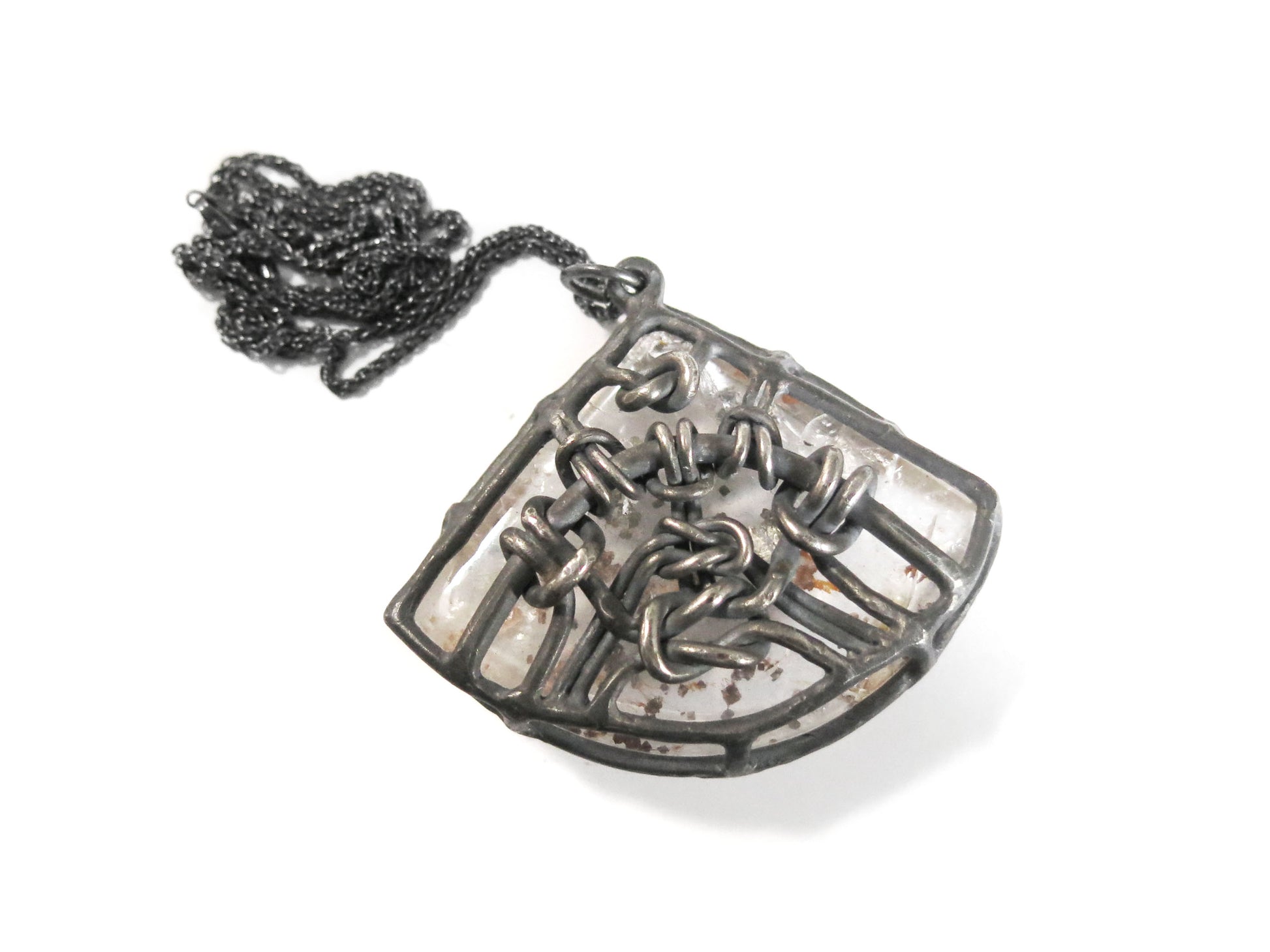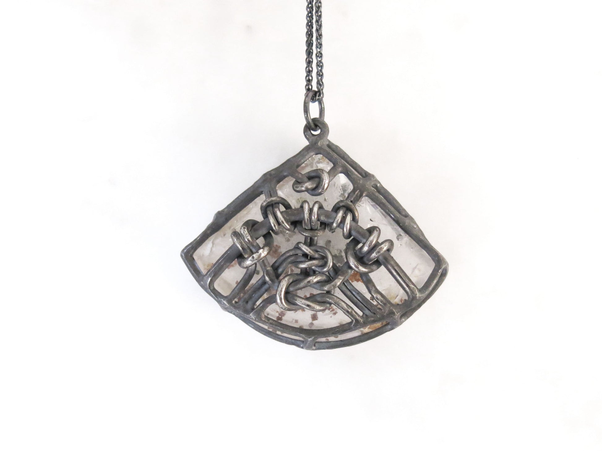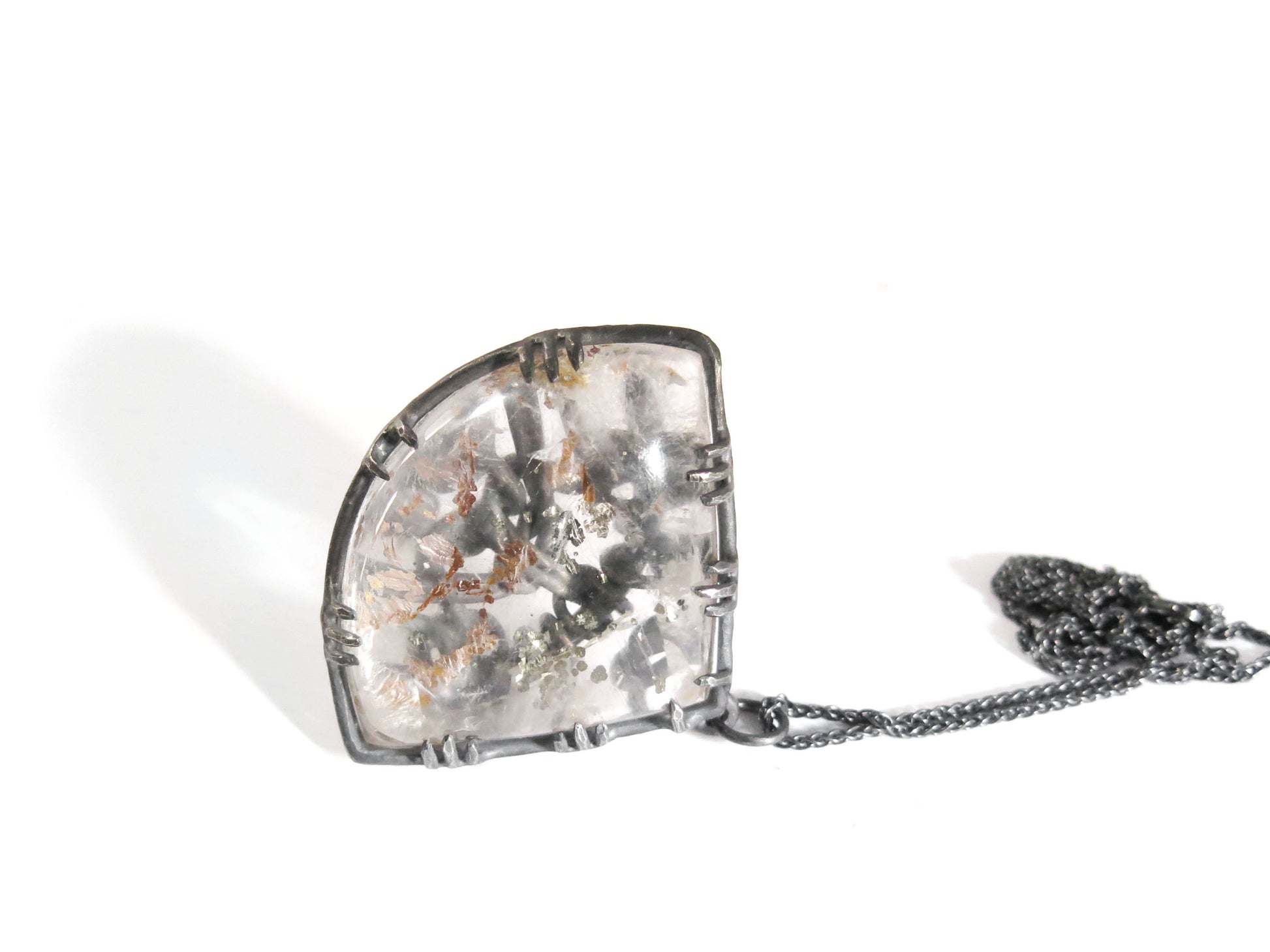 a really special HUGE fan shaped quartz crystal filled with metallic silvery pyrite and other metallic peachy coloured mineral inclusions. sterling silver knot motif setting with a rough oxidized finish.