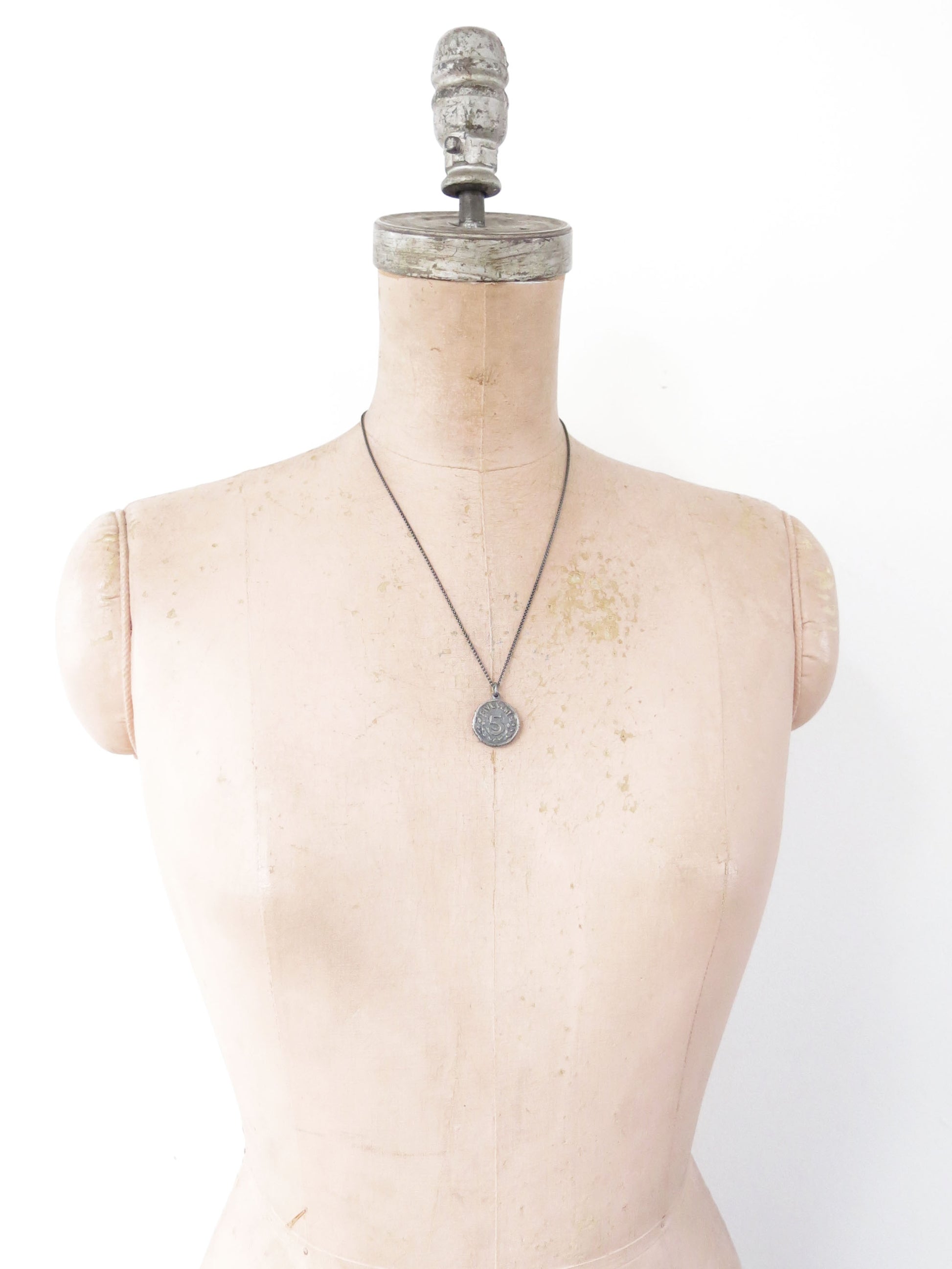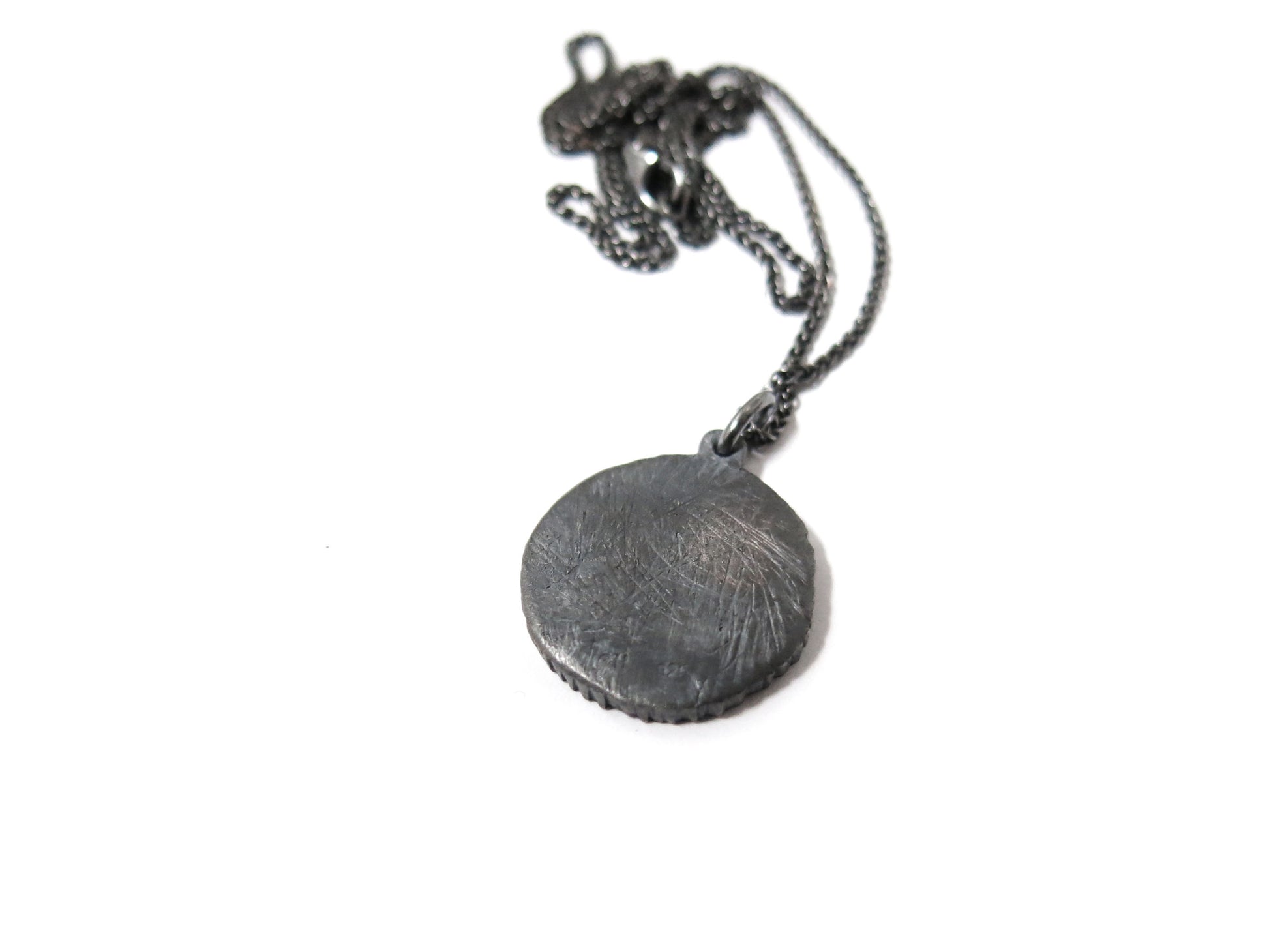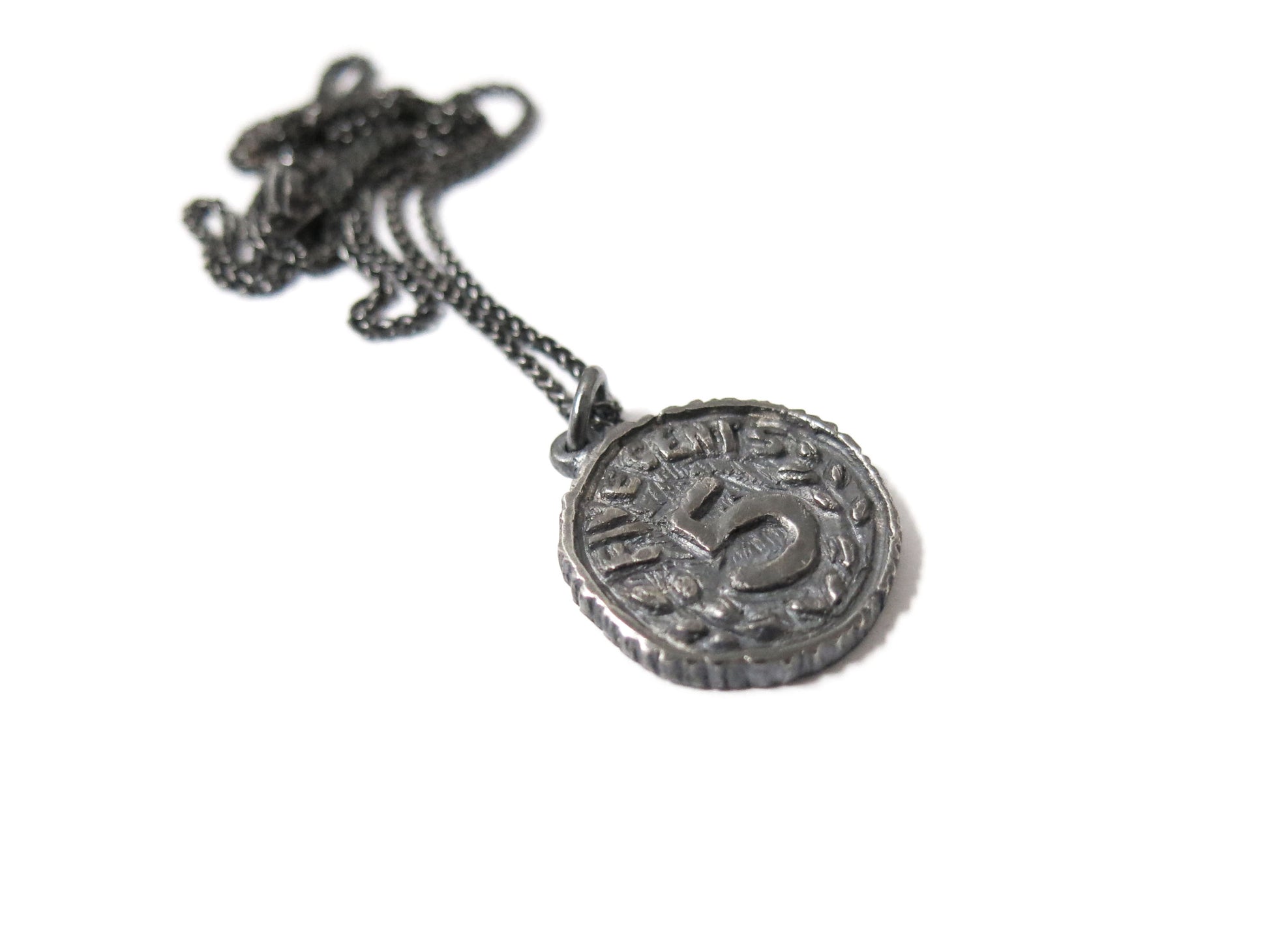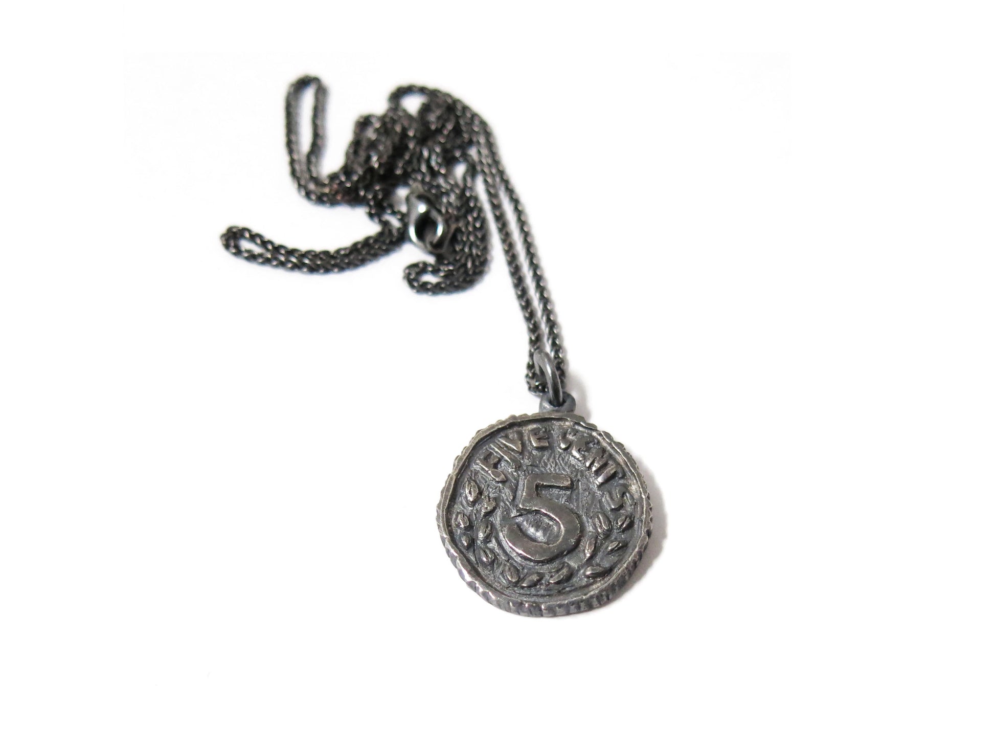 five cents talisman with textured edges. cast in solid sterling silver with a rough oxidized finish. darkened silver will evolve with wear and become brighter and shiner. comes on a 20" sterling silver chain.