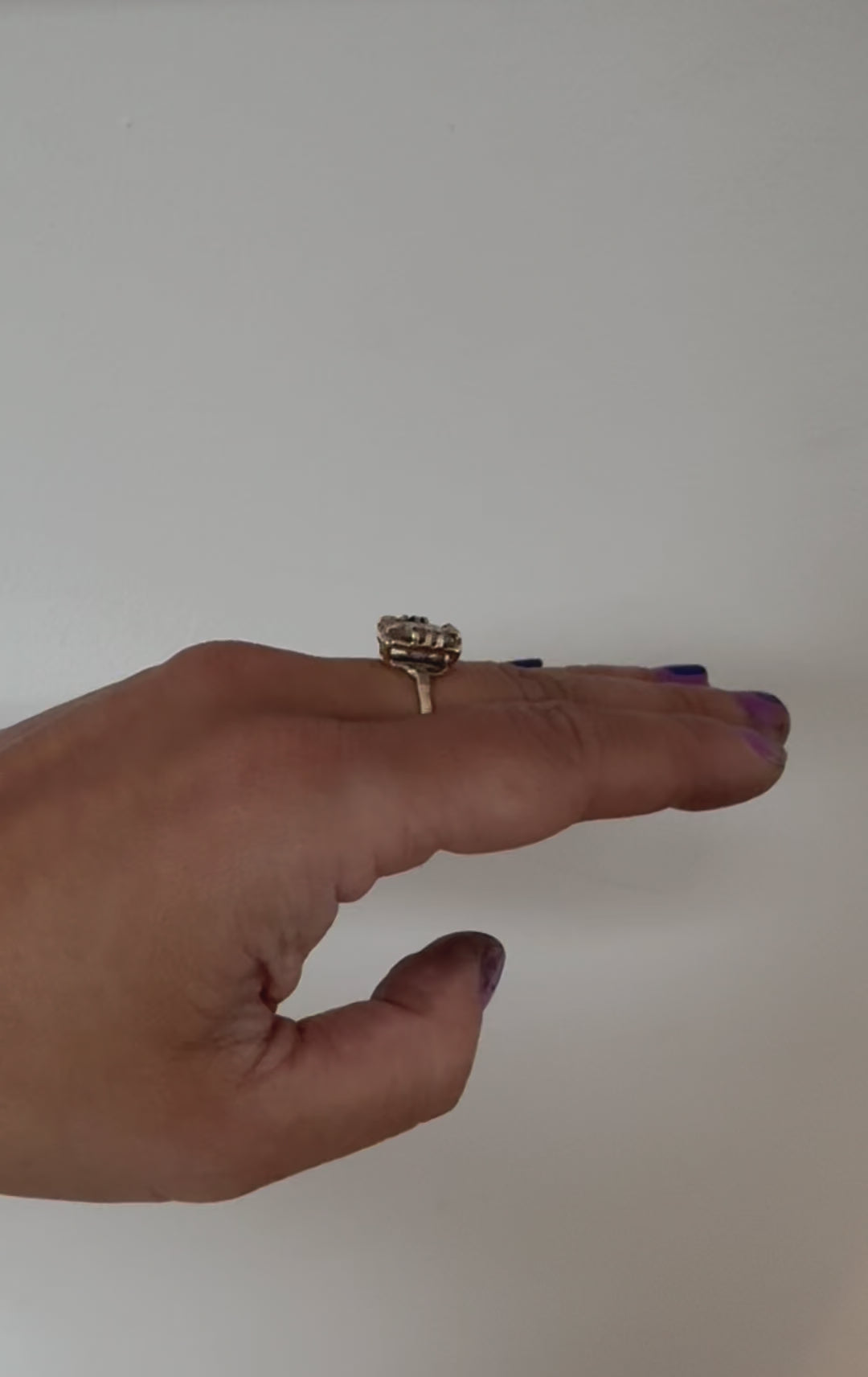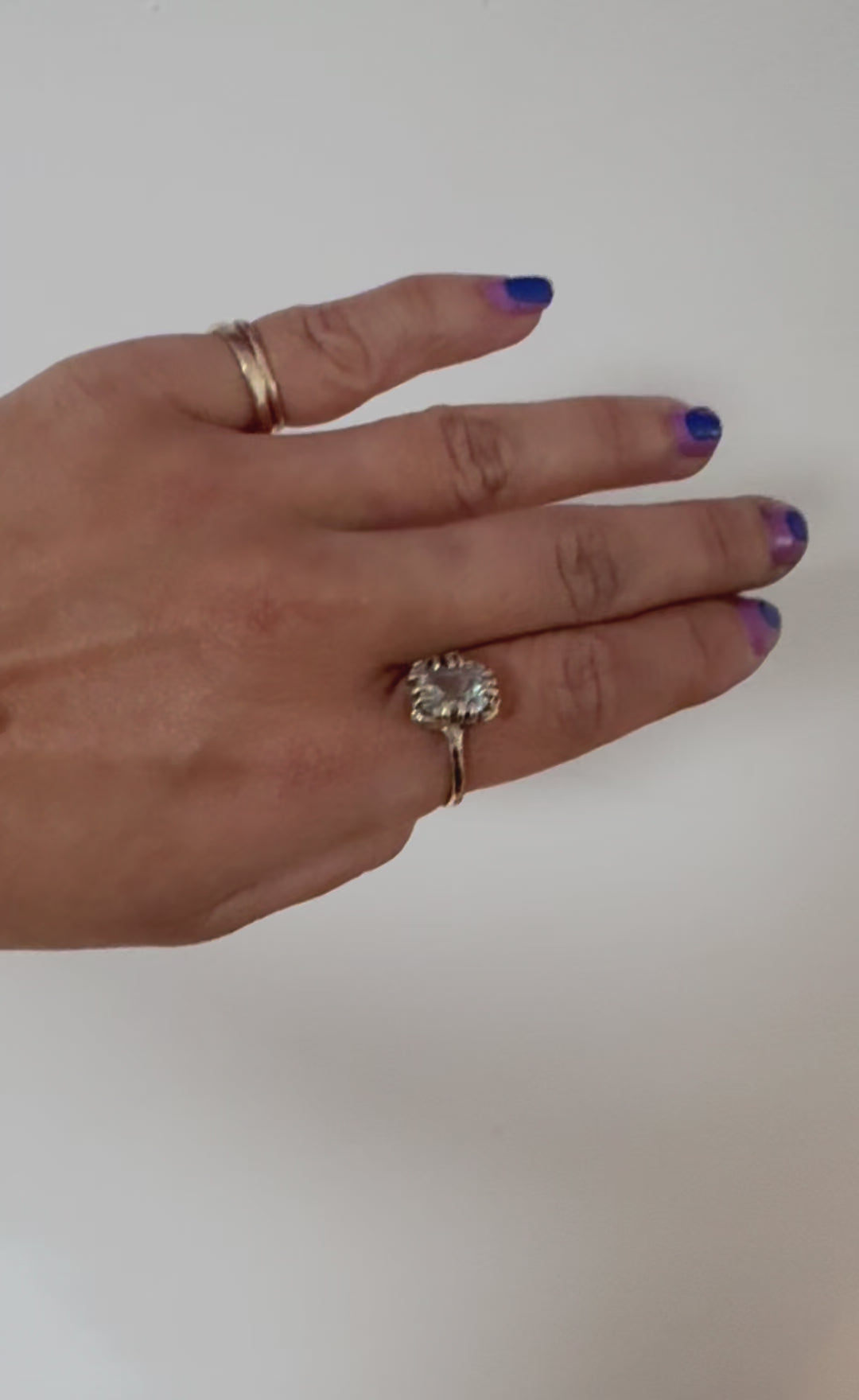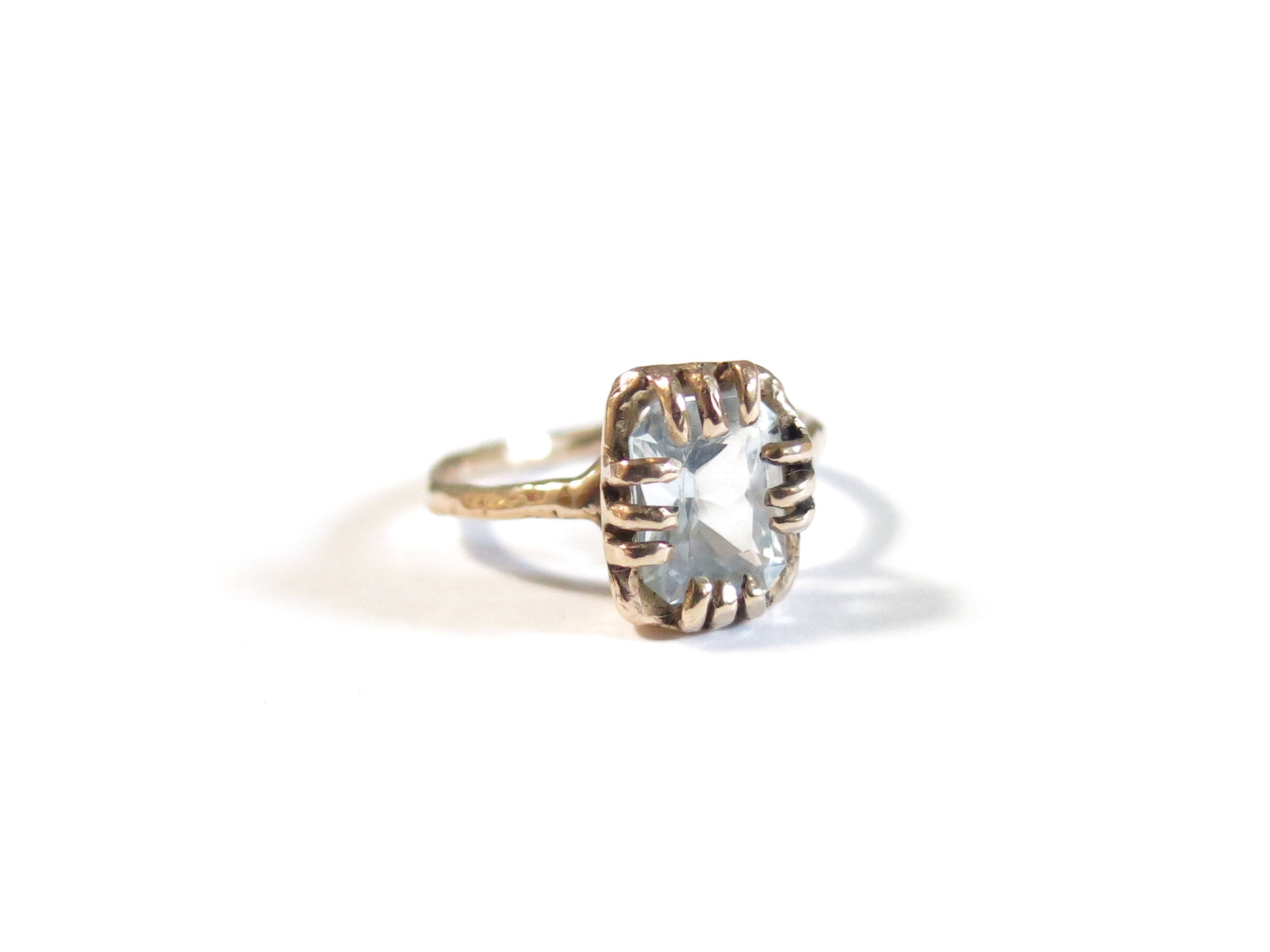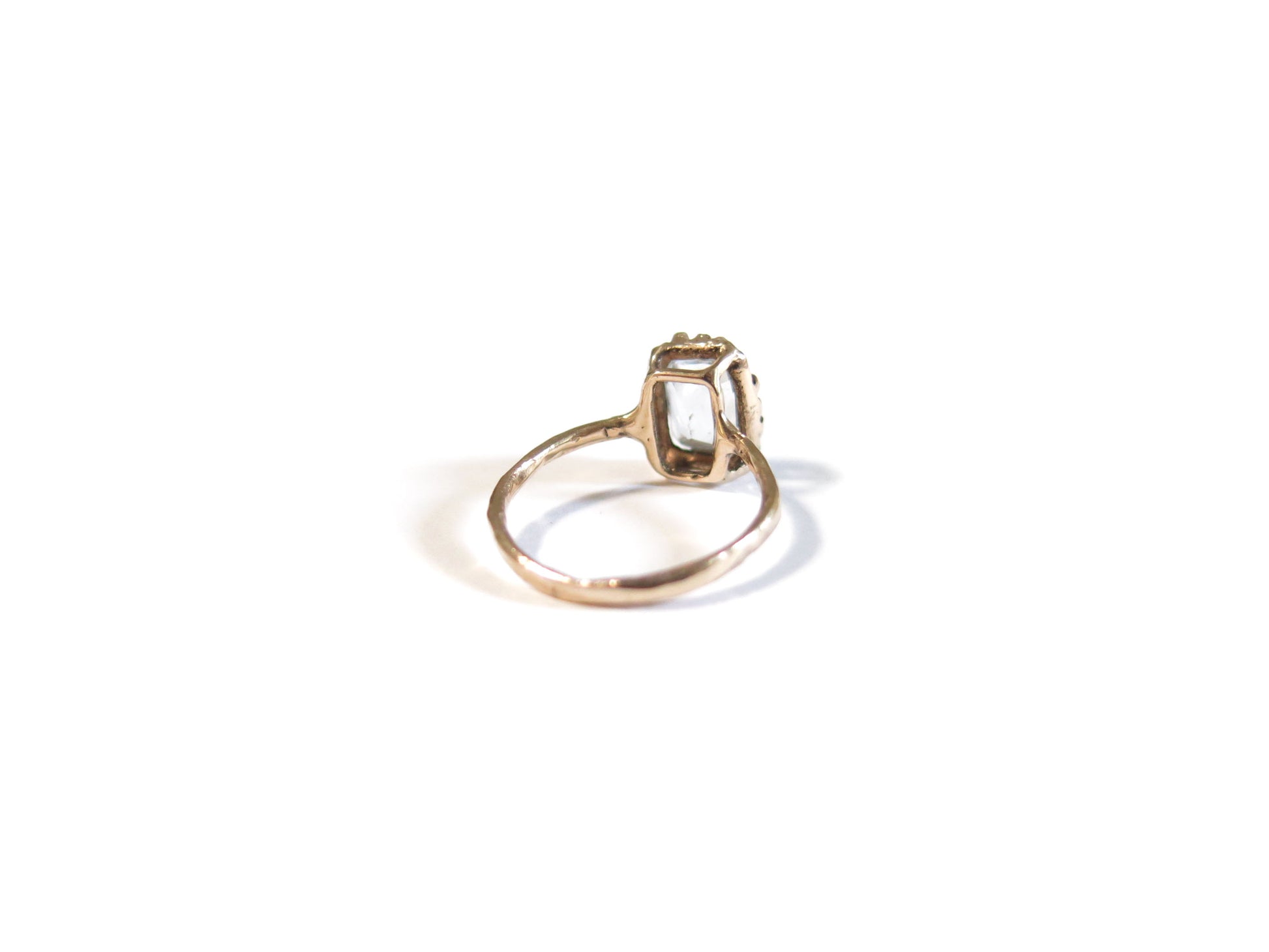 radiant cut 2.11 carat goshenite in a solid 14K yellow gold setting. the slightest hint of icy blue.