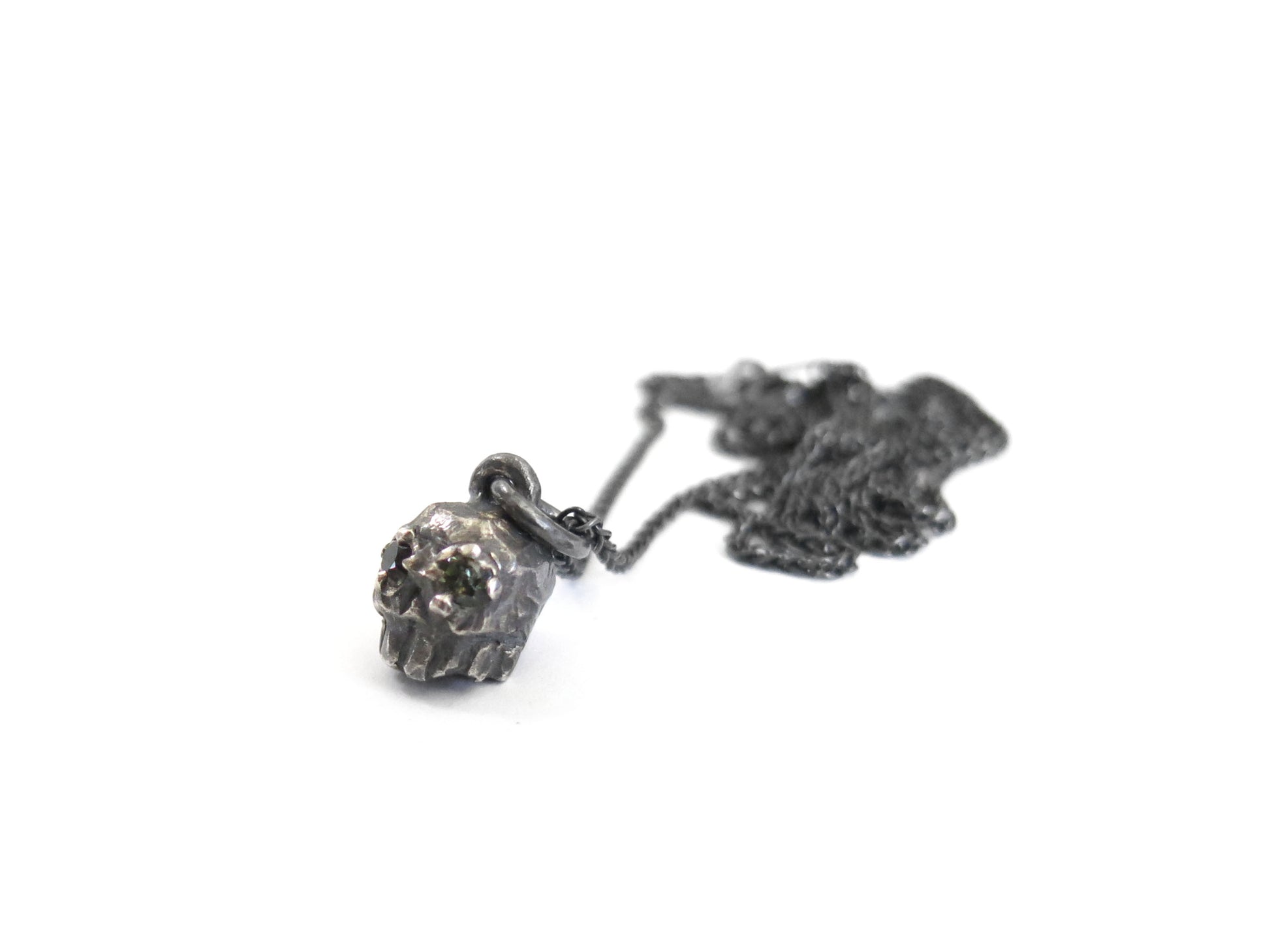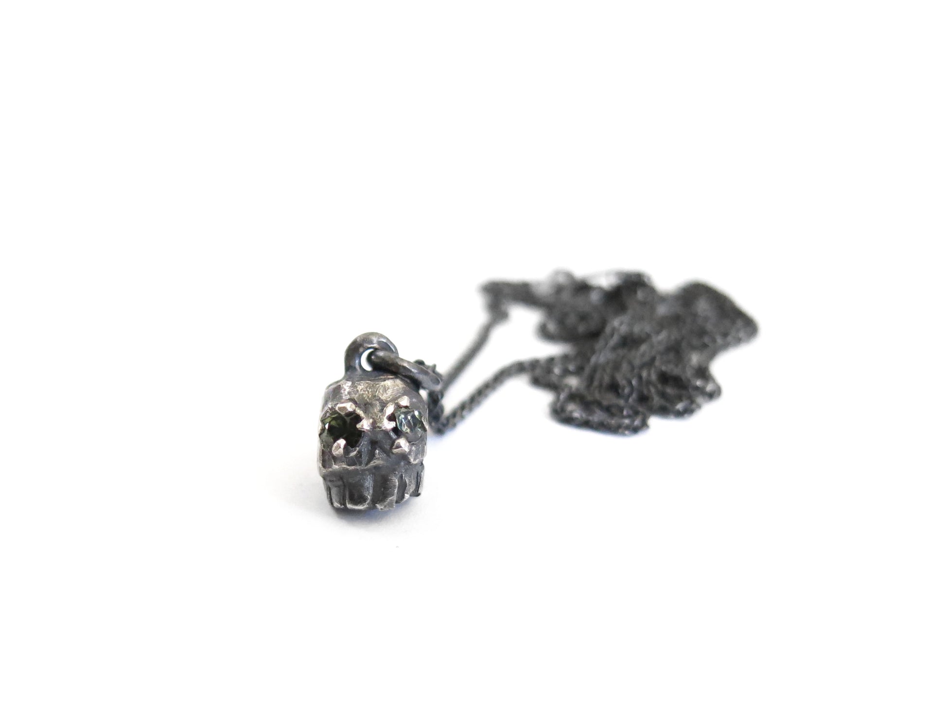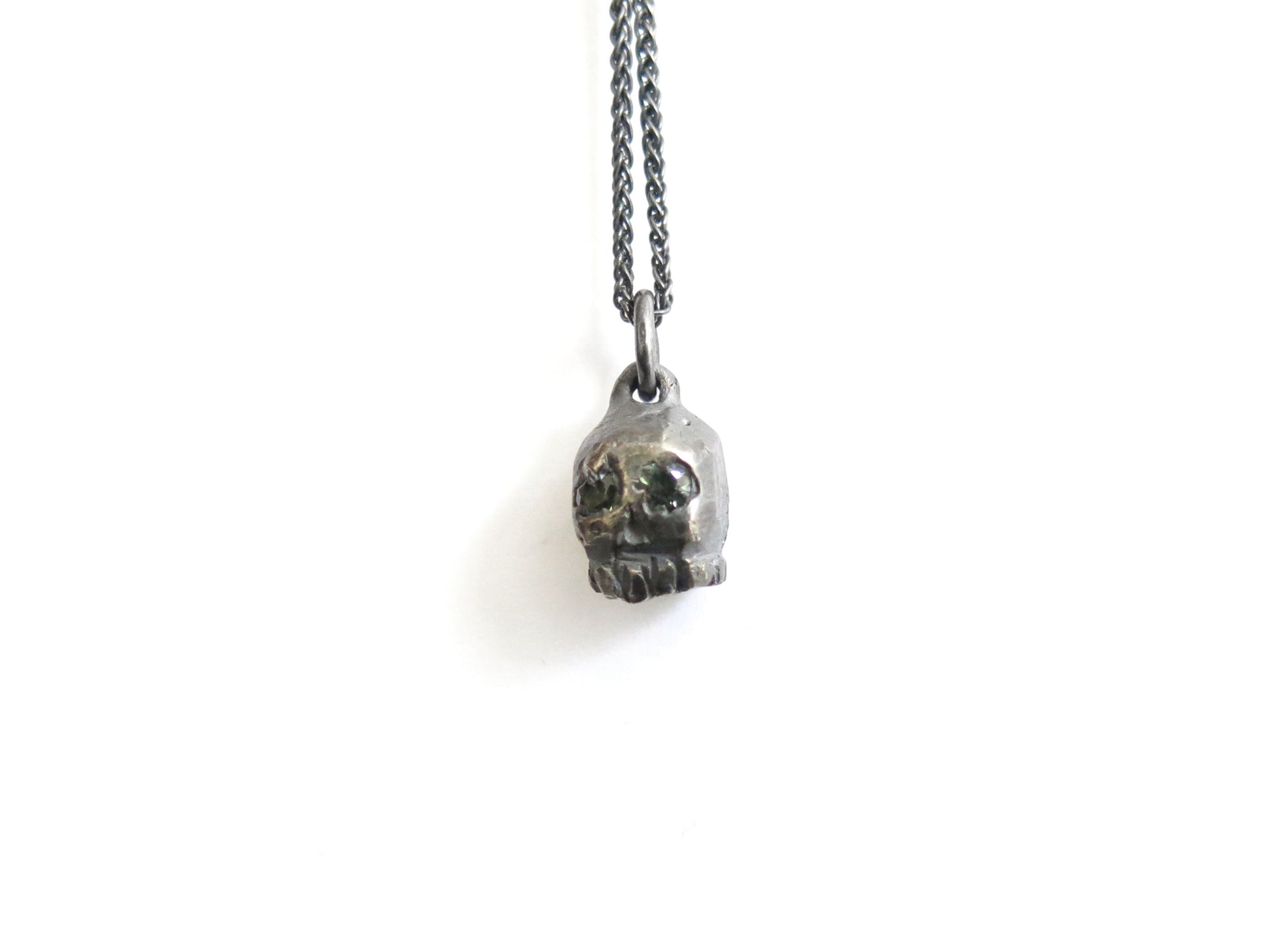 sterling silver skull with 3.5mm green sapphires. oxidized silver will evolve and become brighter and shinier with wear.