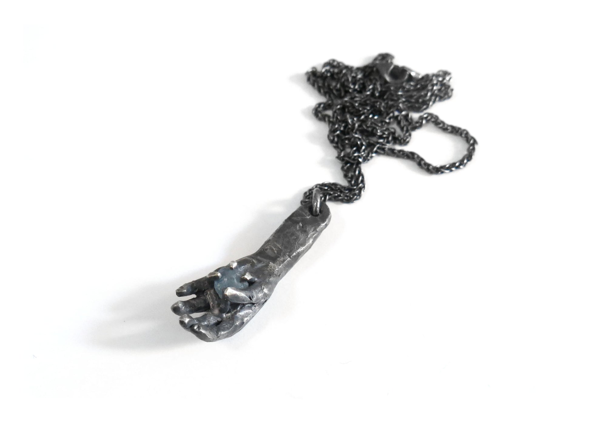 a hand sculpted in wax and cast in sterling silver, holding a 1.7 carat rough montana sapphire.