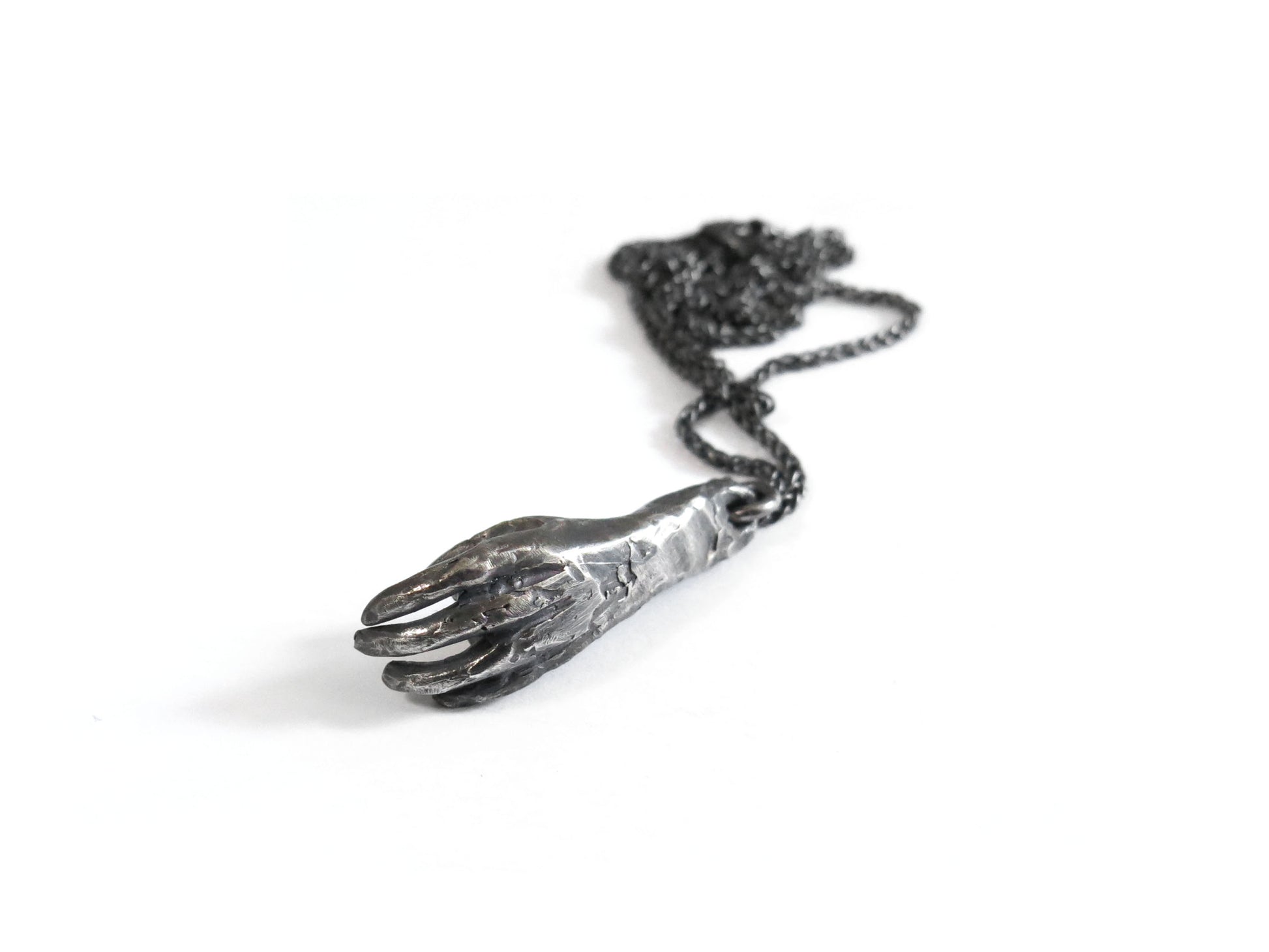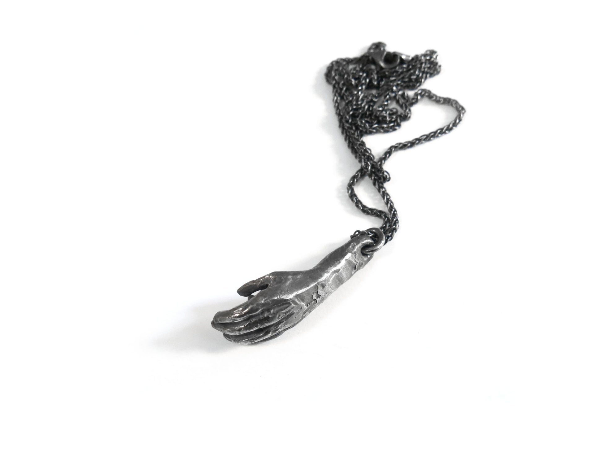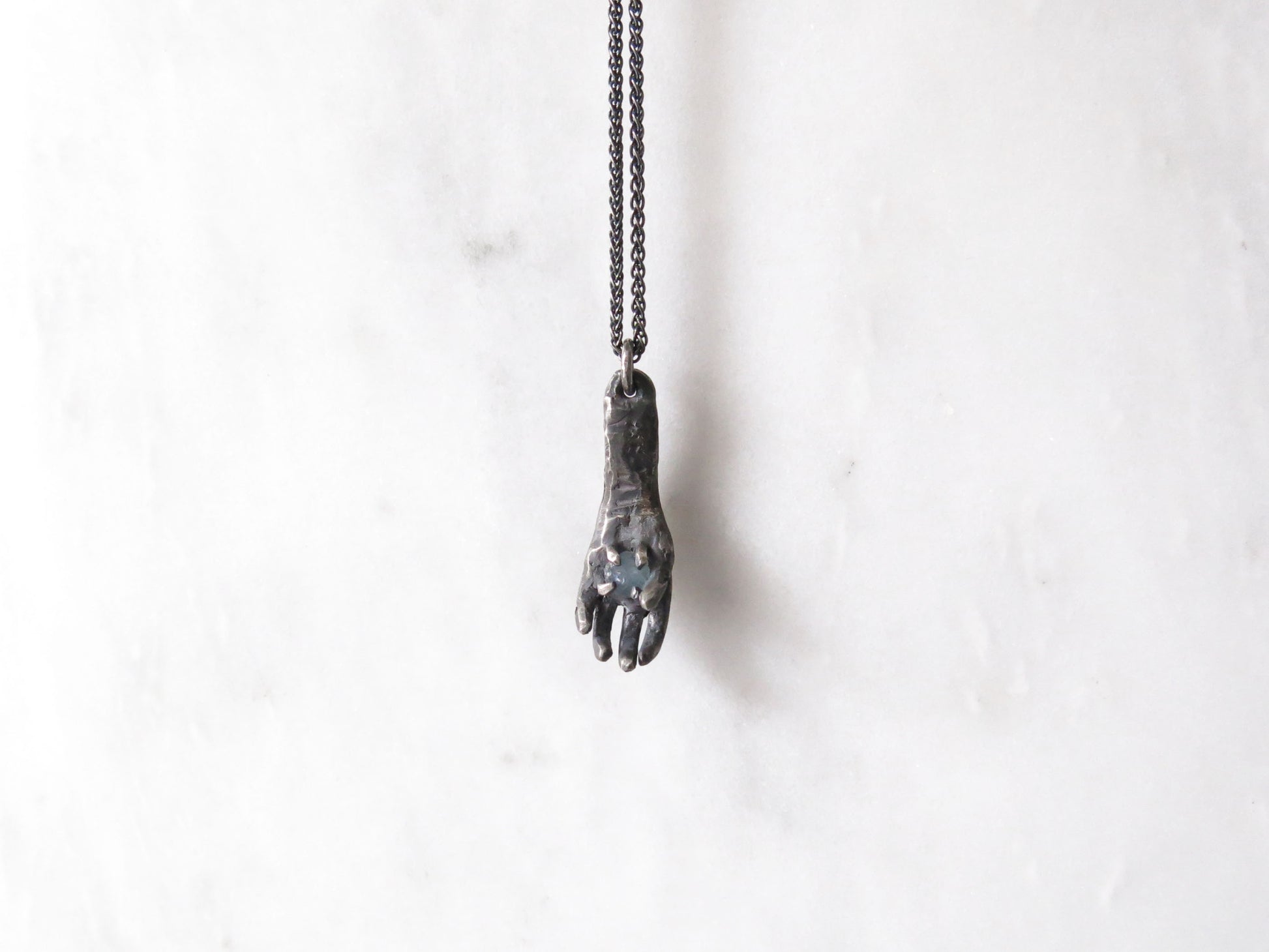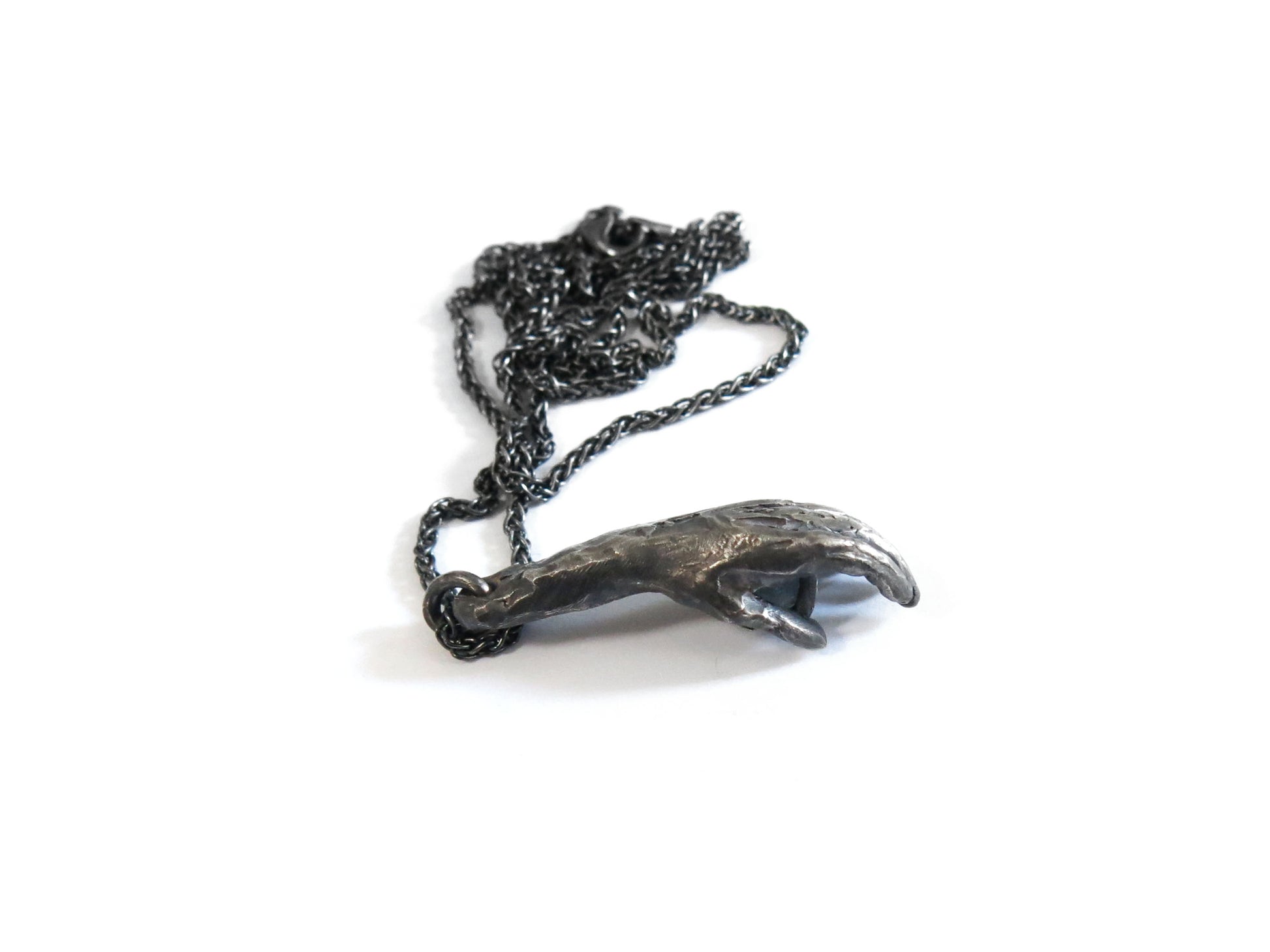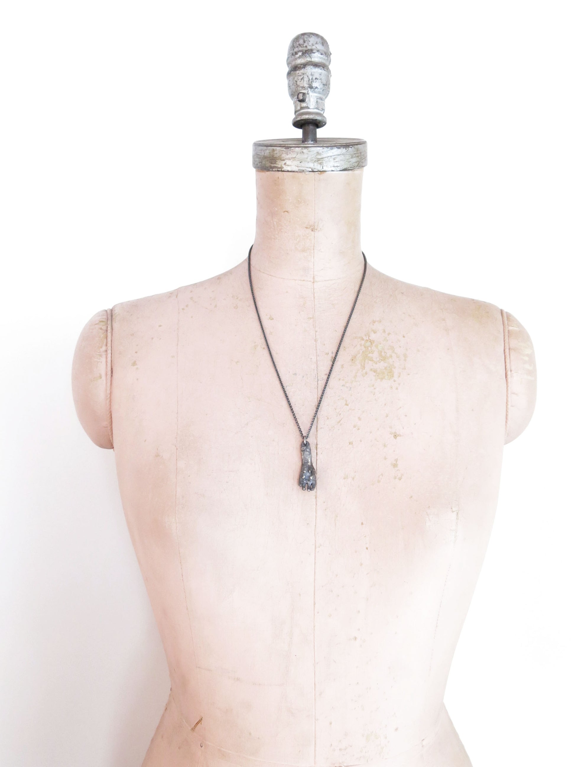 comes on a 22" chain. oxidized sterling silver will evolve and become brighter and shinier with wear.