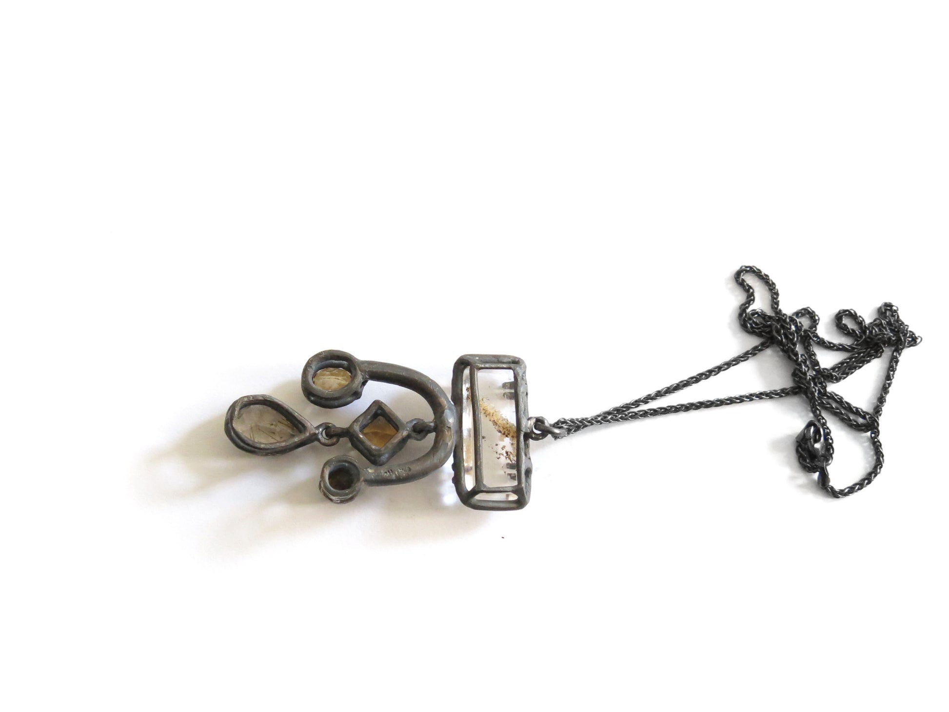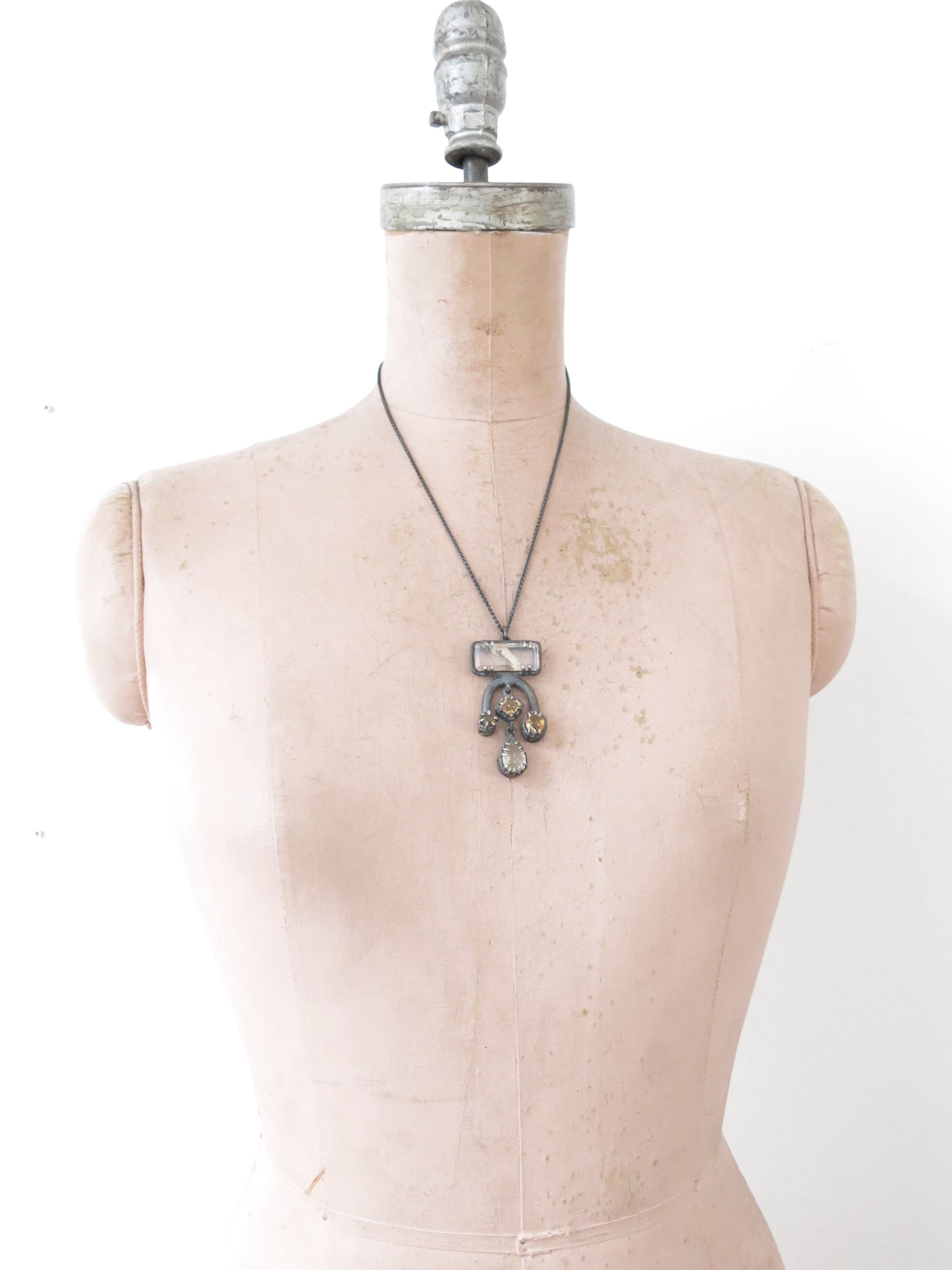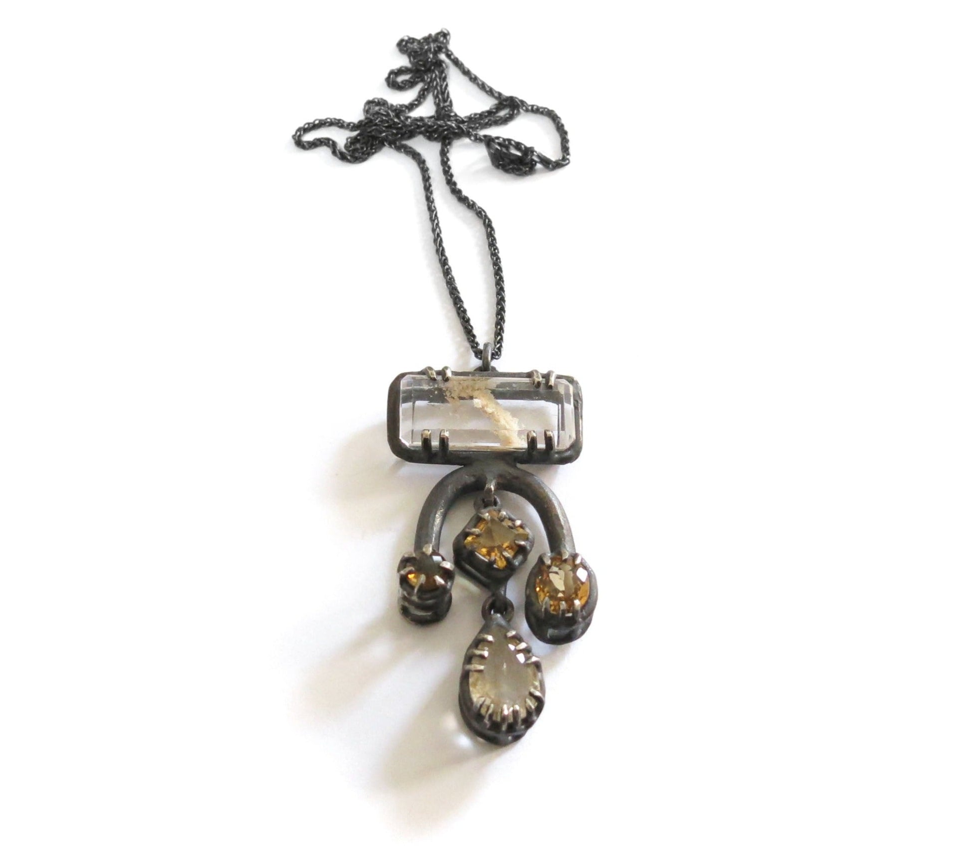 a big and fancy pendant with lots of gemstones. cast in solid sterling silver with a rough oxidized finish. oxidized silver will evolve with wear and become brighter and shinier. this pendant has two dangly stones in the middle.
