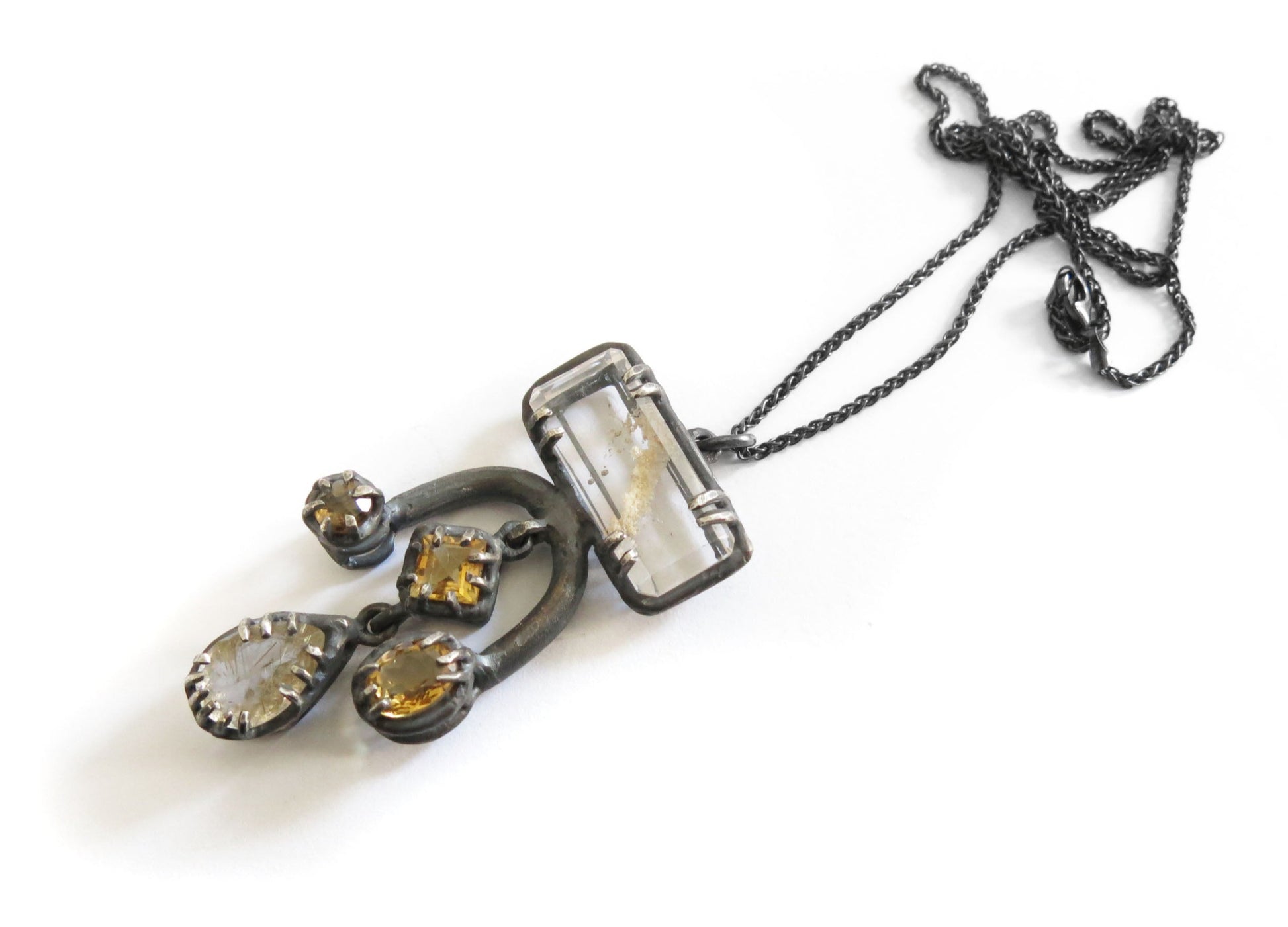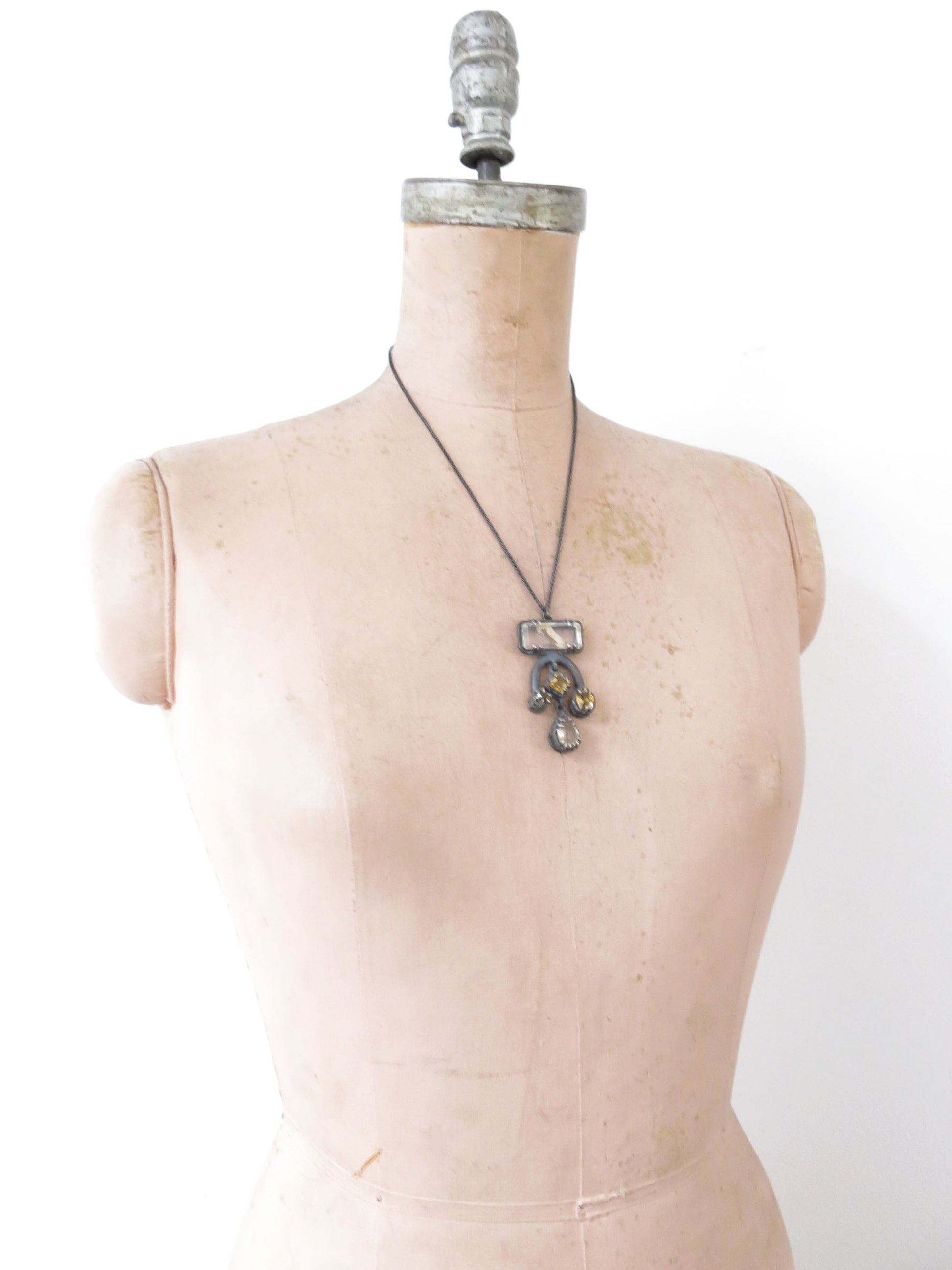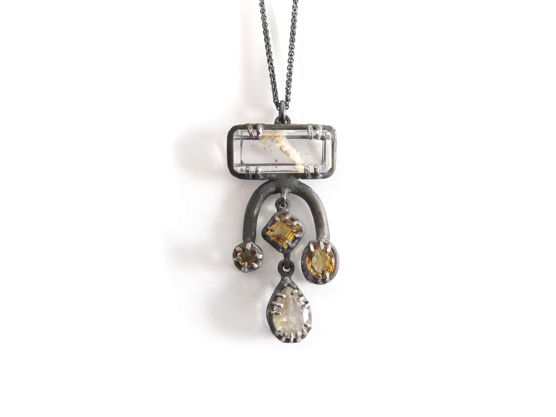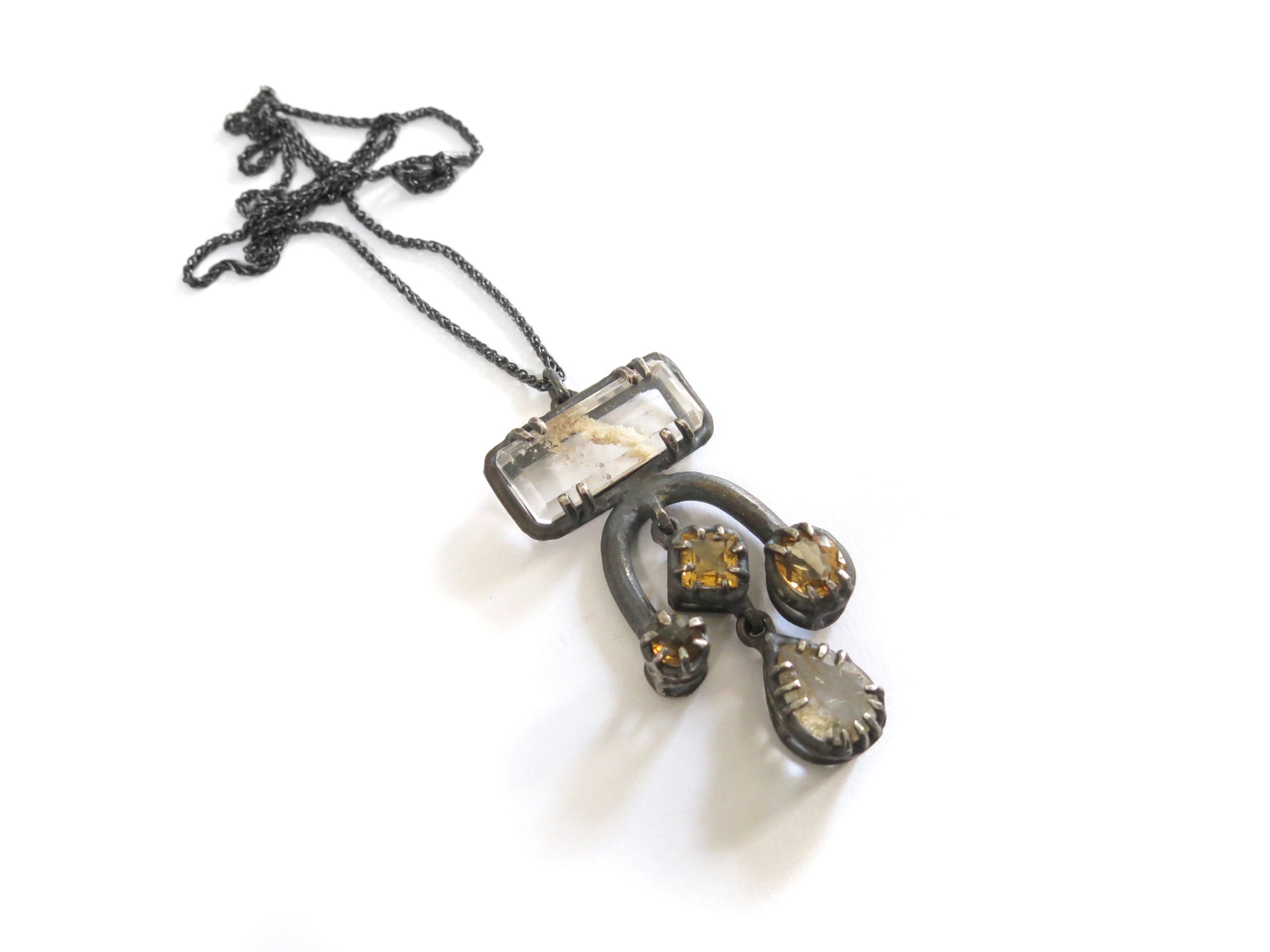 a big and fancy pendant with lots of gemstones. cast in solid sterling silver with a rough oxidized finish. oxidized silver will evolve with wear and become brighter and shinier. this pendant has two dangly stones in the middle.