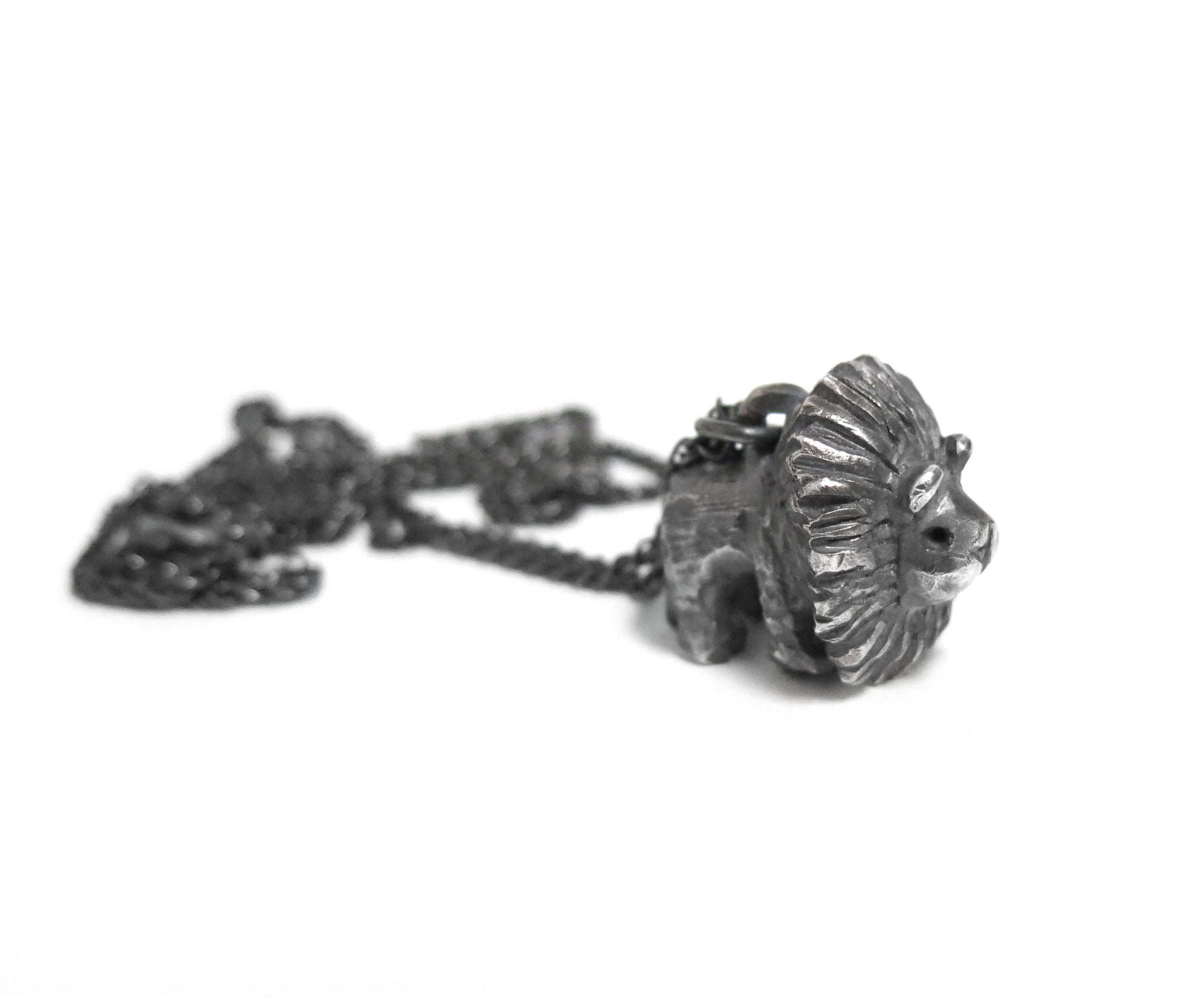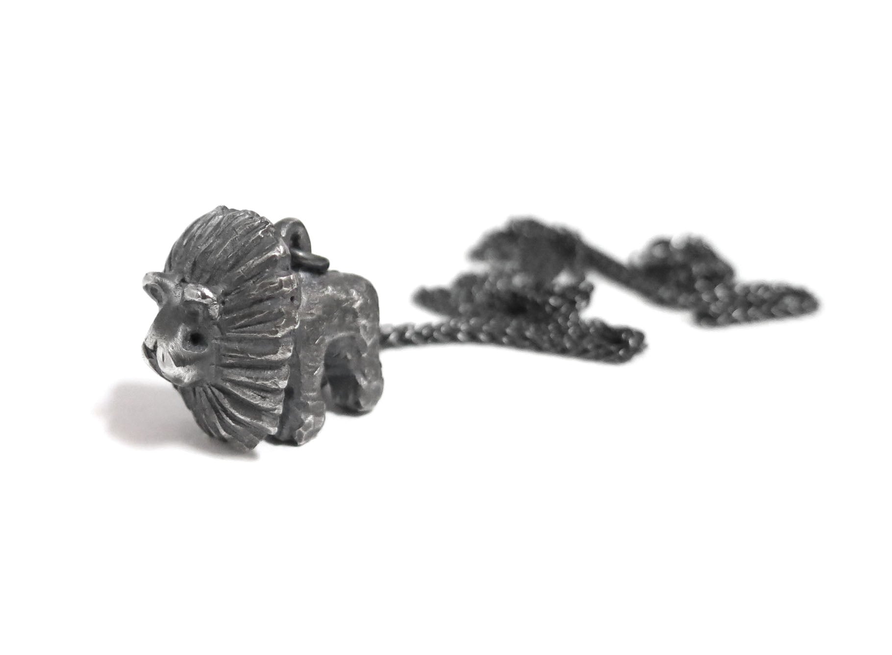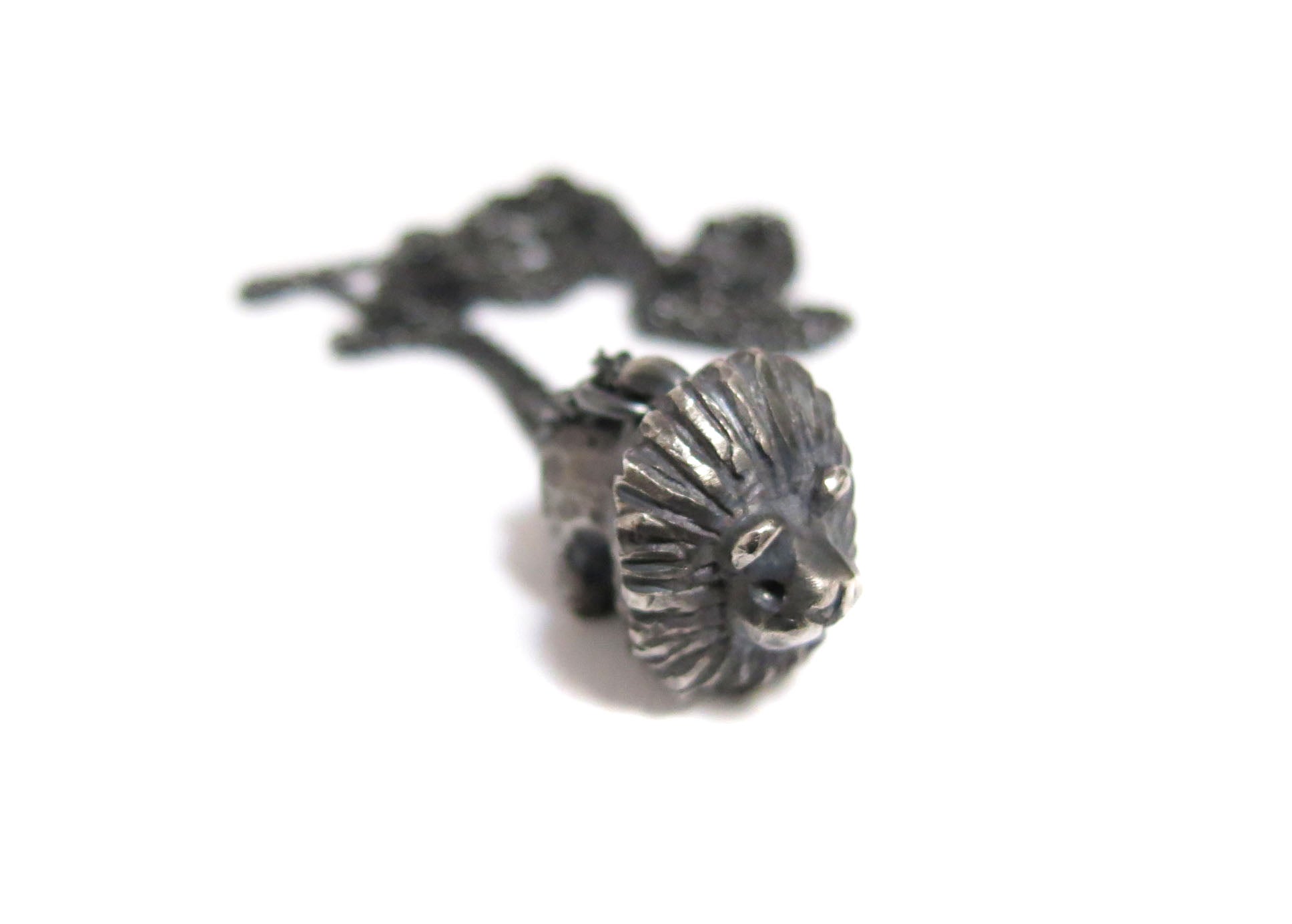 big lion cat. sculpted in wax and then cast in solid sterling silver. rough oxidized finish. darkened silver will evolve and become brighter and shiner with wear.