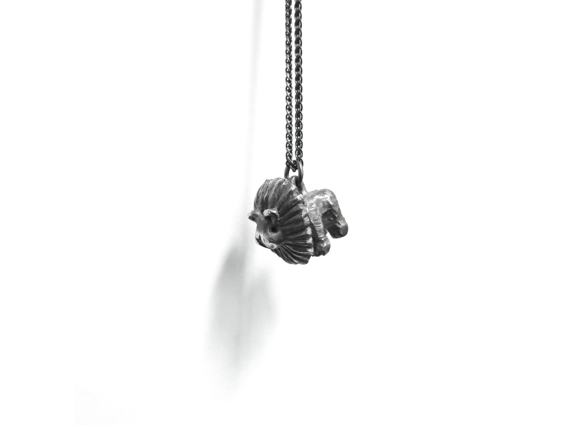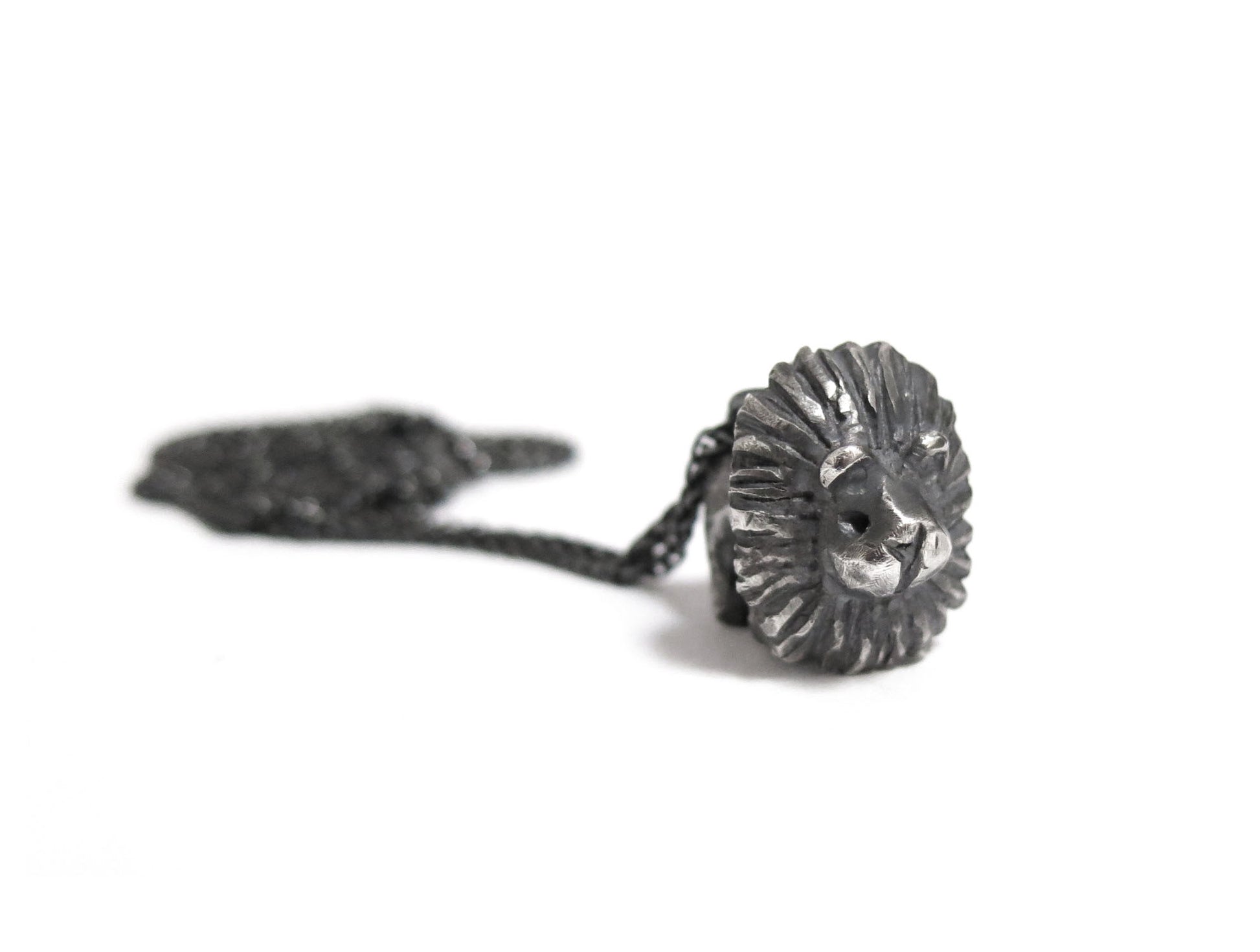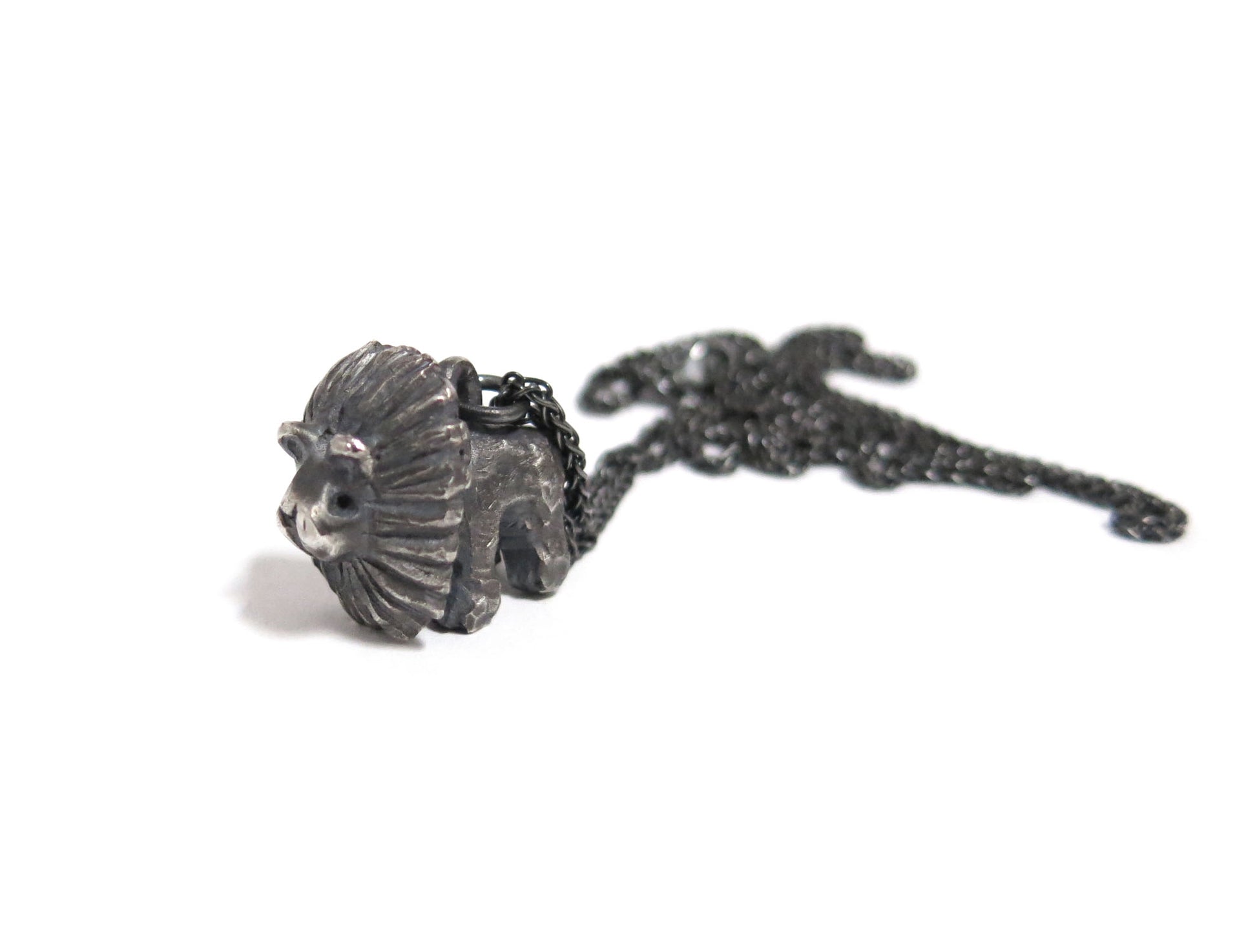 big lion cat. sculpted in wax and then cast in solid sterling silver. rough oxidized finish. darkened silver will evolve and become brighter and shiner with wear.