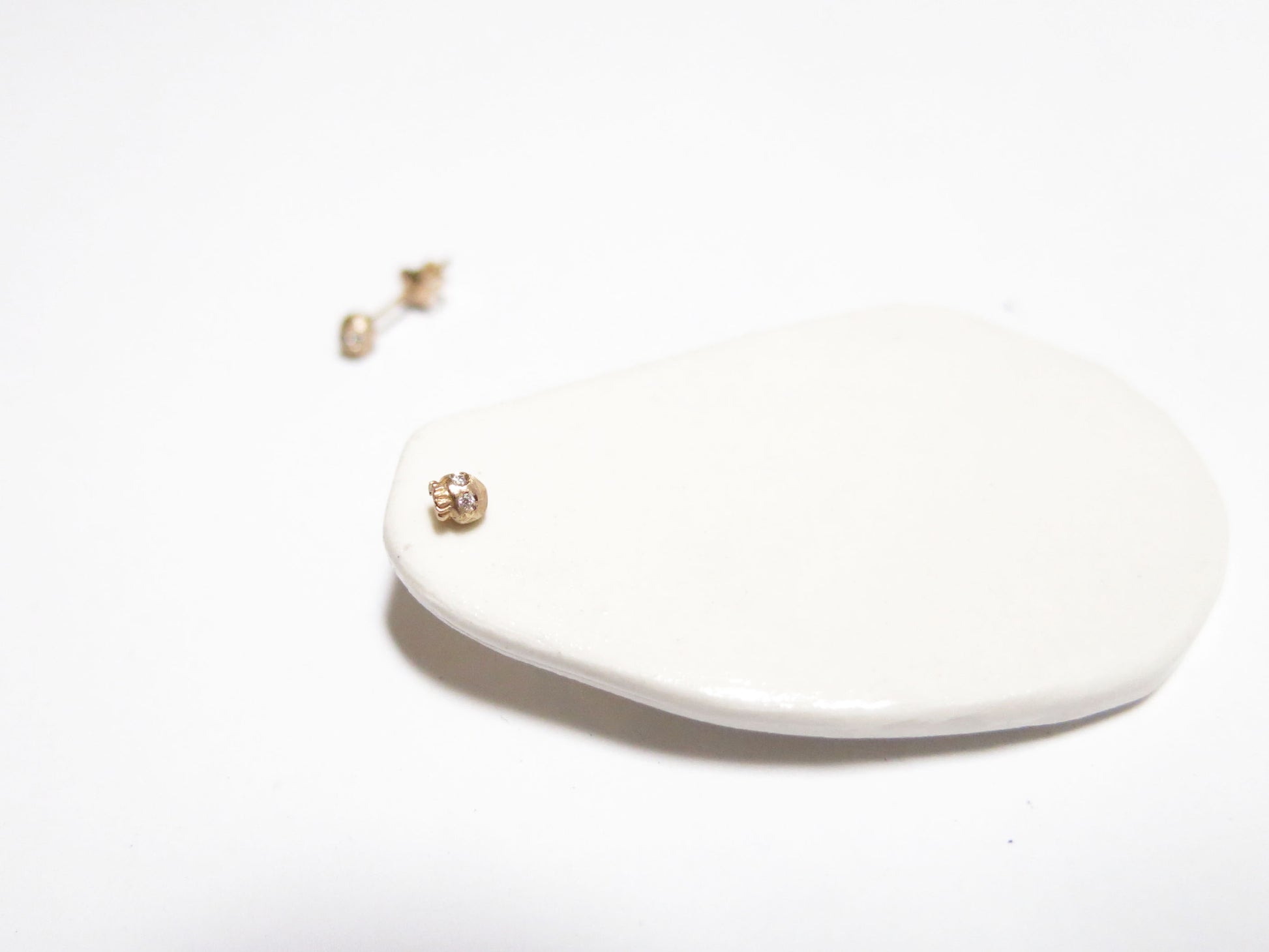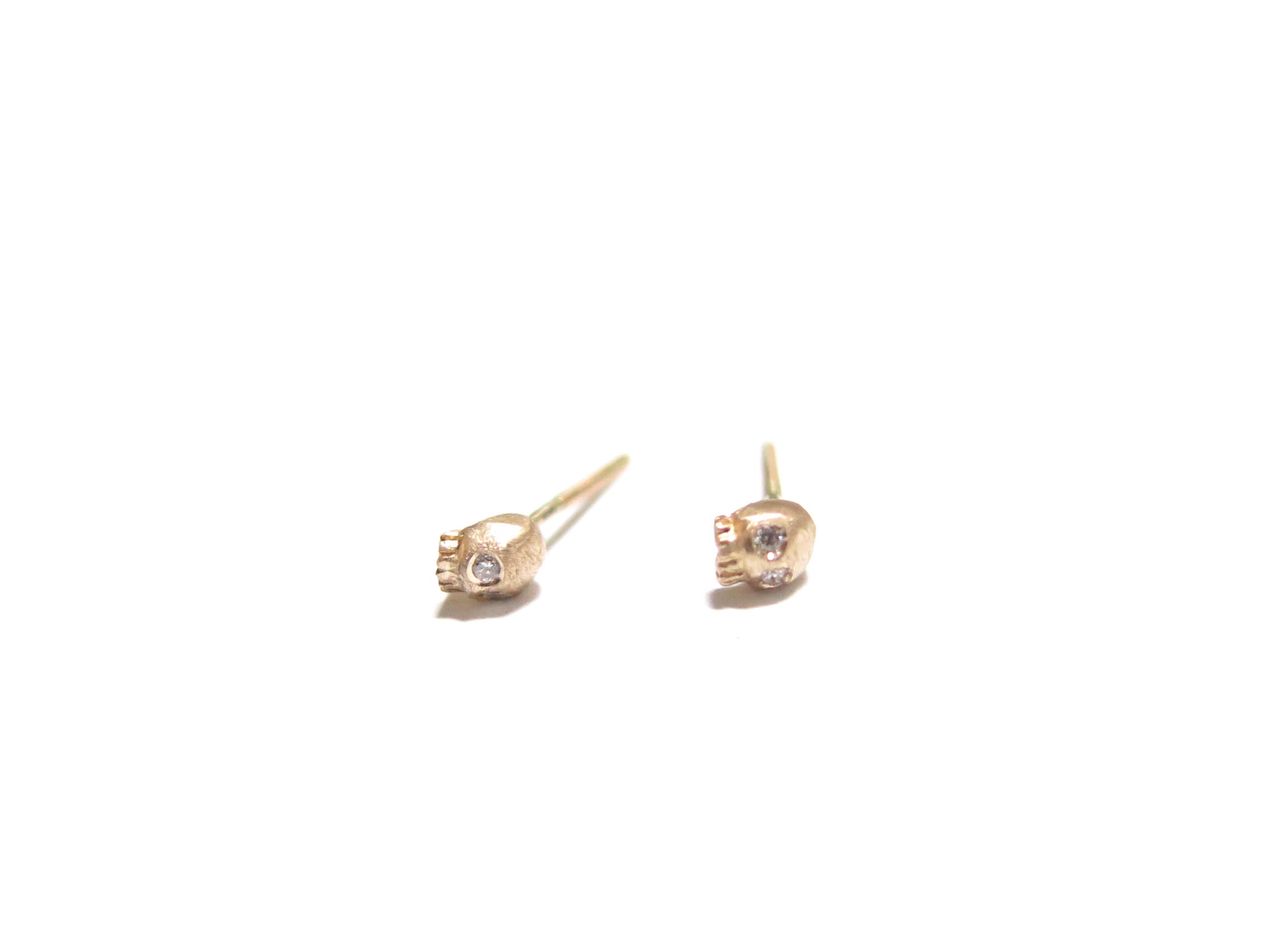 teeny tiny skull studs cast in solid 14K yellow gold. with very small diamonds for eyes. these very very small skulls mesure just 1/8" tall. threaded posts and secure screw backs make these earrings extra hard to lose.