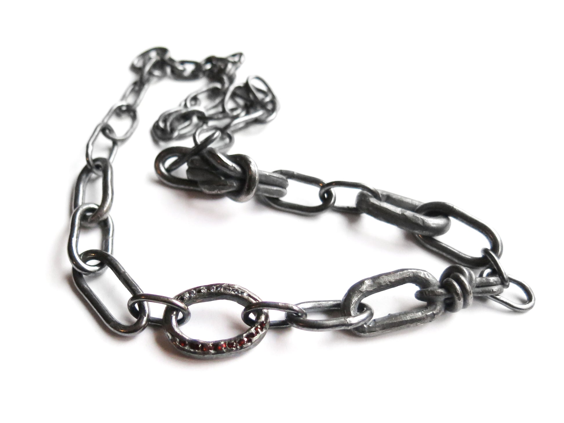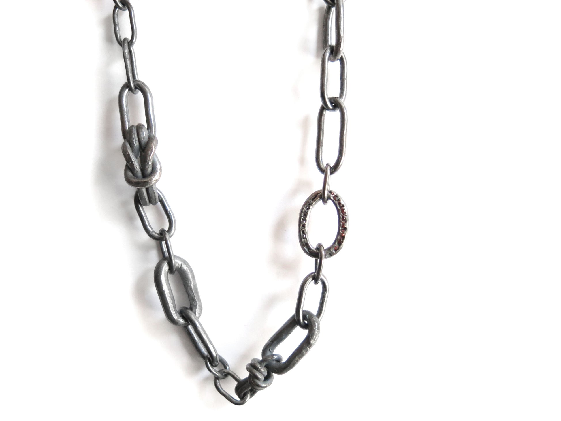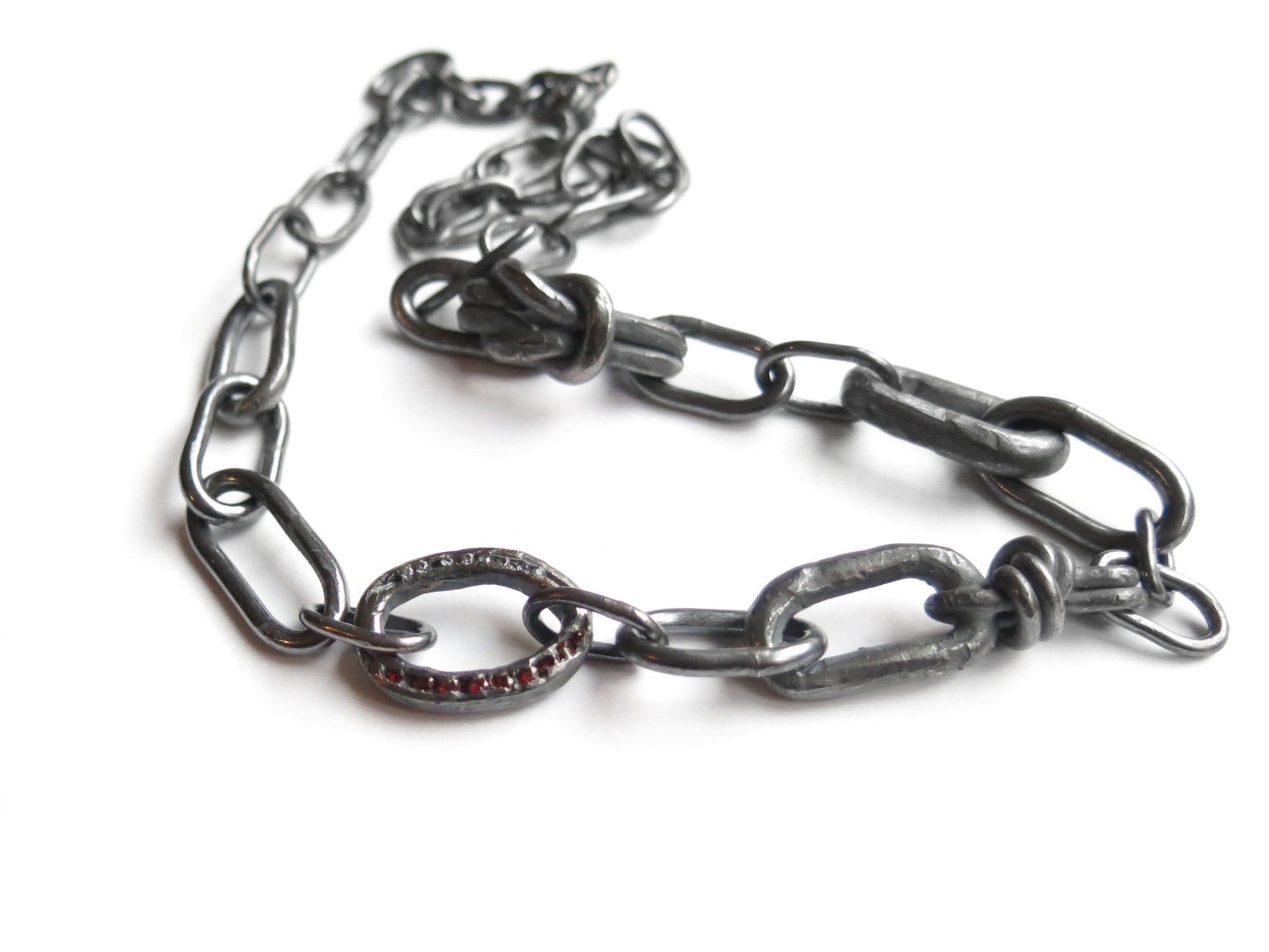 heavy sterling silver chain is made up of a mix of handmade oval links and chunky links with knots that were sculpted in wax and then cast in solid sterling silver anddd one extra special link with a mix of blue sapphires and garnets.