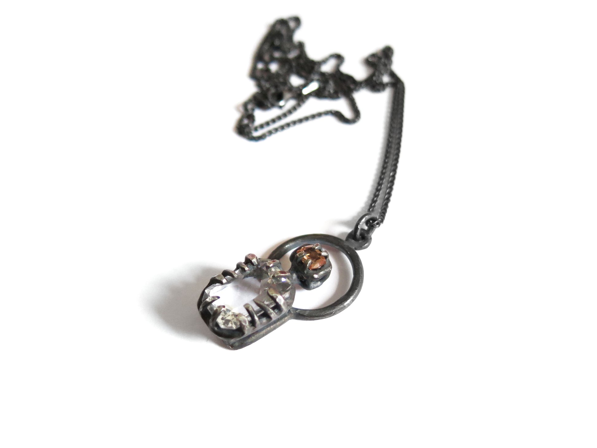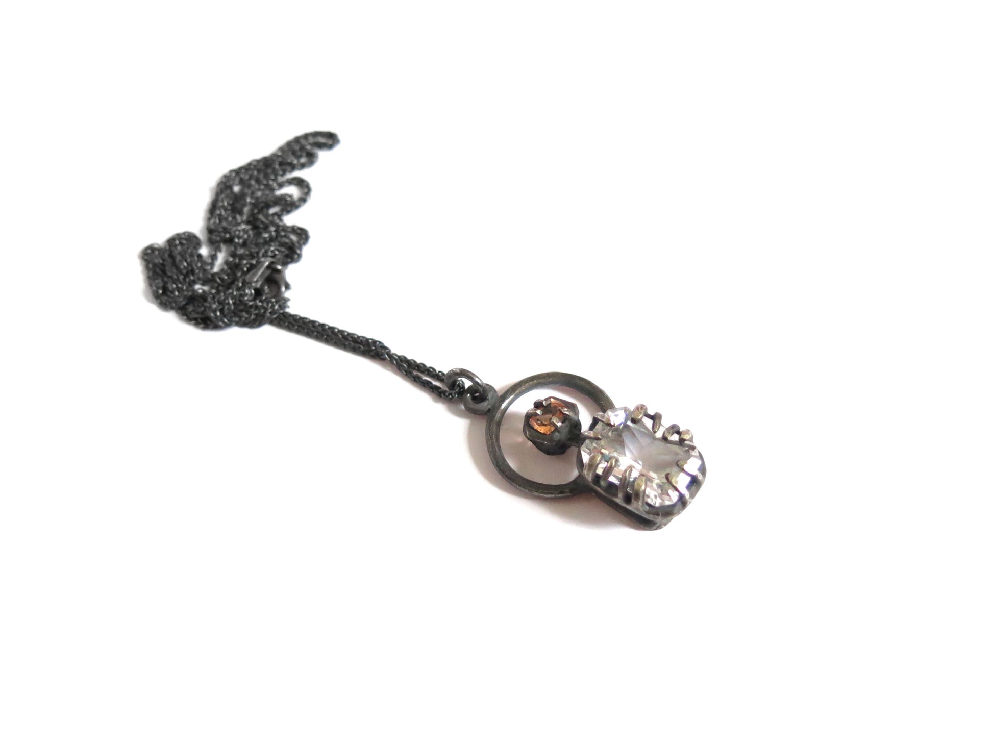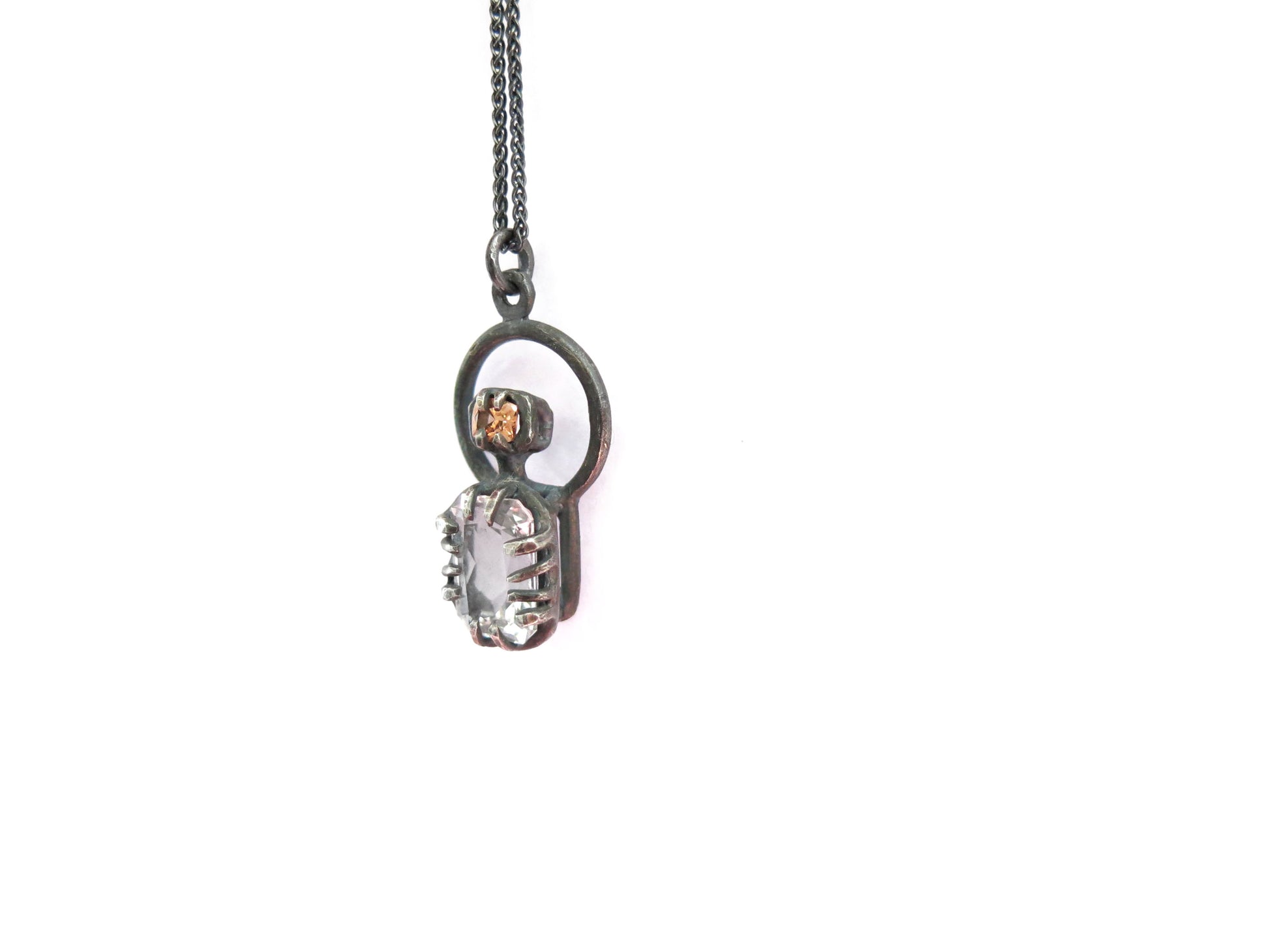 rectangular quartz topped with a little orange topaz, cast in solid sterling silver with a rough oxidized finish. oxidized silver will evolve and become brighter and shinier.
