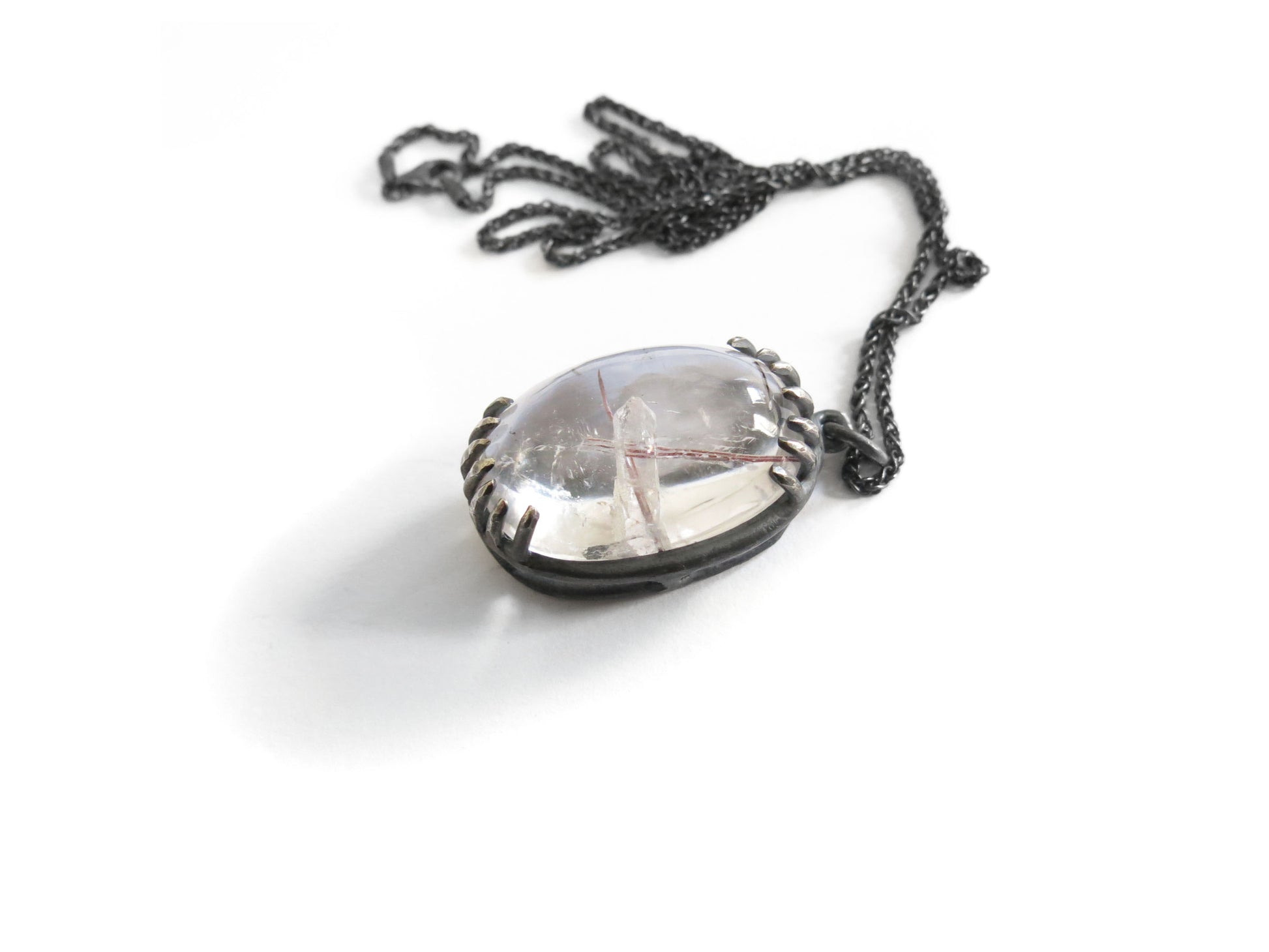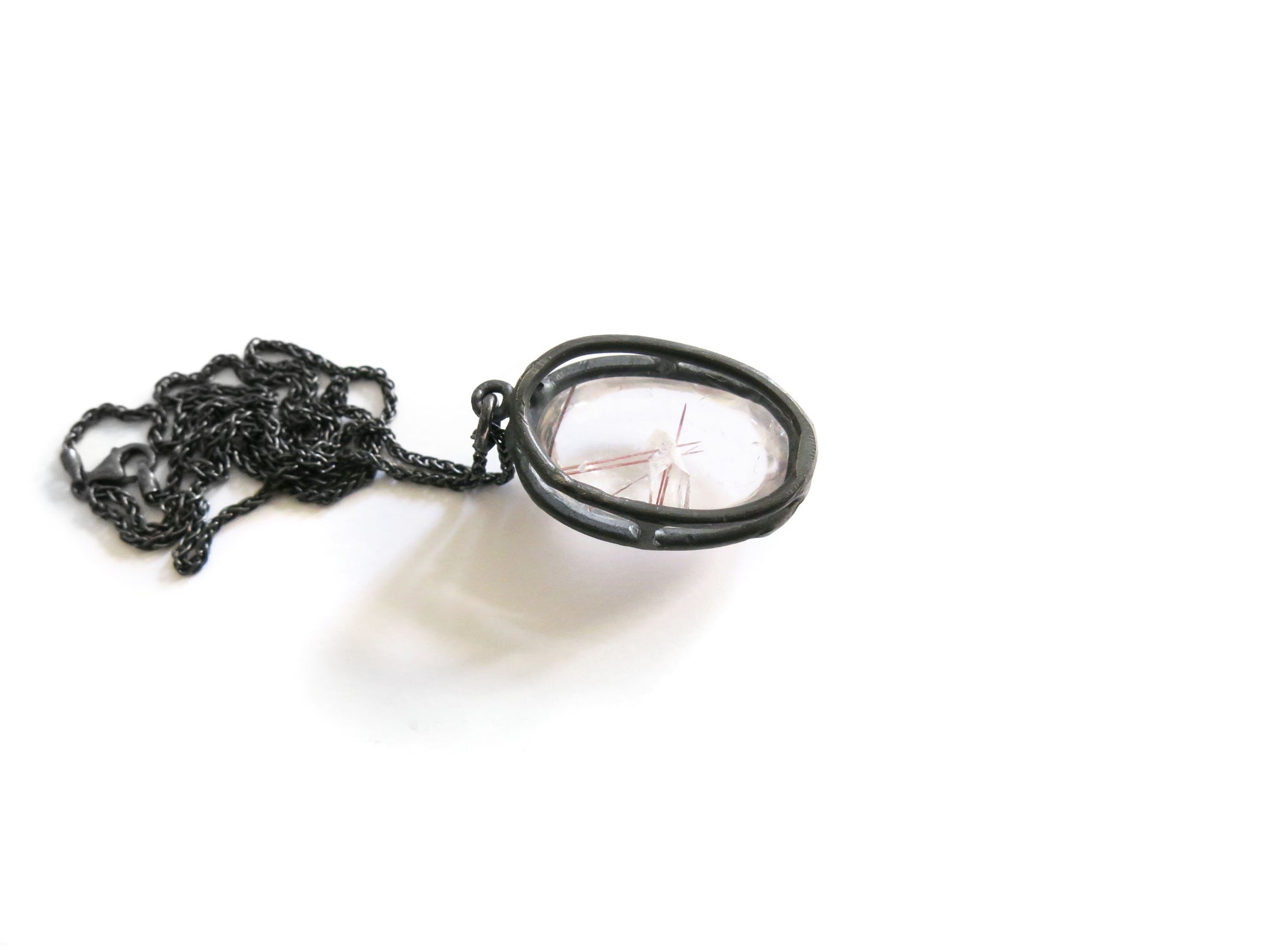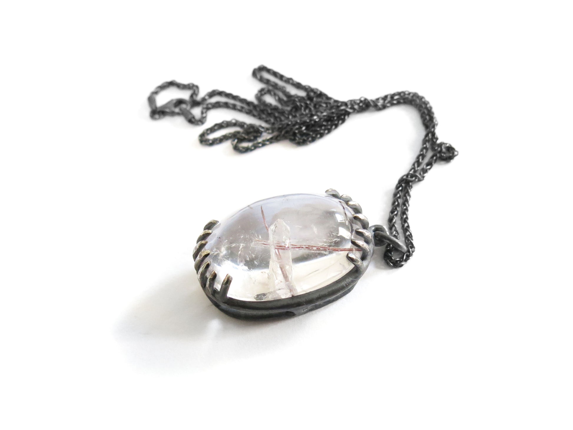 an oval manifestation quartz. you can the phantom of smaller crystals that have grown inside the bigger crystal along with some strands of red rutile inclusions. rough oxidized finish sterling silver setting was custom built around the crystal.