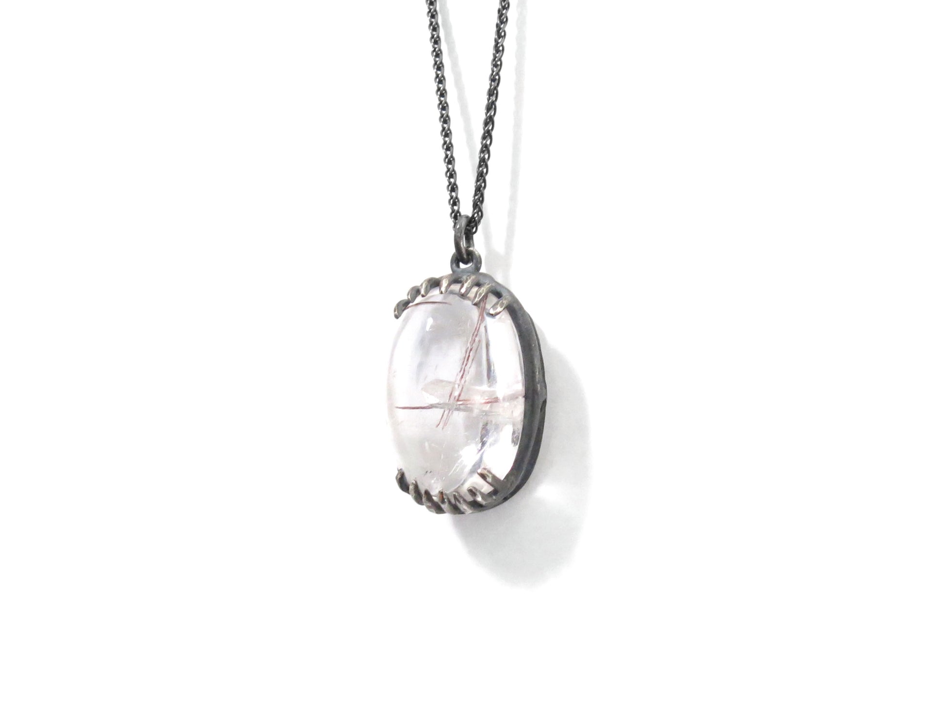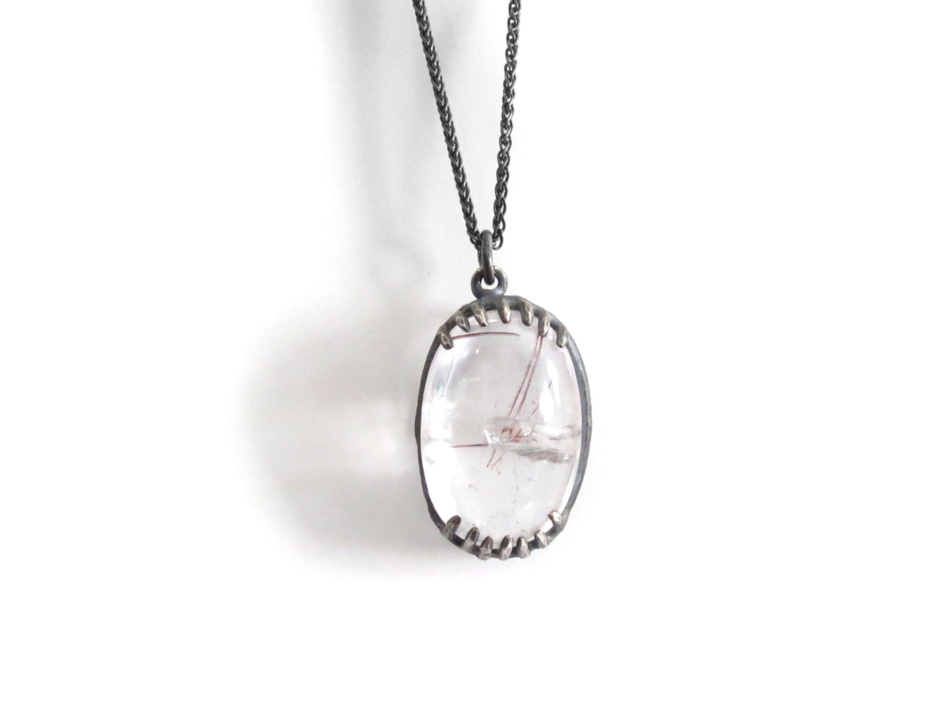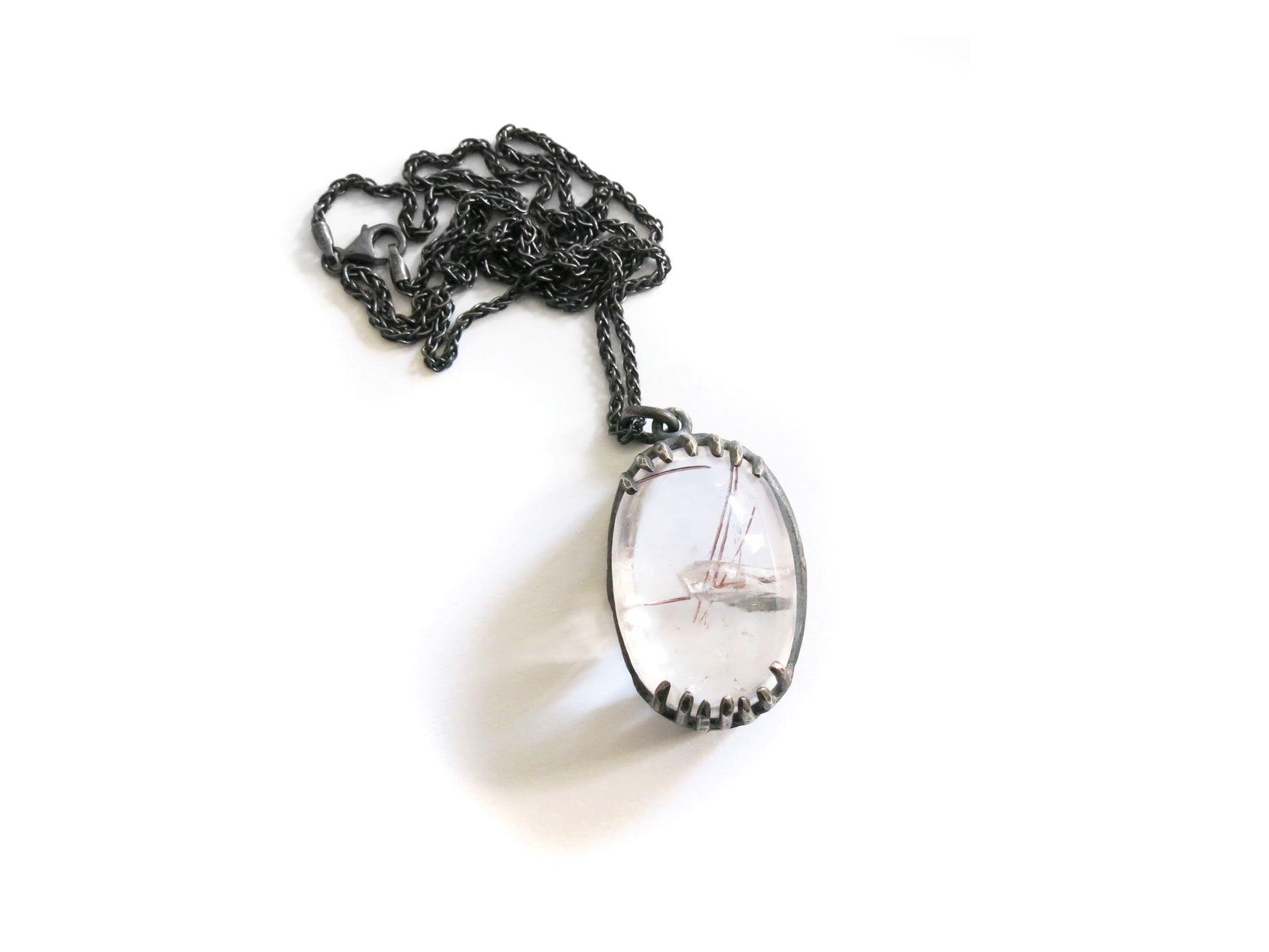 an oval manifestation quartz. you can the phantom of smaller crystals that have grown inside the bigger crystal along with some strands of red rutile inclusions. rough oxidized finish sterling silver setting was custom built around the crystal.