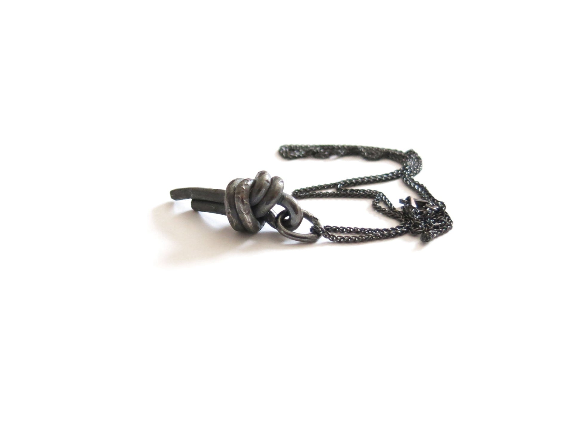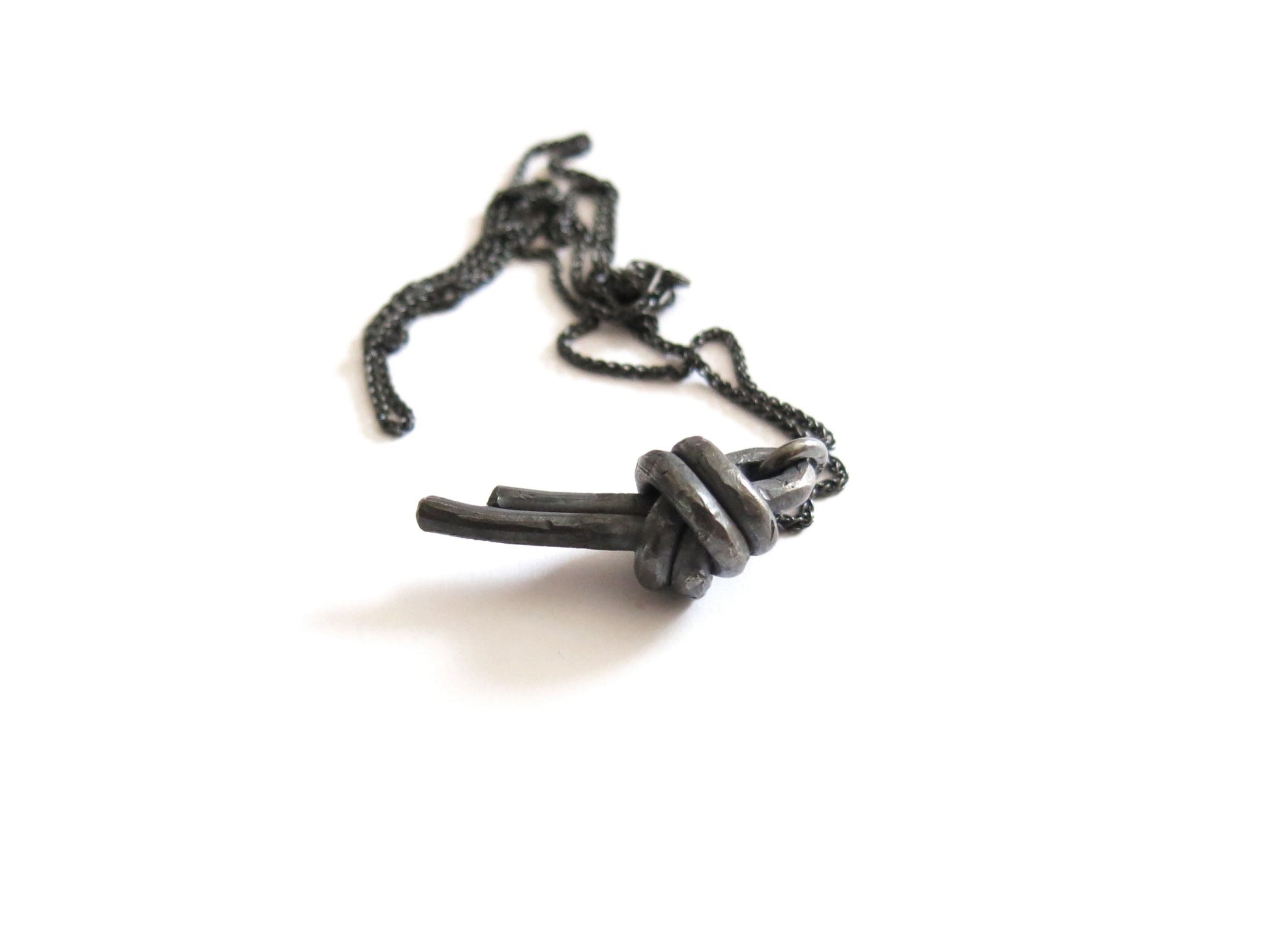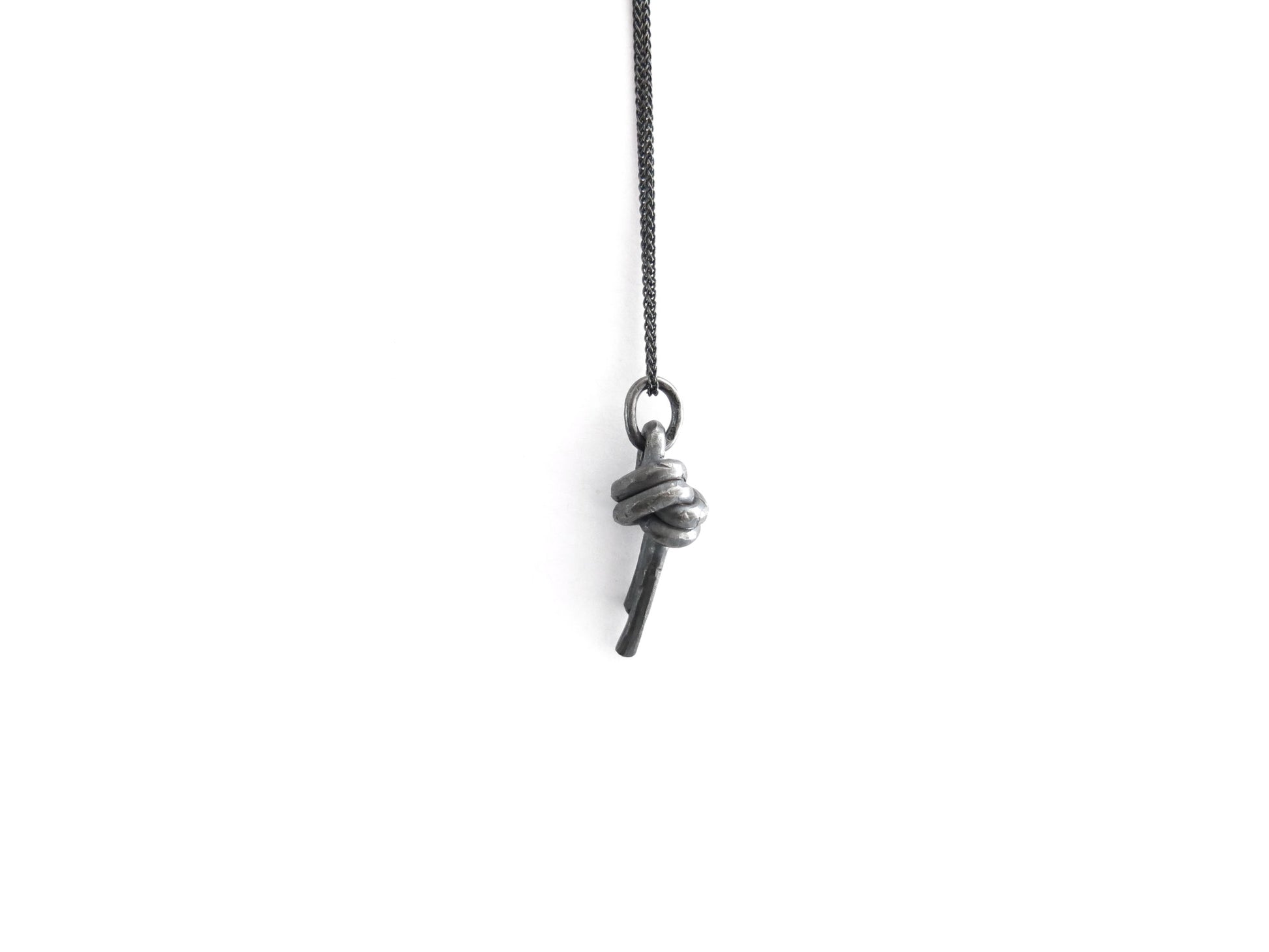 overhand loop knot pendant cast in solid sterling silver with a rough oxidized finish. darkened silver will evolve and become brighter and shiner with wear.