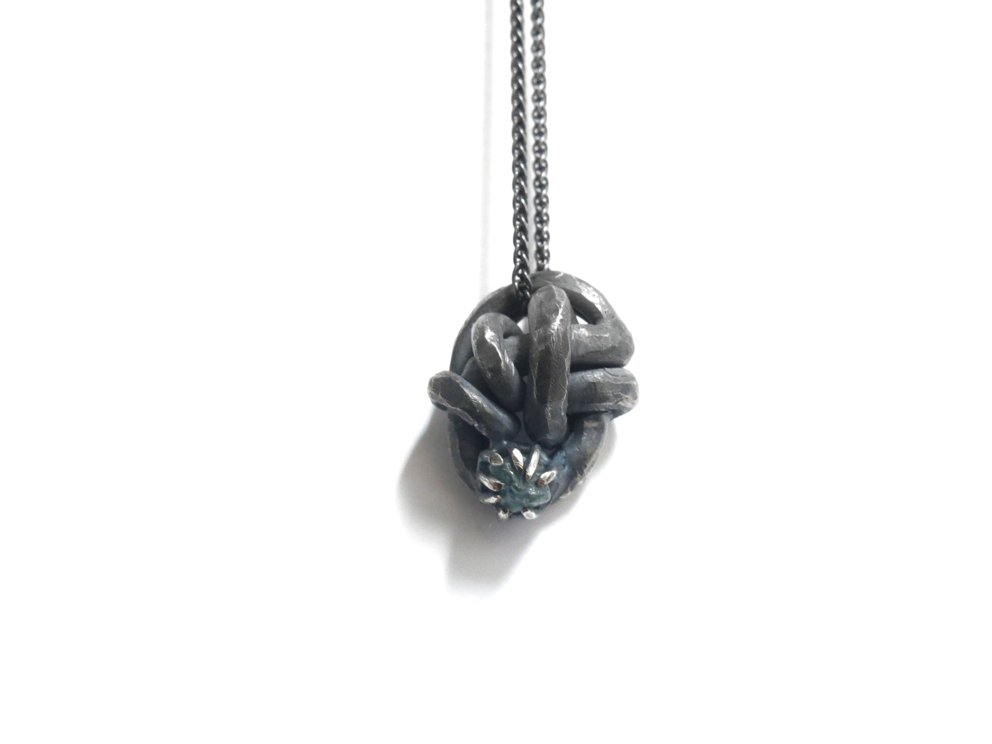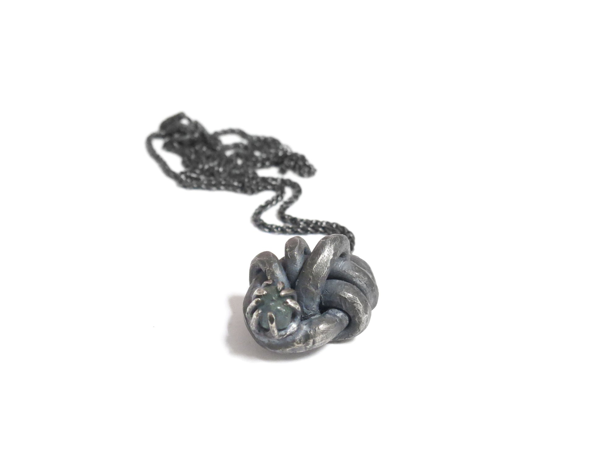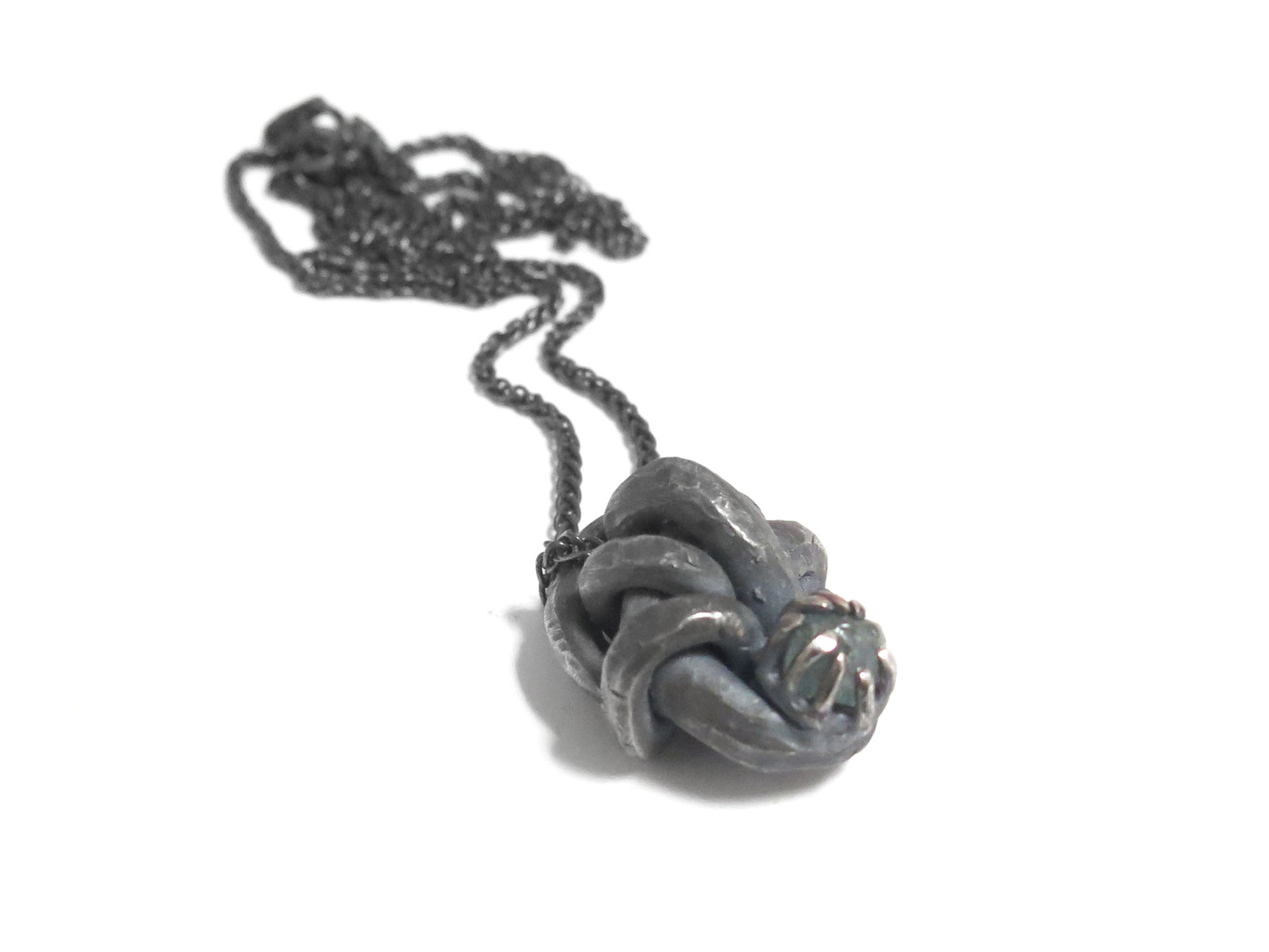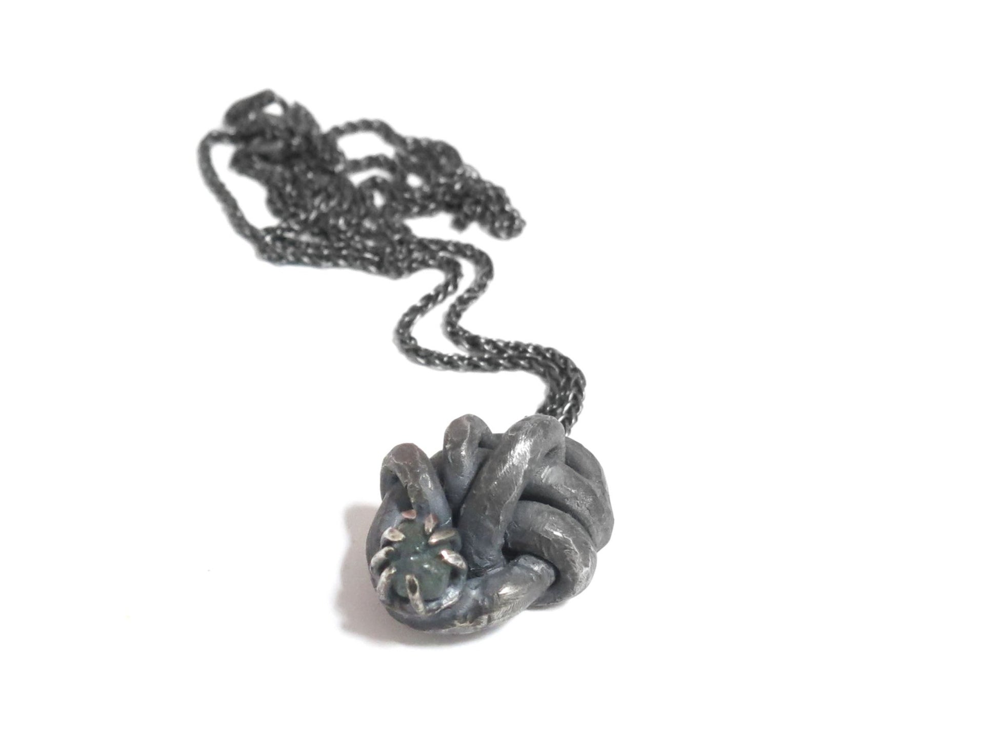 big knot pendant cast in solid sterling silver with a rough oxidized finish. darkened silver will evolve and become brighter and shiner with wear. light blue 6.5mm rough sapphire from montana.
