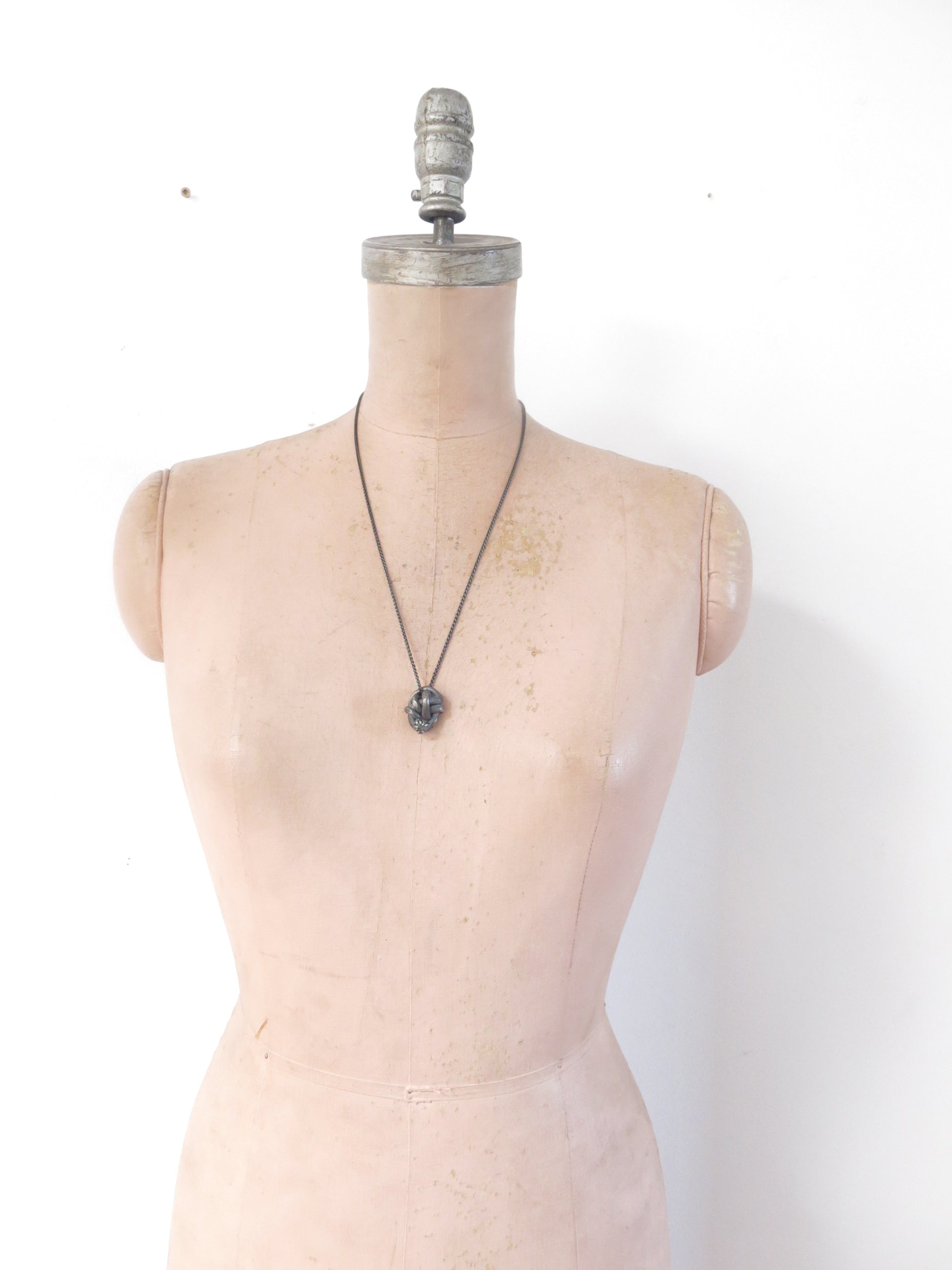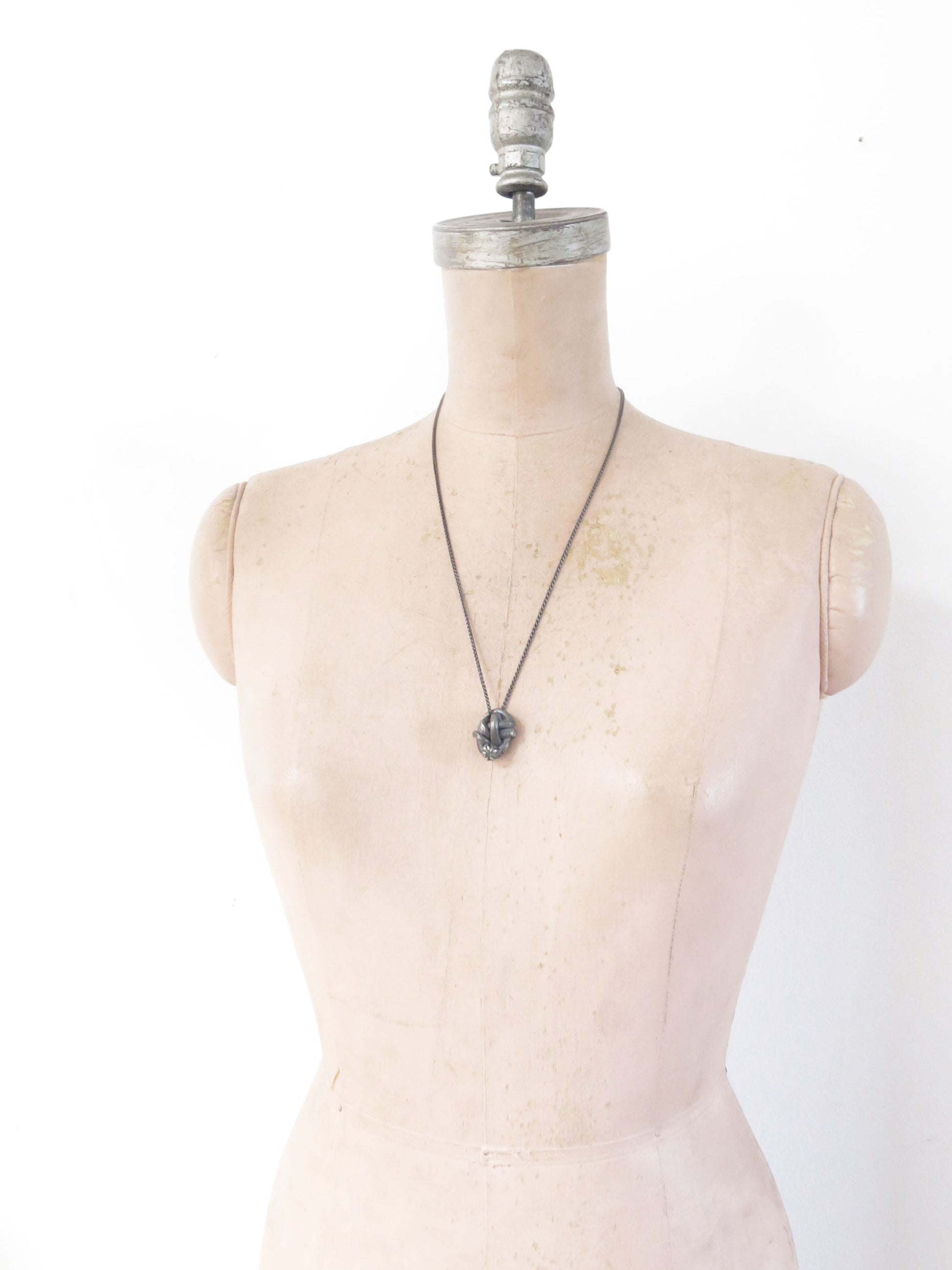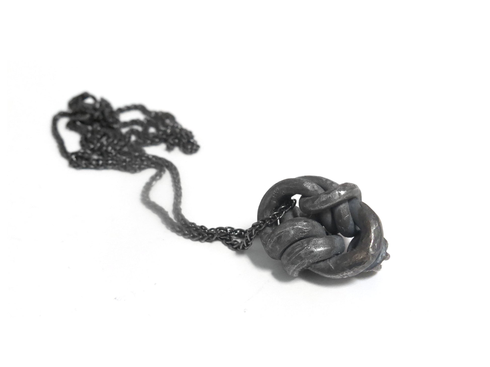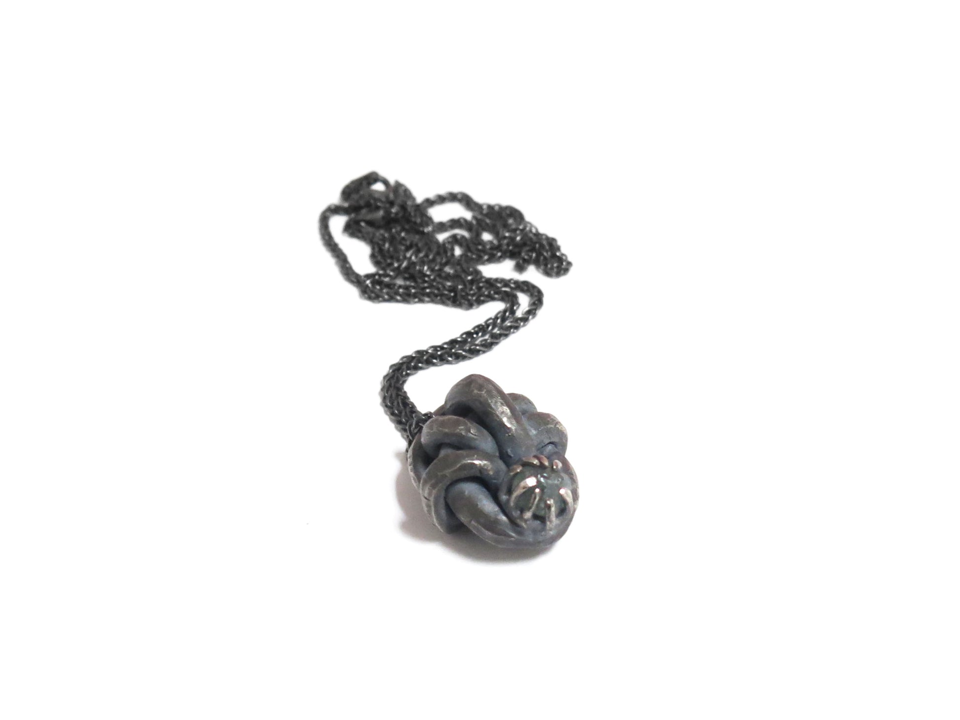 big knot pendant cast in solid sterling silver with a rough oxidized finish. darkened silver will evolve and become brighter and shiner with wear. light blue 6.5mm rough sapphire from montana.