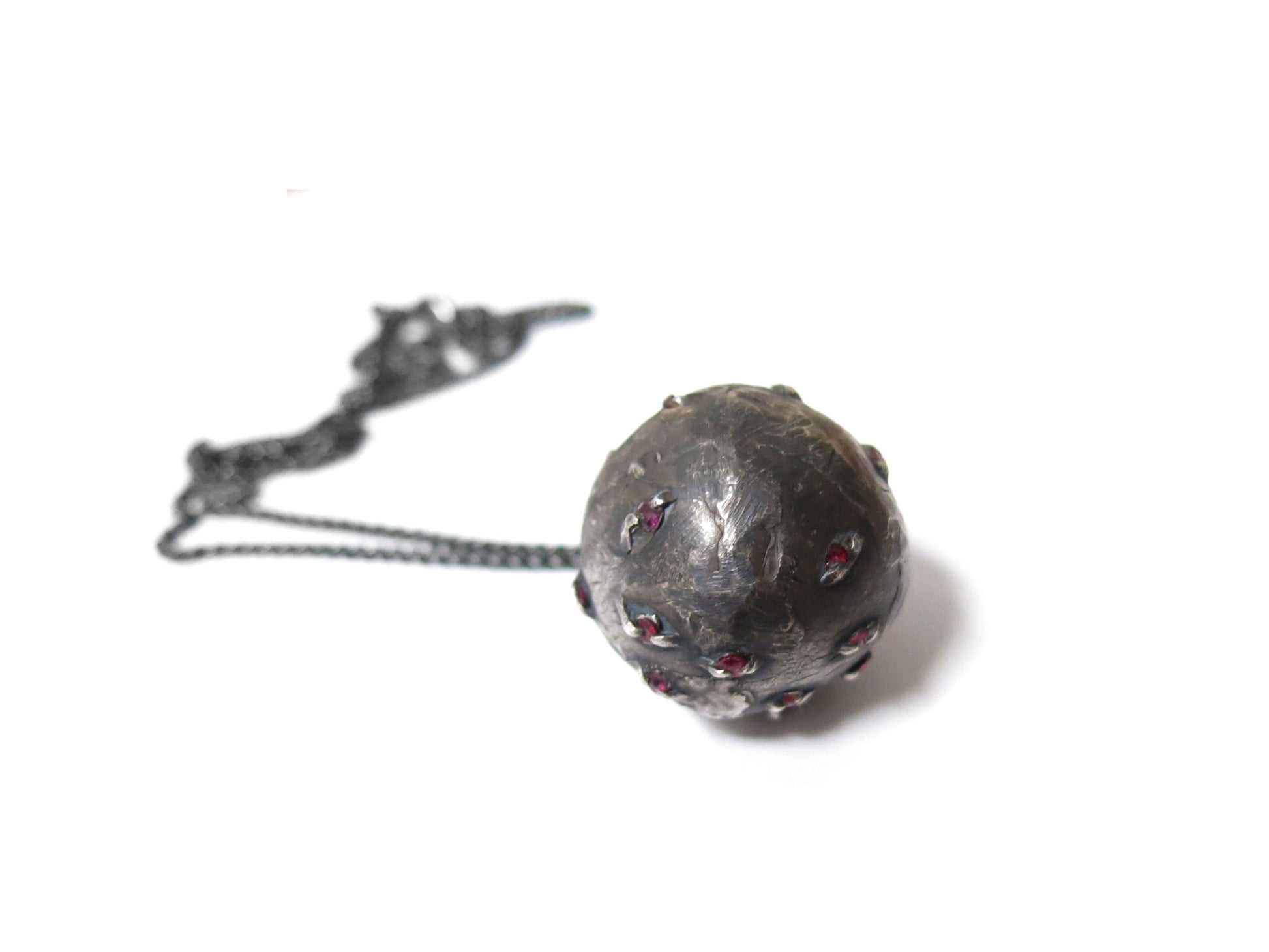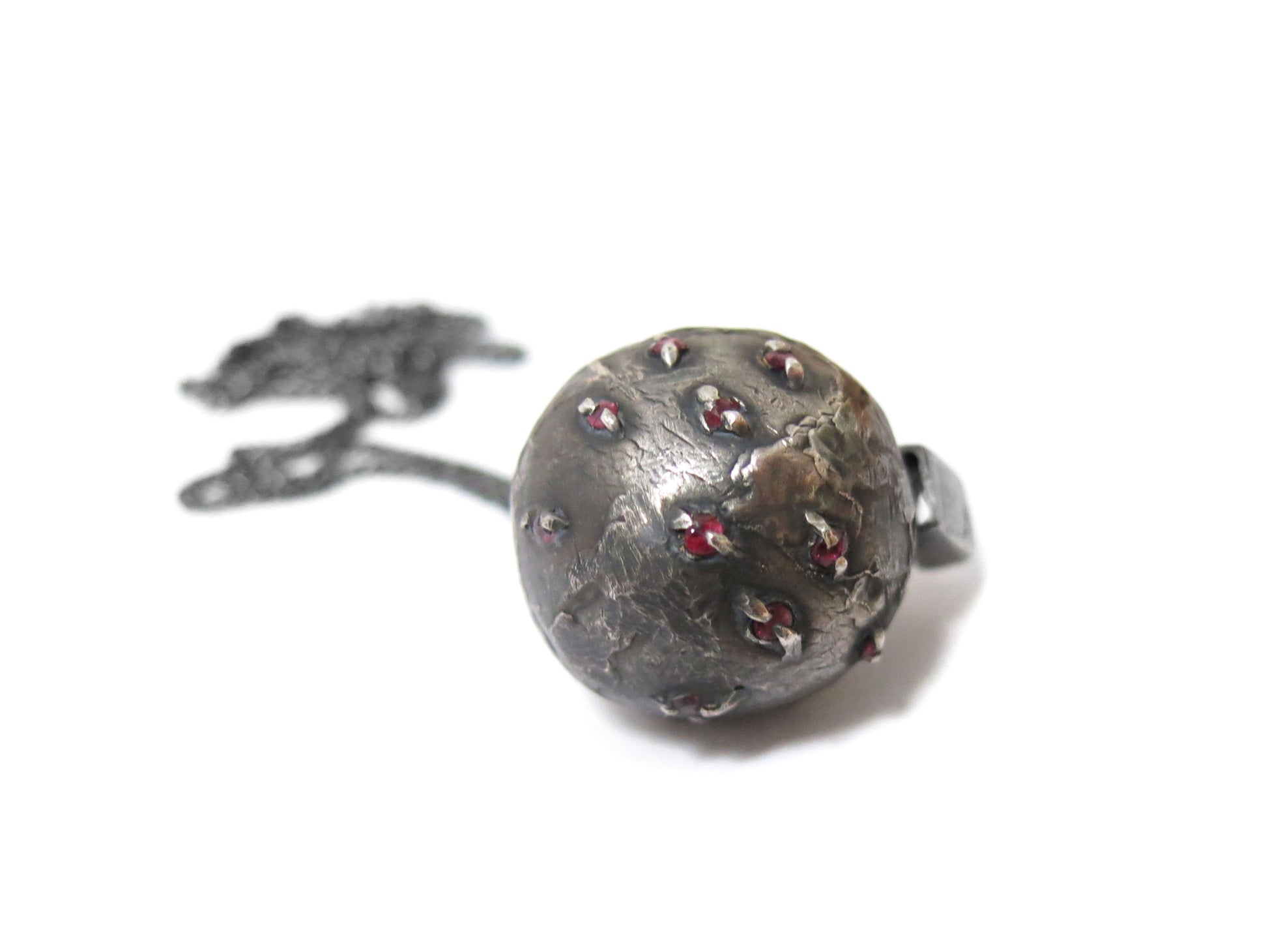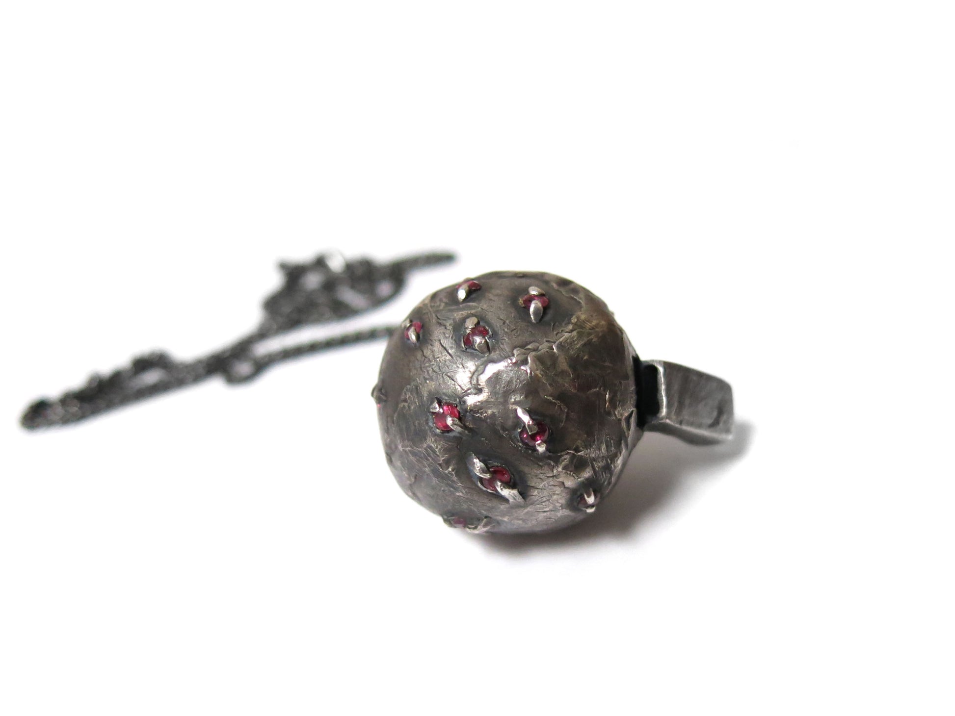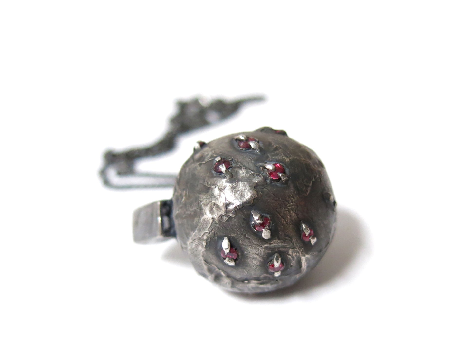 sculpted in wax and cast in solid sterling silver with a textured & oxidized finish. with 16 rubies. oxidized silver will evolve and become brighter and shinier with wear. comes on a 20" sterling silver chain.