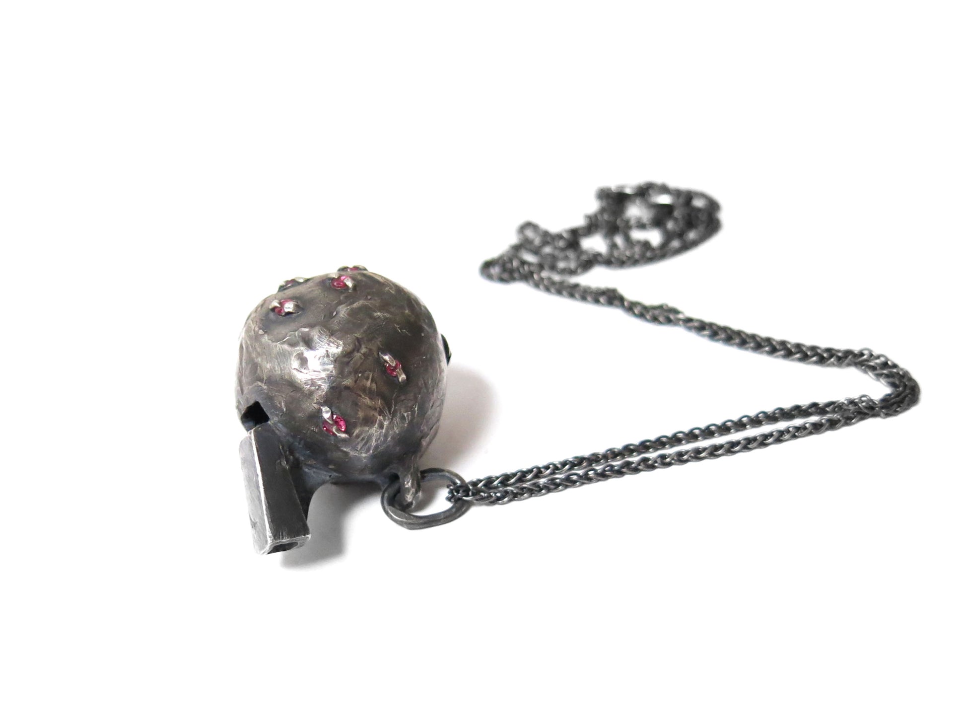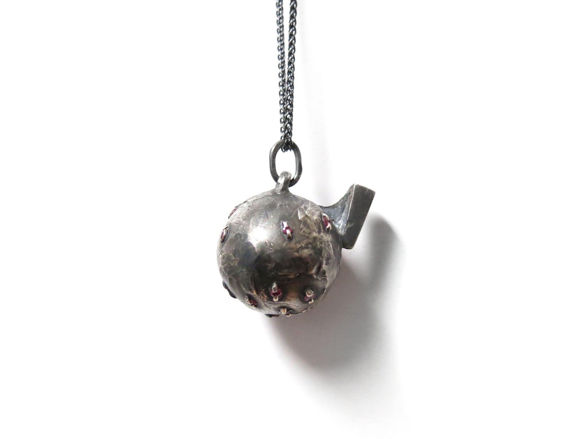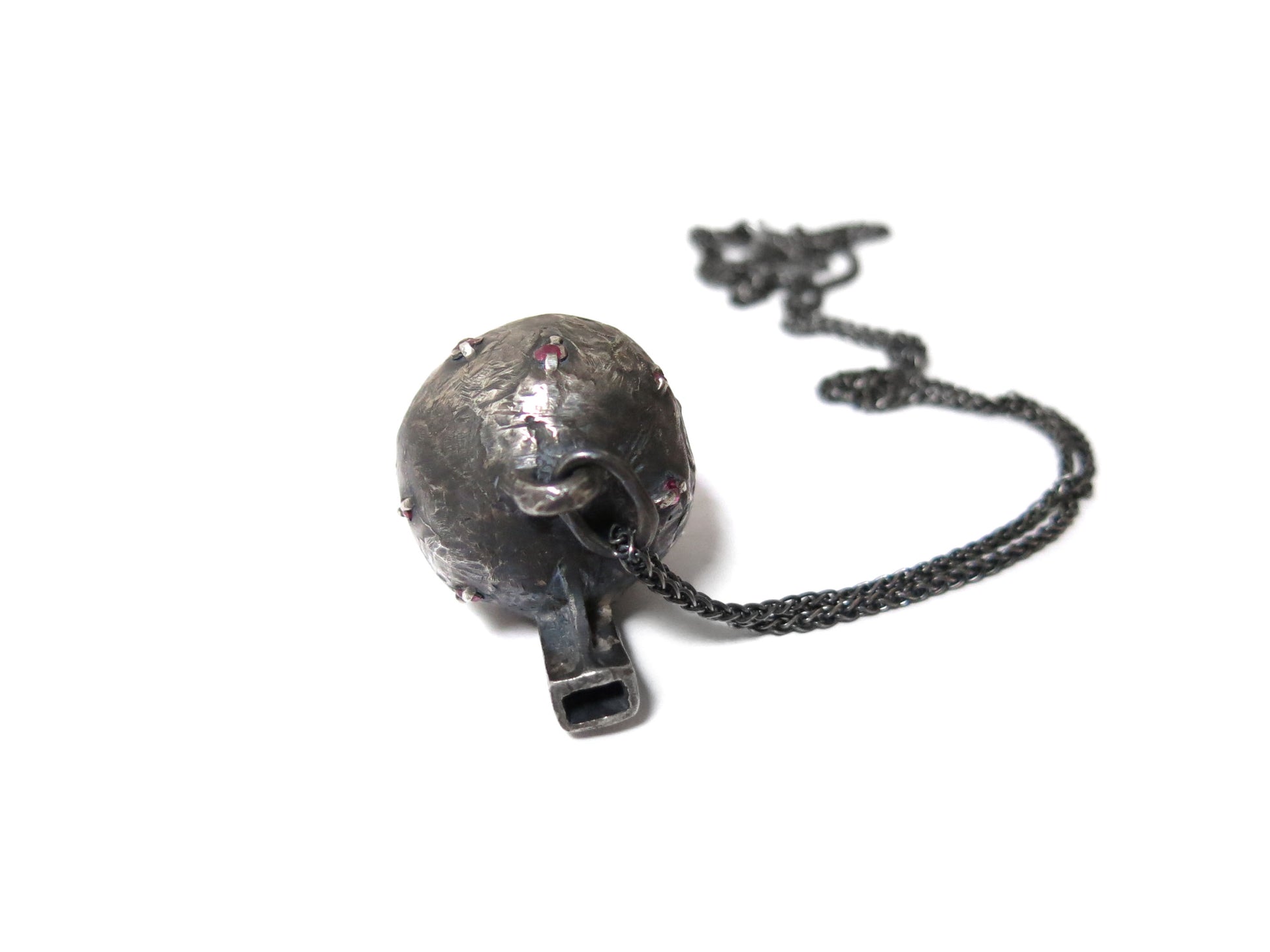 sculpted in wax and cast in solid sterling silver with a textured & oxidized finish. with 16 rubies. oxidized silver will evolve and become brighter and shinier with wear. comes on a 20" sterling silver chain.