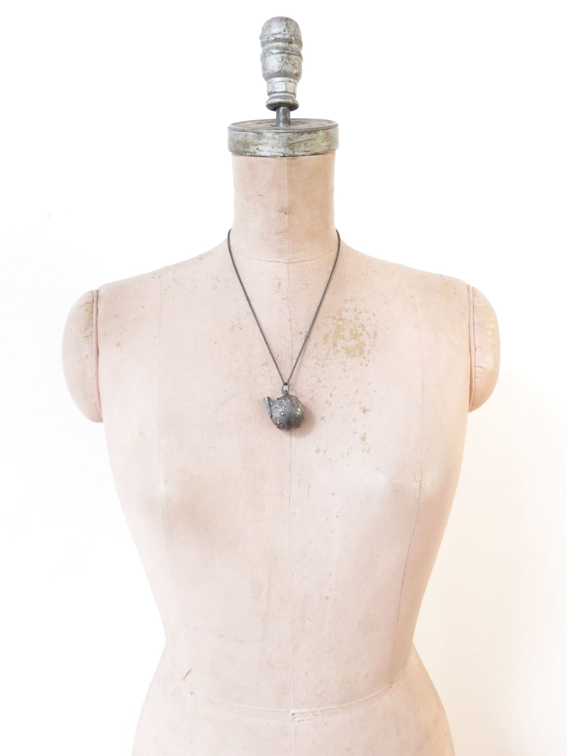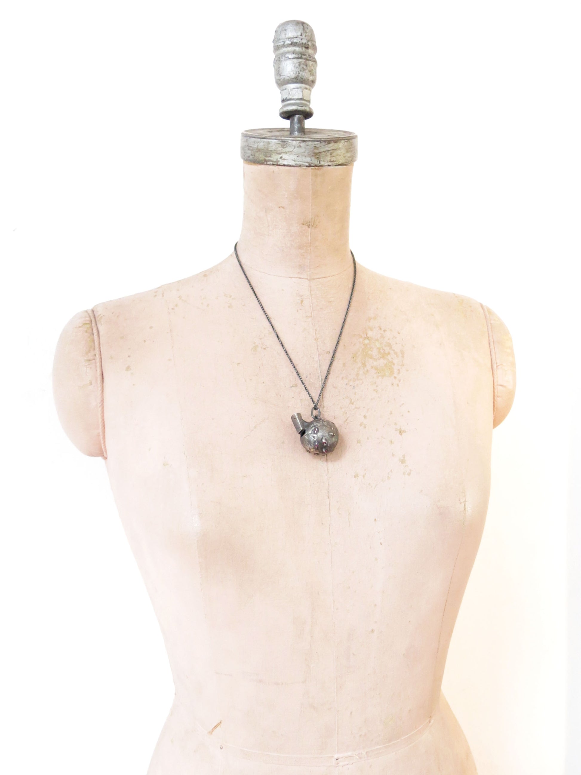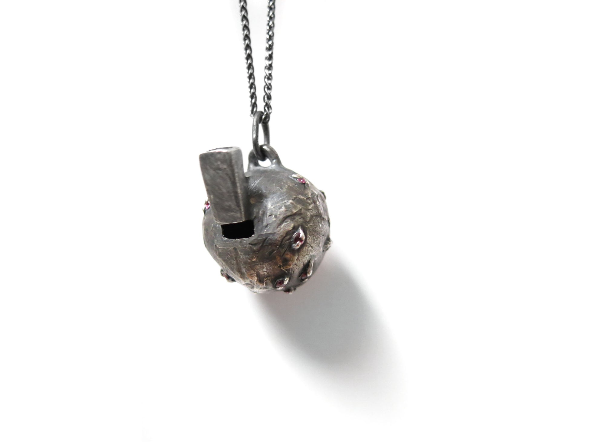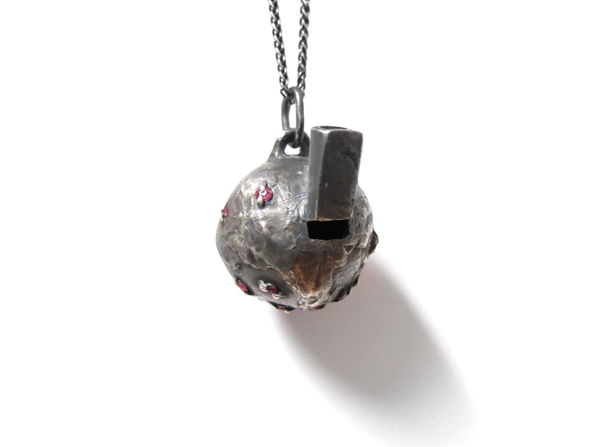 sculpted in wax and cast in solid sterling silver with a textured & oxidized finish. with 16 rubies. oxidized silver will evolve and become brighter and shinier with wear. comes on a 20" sterling silver chain.