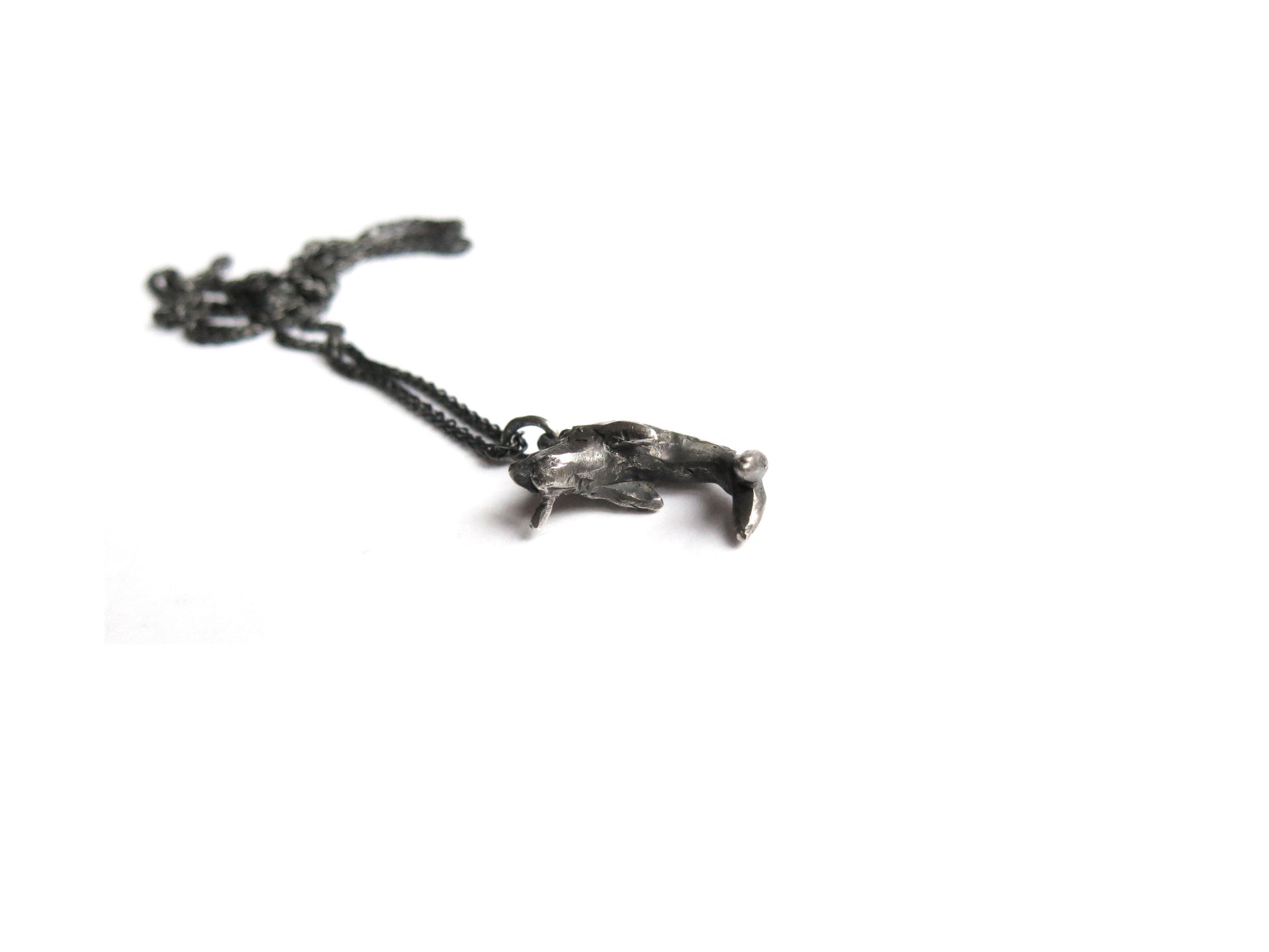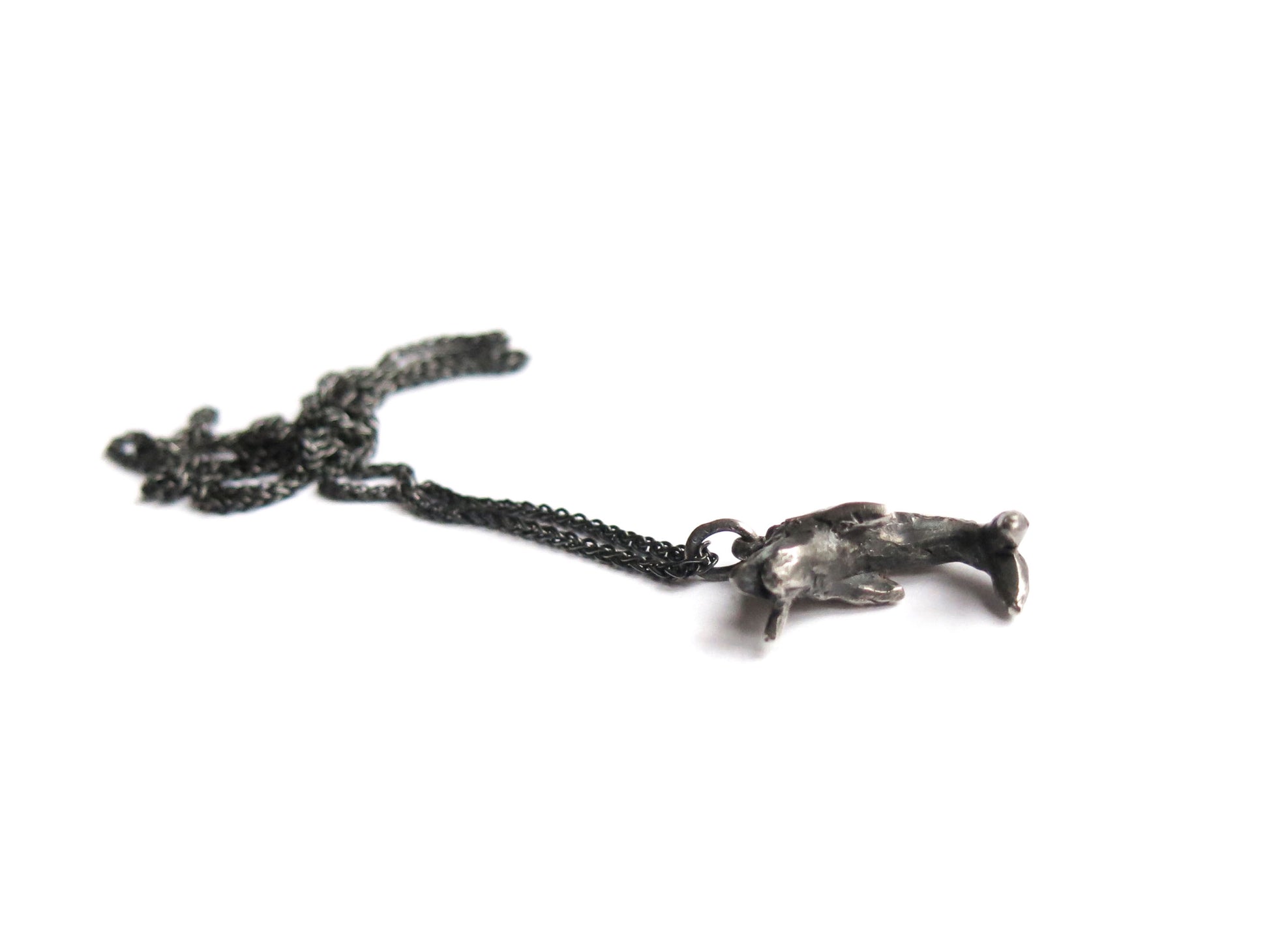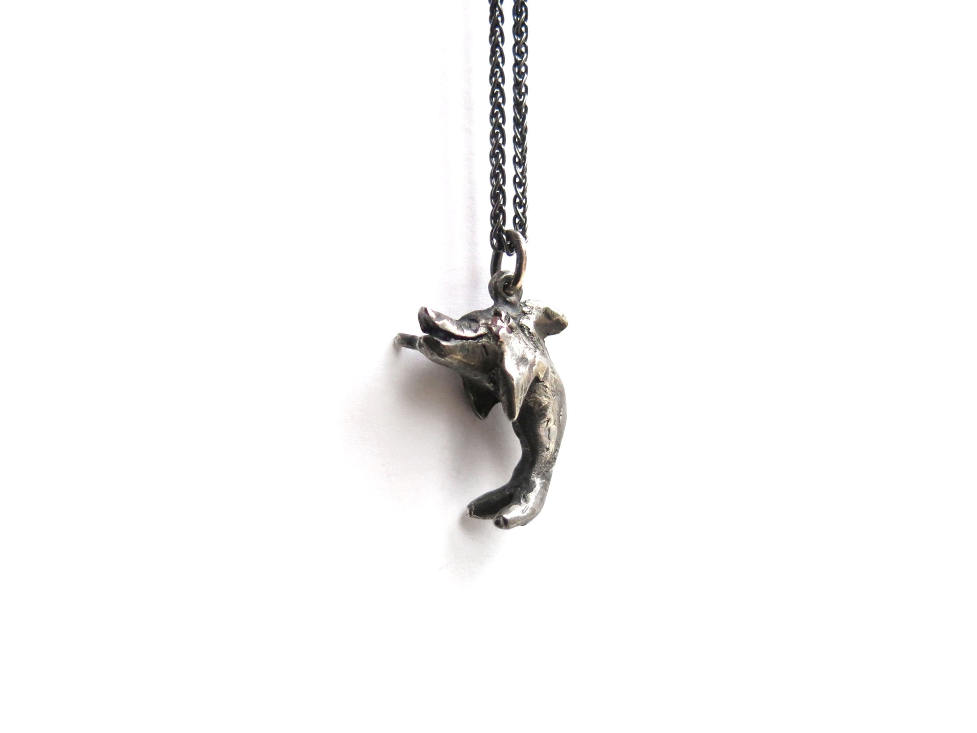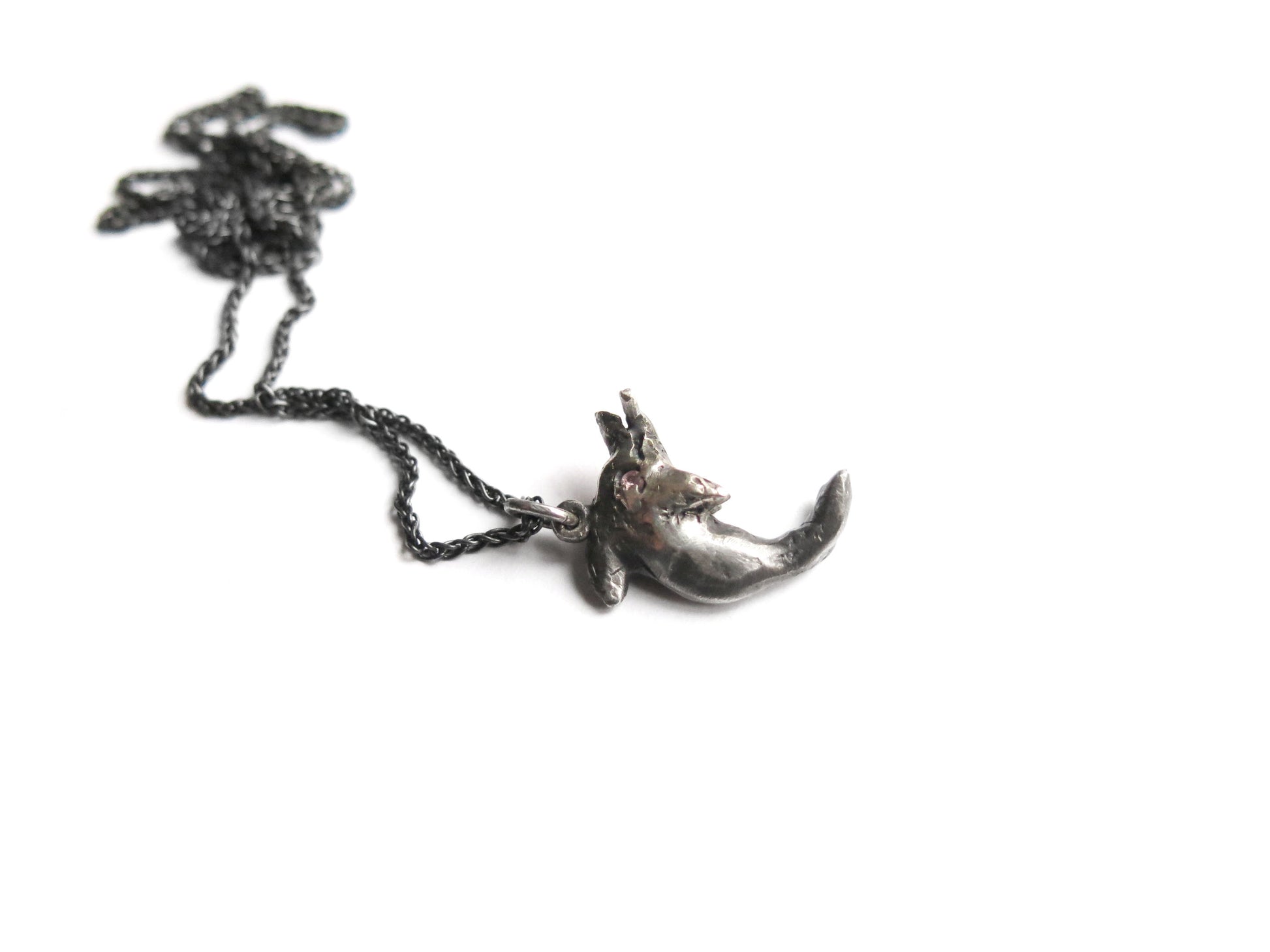 sculpted in wax and cast in solid sterling silver. darkened oxidized silver will evolve with wear and become brighter and shinier. comes on a 20" sterling silver chain.
