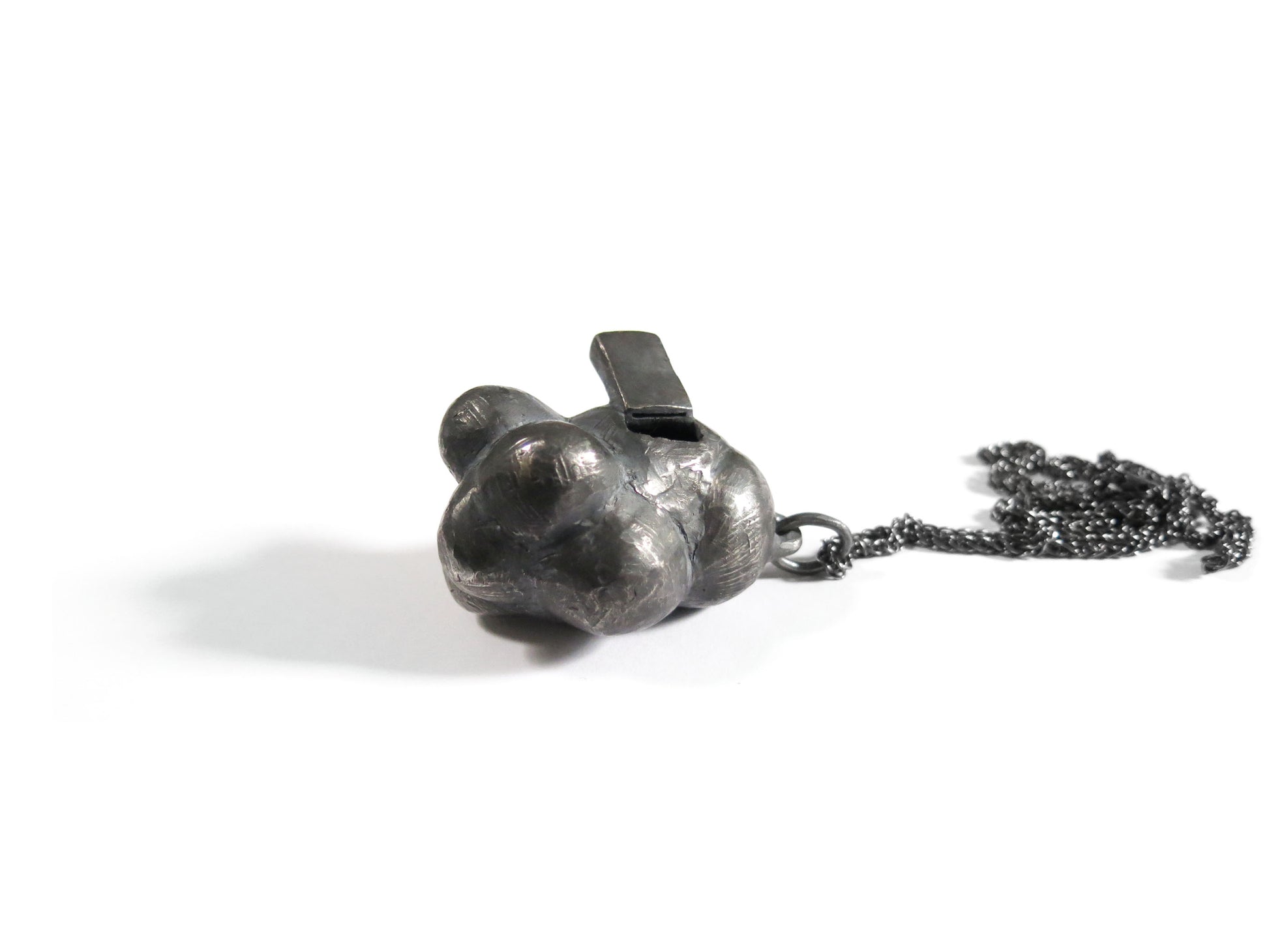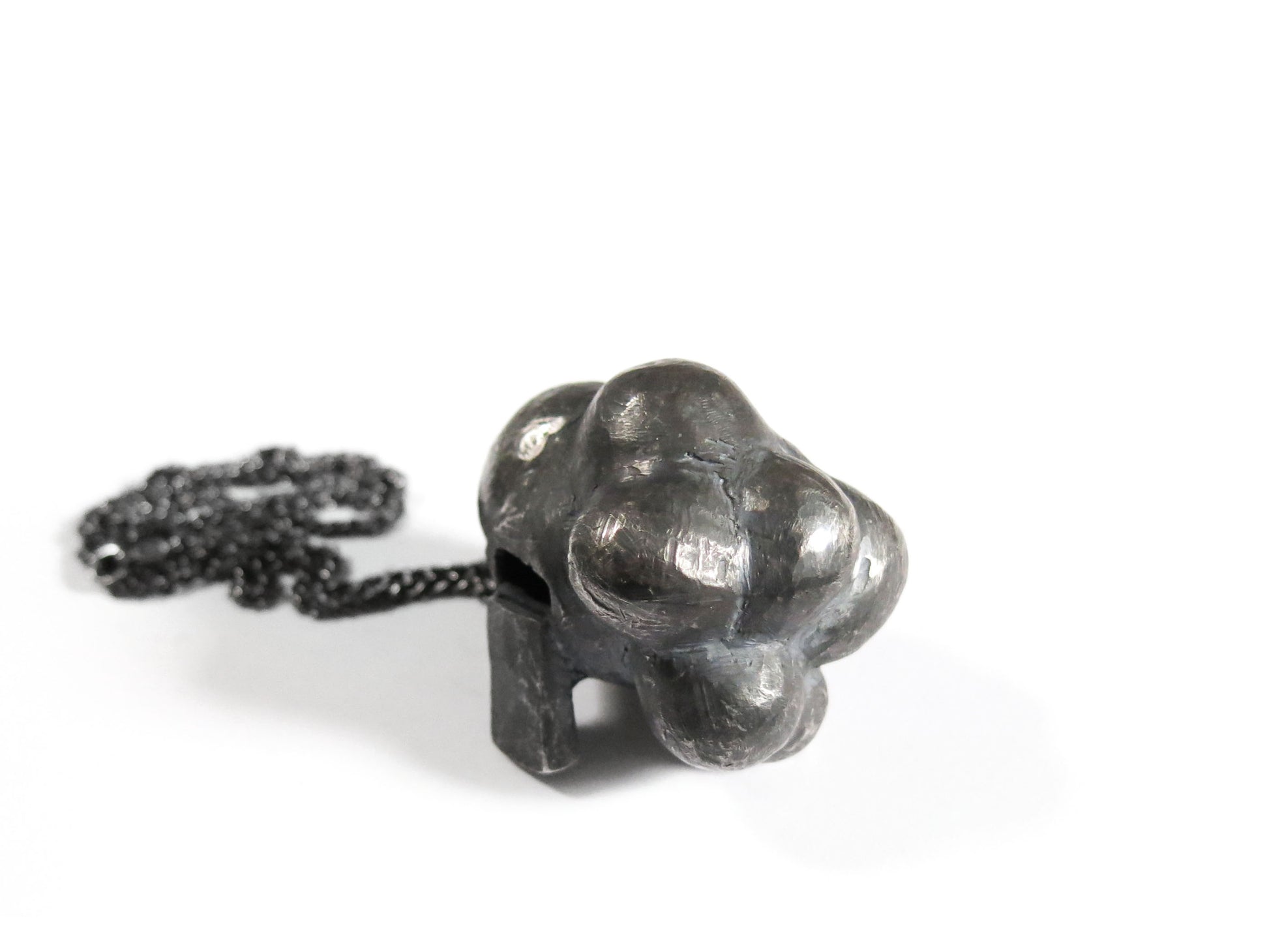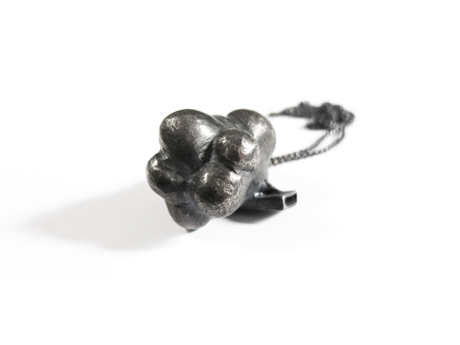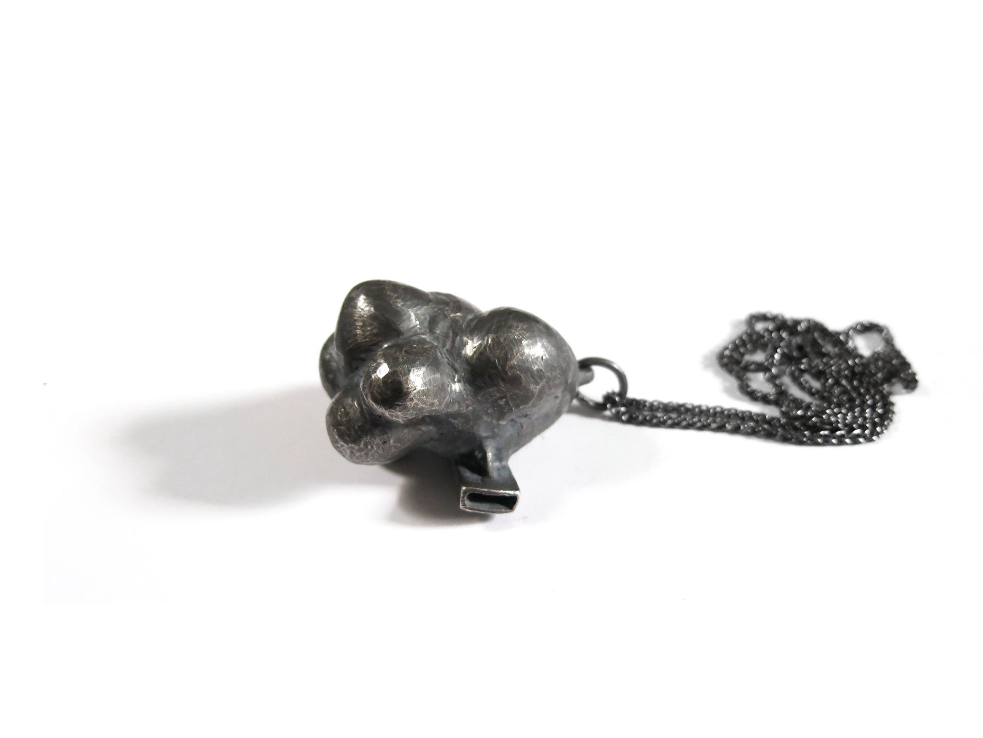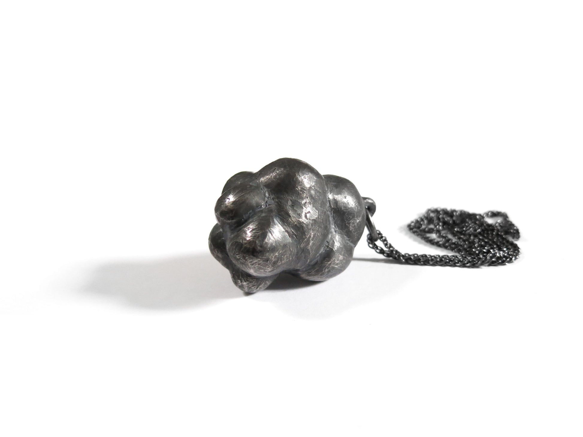 sculpted in wax and cast in solid sterling silver with a textured oxidized finish. oxidized silver will evolve and become brighter and shinier with wear. comes on heavy 24" silver chain.