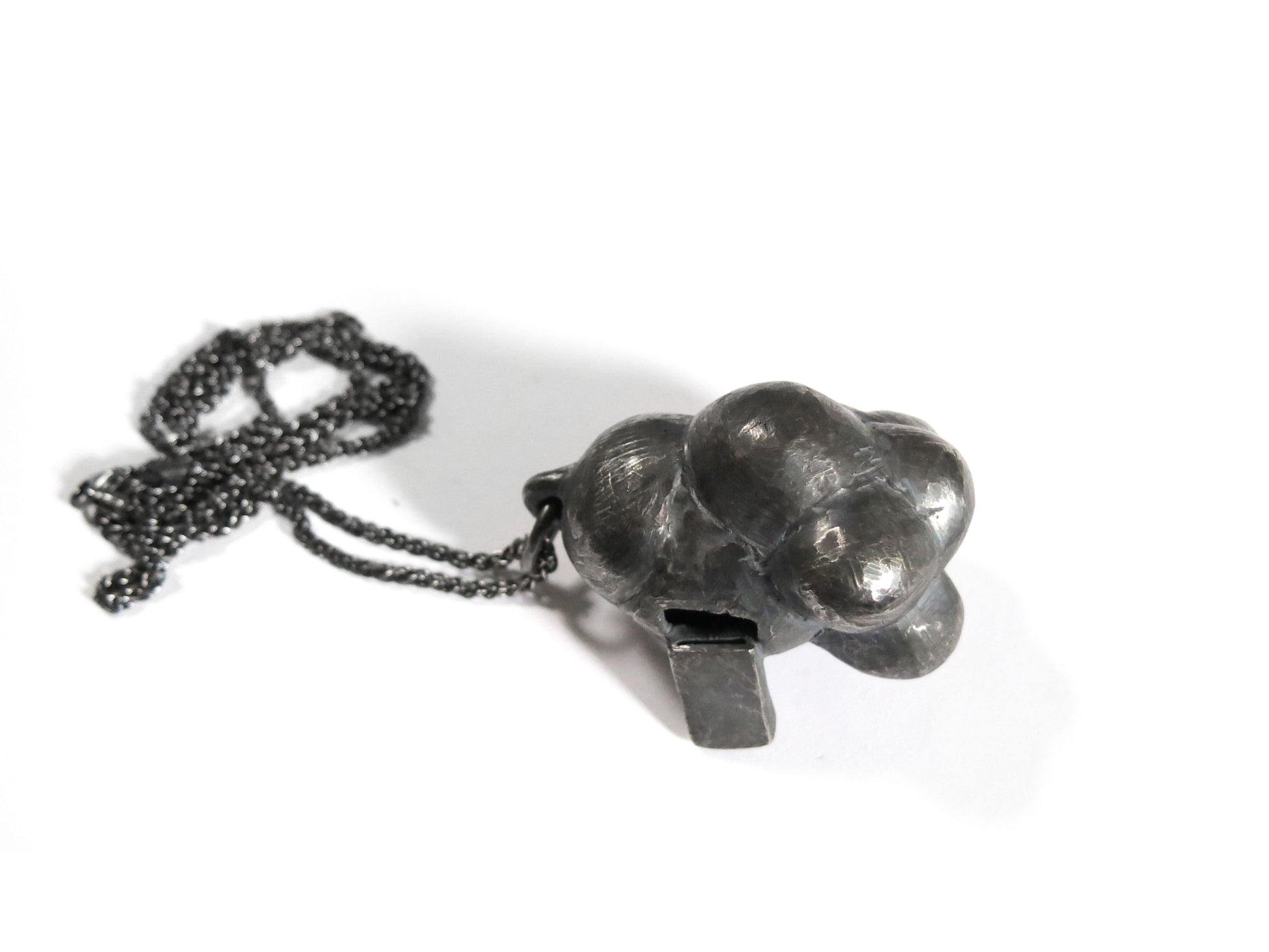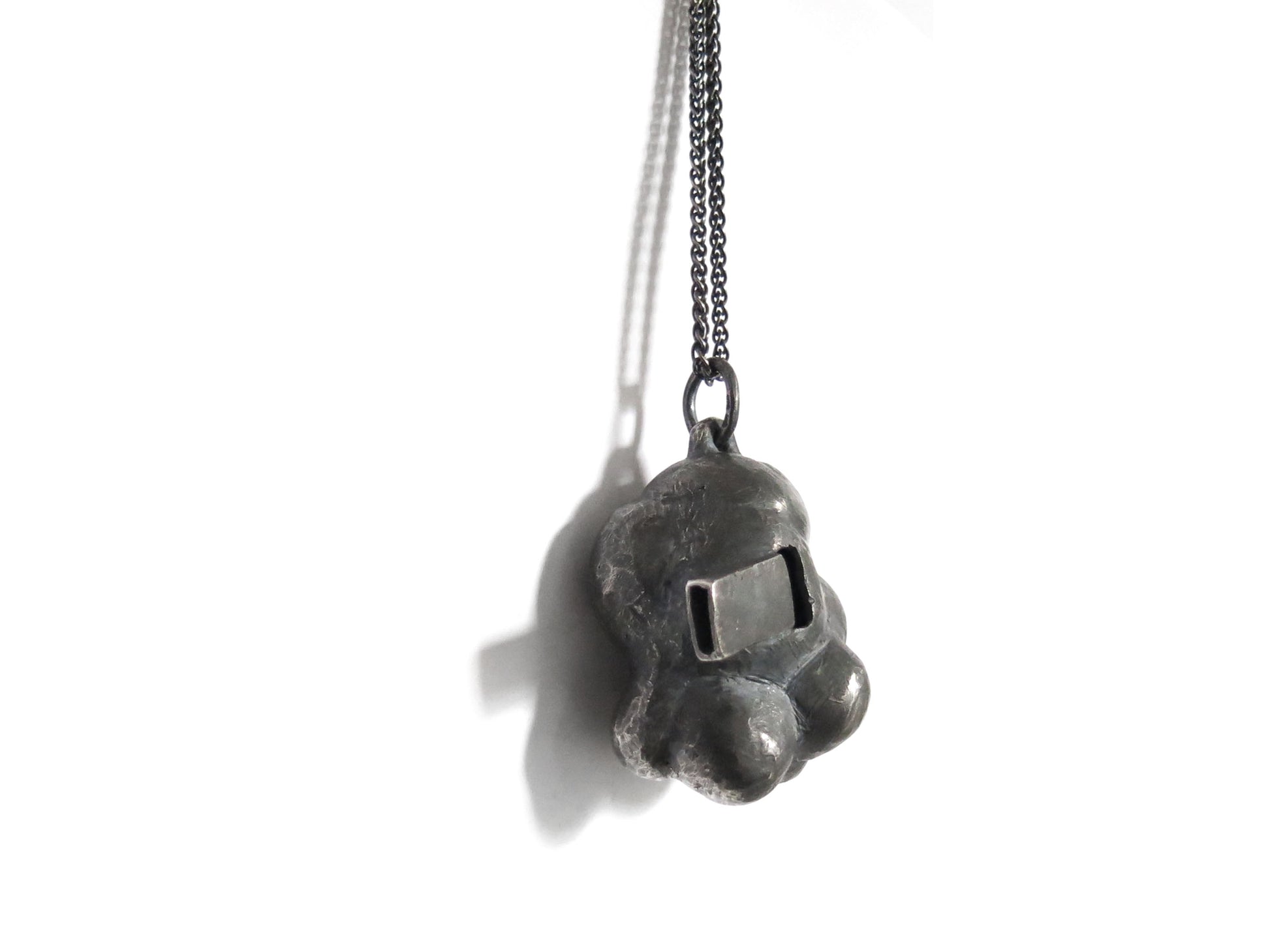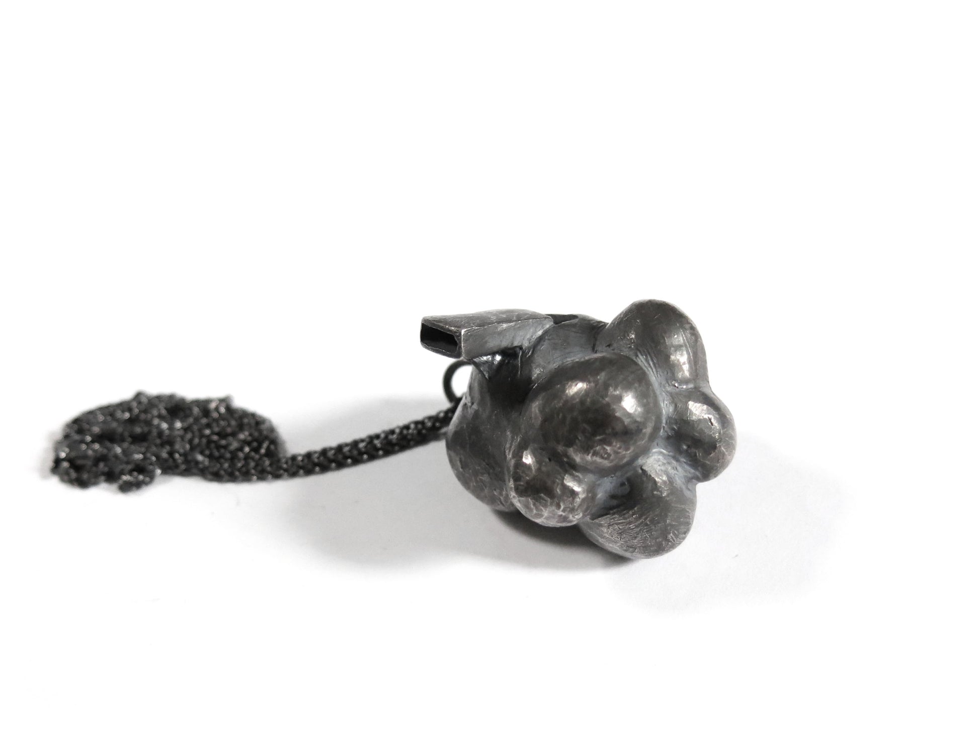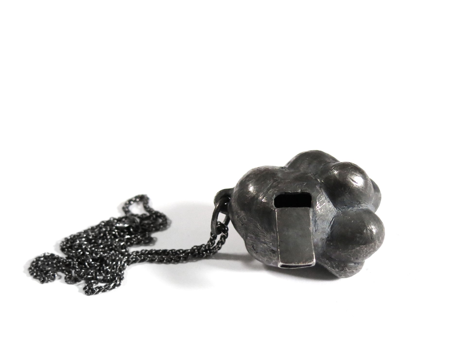 sculpted in wax and cast in solid sterling silver with a textured oxidized finish. oxidized silver will evolve and become brighter and shinier with wear. comes on heavy 24" silver chain.