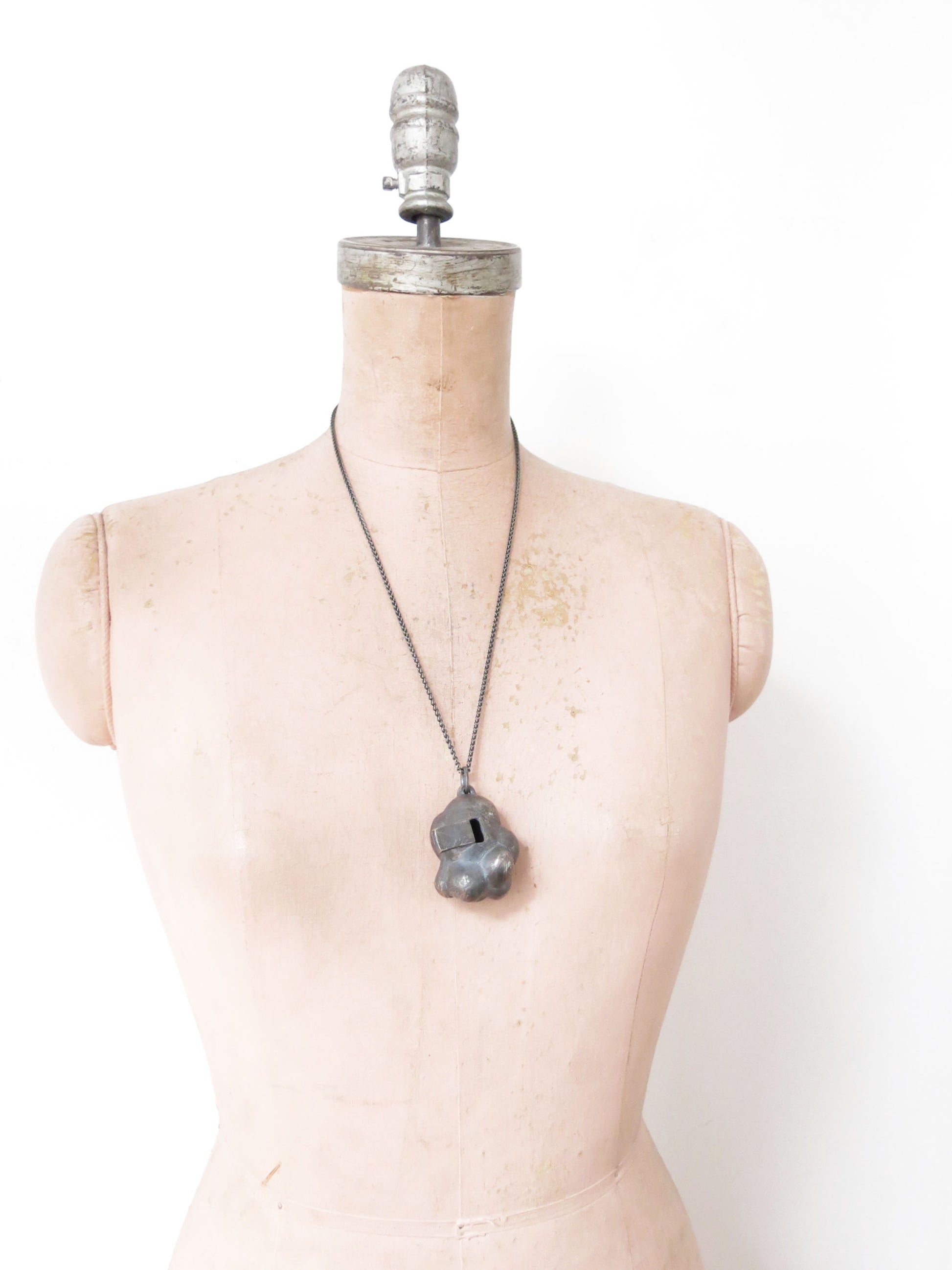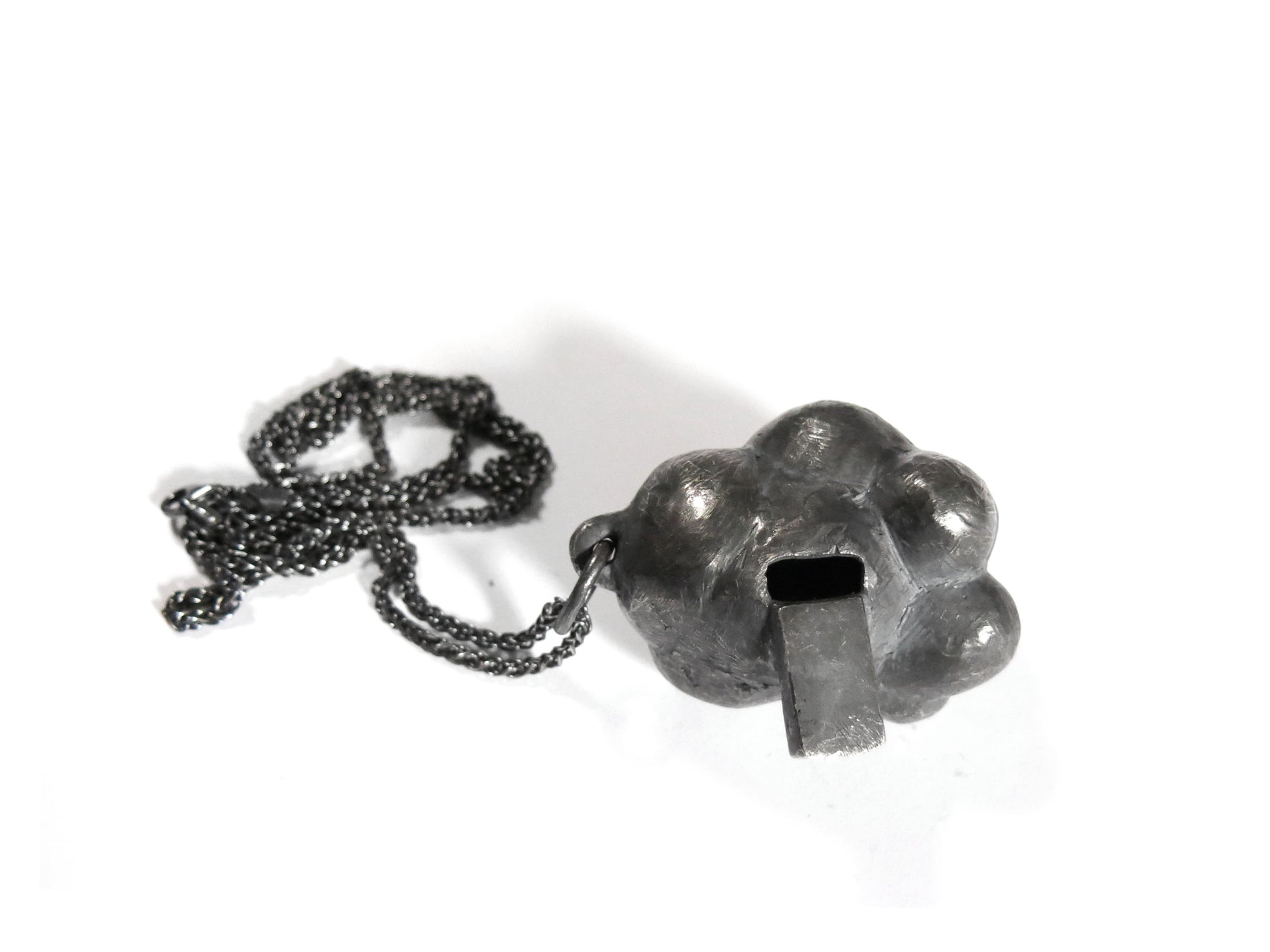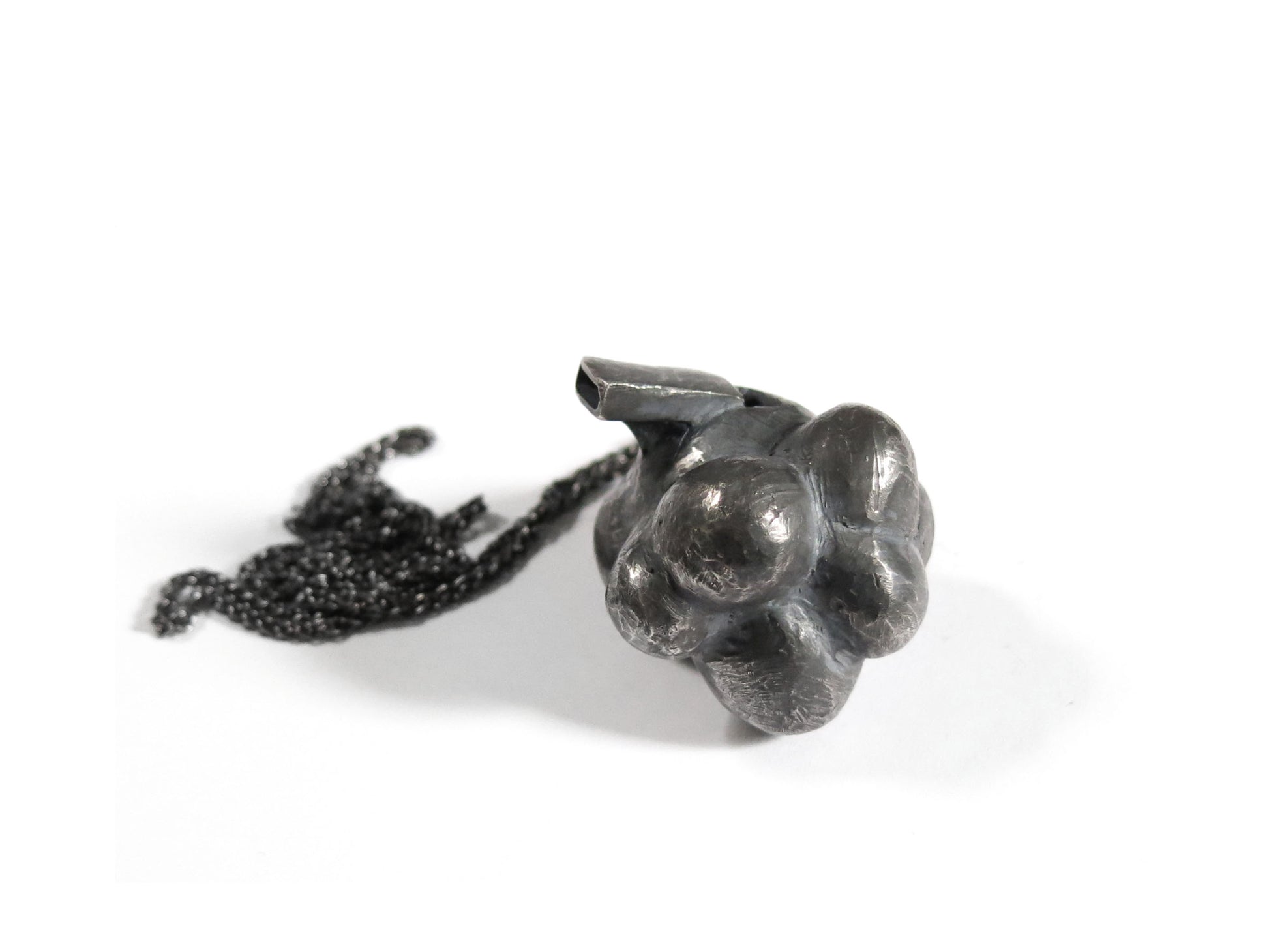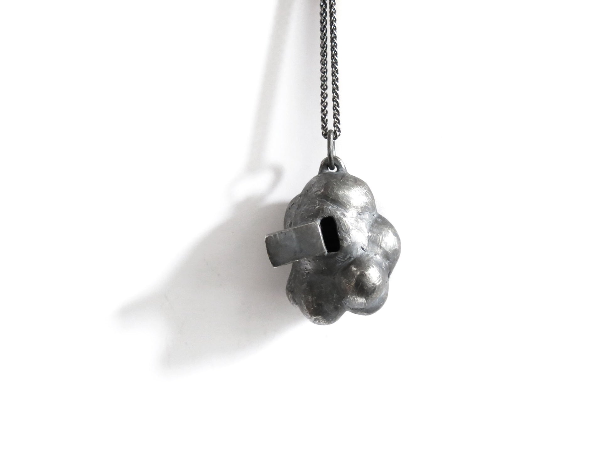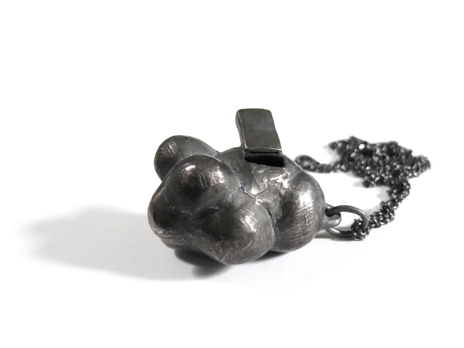 sculpted in wax and cast in solid sterling silver with a textured oxidized finish. oxidized silver will evolve and become brighter and shinier with wear. comes on heavy 24" silver chain.