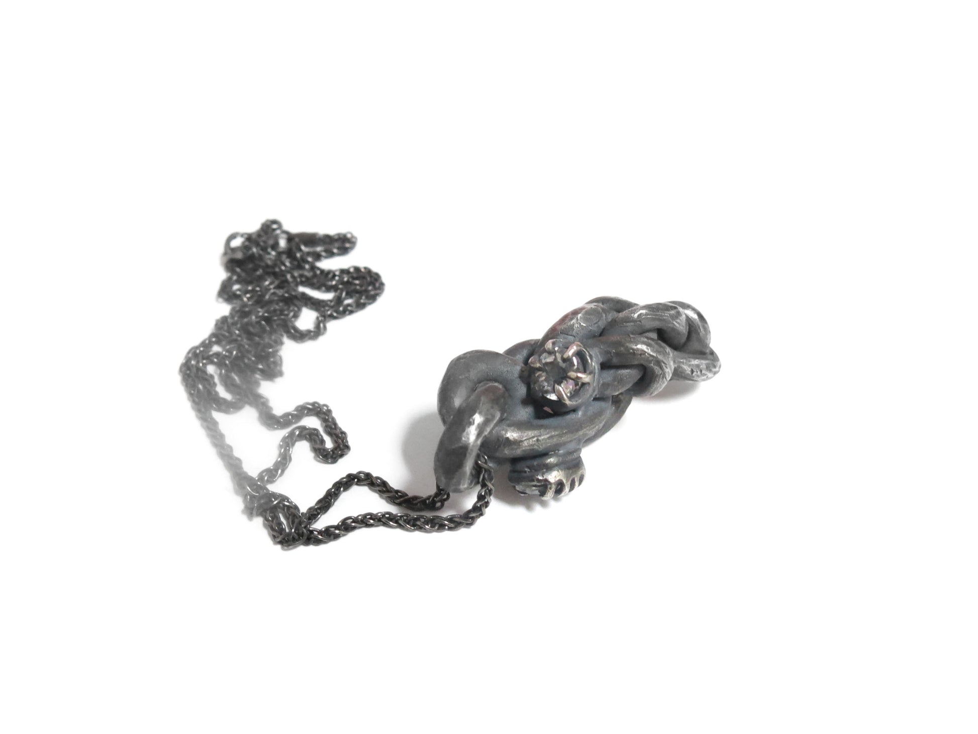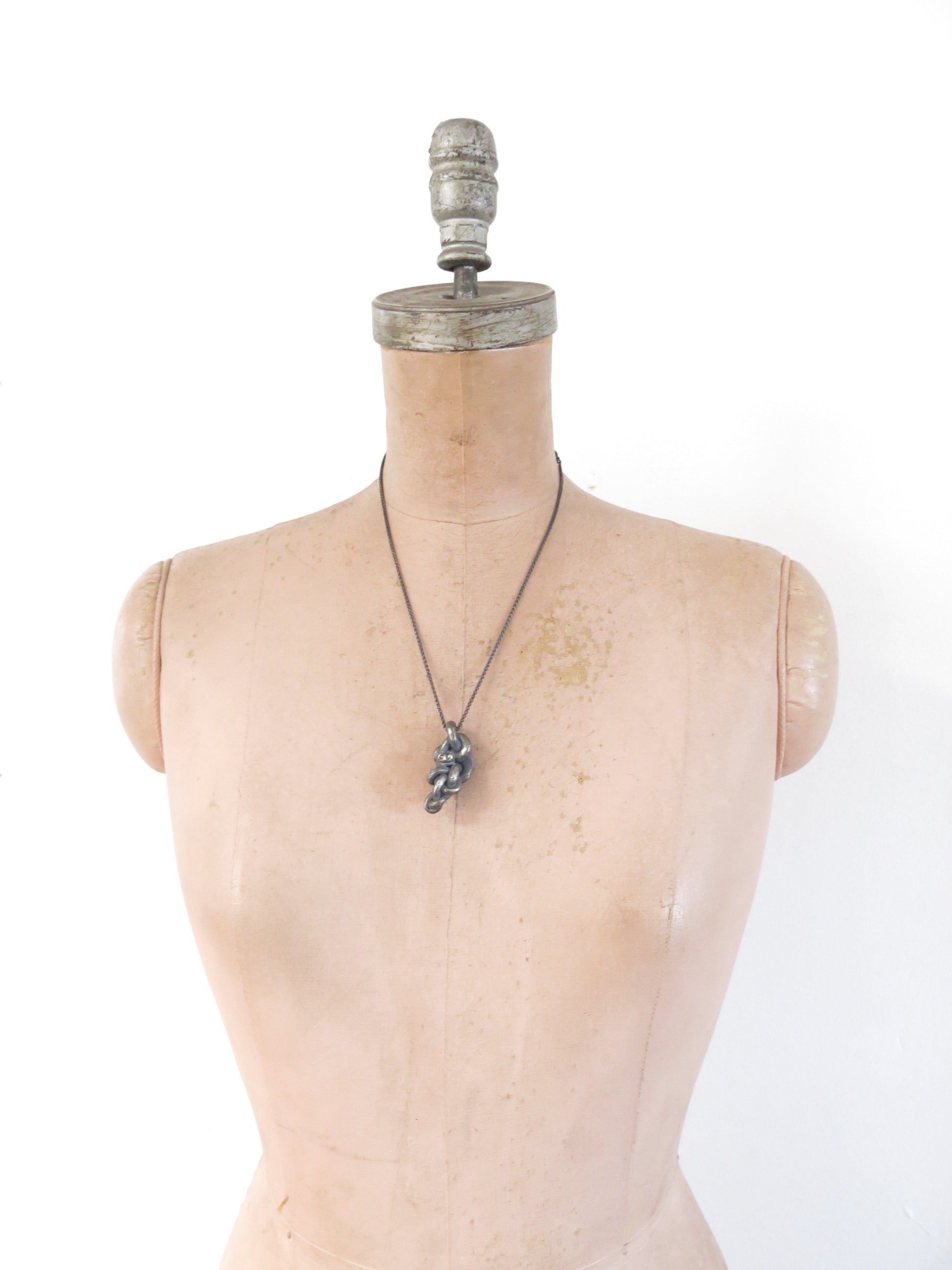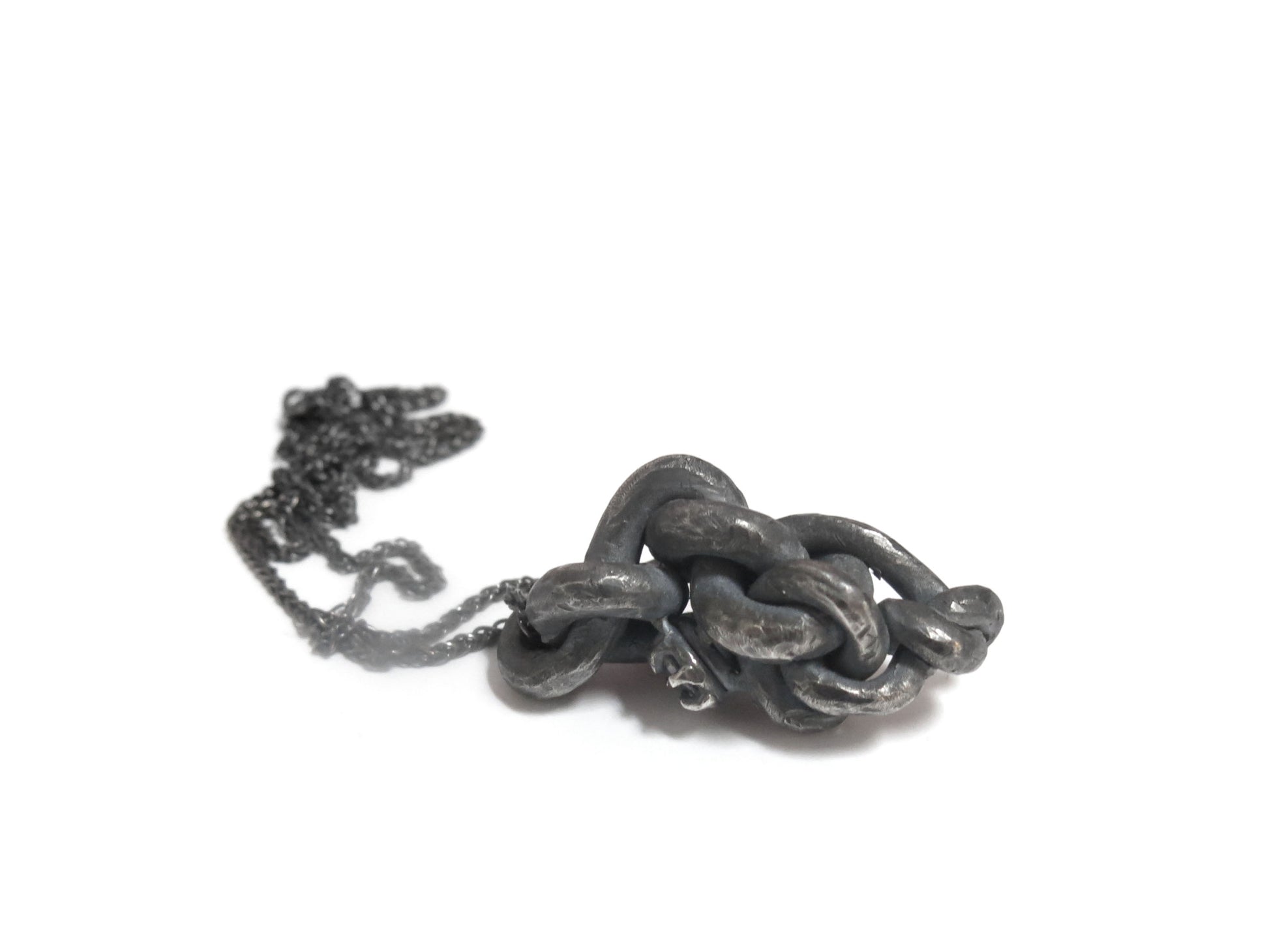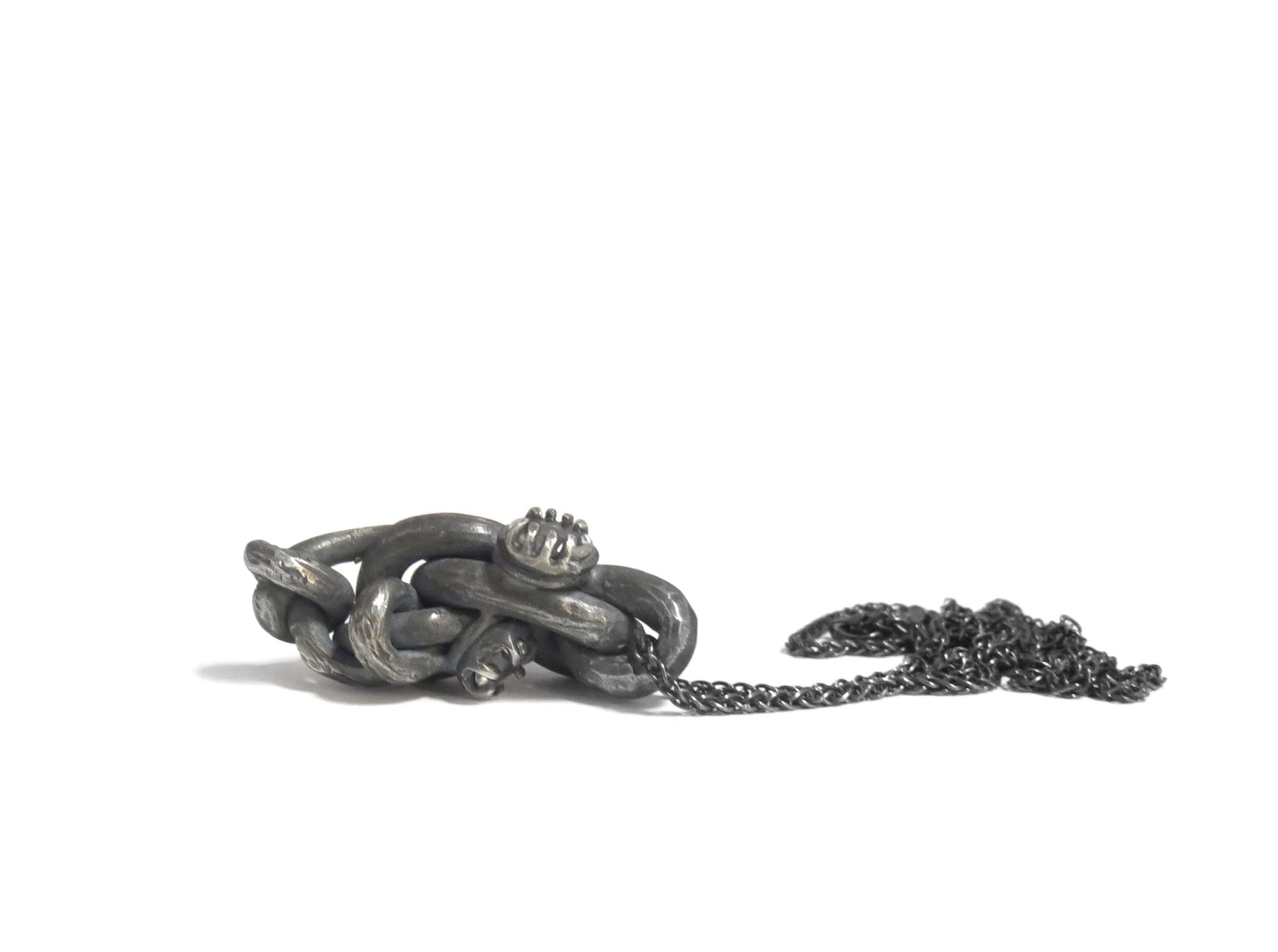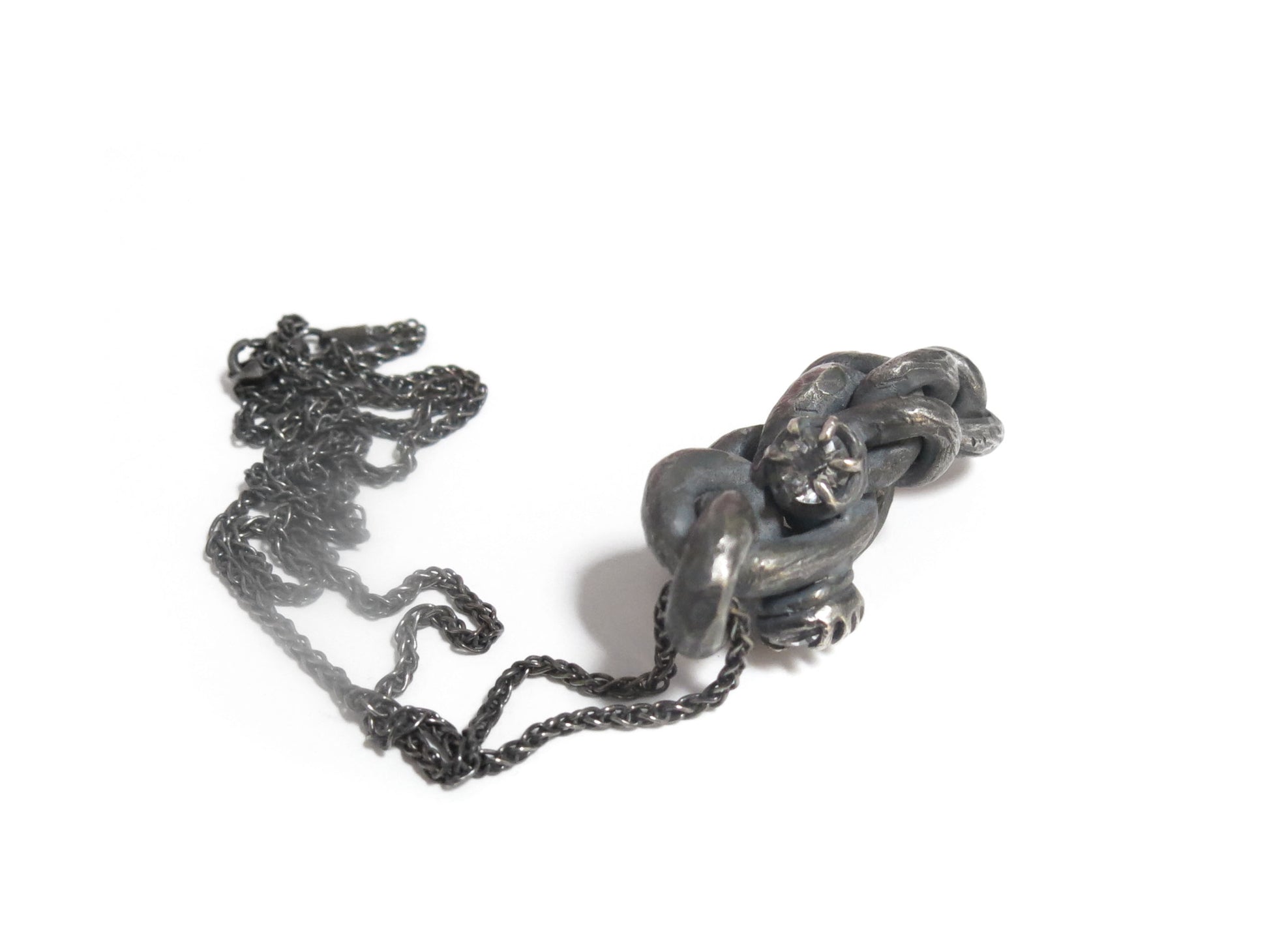 big knot pendant with two white topazes. cast in solid sterling silver with a rough oxidized finish. darkened silver will evolve and become brighter and shiner with wear.