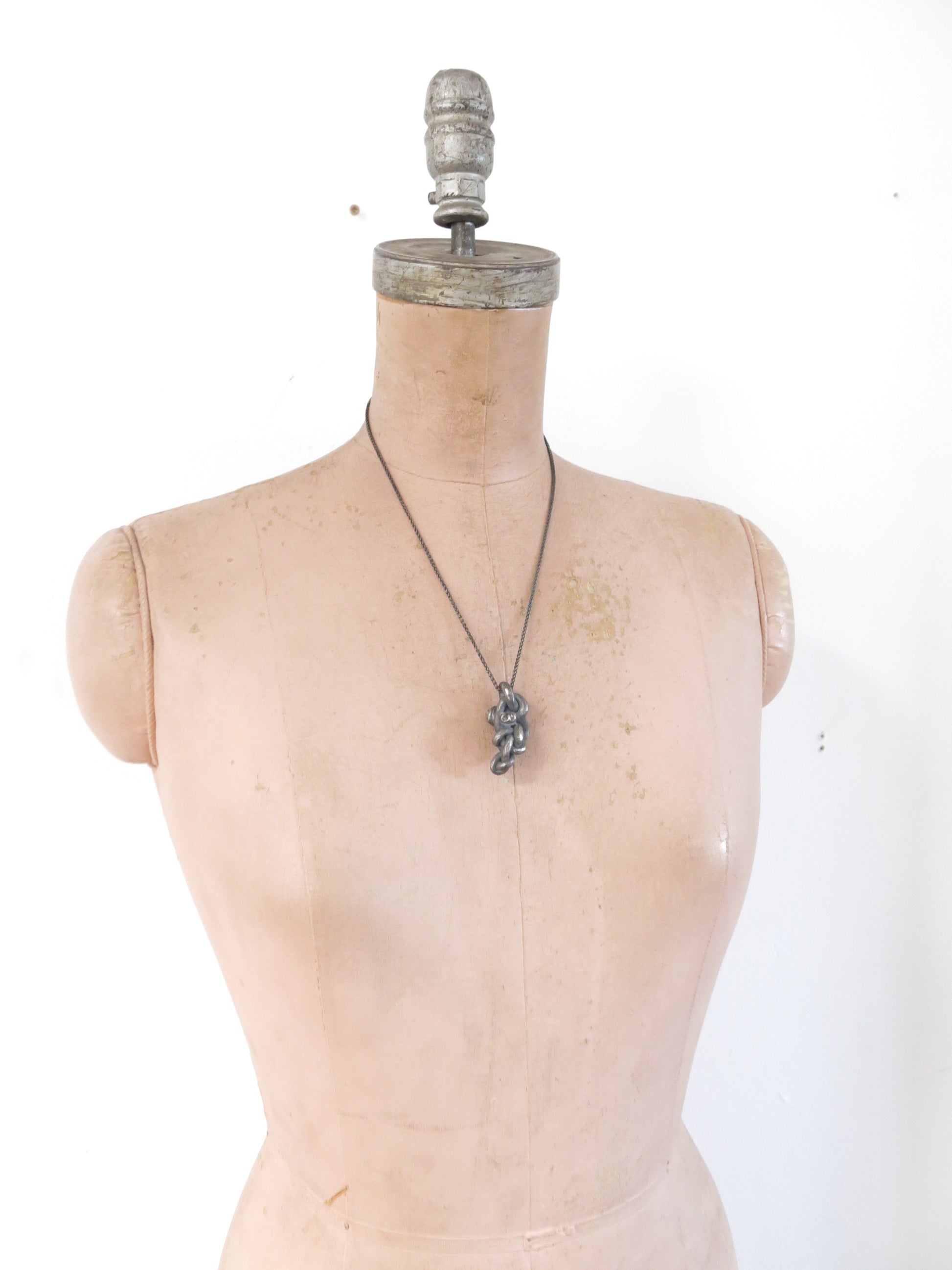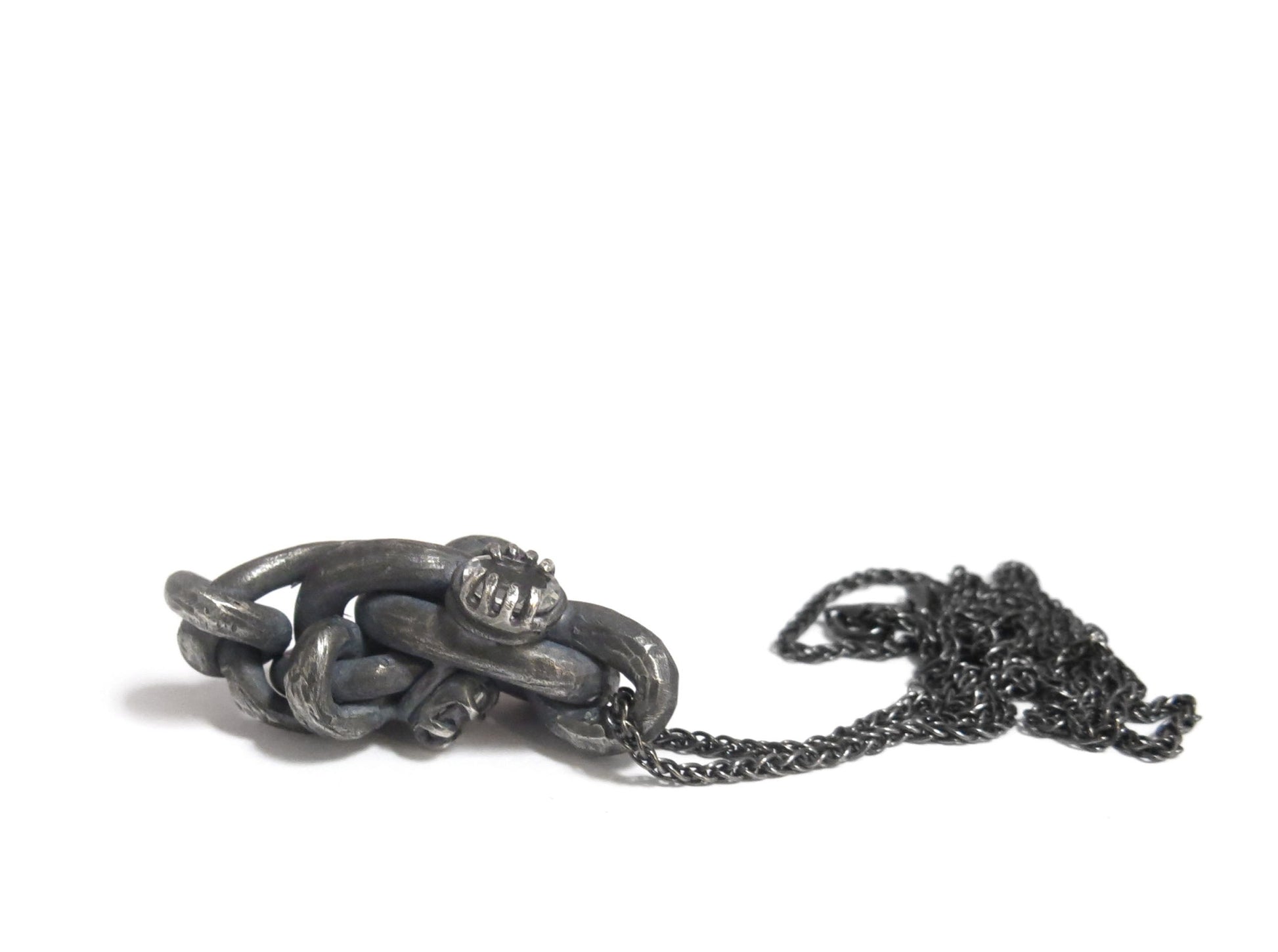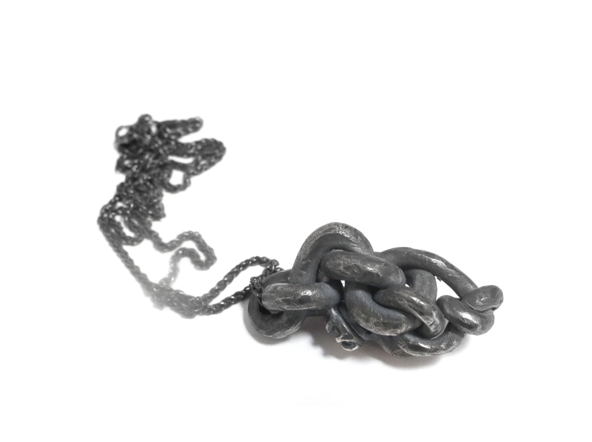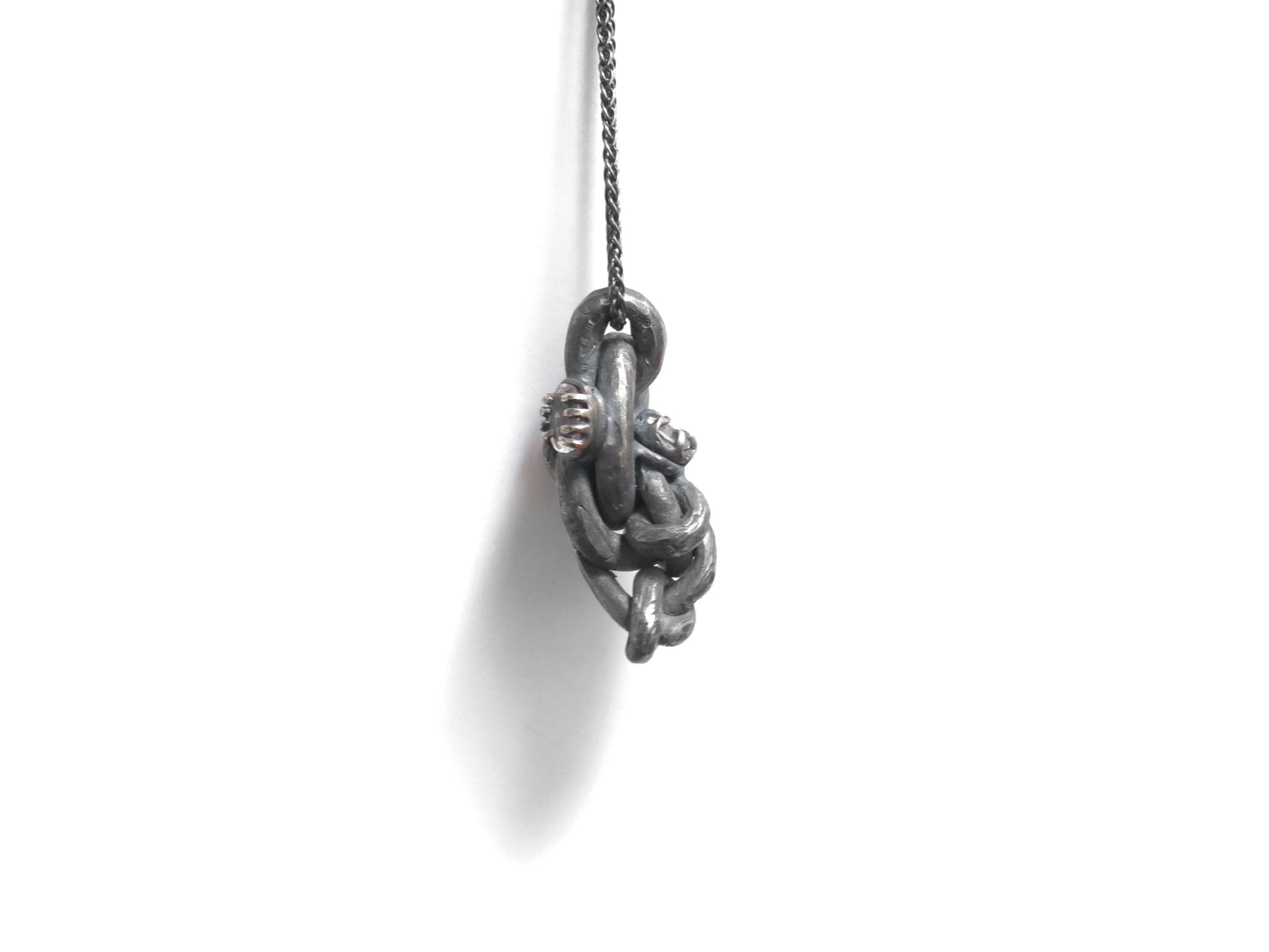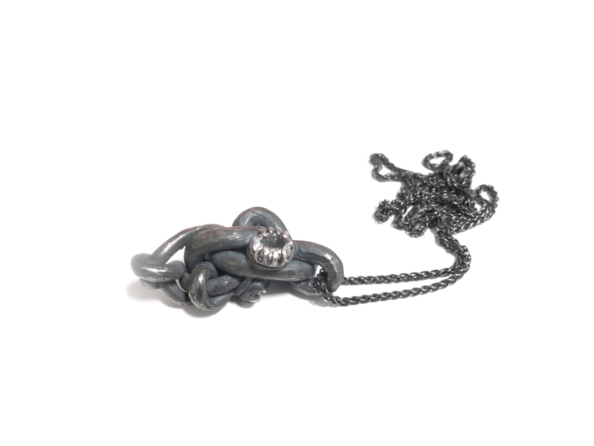 big knot pendant with two white topazes. cast in solid sterling silver with a rough oxidized finish. darkened silver will evolve and become brighter and shiner with wear.