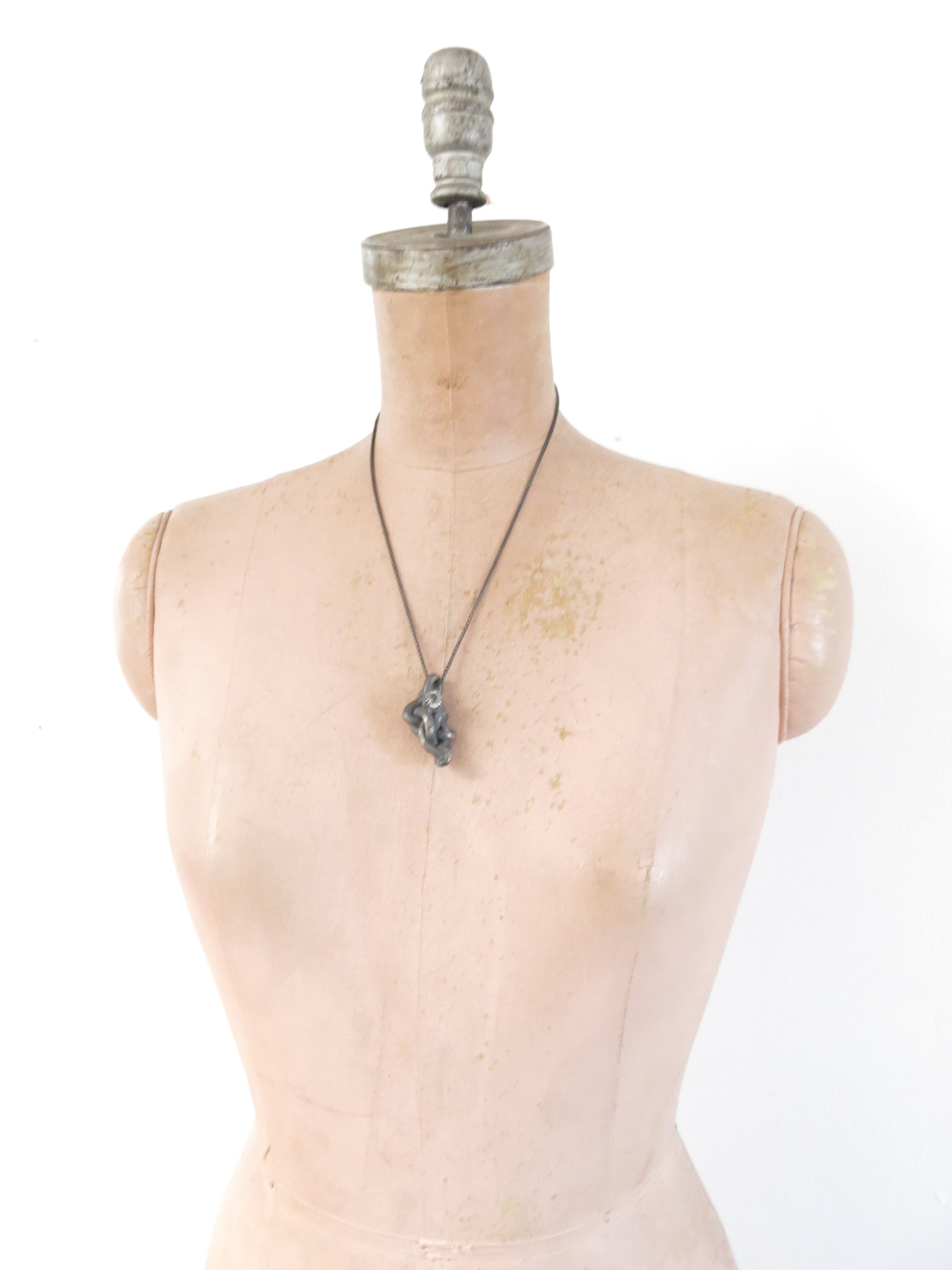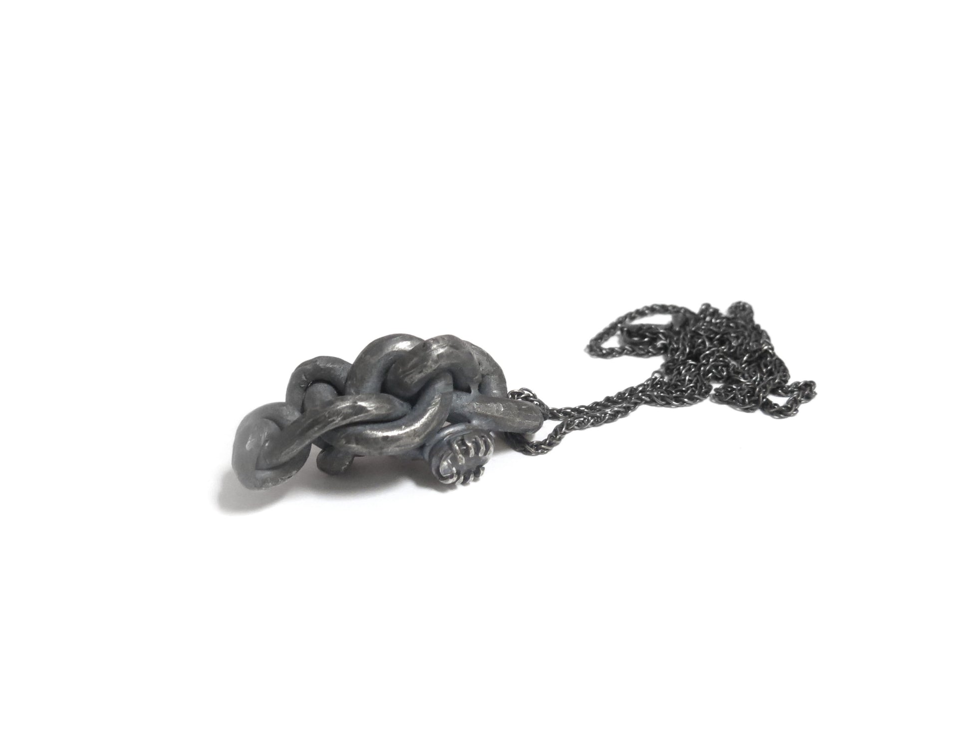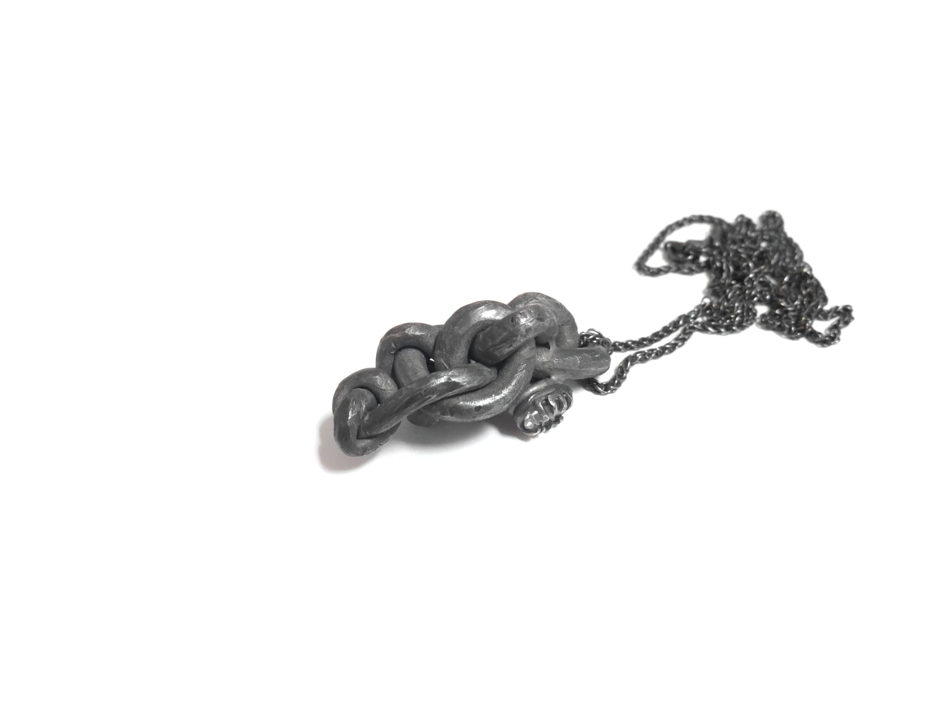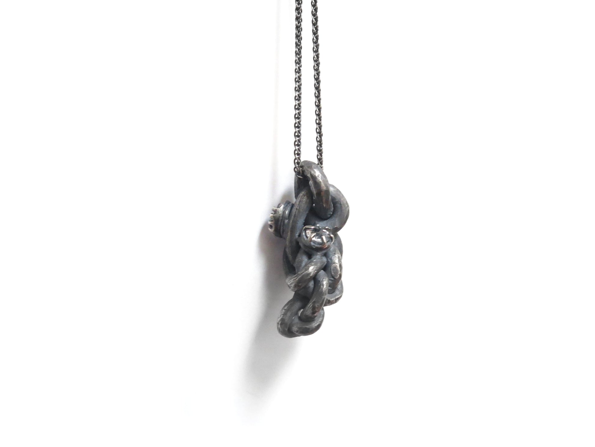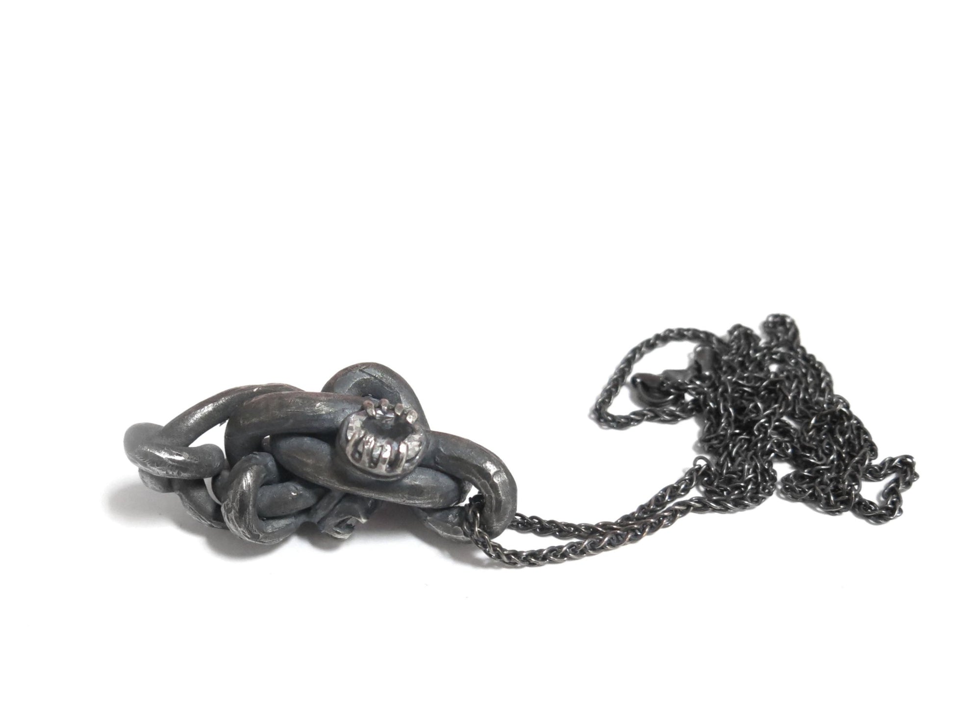 big knot pendant with two white topazes. cast in solid sterling silver with a rough oxidized finish. darkened silver will evolve and become brighter and shiner with wear.