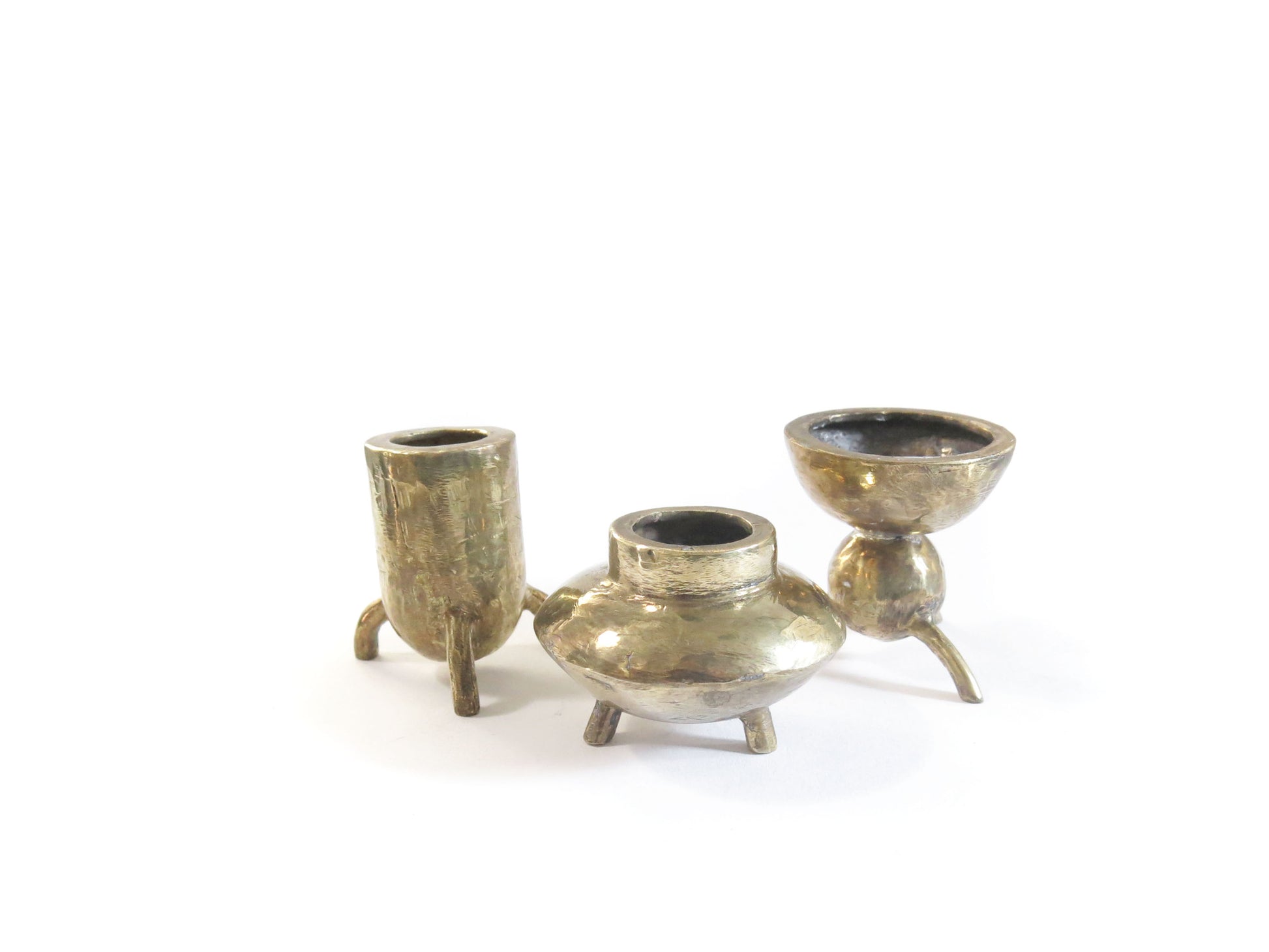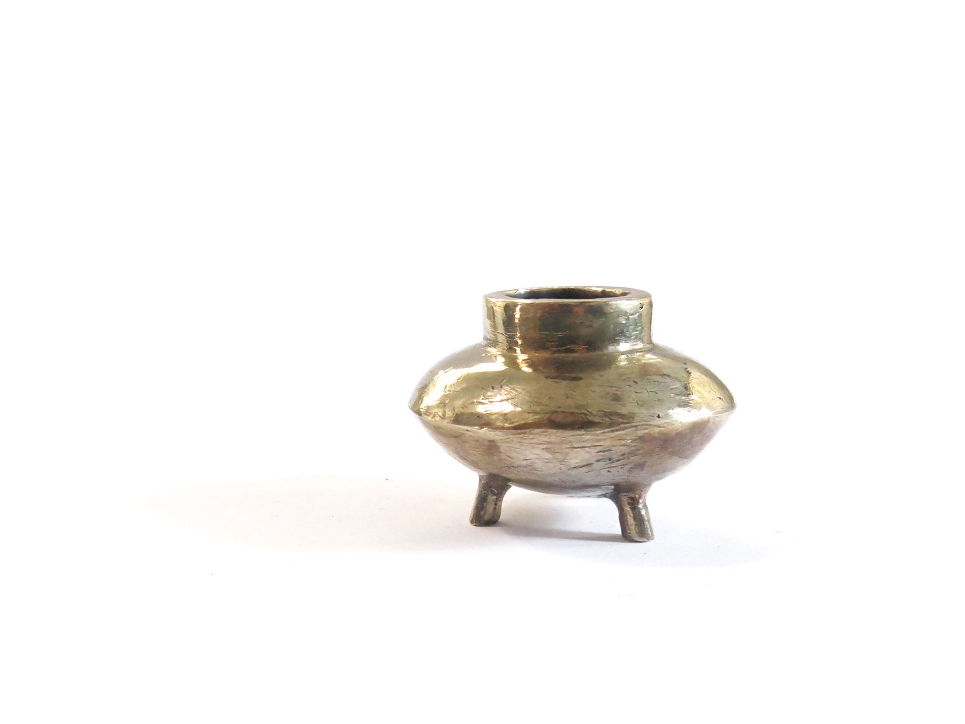 one of a kind vessel, intended to be an incense holder. pictured filled with incense burner ash. solid brass.